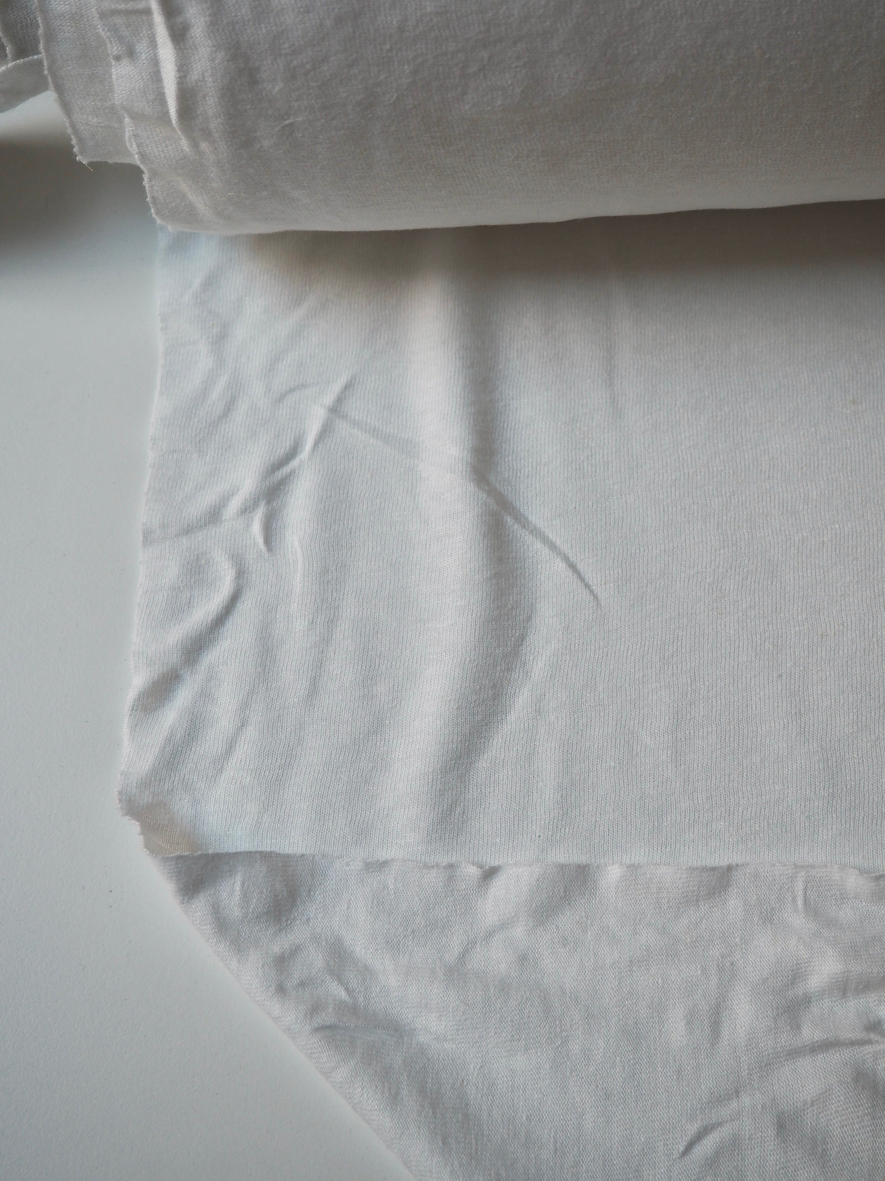 This ex-designer fabric is a cotton jersey. It is lightweight with a light drape. It has a single jersey t-shirt weave with only 5-10% stretch length-ways. It's a brighter white shade with a slight sheen finish. Semi-sheer with a bit more structure than a typical t-shirt jersey. Ideal for everyday basics, would make a great classic t-shirt!