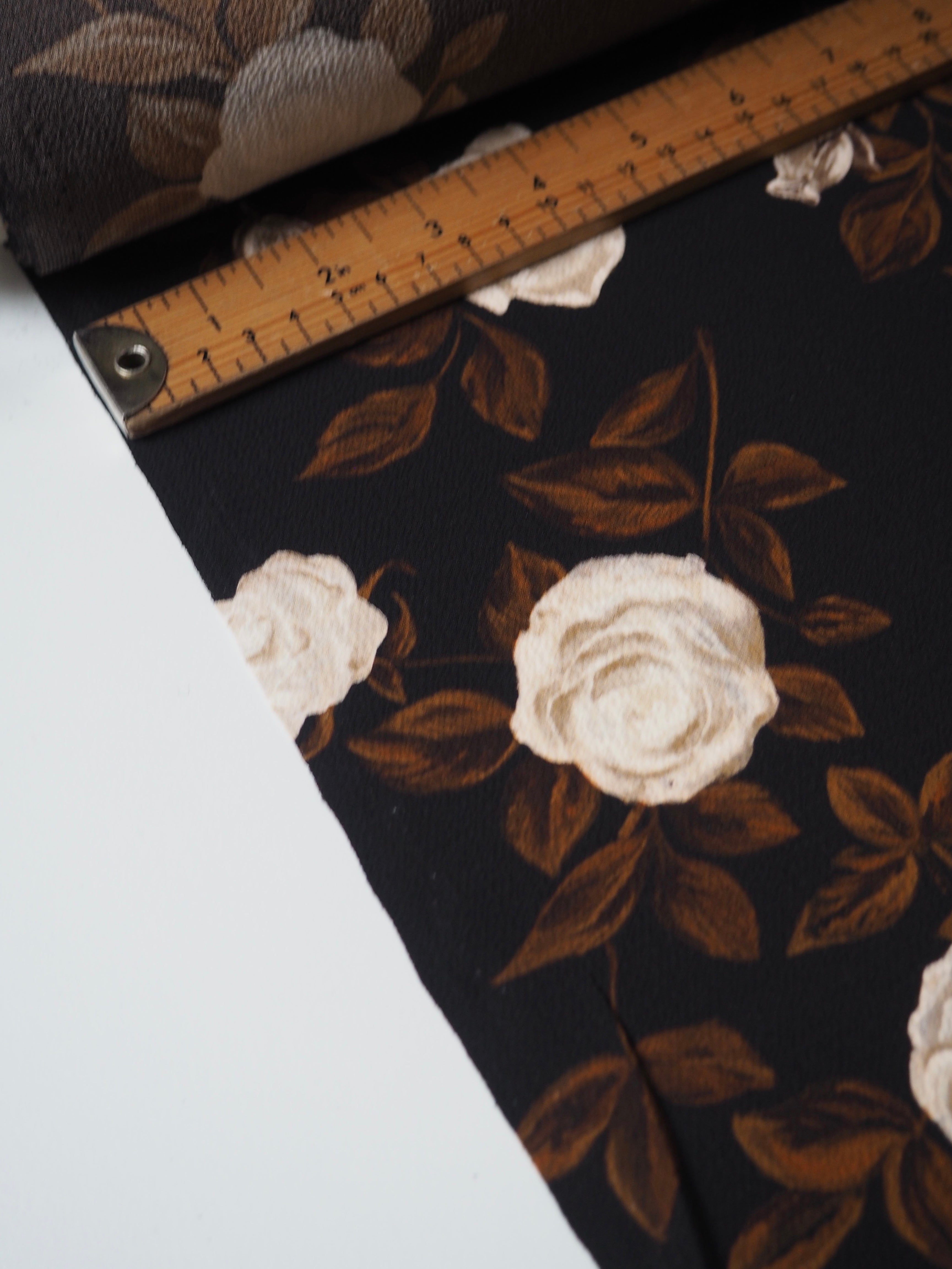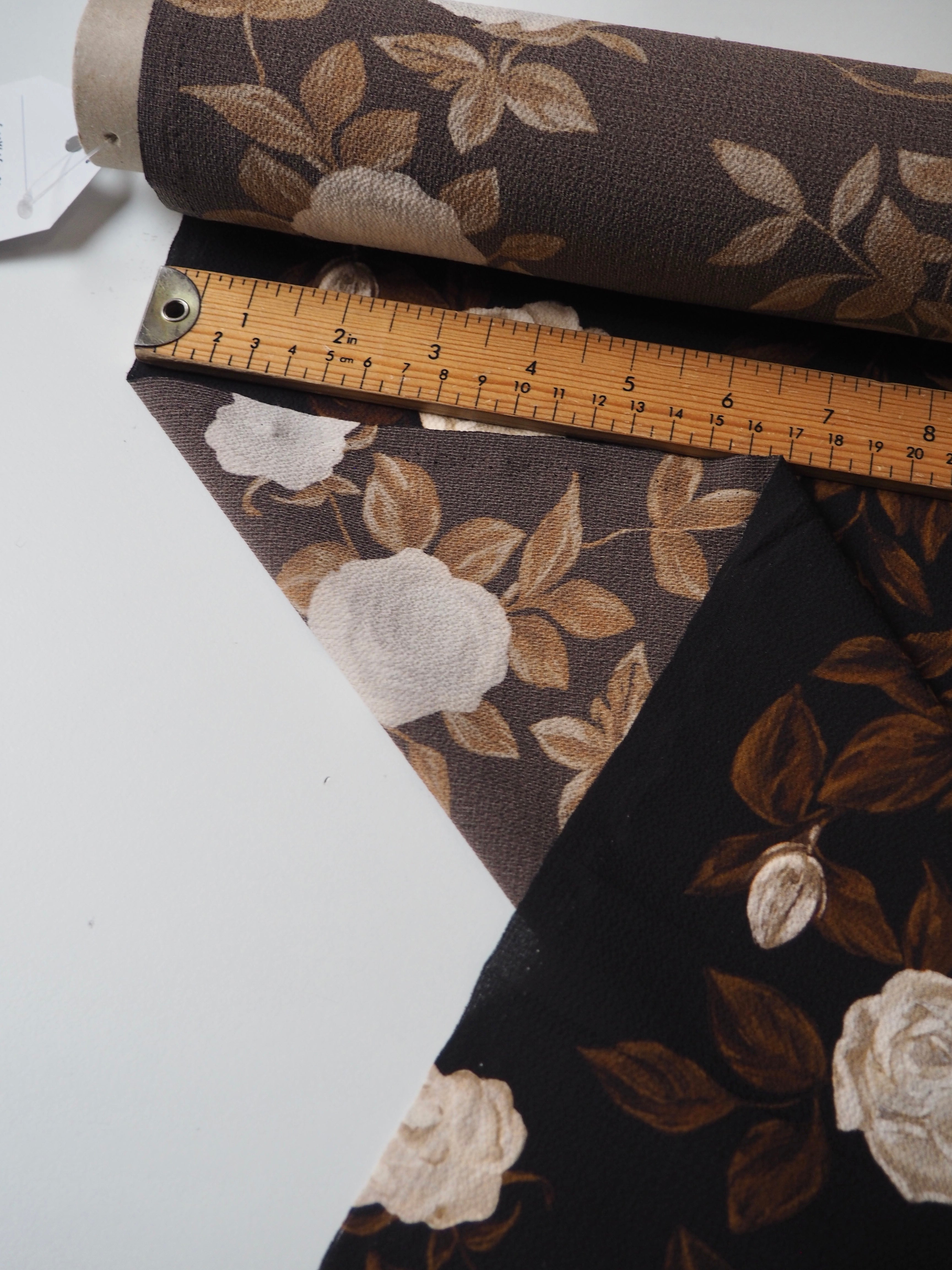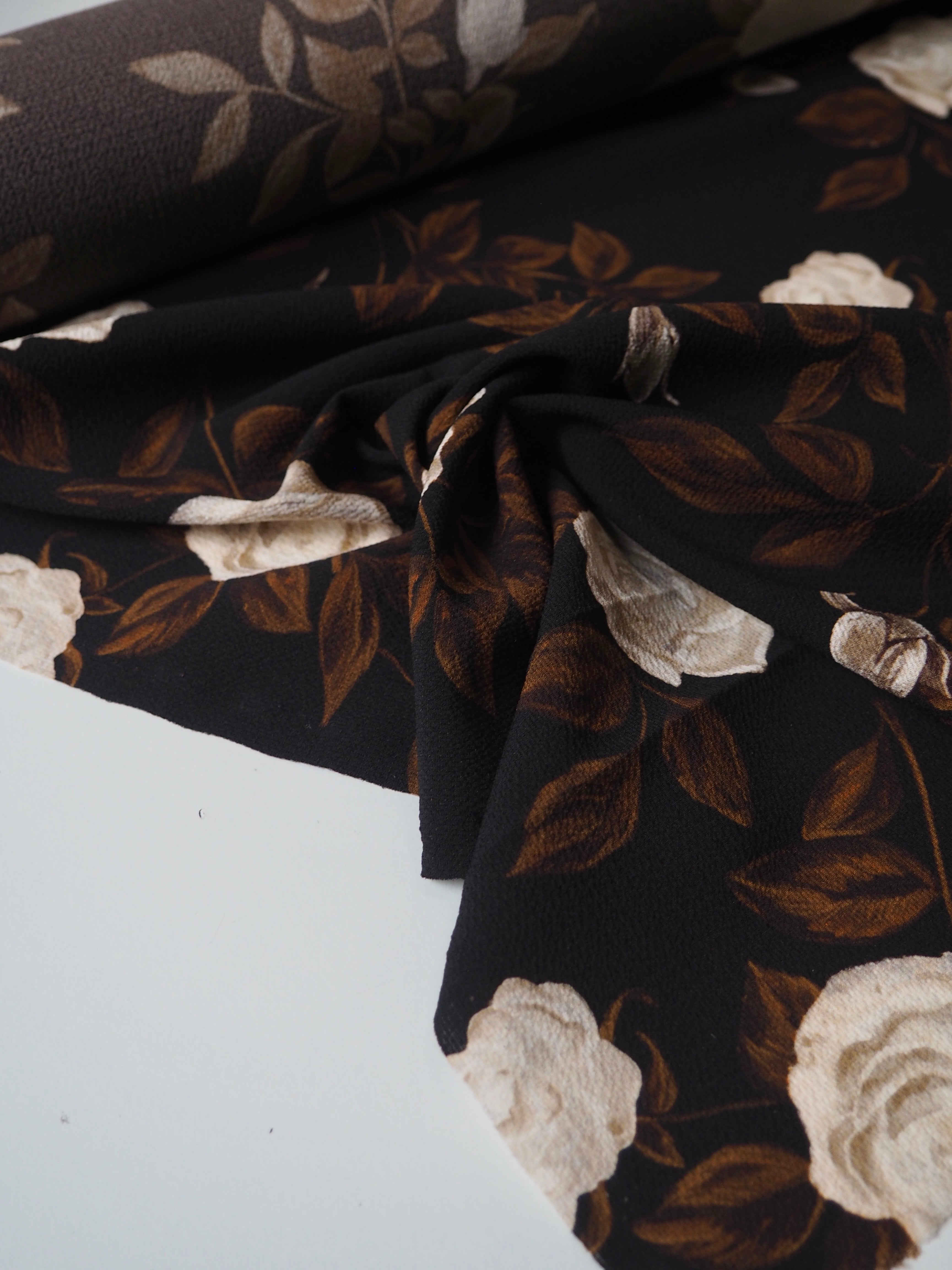 This ex-designer fabric is a slightly crinkled crepe. It has an amazing drape, that is light and airy. It's black with brown and white blooms. It's an exclusive designer print. Opaque with such a lovely textured handle. Would make a lovely dress or top!