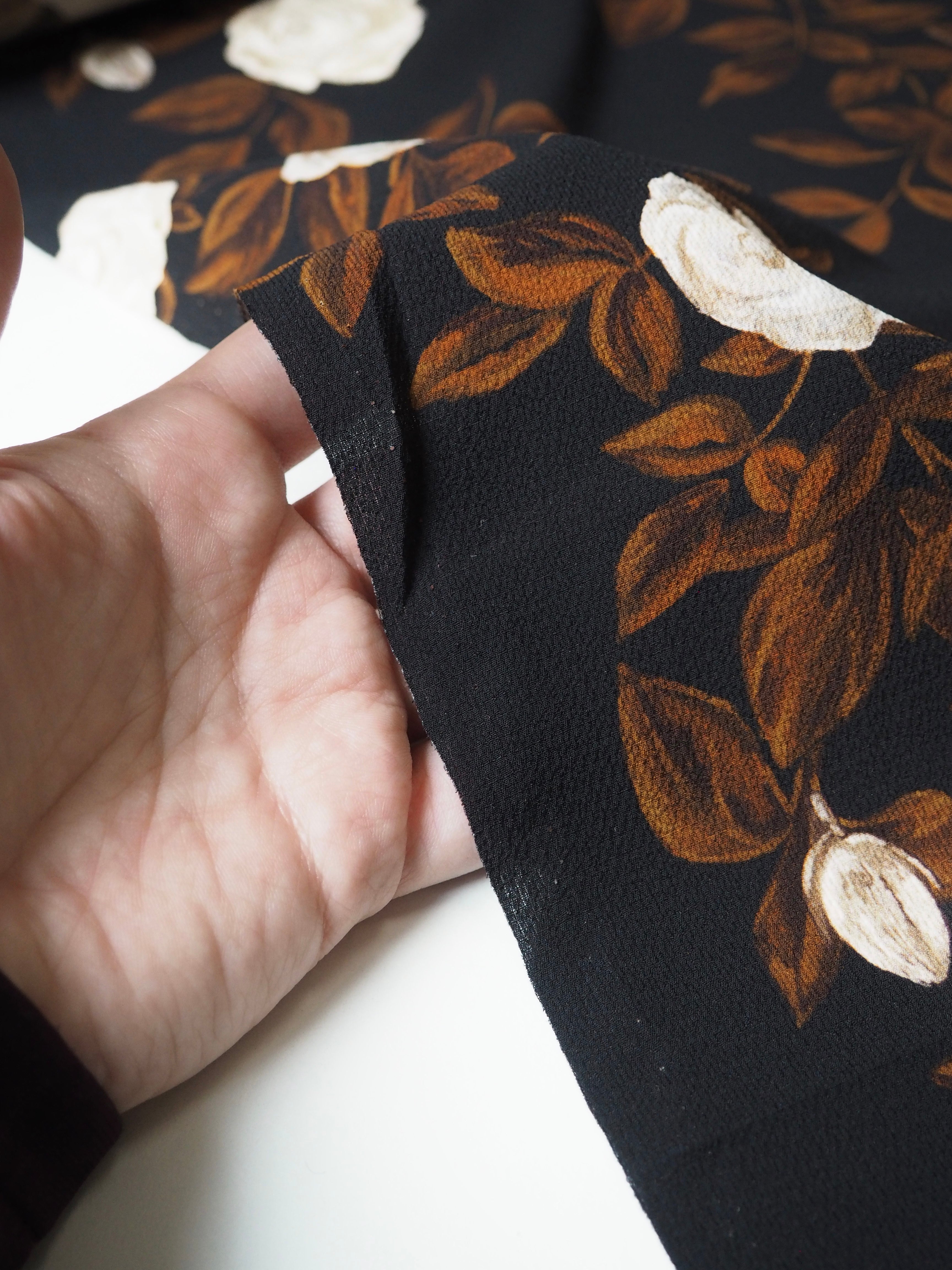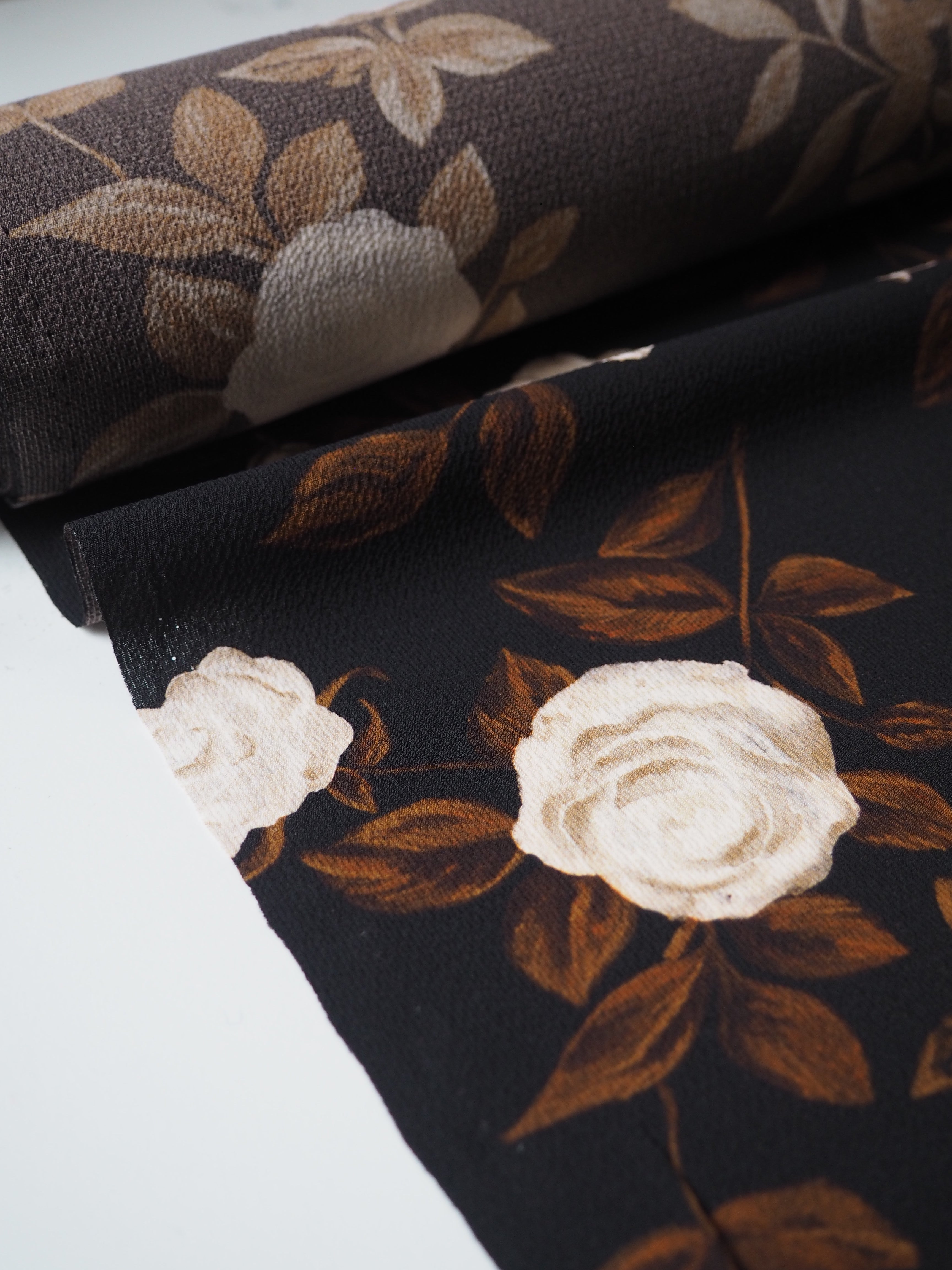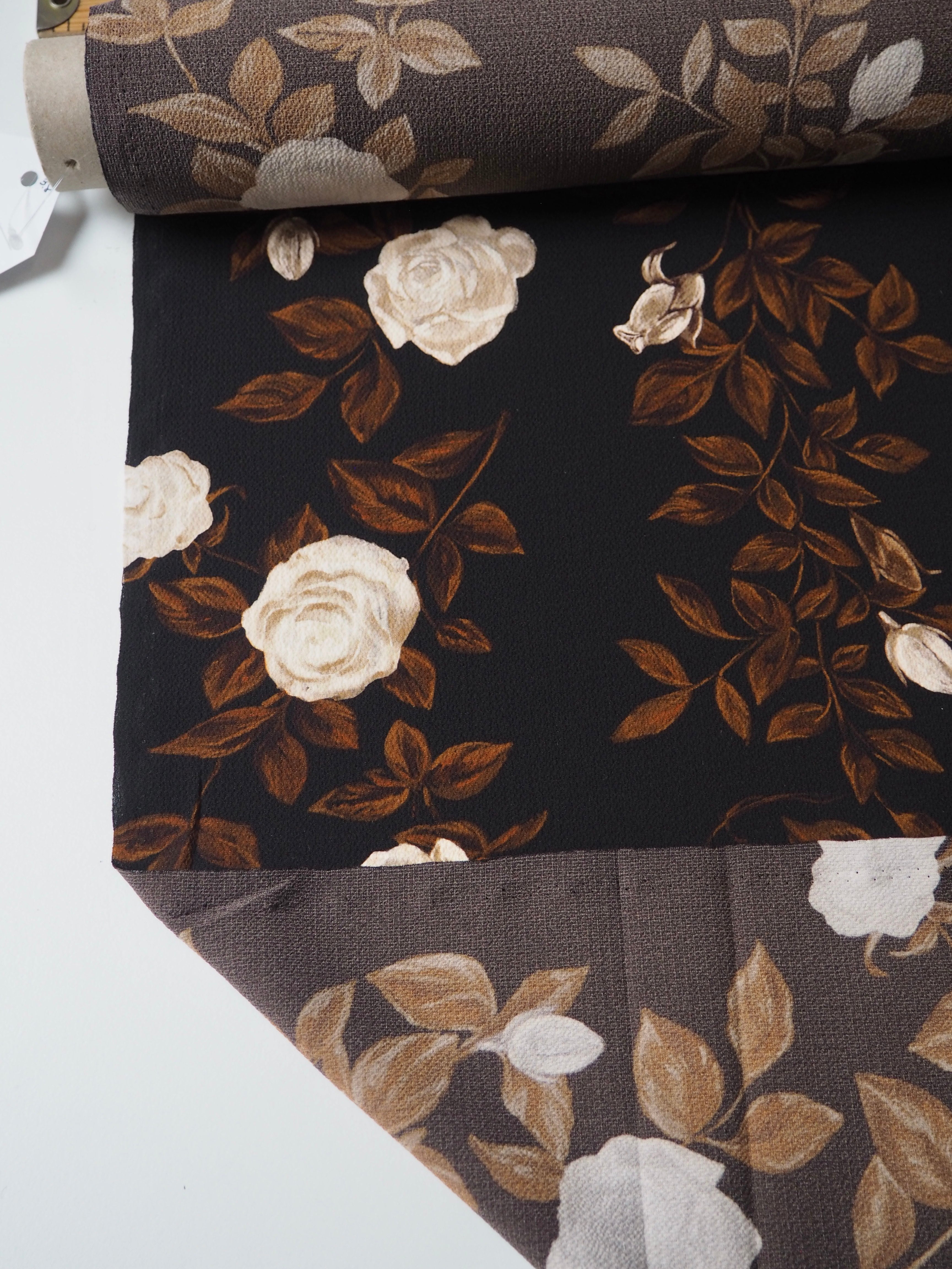This ex-designer fabric is a slightly crinkled crepe. It has an amazing drape, that is light and airy. It's black with brown and white blooms. It's an exclusive designer print. Opaque with such a lovely textured handle. Would make a lovely dress or top!