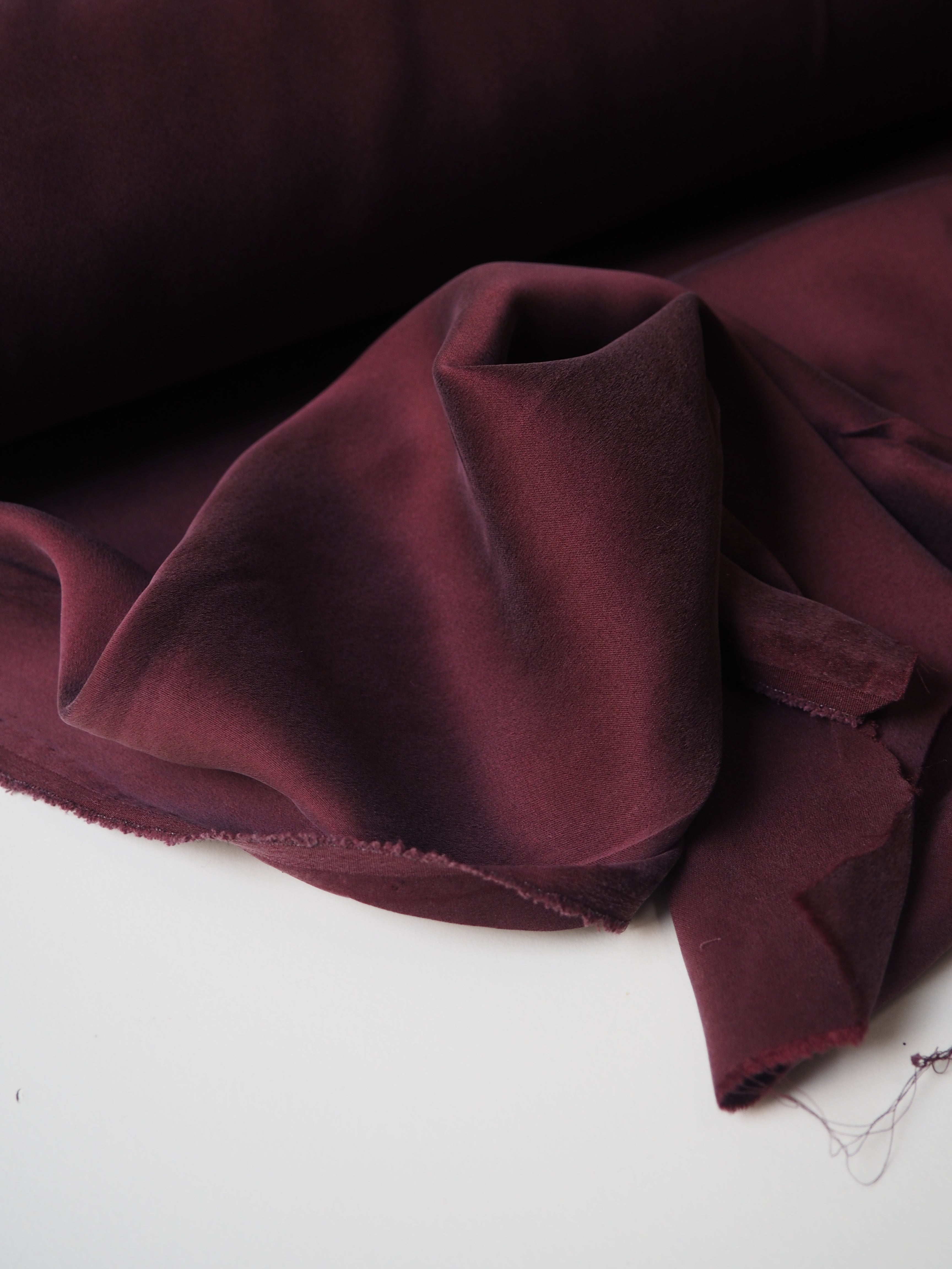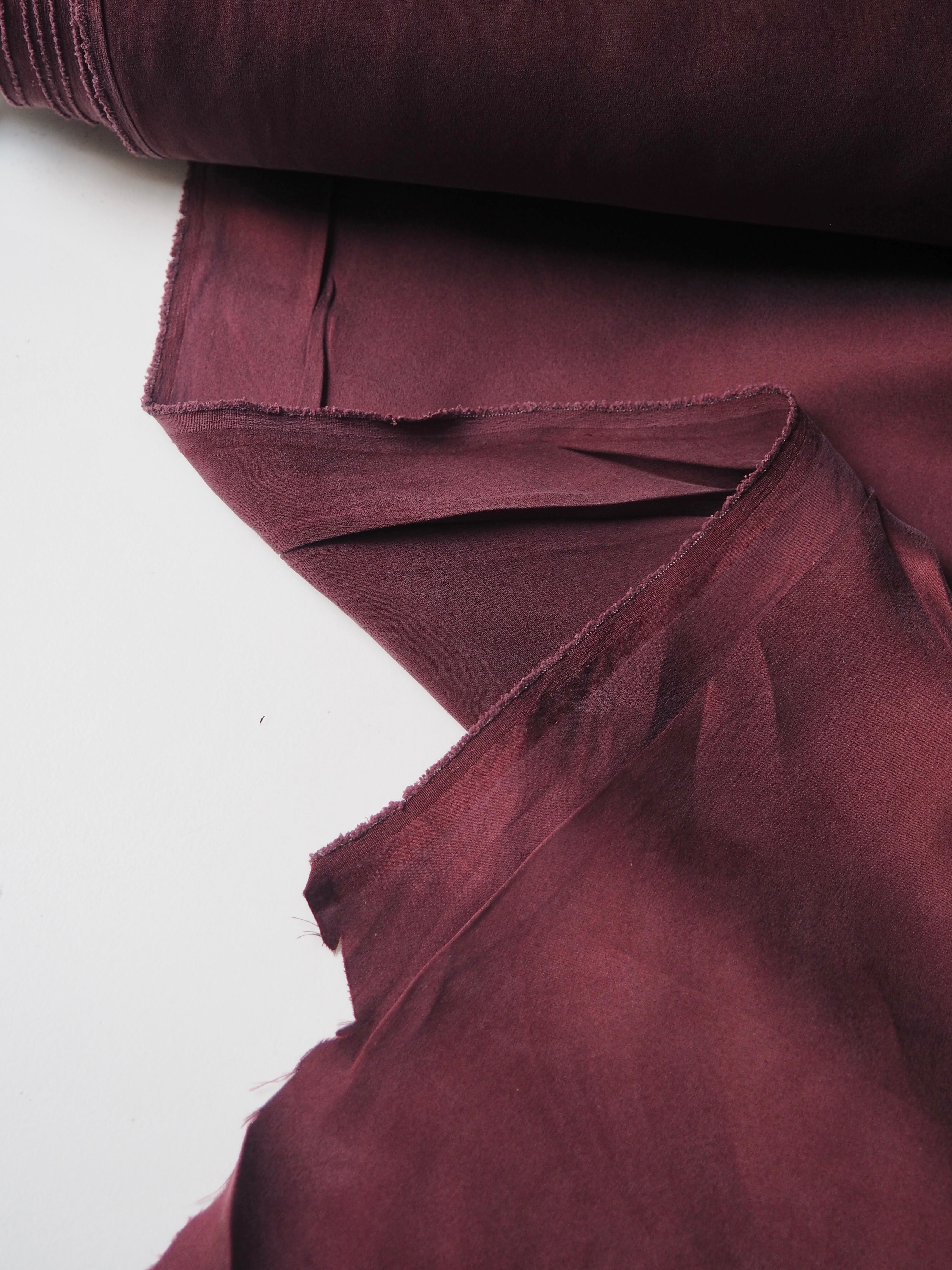 This ex-designer fabric is a washed silk. It's a luxuriously soft silk, with a washed finish. This makes the silk drape better and softens it. The stretch gives it more versatility, with about 15% width-ways. It has incredible liquid movement! Super lightweight and opaque. Such a wonderful handle, feels so fantastic to the touch! Perfect for skirts, blouses, and lingerie!