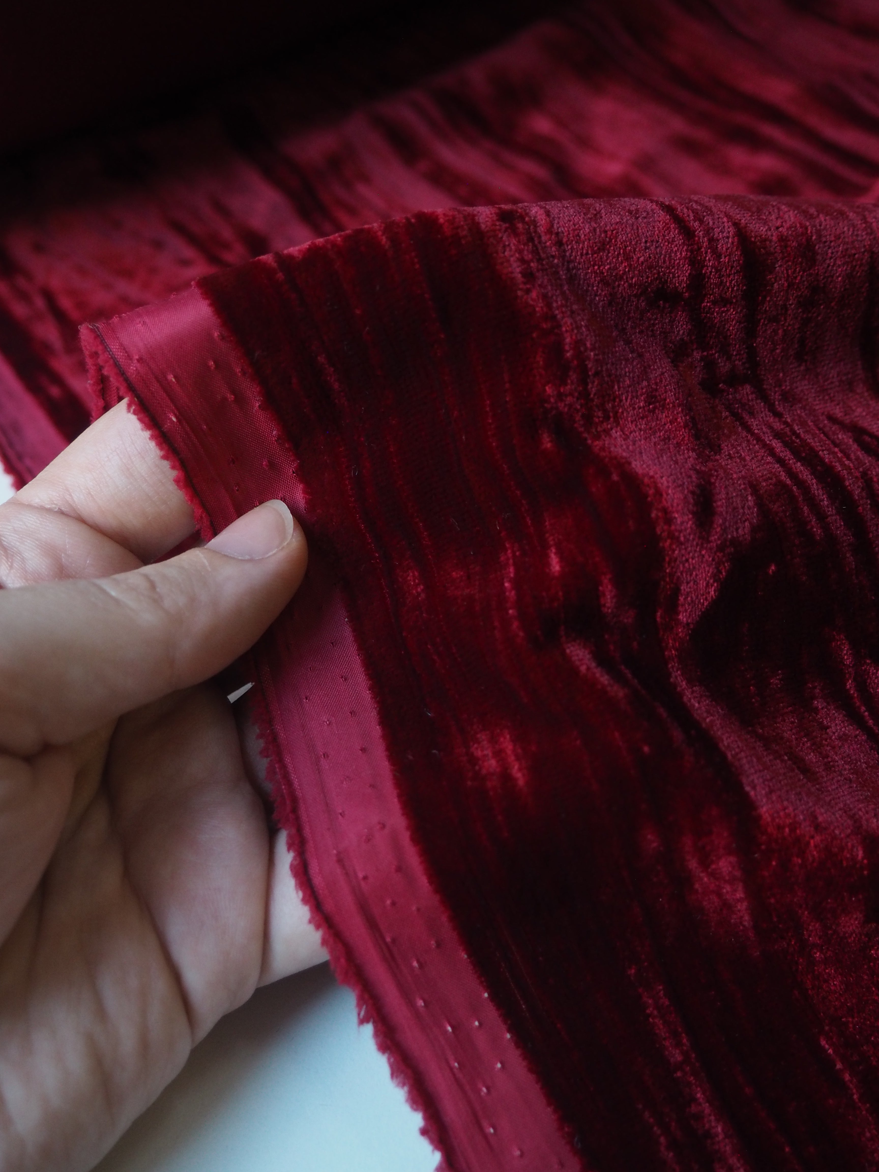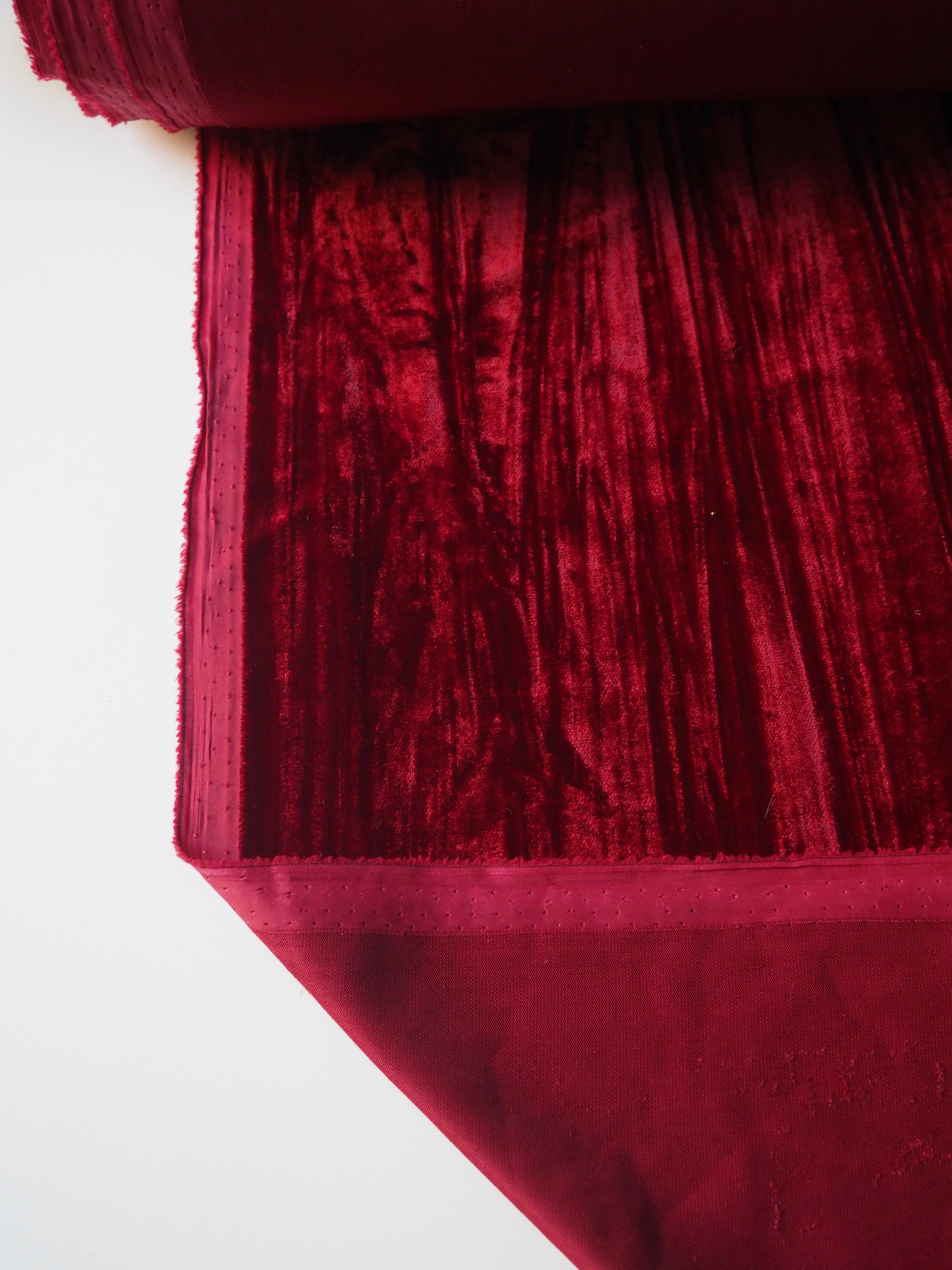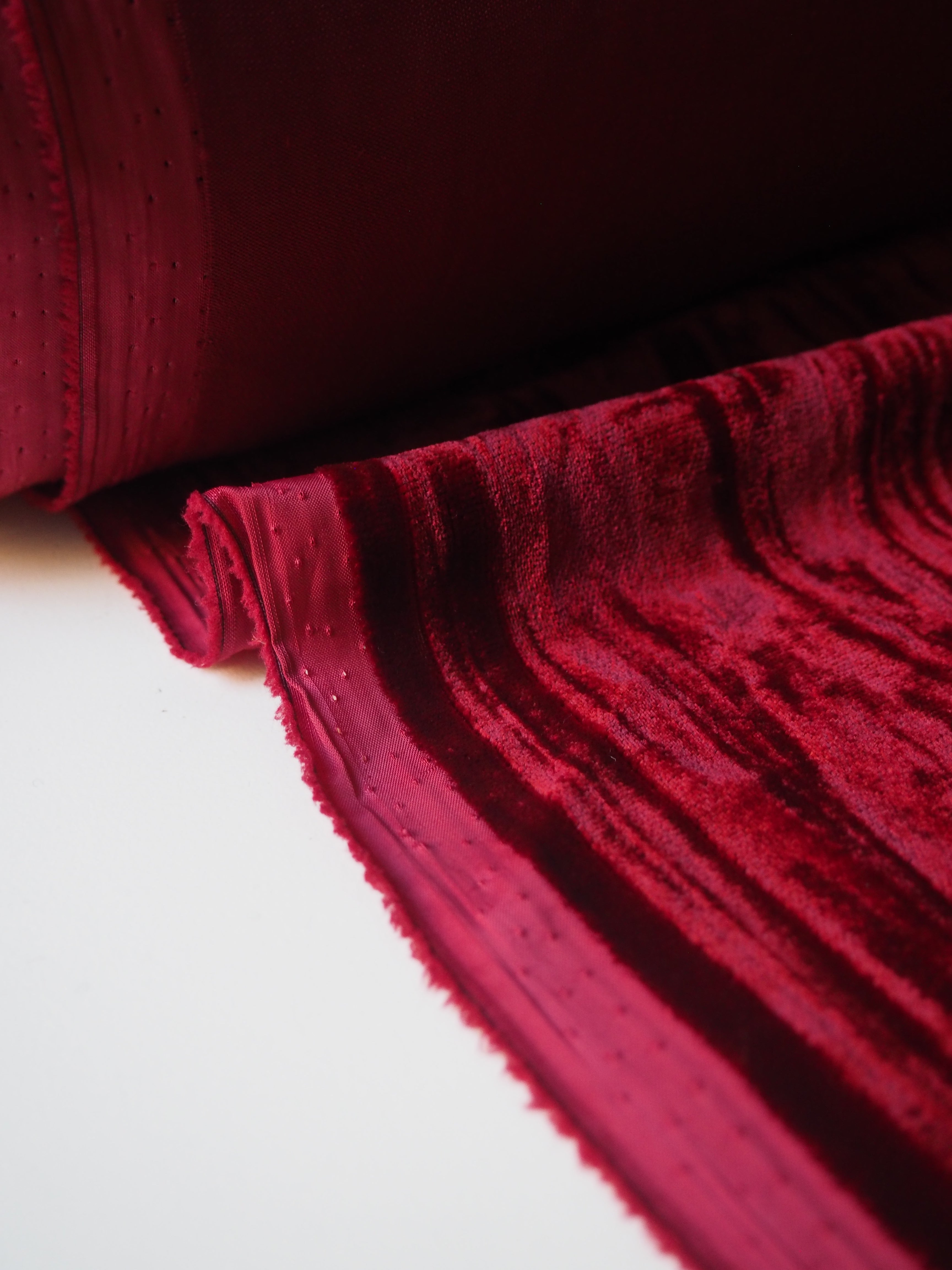 This ex-designer fabric is a sumptuous velvet. It's in a rich red colour, and is incredibly soft and lovely. It has a faux-pleated top finish that give visual depth and texture. It's opaque, with such a beautiful sheen as well. Has a light pile that is wonderful to handle. Light to medium weight and with a beautiful drape and lovely movement. Perfect for a dress or even a blouse!