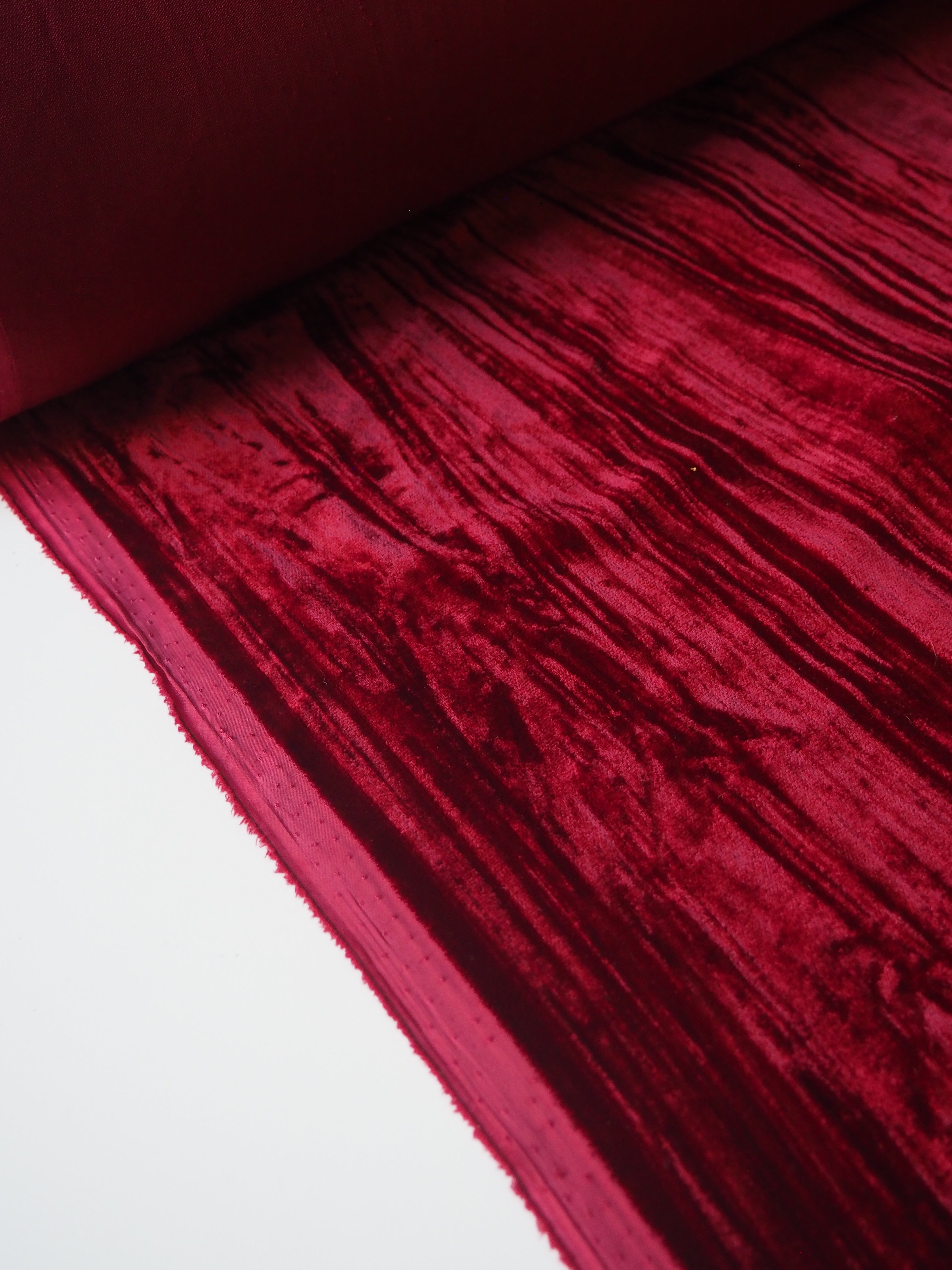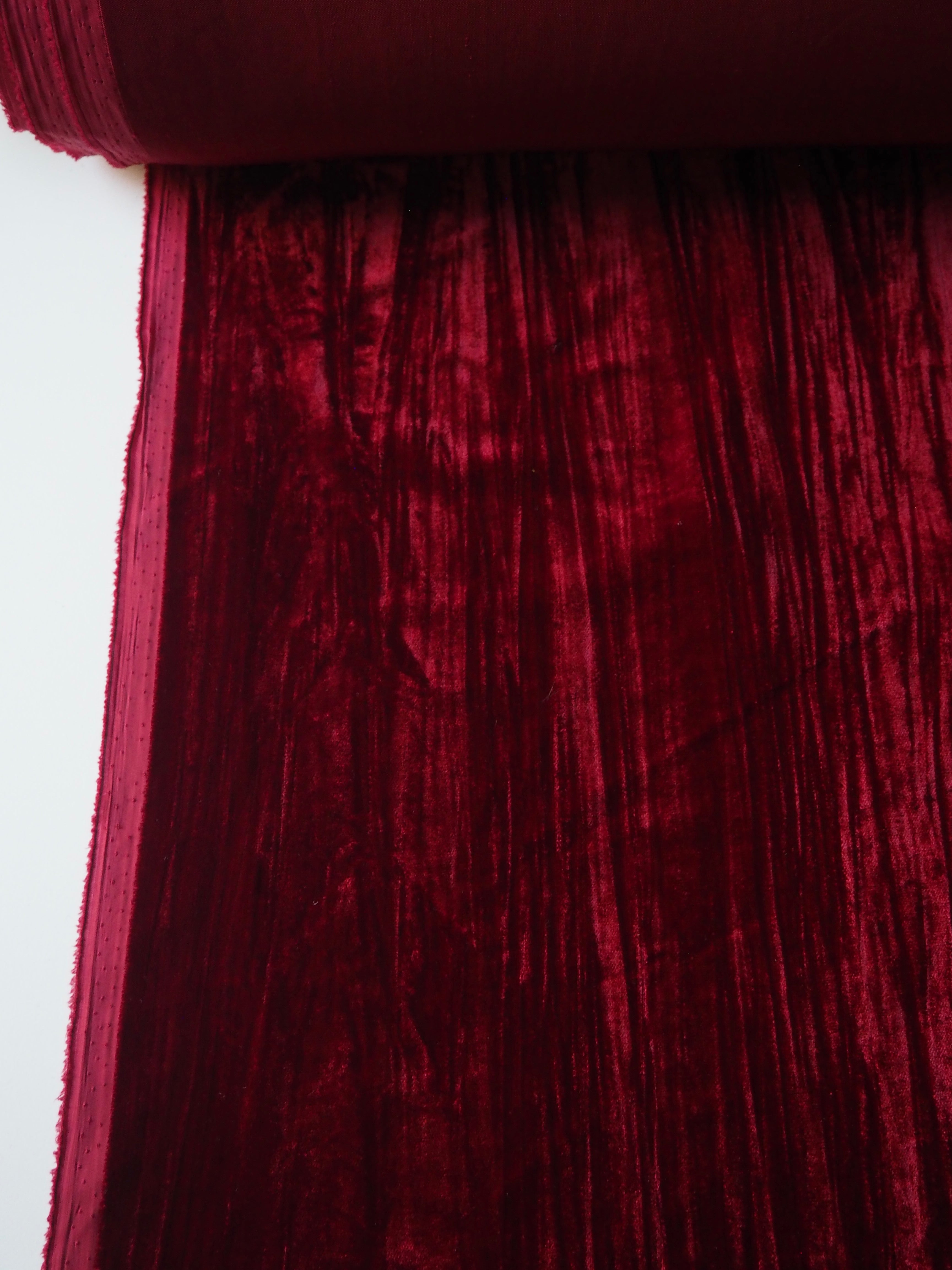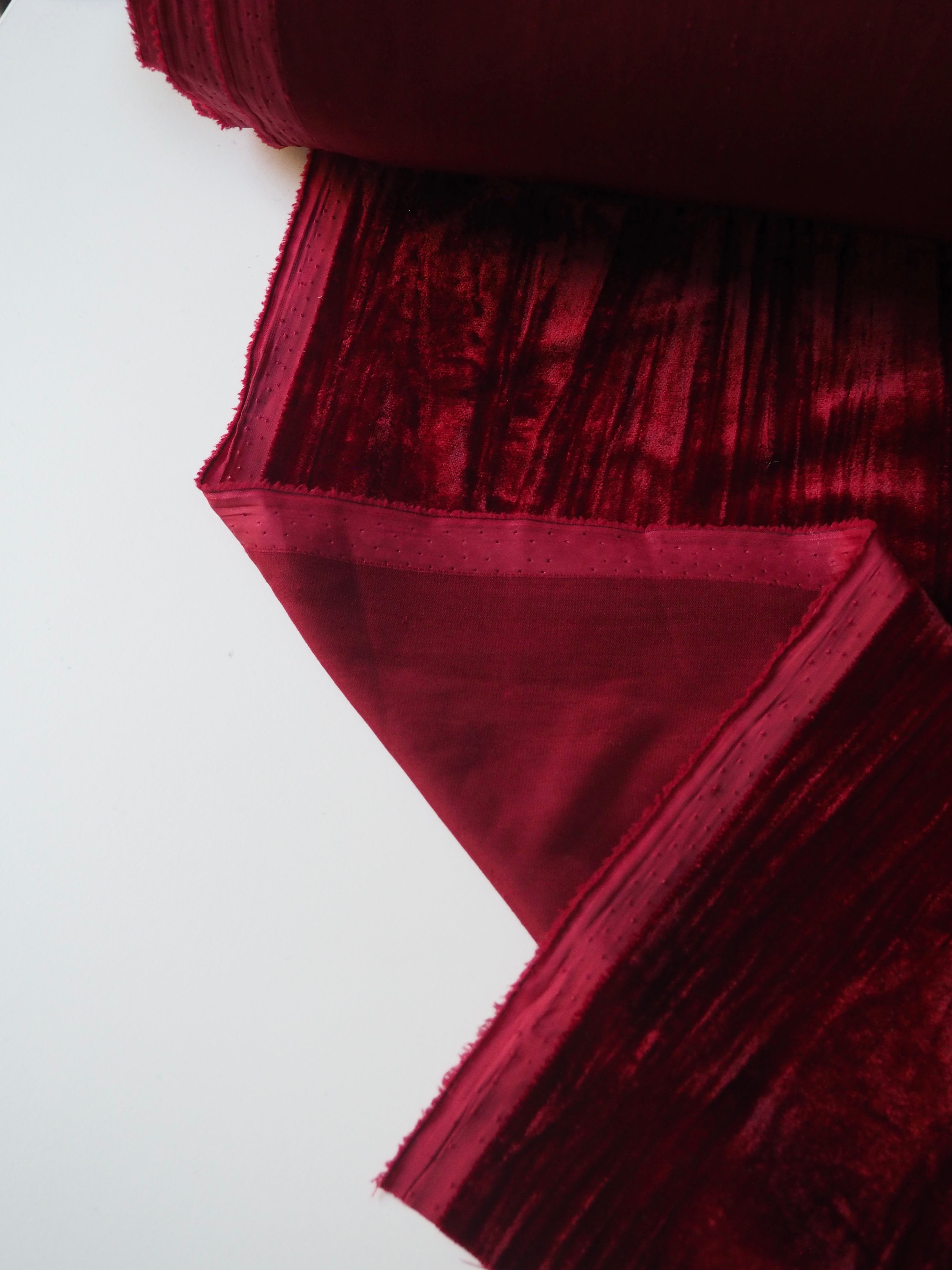 This ex-designer fabric is a sumptuous velvet. It's in a rich red colour, and is incredibly soft and lovely. It has a faux-pleated top finish that give visual depth and texture. It's opaque, with such a beautiful sheen as well. Has a light pile that is wonderful to handle. Light to medium weight and with a beautiful drape and lovely movement. Perfect for a dress or even a blouse!