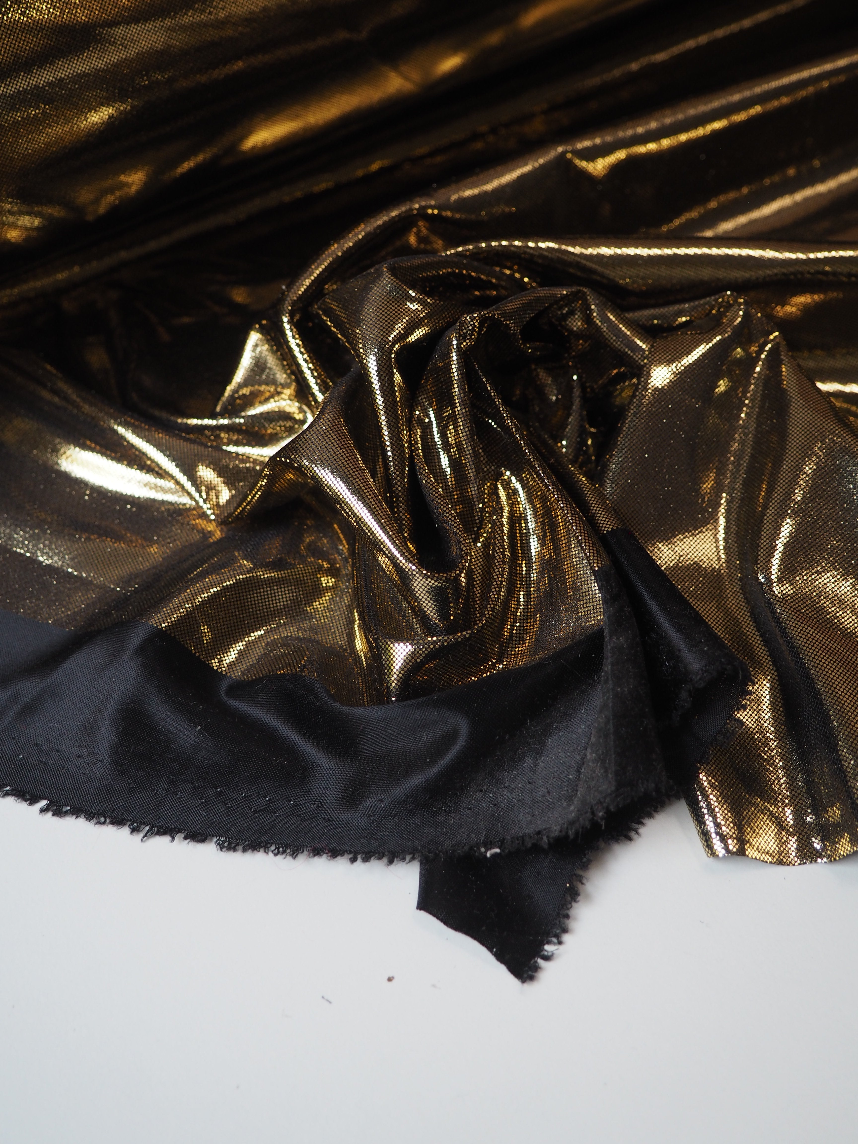This ex-designer fabric is a foiled jersey. This gold foiled jersey has a black base. It has a 40% widths-way stretch. Lightweight, and with a great drape, a soft but metallic textured handle. So bright and eye-catching! Would make the perfect party wrap dress!
