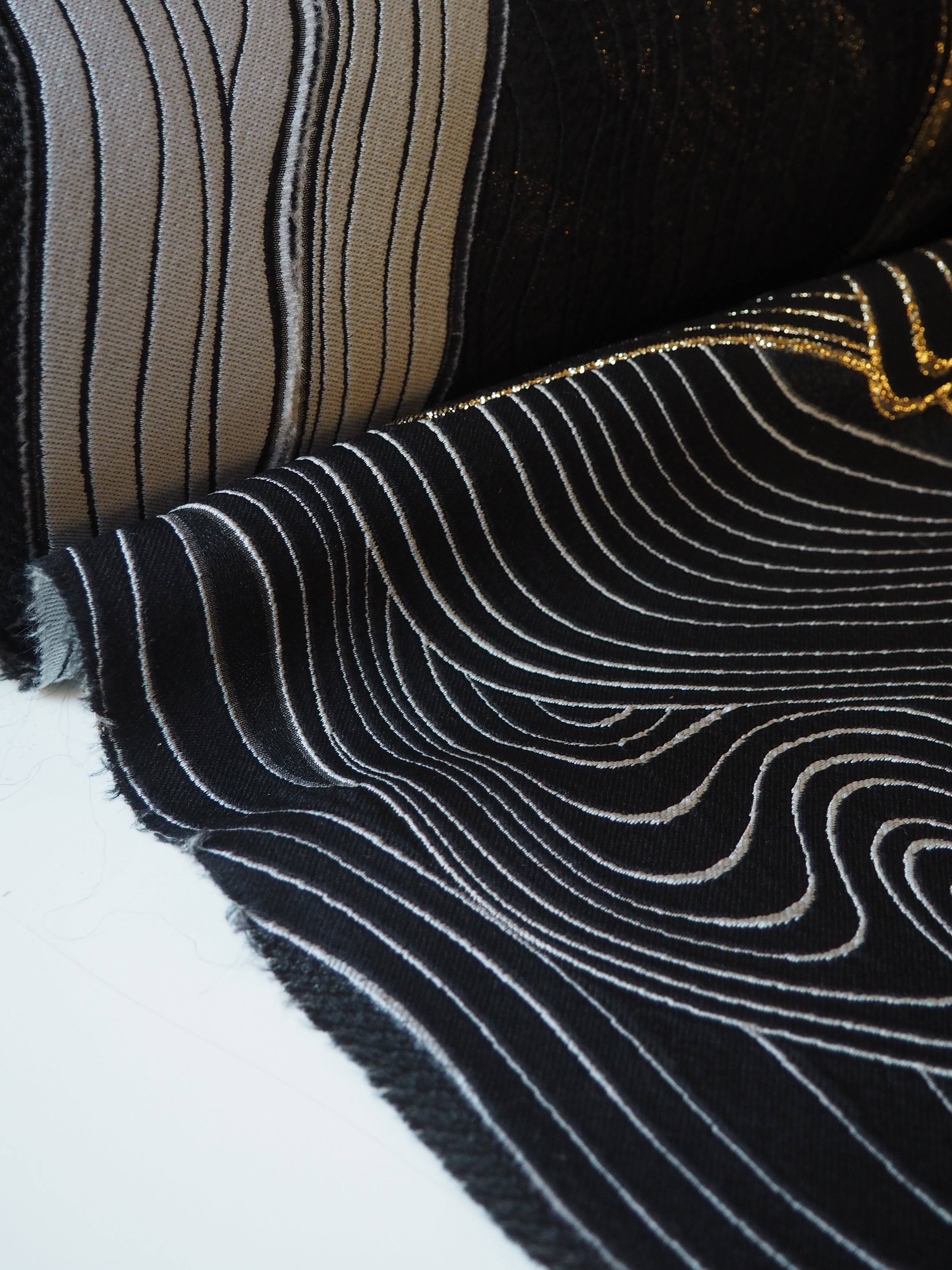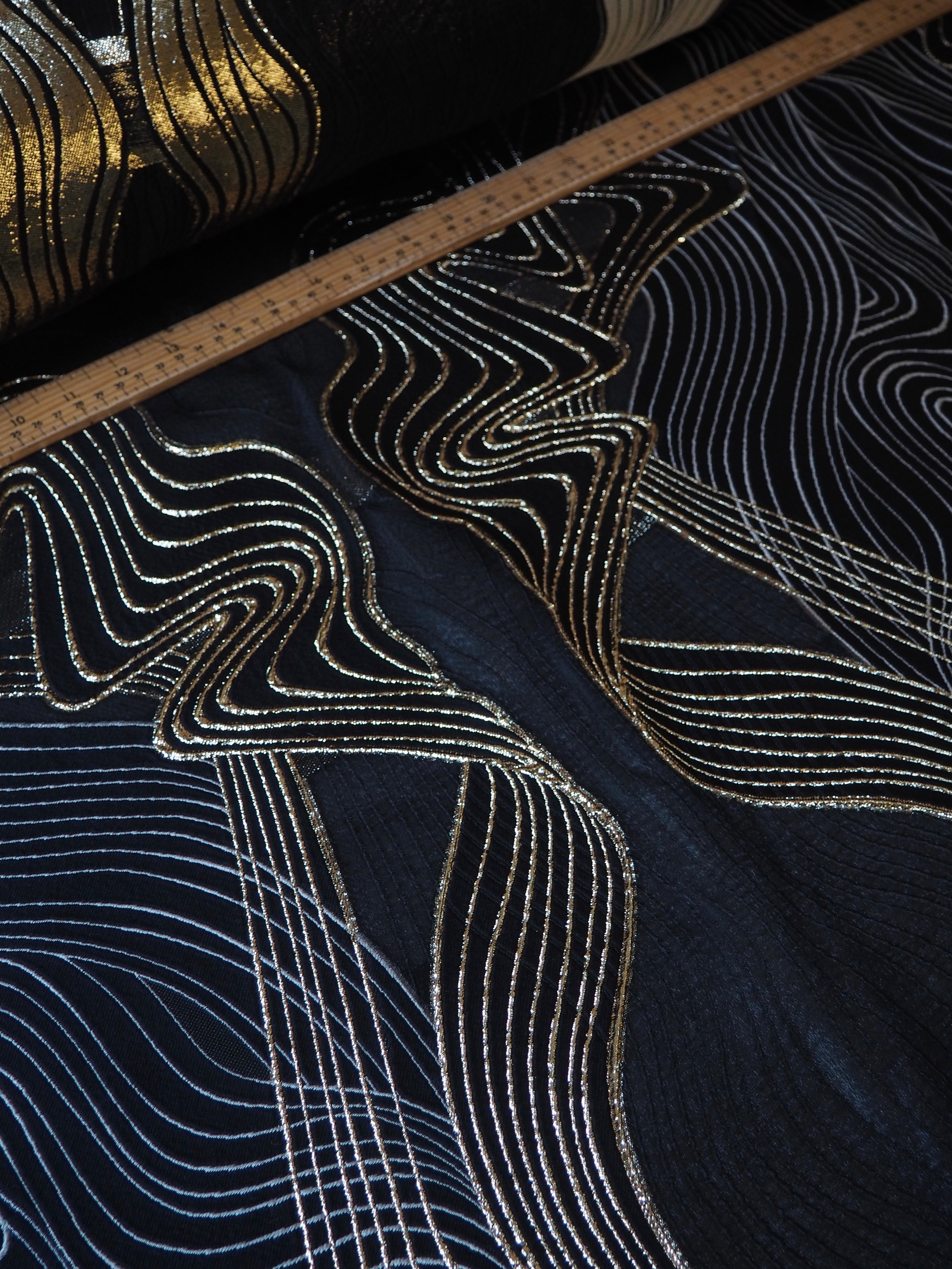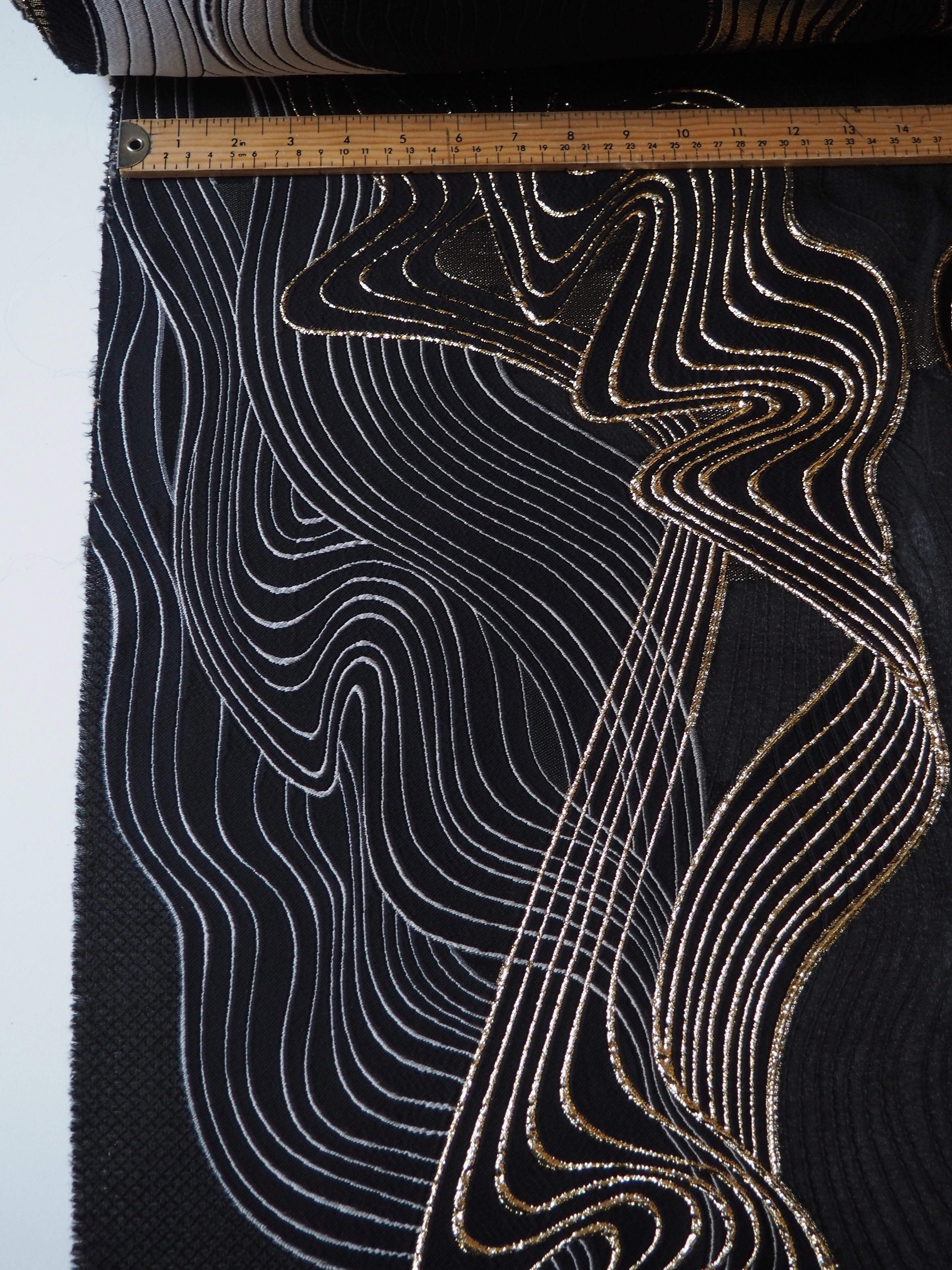 This ex-designer fabric is a jacquard. t's a gold and natural coloured wave jacquard on black. The wave design is a jacquard weave with the black sections more of a bouncy cloqué It's opaque on the jacquard and semi-sheer on the cloqué. Lightweight with a soft structure. Has such a lovely handle. Would make a beautiful top of light jacket for an evening out!