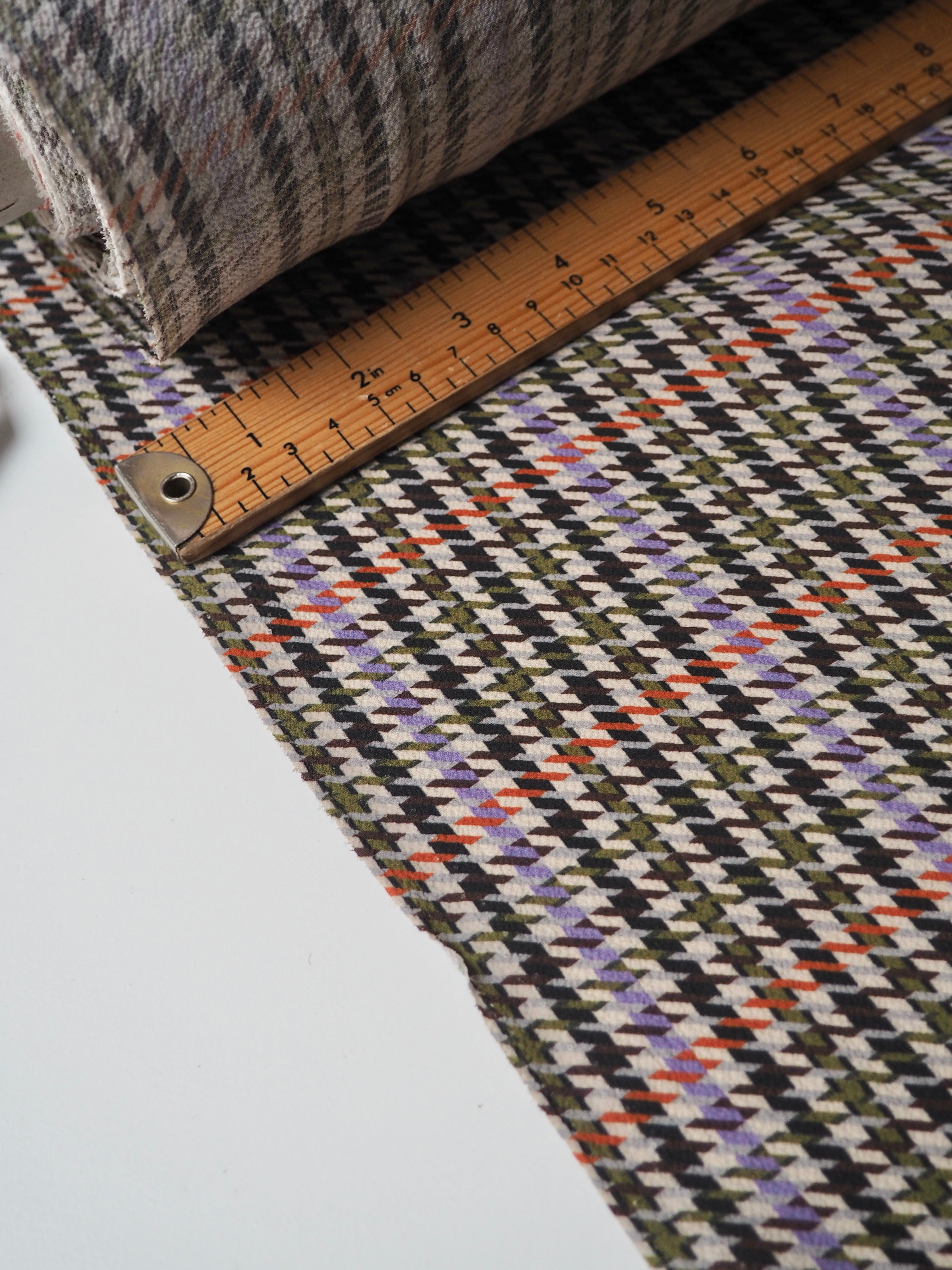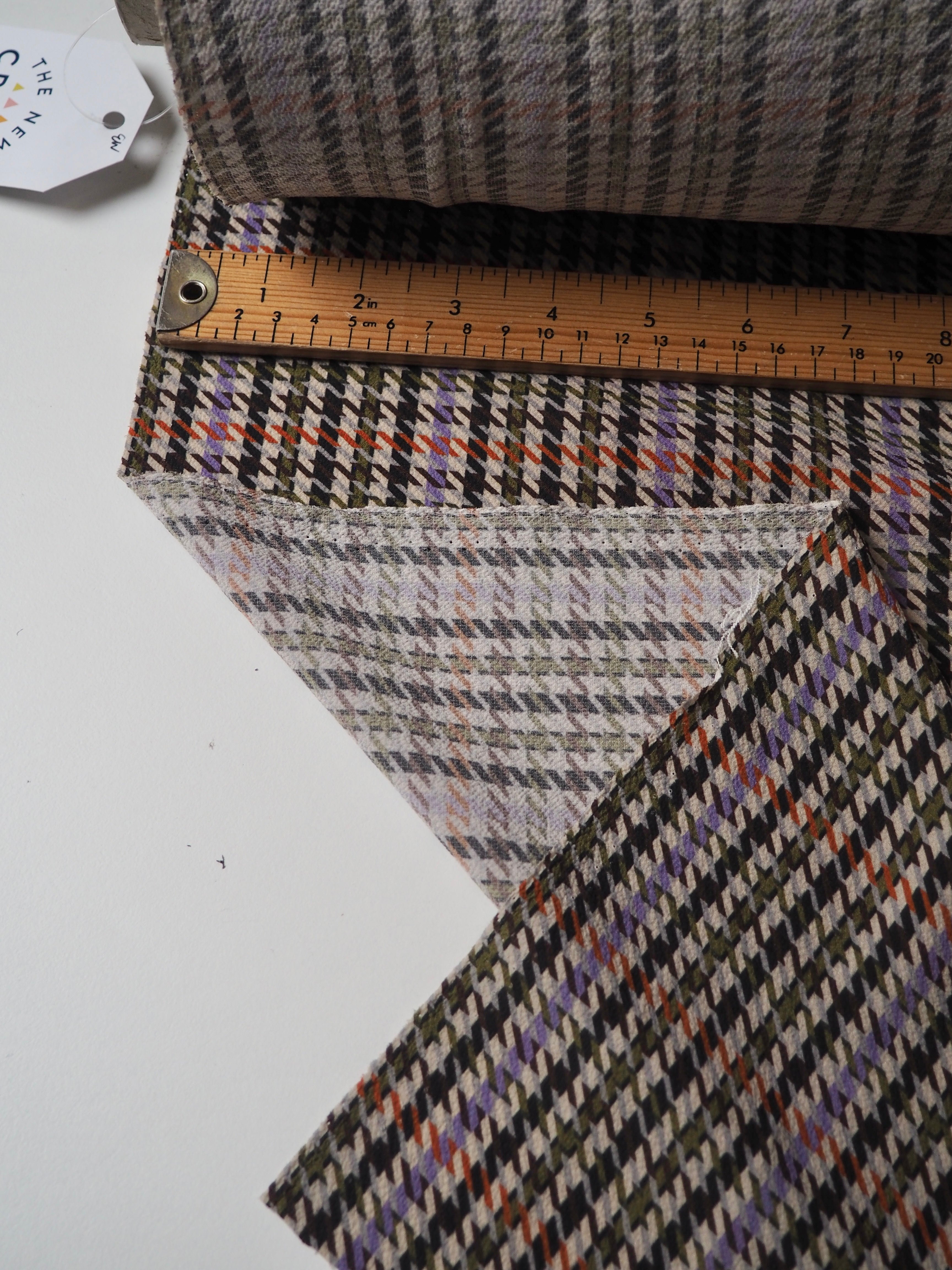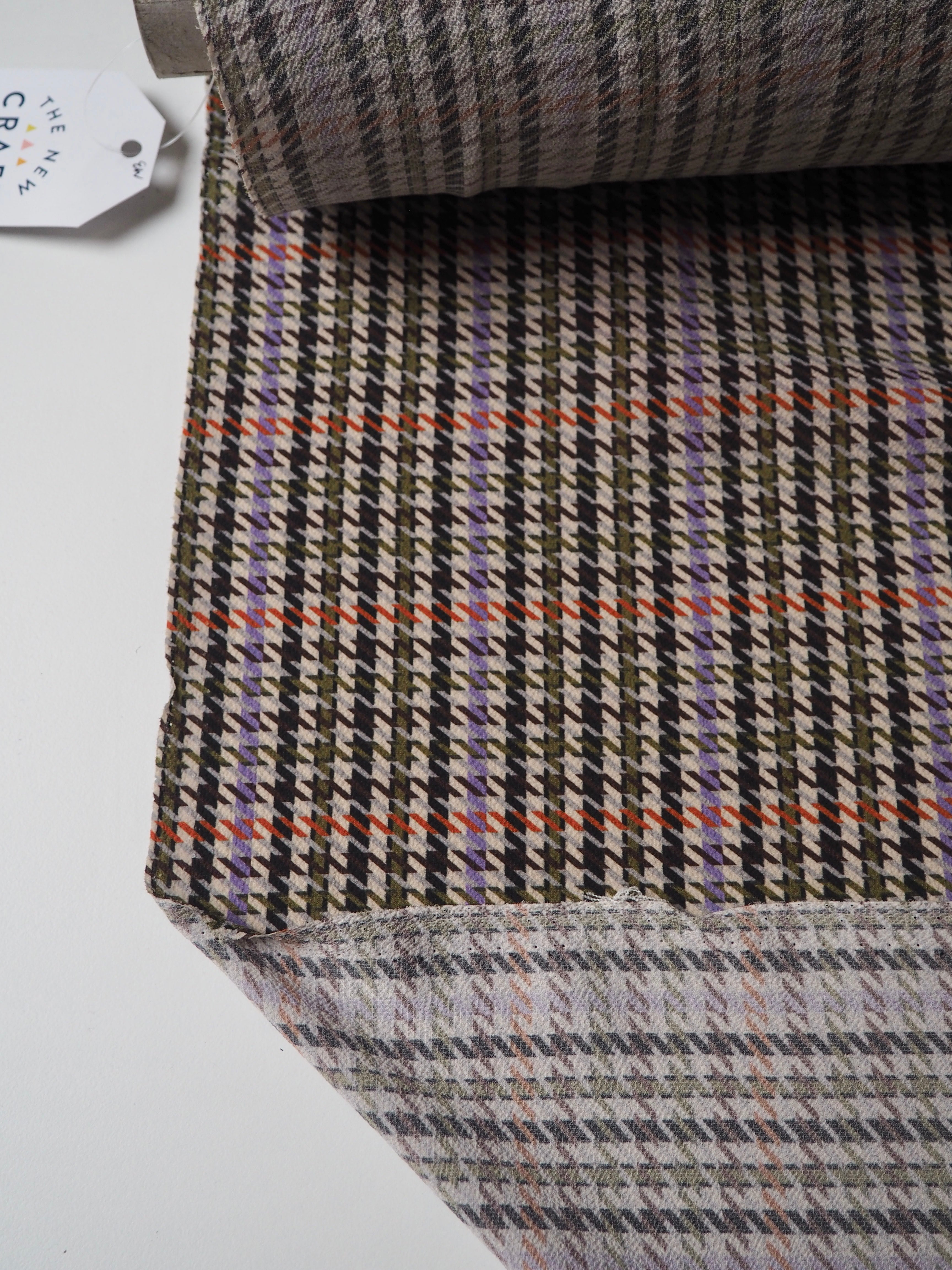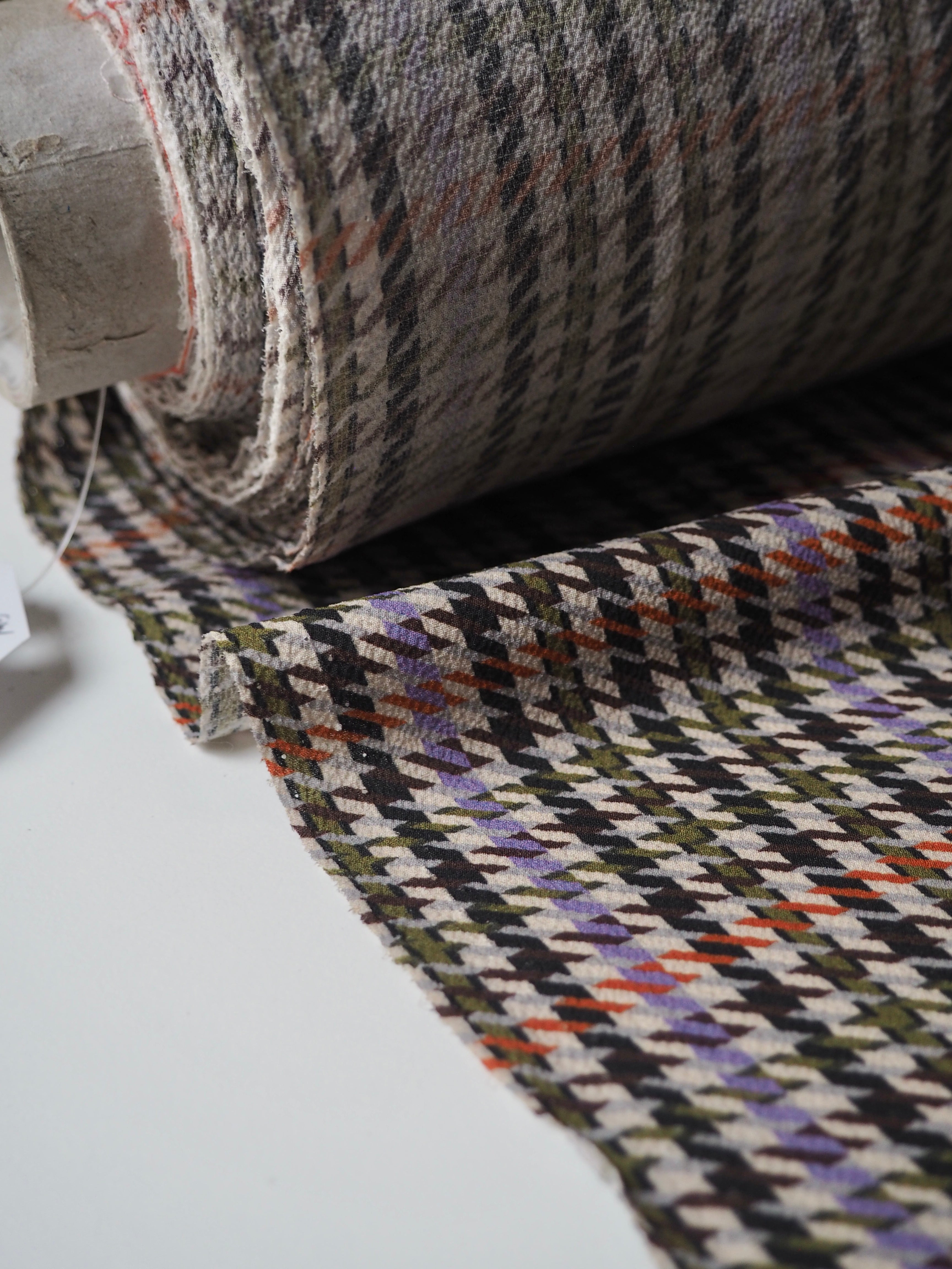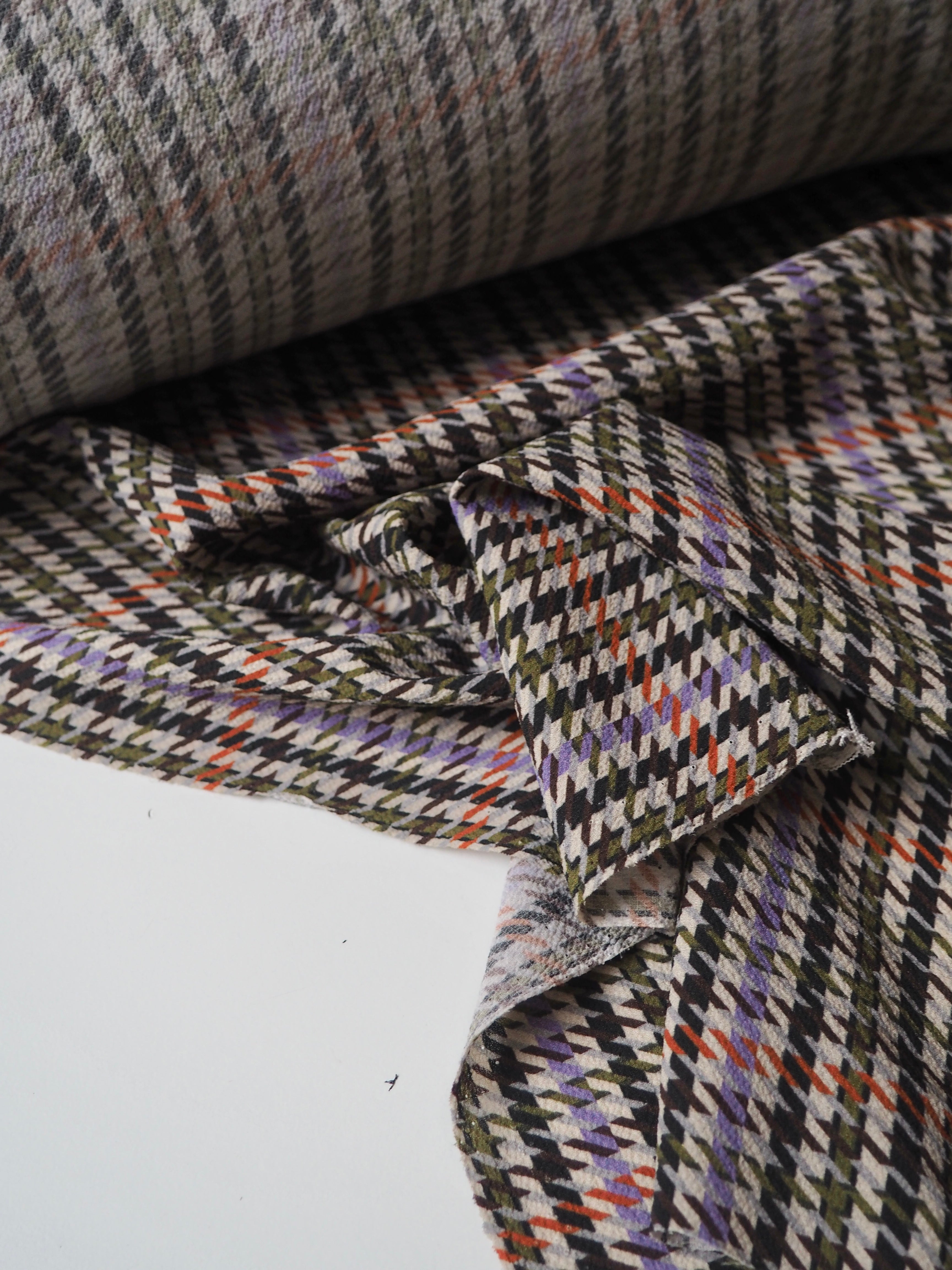 This ex-designer fabric is a slightly crinkled crepe. It has an amazing drape, that is light and airy. It's a multi-coloured houndstooth print, that is an exclusive designer print. Opaque with such a lovely textured handle. Would make a lovely dress or top!