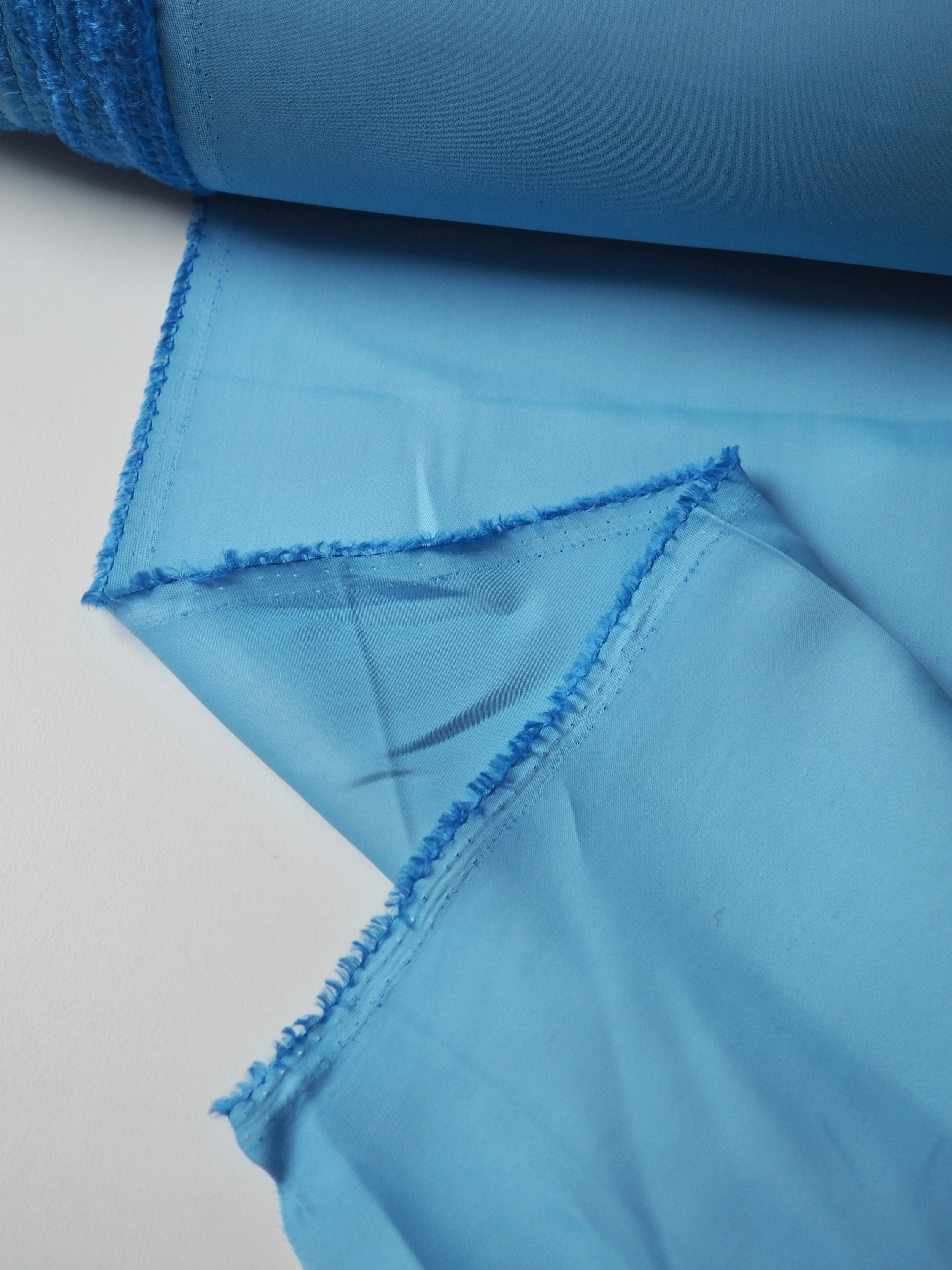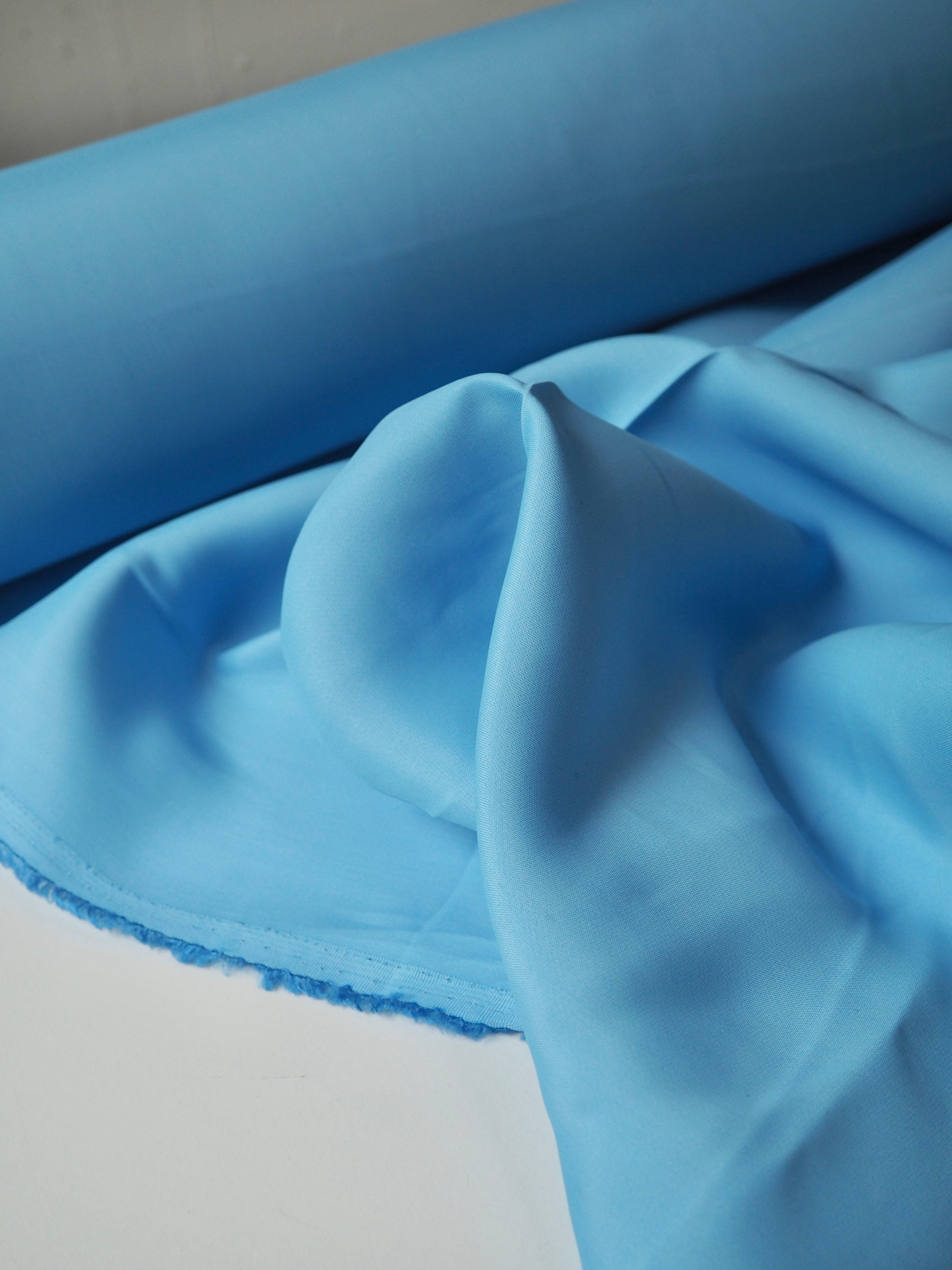This ex-designer fabric is a sateen. It's in a rich light blue shade, with a lighter weight. It has a very smooth handle, a very slinky feel, and great movement and drape. Has a lovely satin sheen on the topside, with a smooth reverse. Has a lovely handle, and is fully opaque. Perfect for dresses or swishy trousers!
