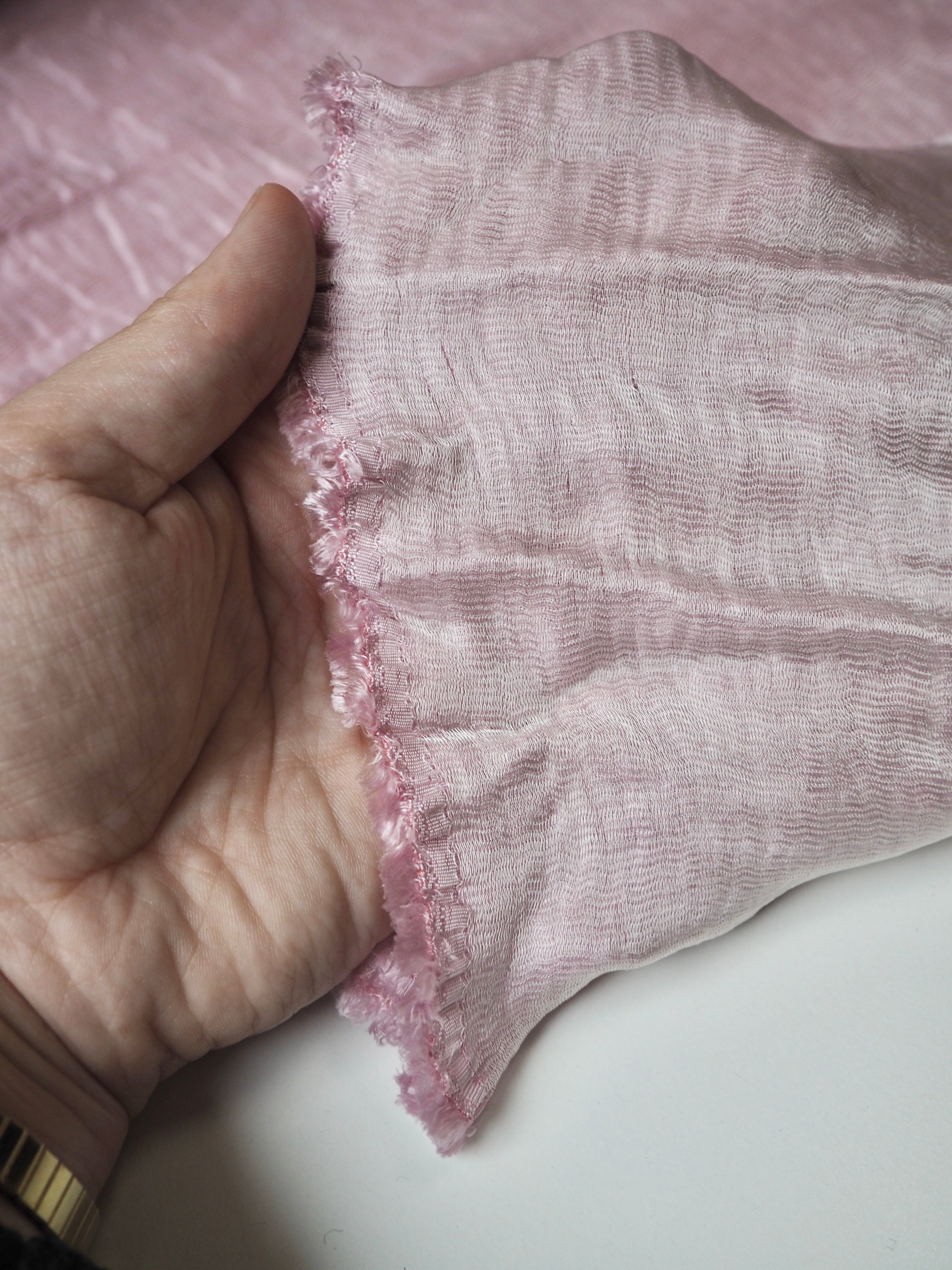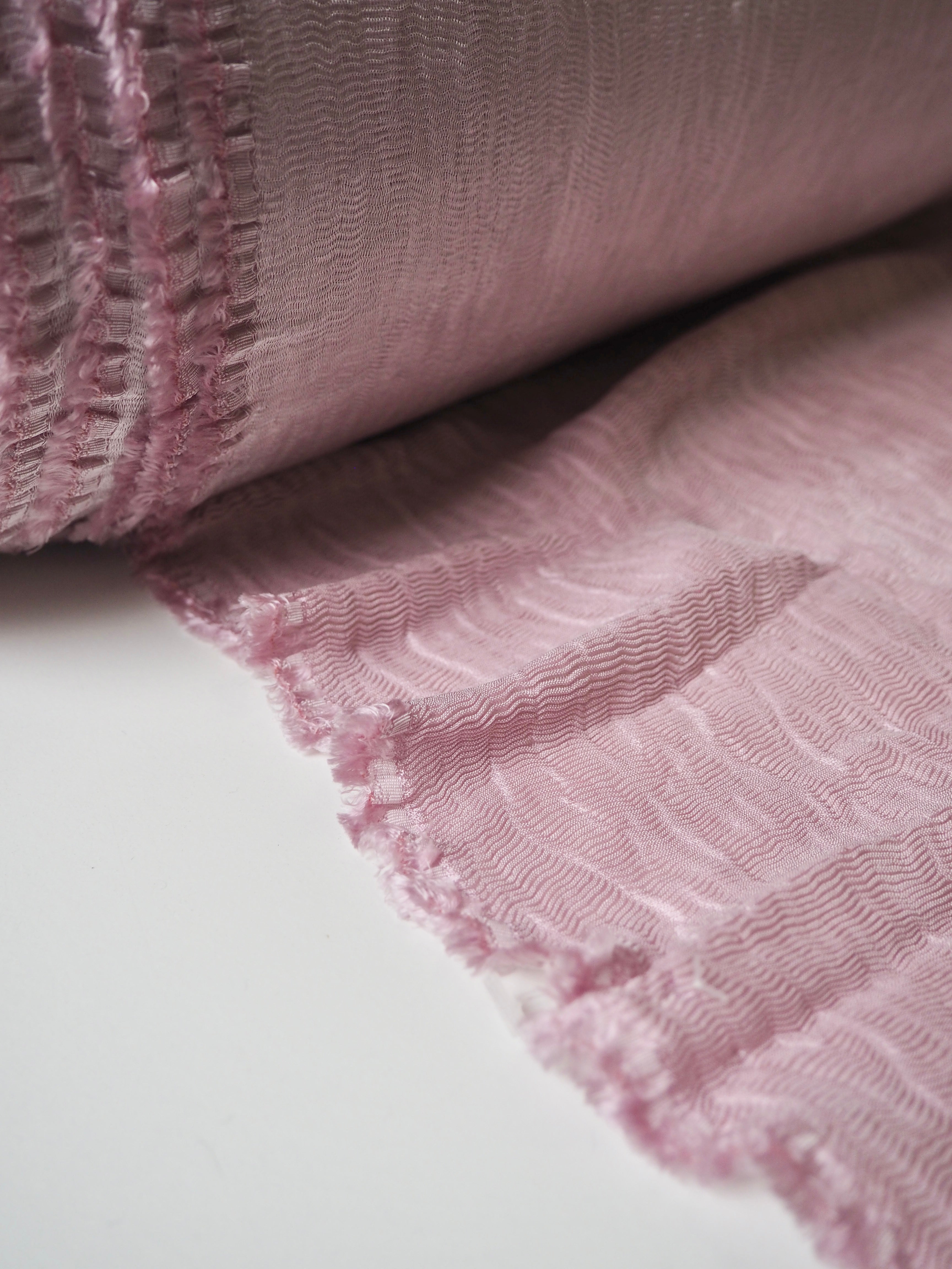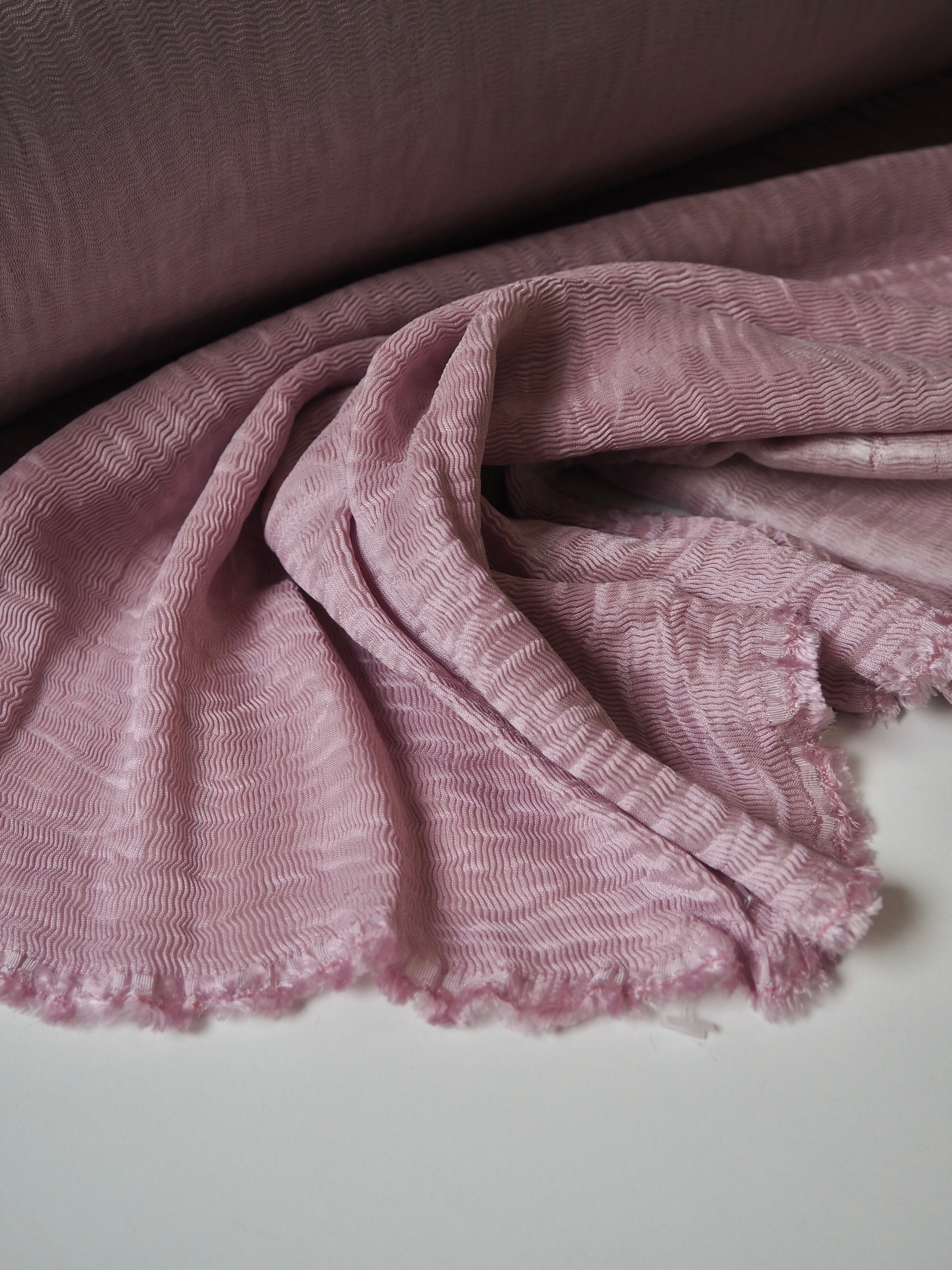 This ex-designer fabric is a unique cloqué. It has a plissé pleated topside, with a flat but super slinky and smooth reverse. It has about 15% stretch length ways. It's made of bamboo cupro, which gives it a very smooth and slightly washed handle, and would make such figure hugging and beautifully swishy projects! It's light to medium weight, opaque, and has a great natural bounce from the pleating. Such a lovely and special cloth! Can't wait to see some lovely tops and skirts!