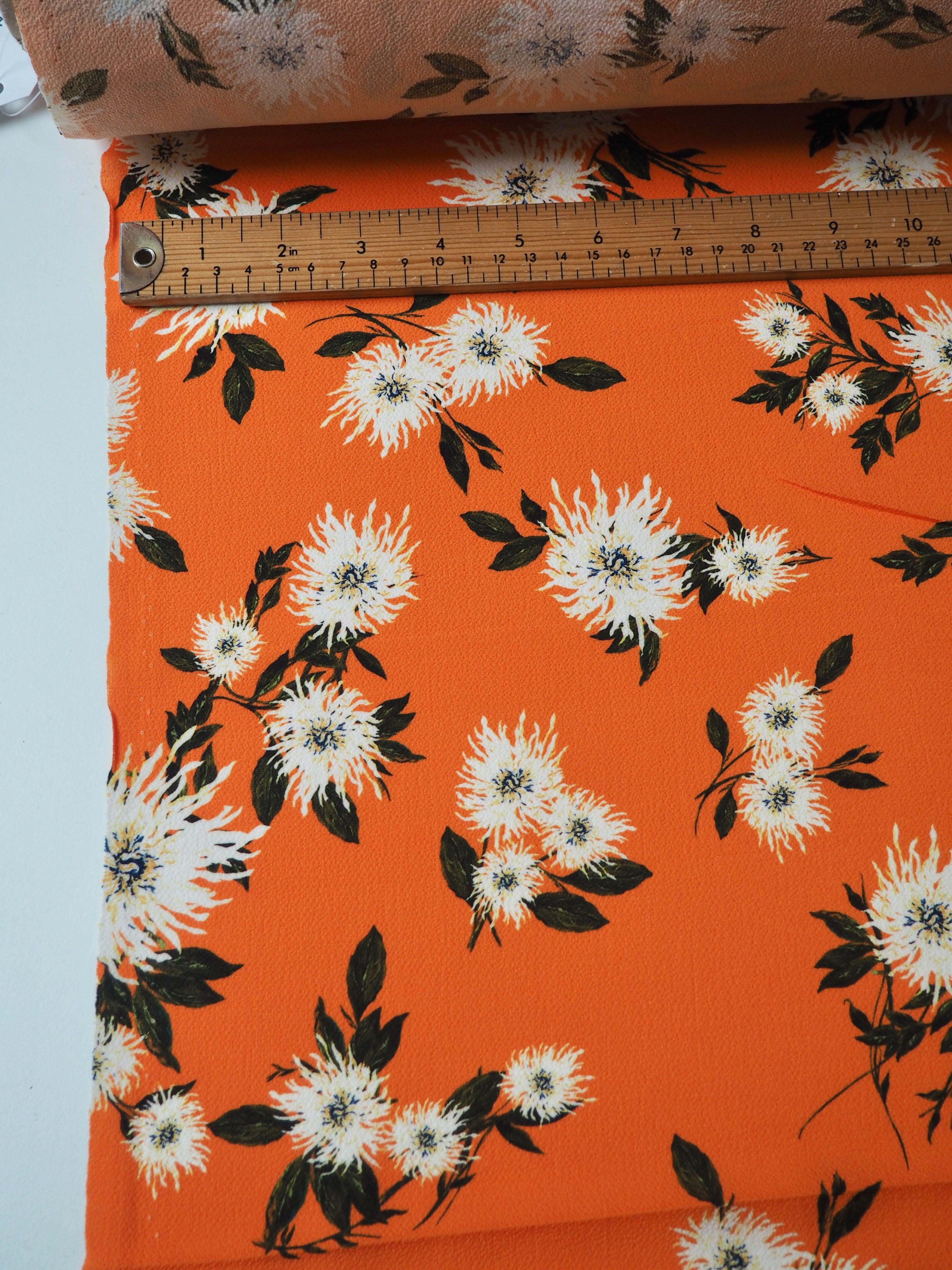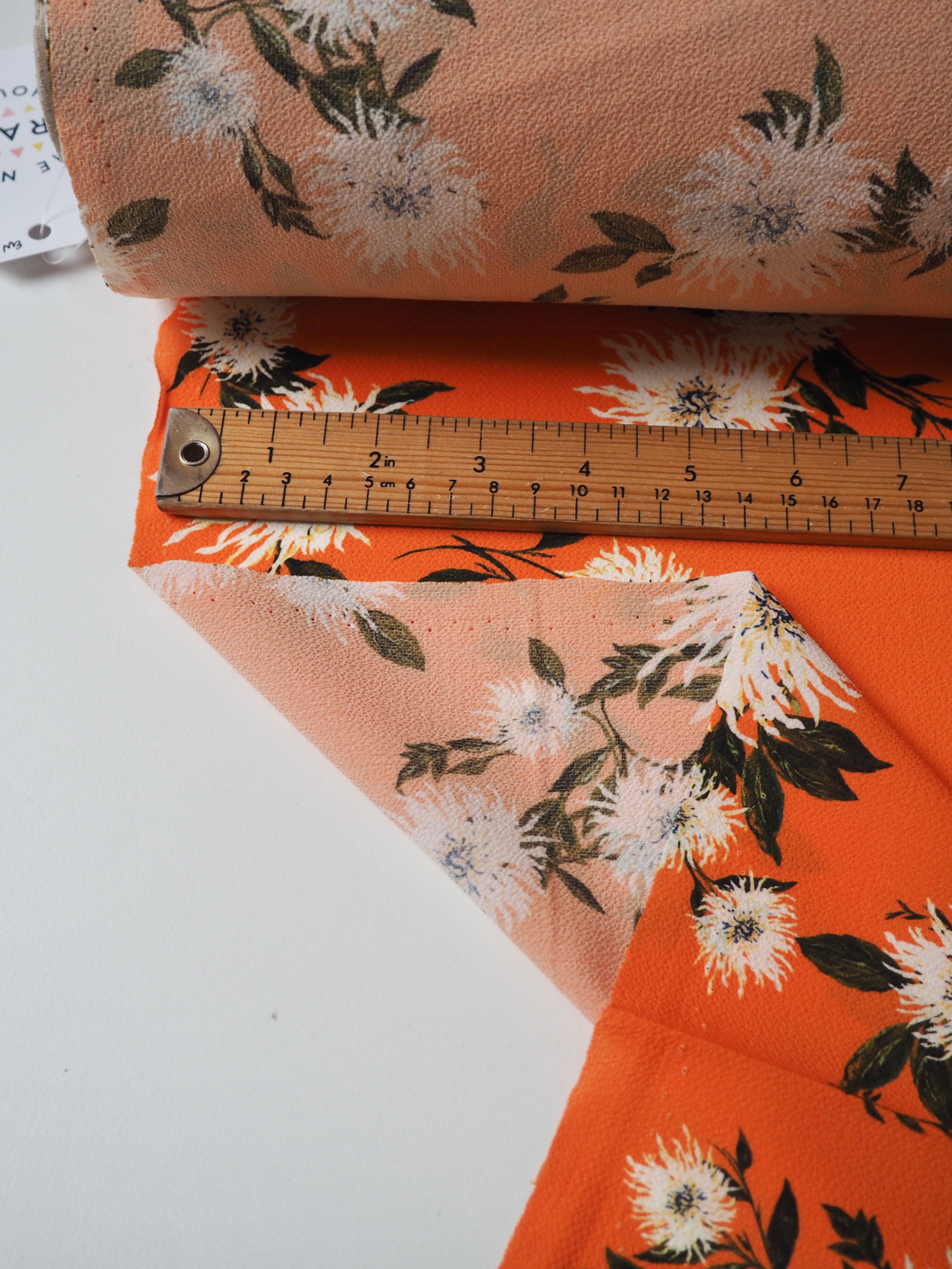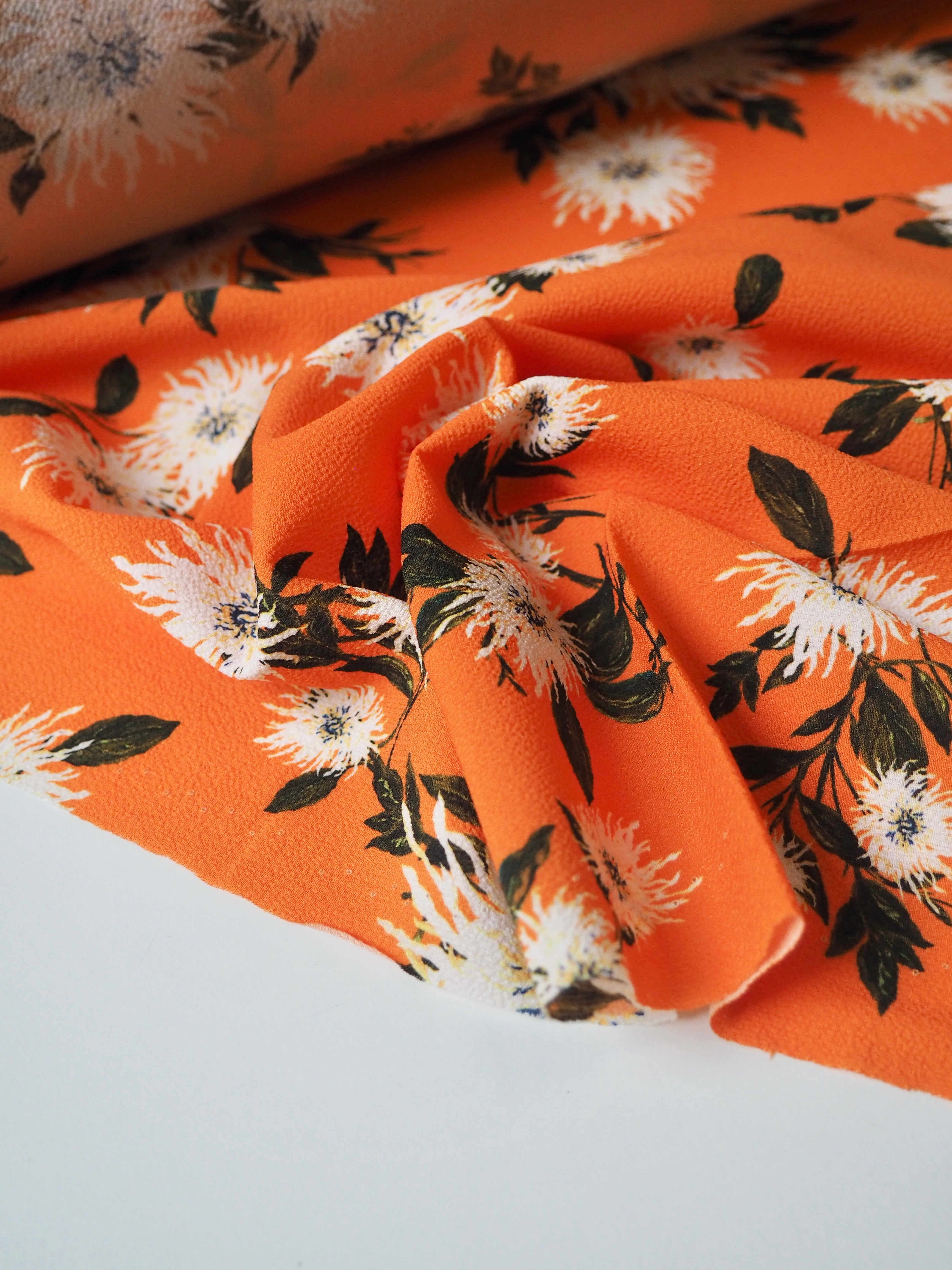This ex-designer fabric is a crinkle crepe. It has an amazing drape, that is light and airy. It's orange with white and green blooms. It's an exclusive designer print. Opaque with such a lovely textured handle. Would make a lovely dress or top!