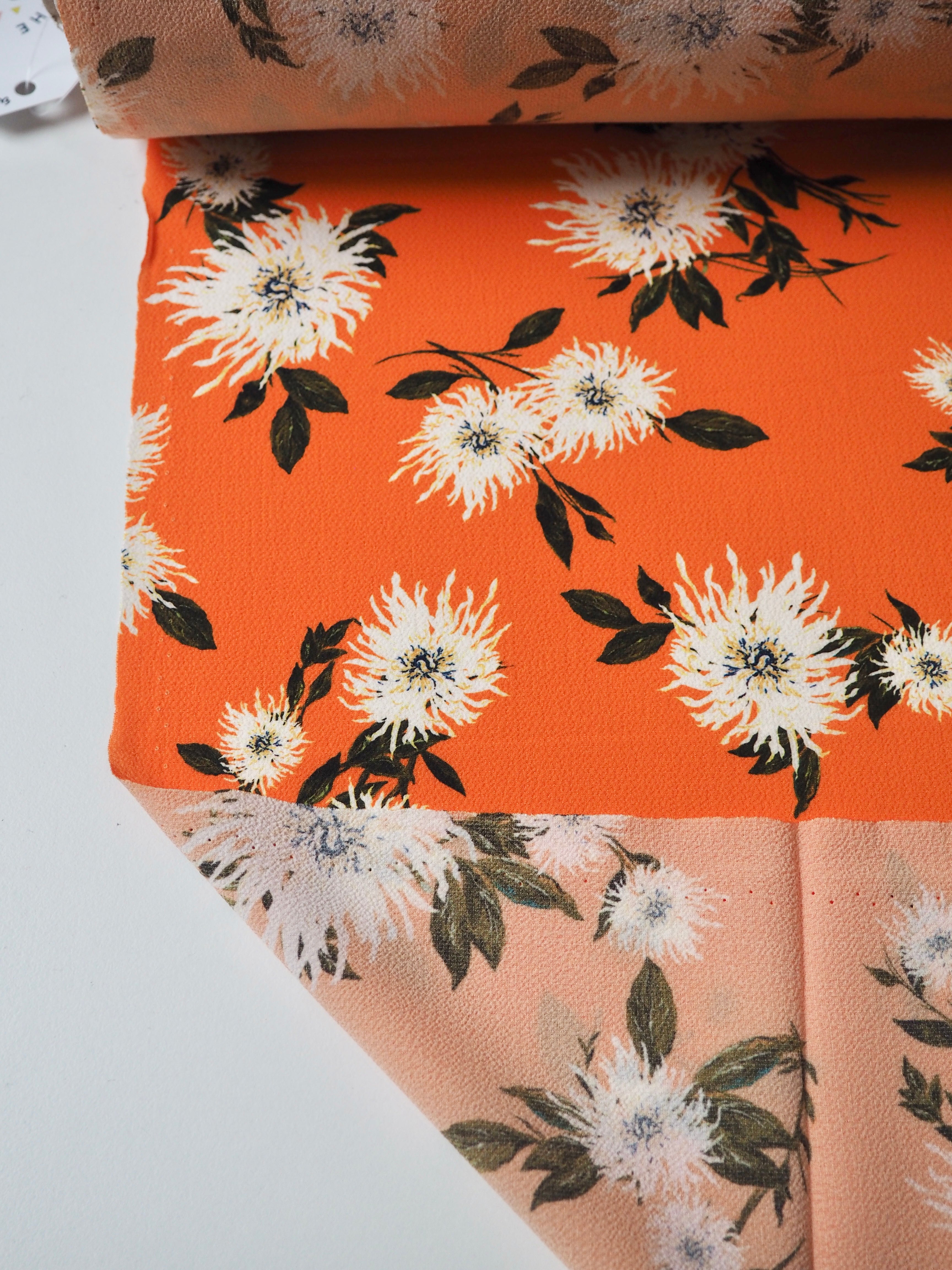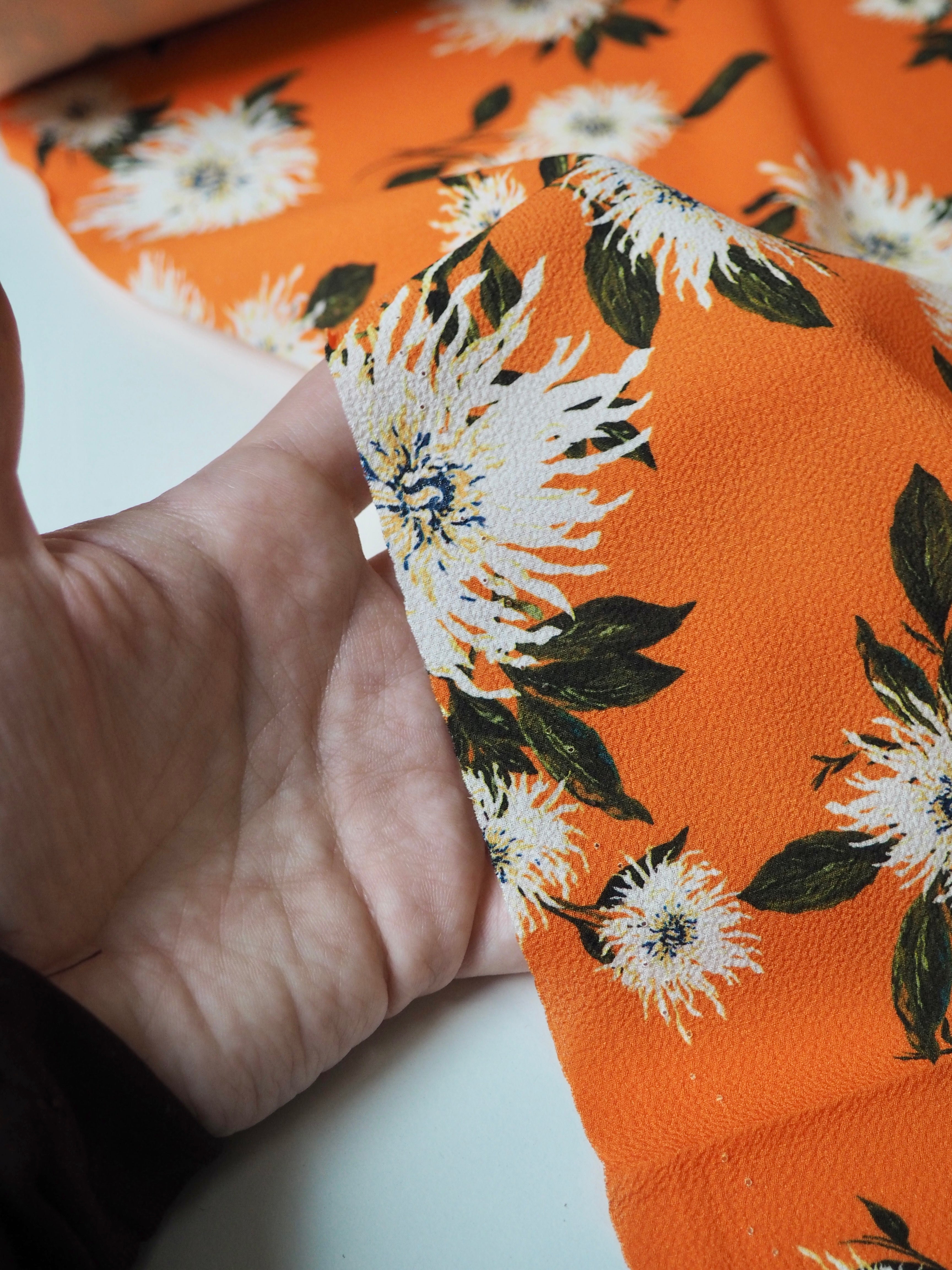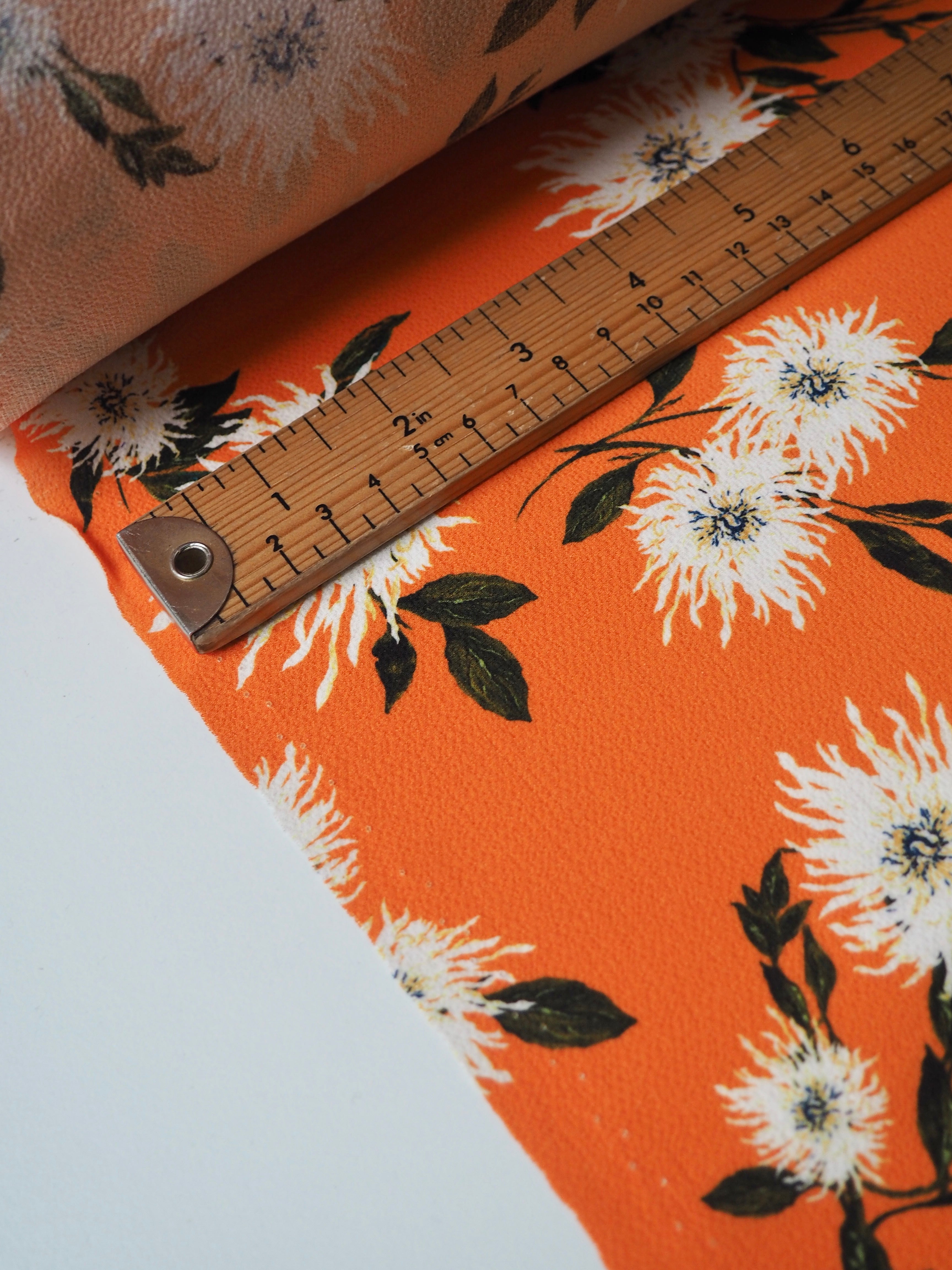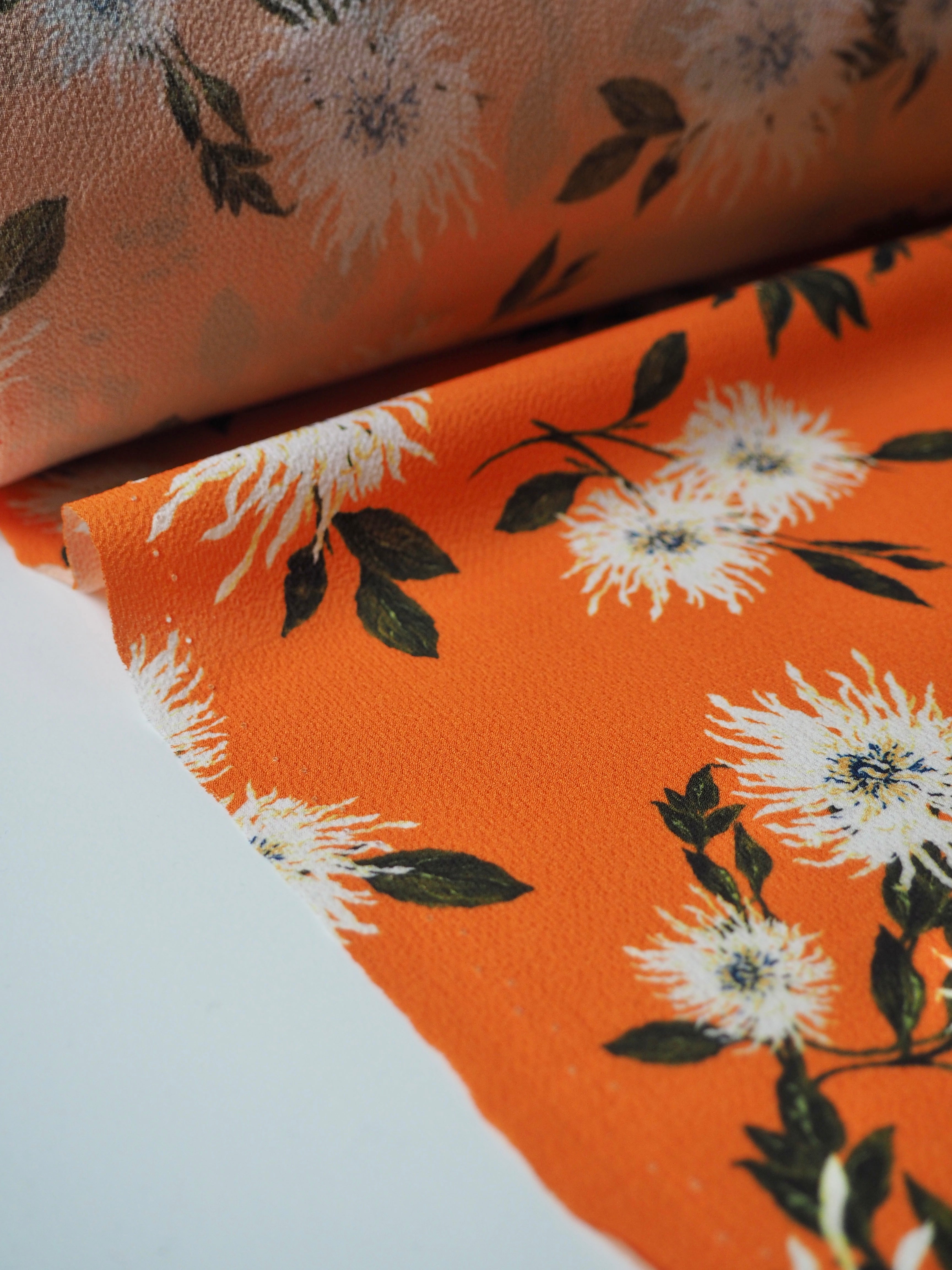 This ex-designer fabric is a crinkle crepe. It has an amazing drape, that is light and airy. It's orange with white and green blooms. It's an exclusive designer print. Opaque with such a lovely textured handle. Would make a lovely dress or top!