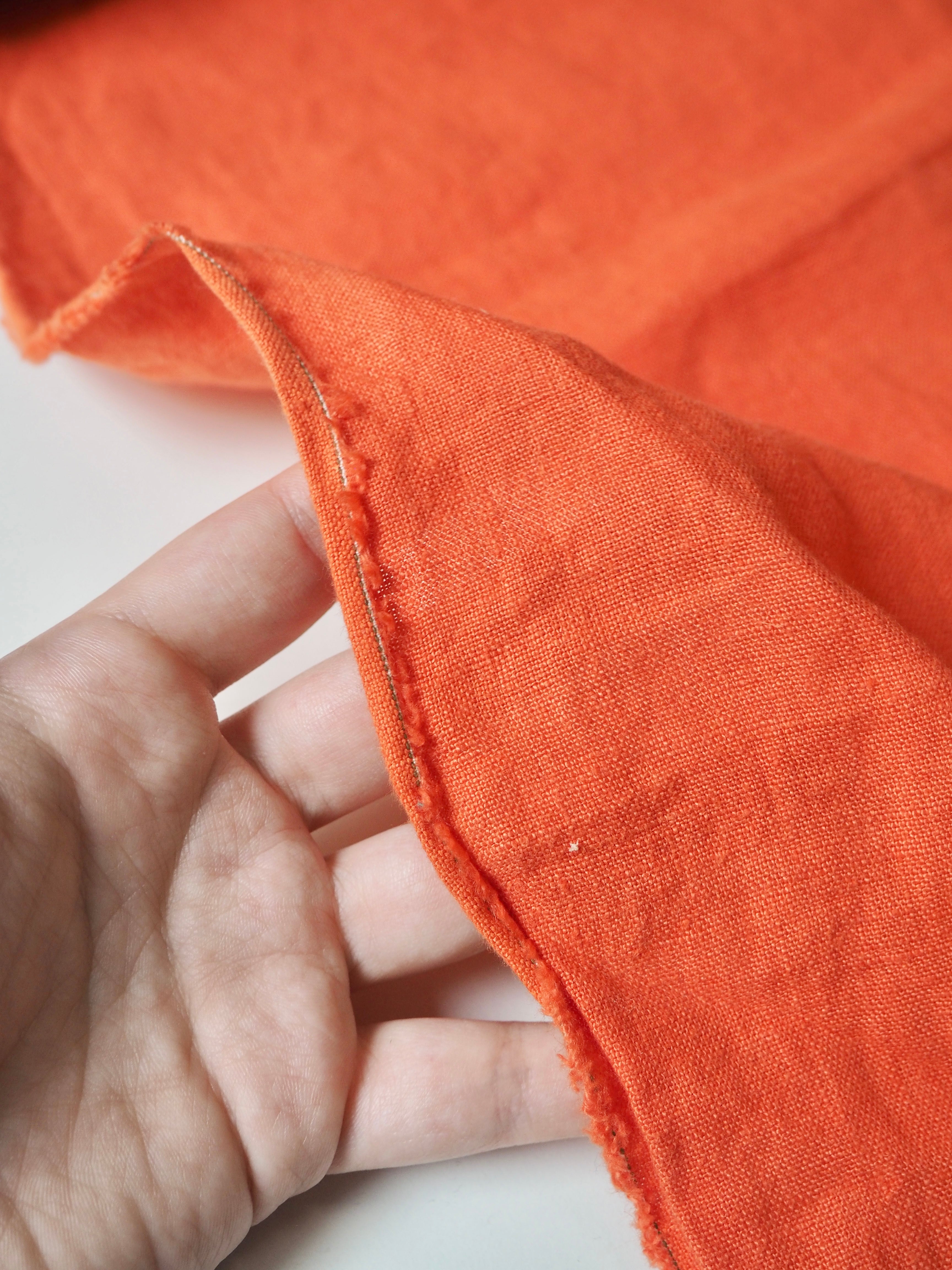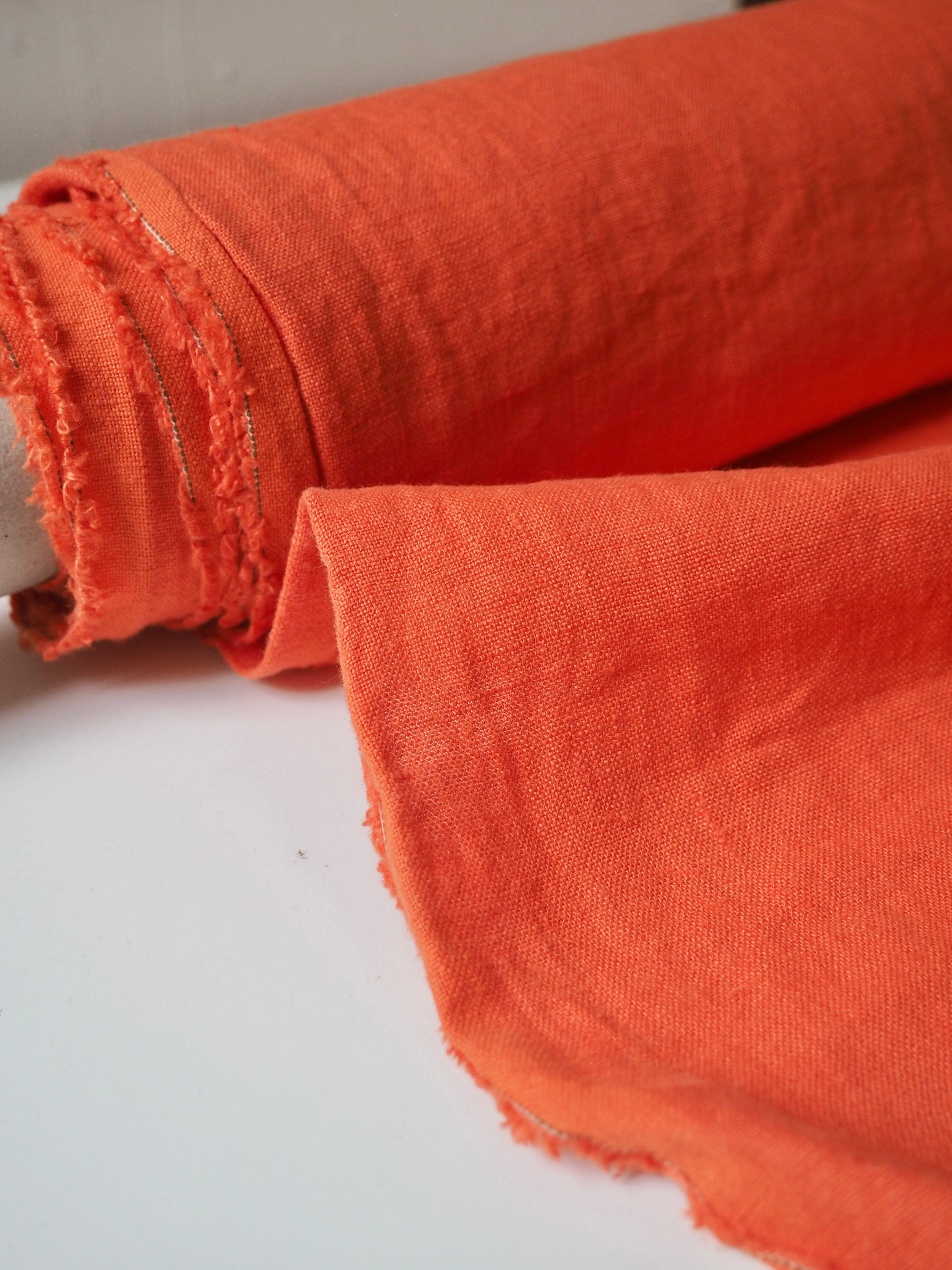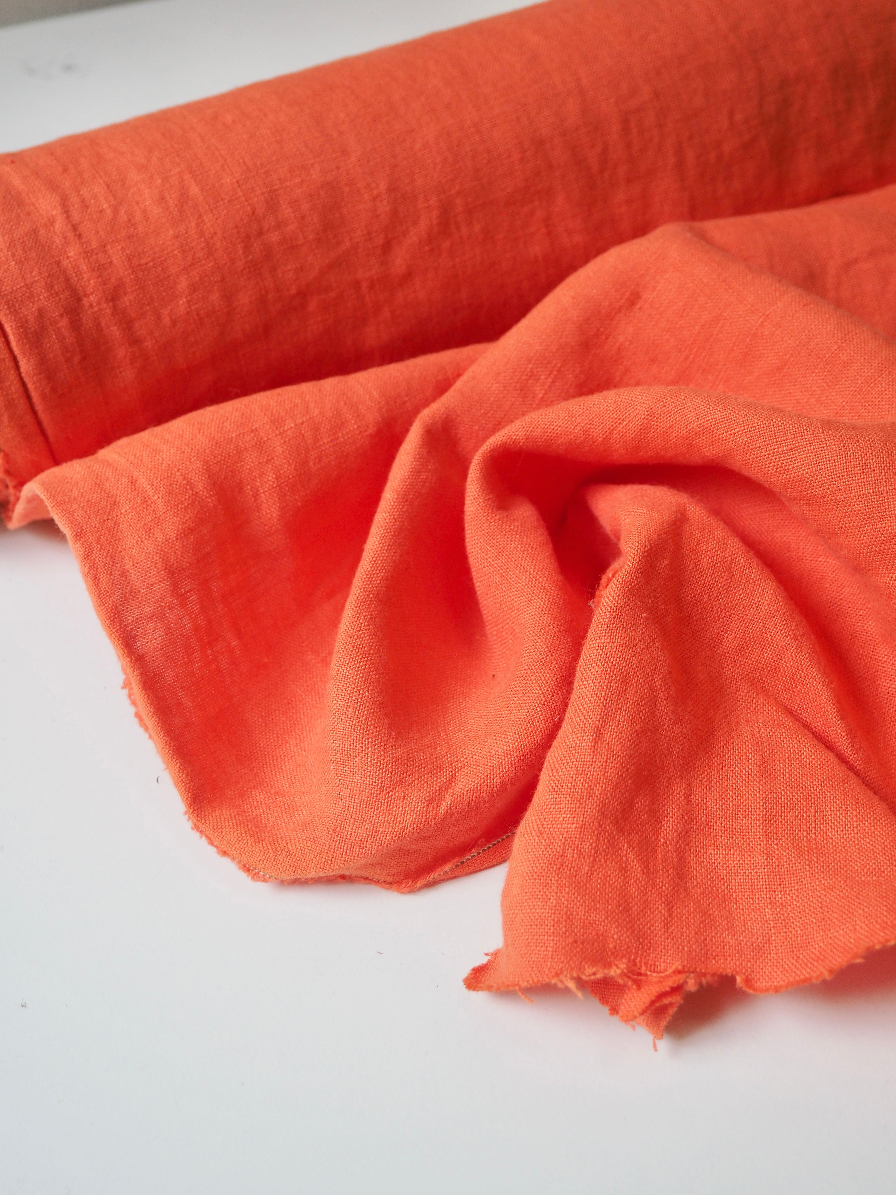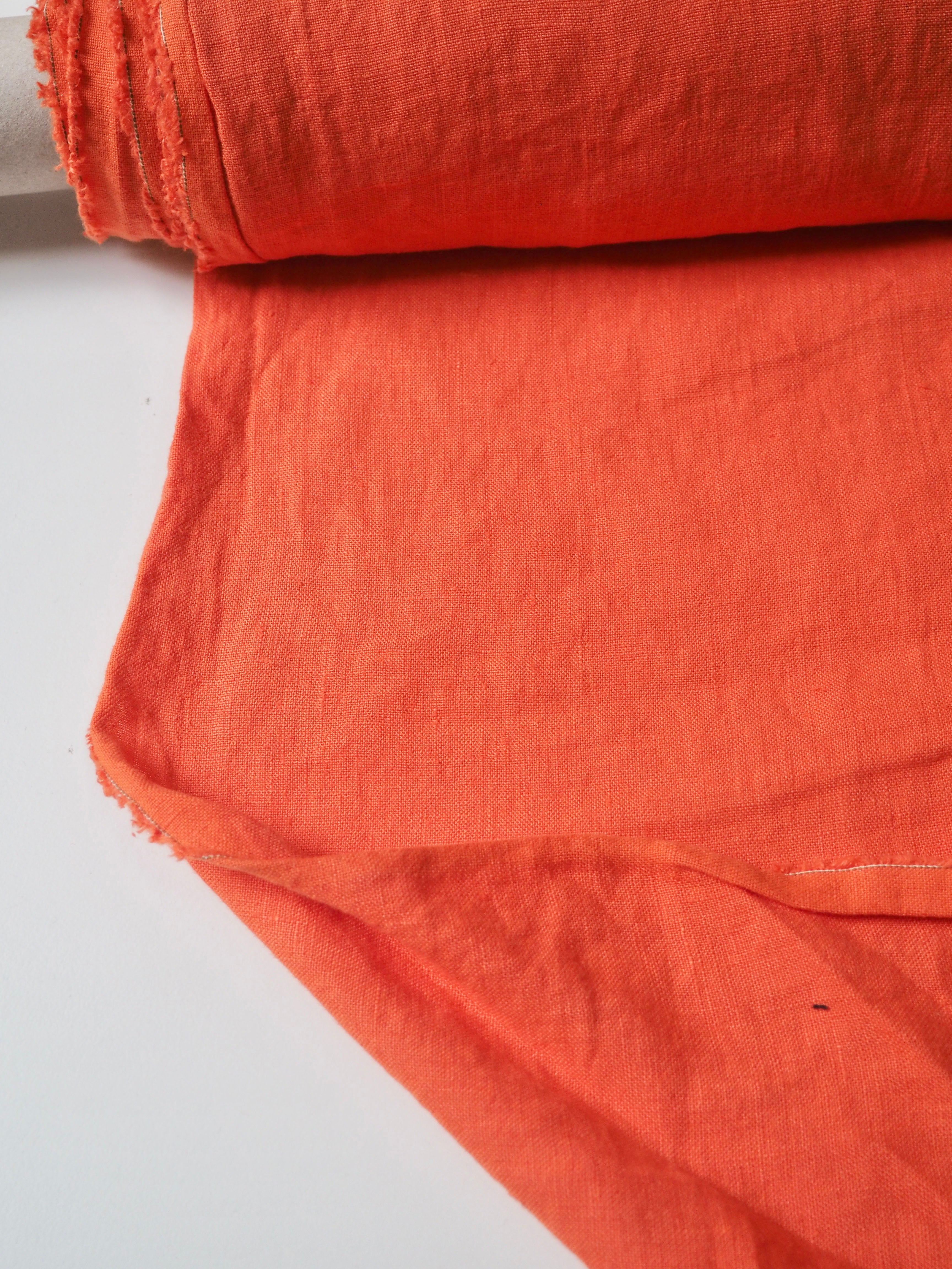 This ex-designer fabric is a lovely linen. It's a rich orange colourway. It has a soft and gentle linen weave with a typical linen texture, and a brilliant handle that's so wearable. Lightweight with a gentle structured drape, and fully opaque. From popular London-based brand Beyond Nine. Lovely for a bias dress of skirt, summer tops or Everyday Trousers!
