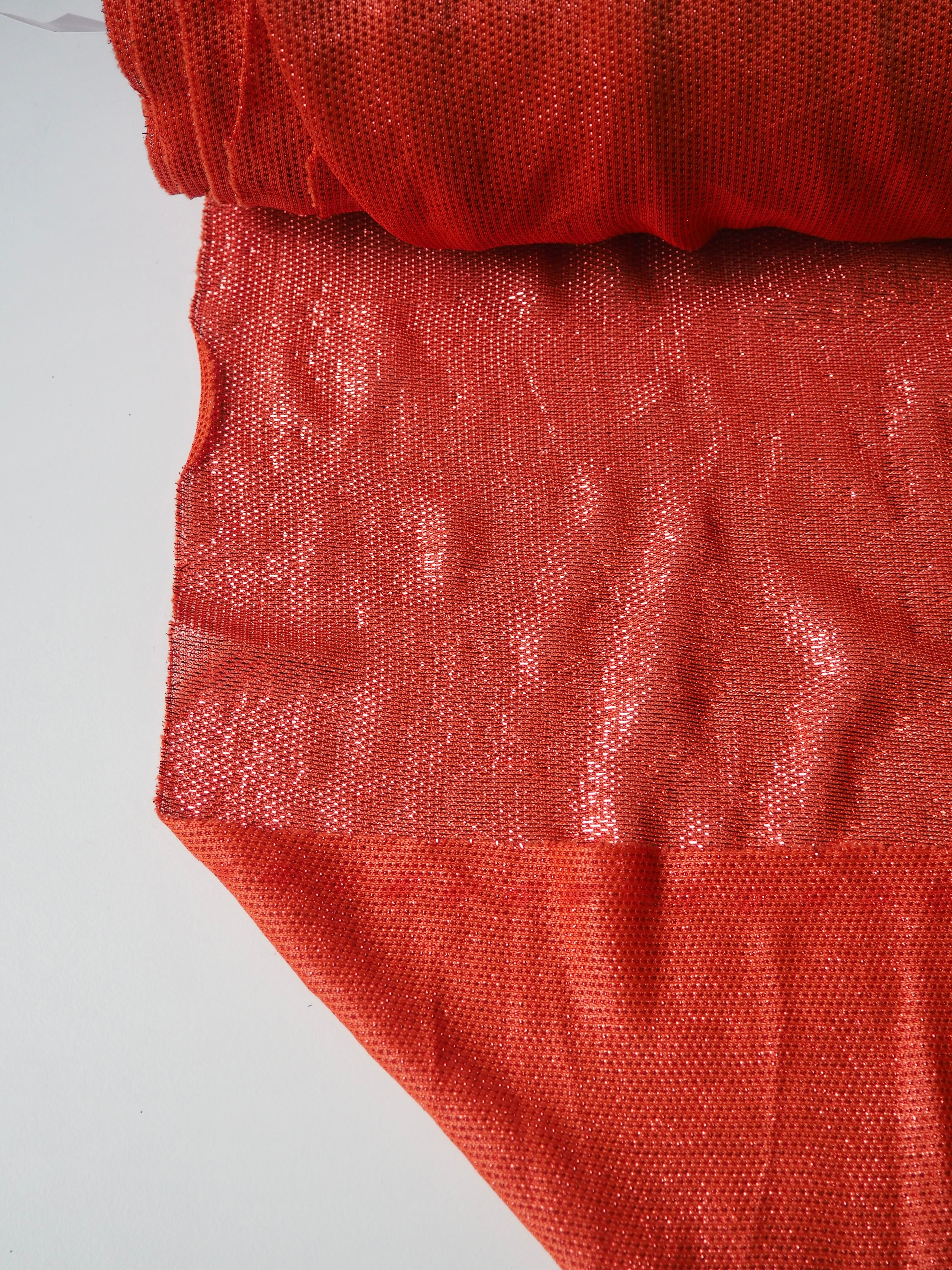 This ex-designer jersey is a fine jersey. Bright orange lurex threads weave onto a orange mesh jersey. It's subtle in sparkle compared to other cloths but shimmers in the light so well! Lightweight with approximately 20% width-ways stretch and a lovely bouncy drape. Slightly sheer due to the mesh weave. Would make the perfect party wrap top or drapey dress!