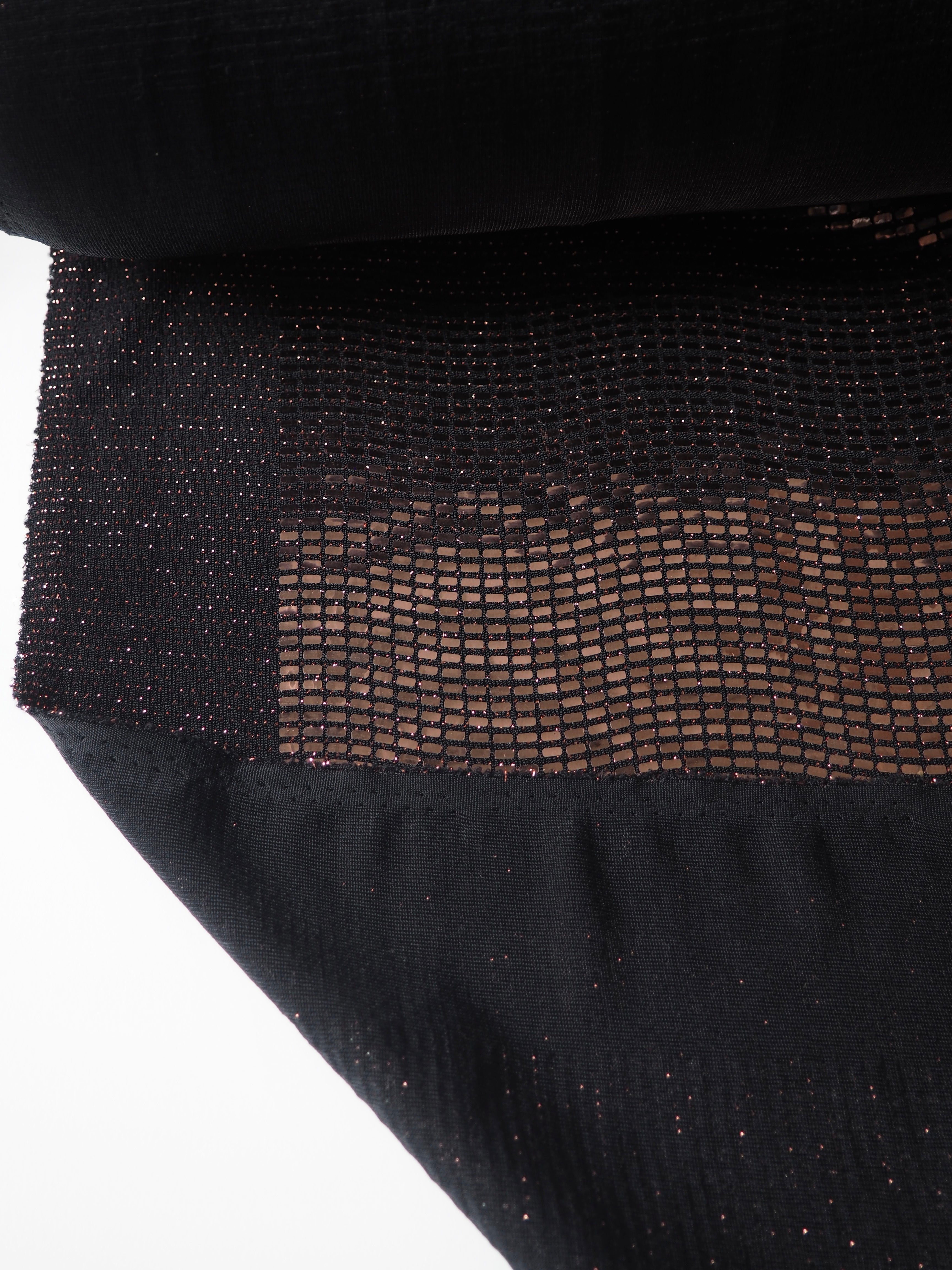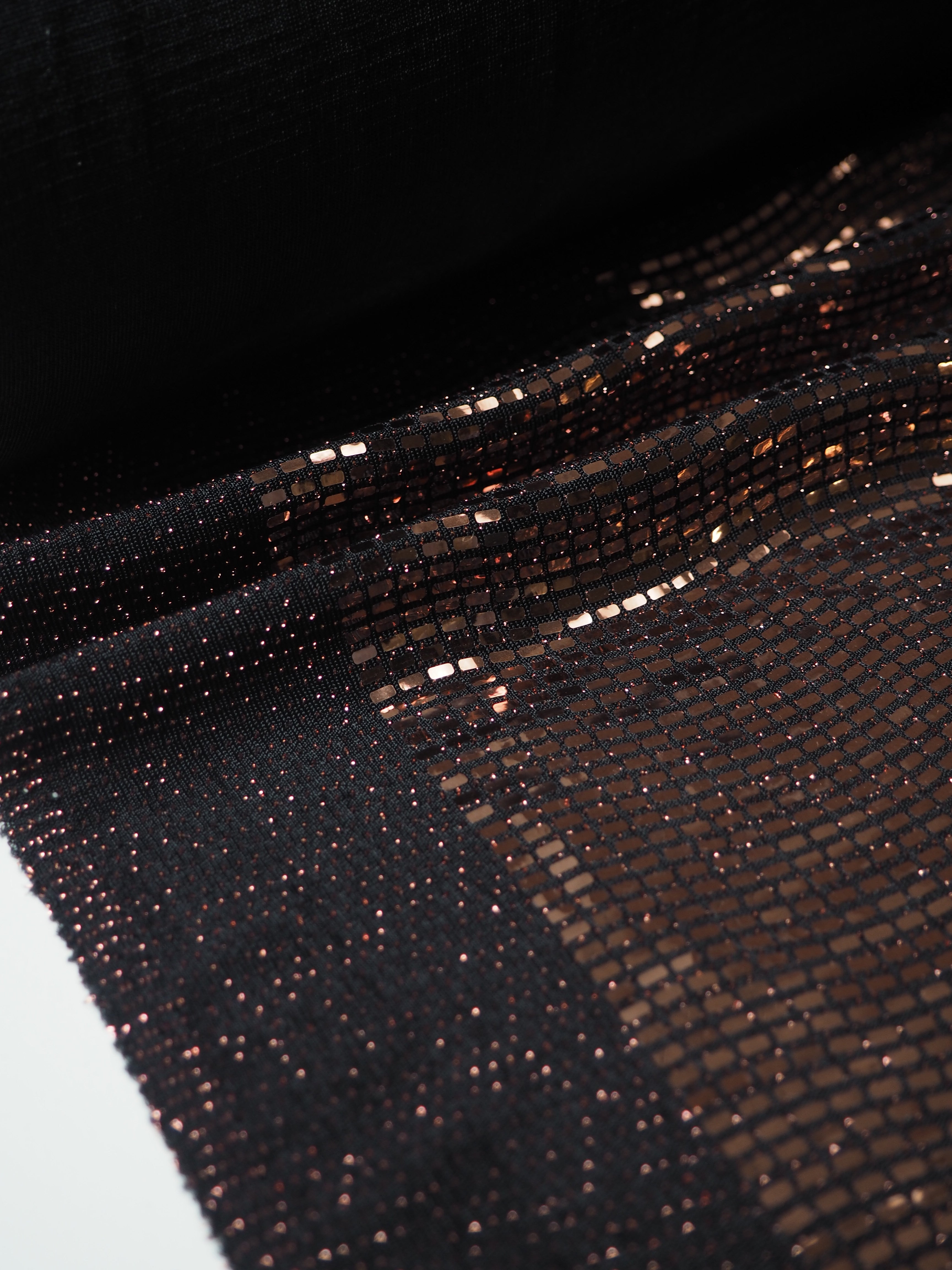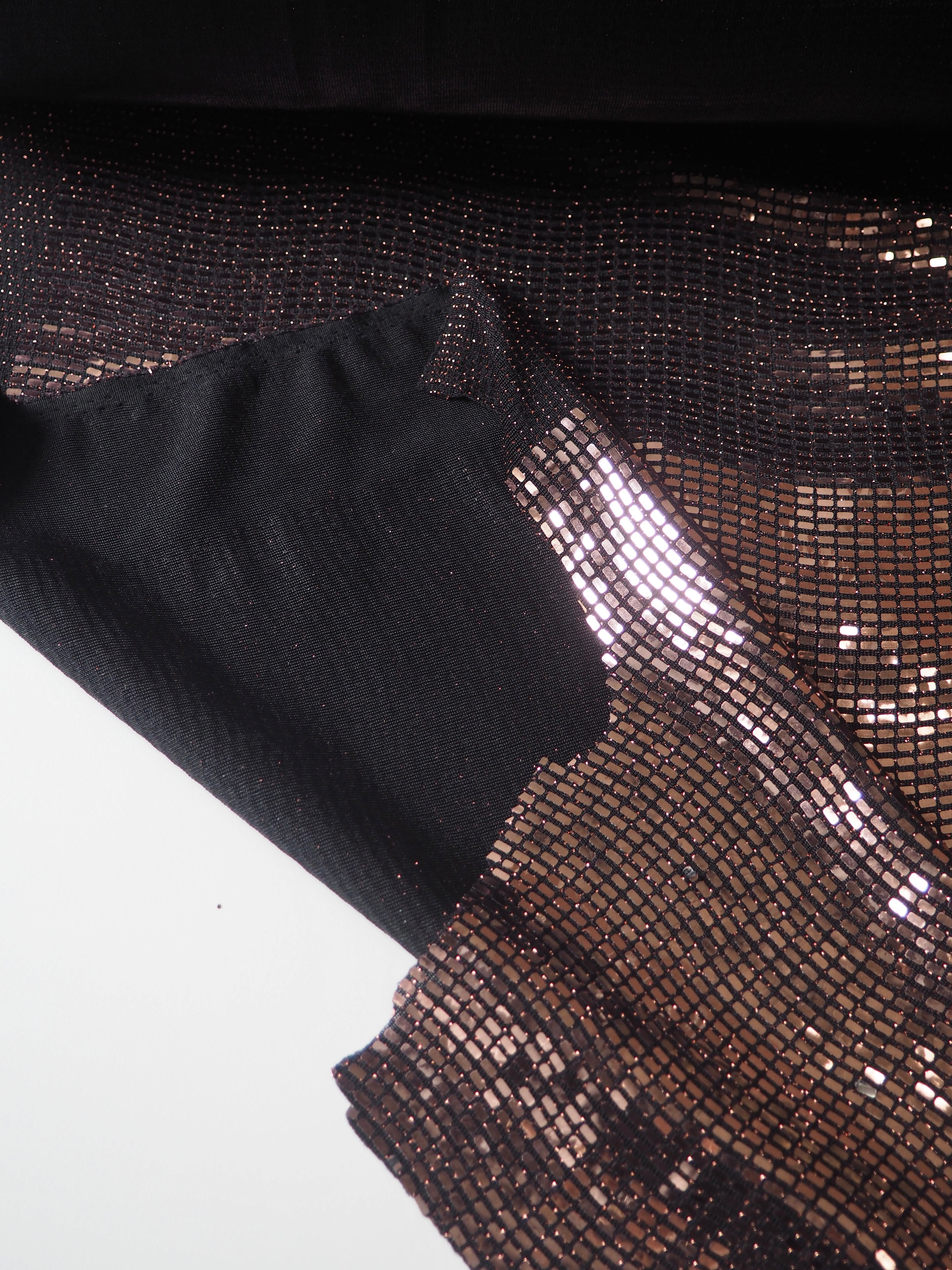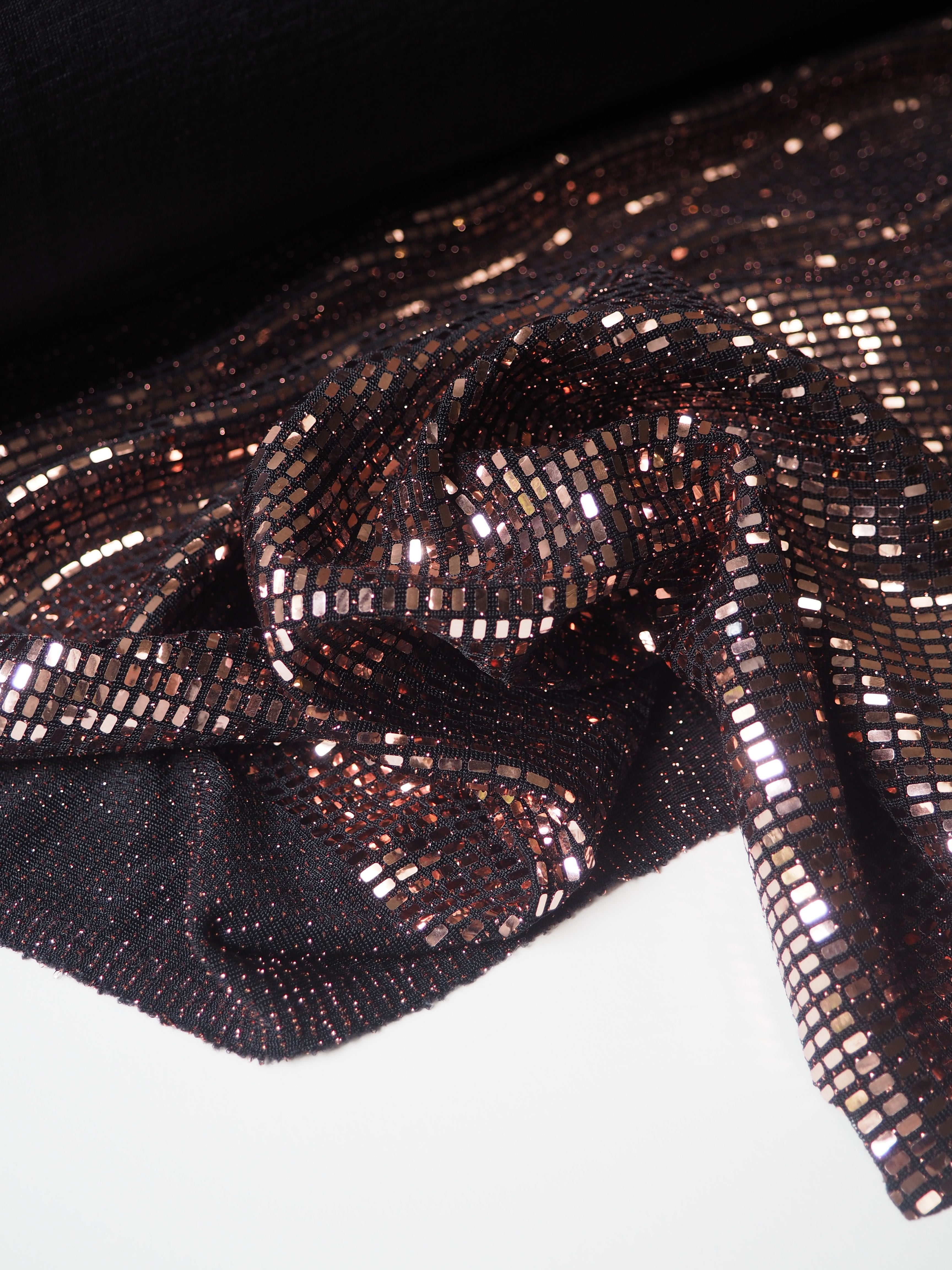 This ex-designer fabric is a metallic jersey. This eye-popping jersey has a black base, with foiled pink metallic dots. It has a great 20% 2-way stretch. Lightweight, with a great drape, and a comfortable but textured handle. Is quite bouncy and fun! Would make the perfect party dress!