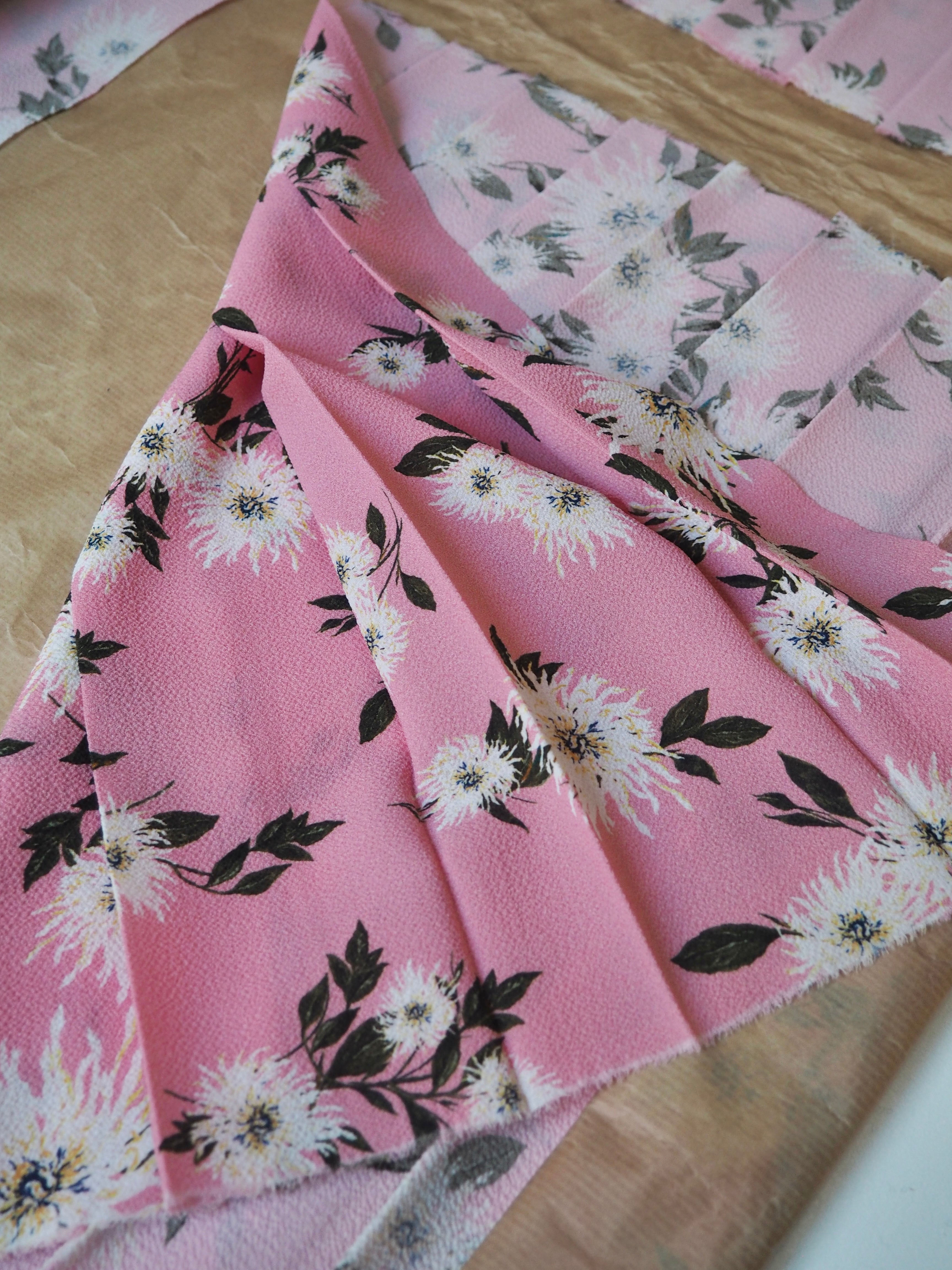 This ex-designer fabric is a pre-pleated crepe. It's a pink floral crinkle crepe, that has been knife-pleated and cut into uniform pieces. The pleats are about 4cm deep. The pleating transforms this cloth to give it a soft drape with wonderful movement. Opaque with a soft and pliant handle. Has the perfect bounce for tops or piecing together for a skirt!