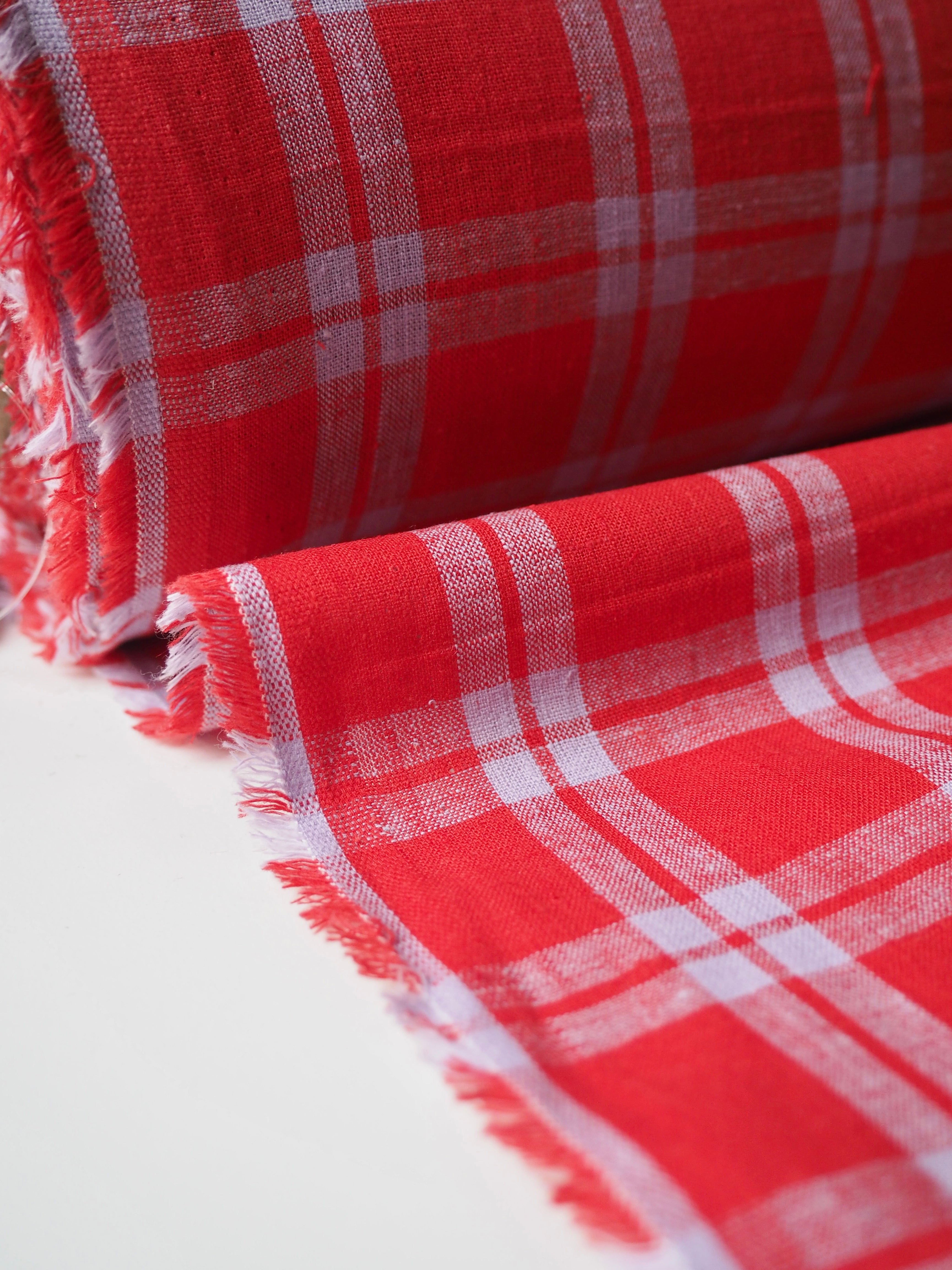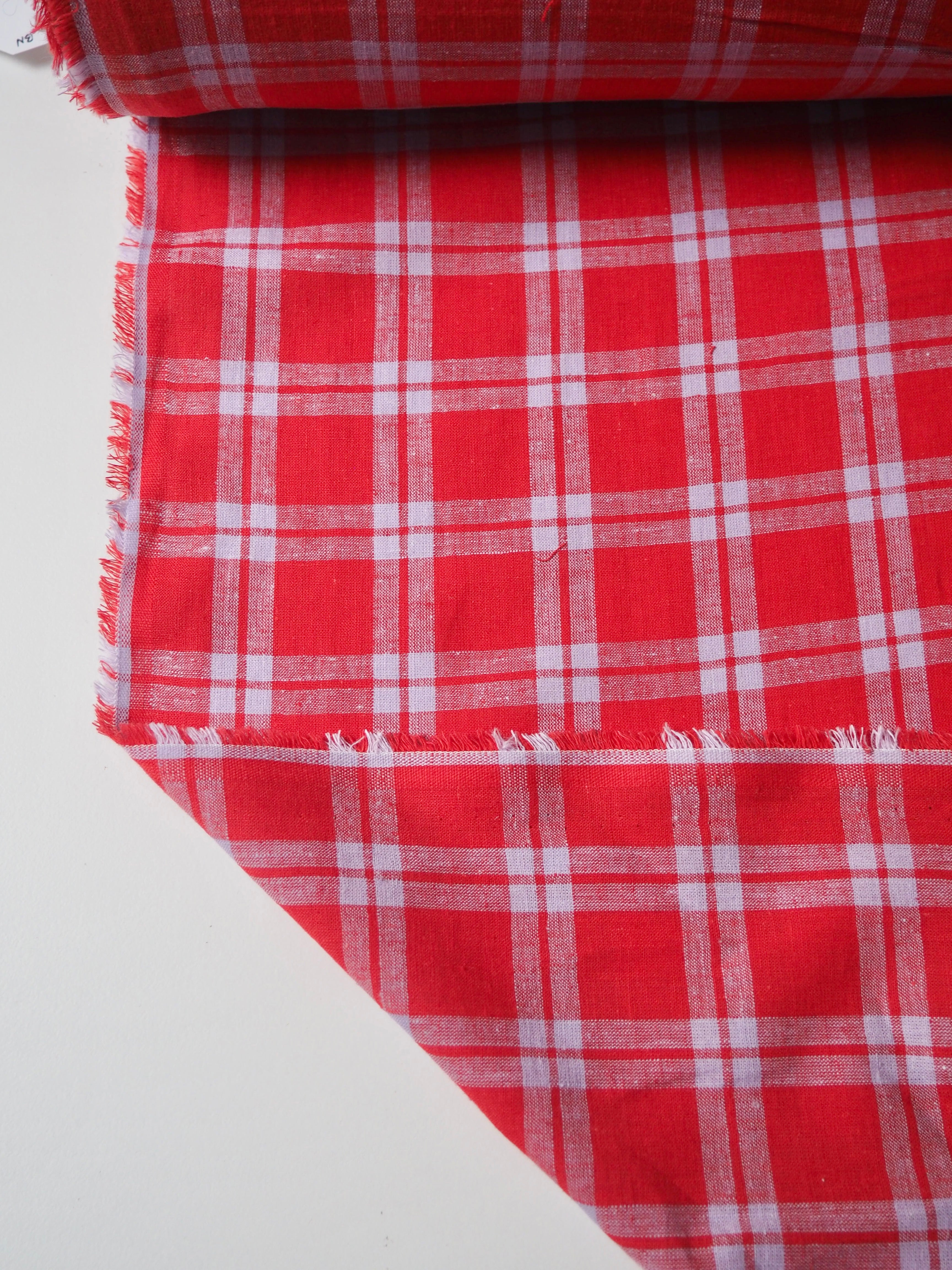 This ex-designer fabric is a cotton/linen. It's a red and pale lilac check. It's from a London-based brand called Beyond Nine. It has a super soft and gentle blended weave, with an ideal cotton-y handle that's so wearable. That little bit of linen really elevates the cloth! Very lightweight with a gentle structured drape, breathable, and fully opaque. Lovely for our Everyday Dress/Top, summer tops or Everyday Trousers, (or even a co-ord!), or a tablecloth and napkin set! We can't wait to see what you make!