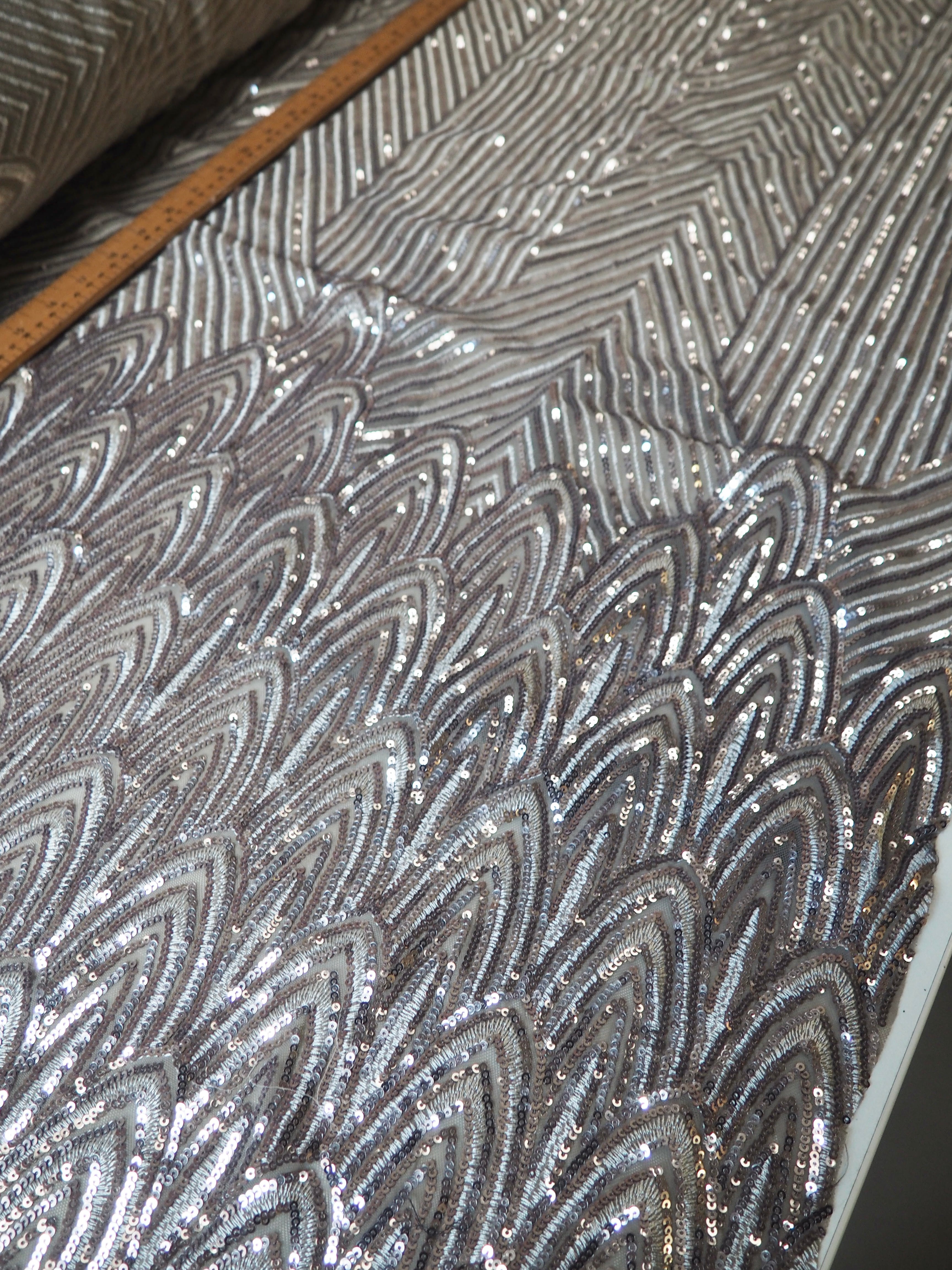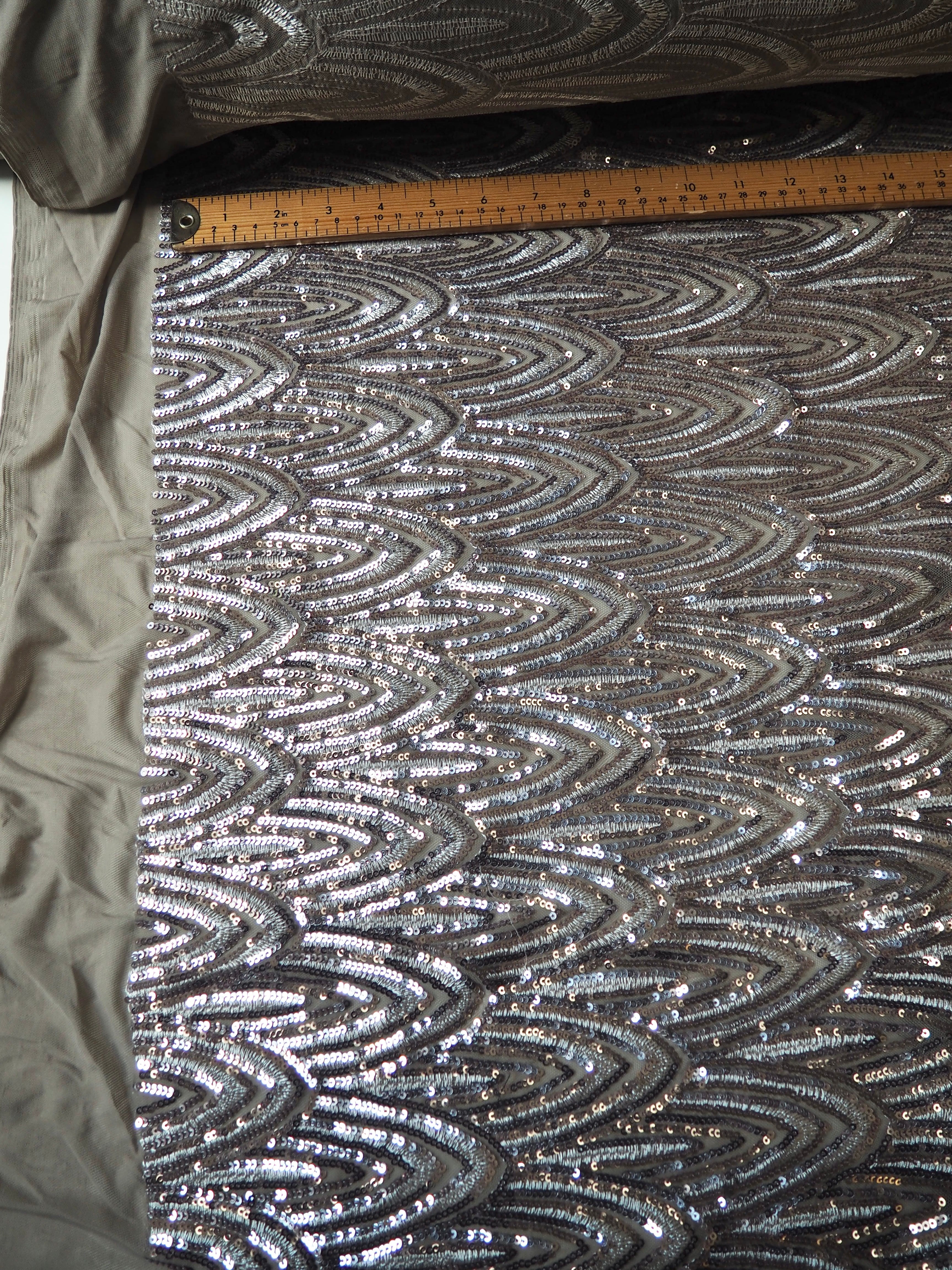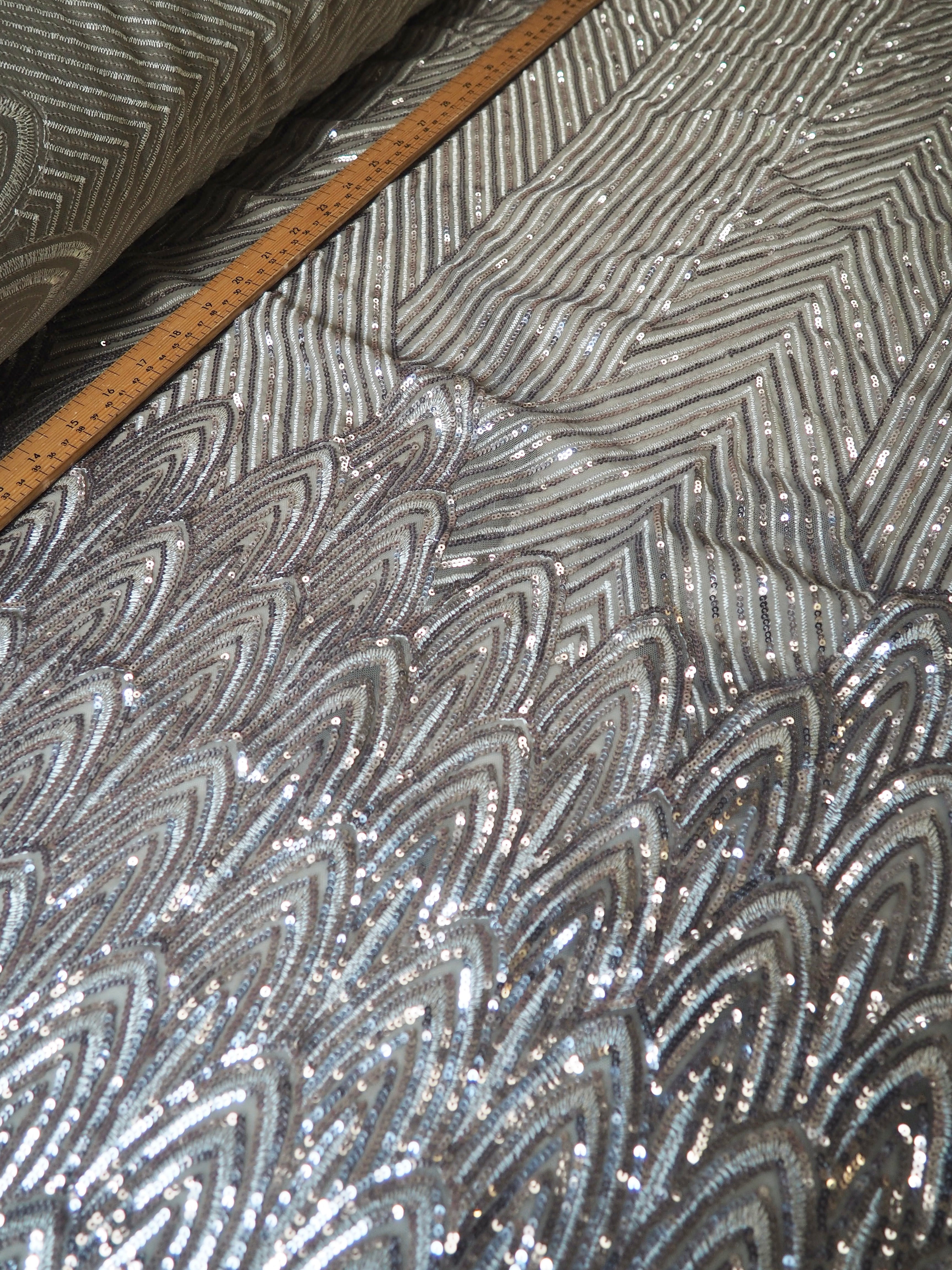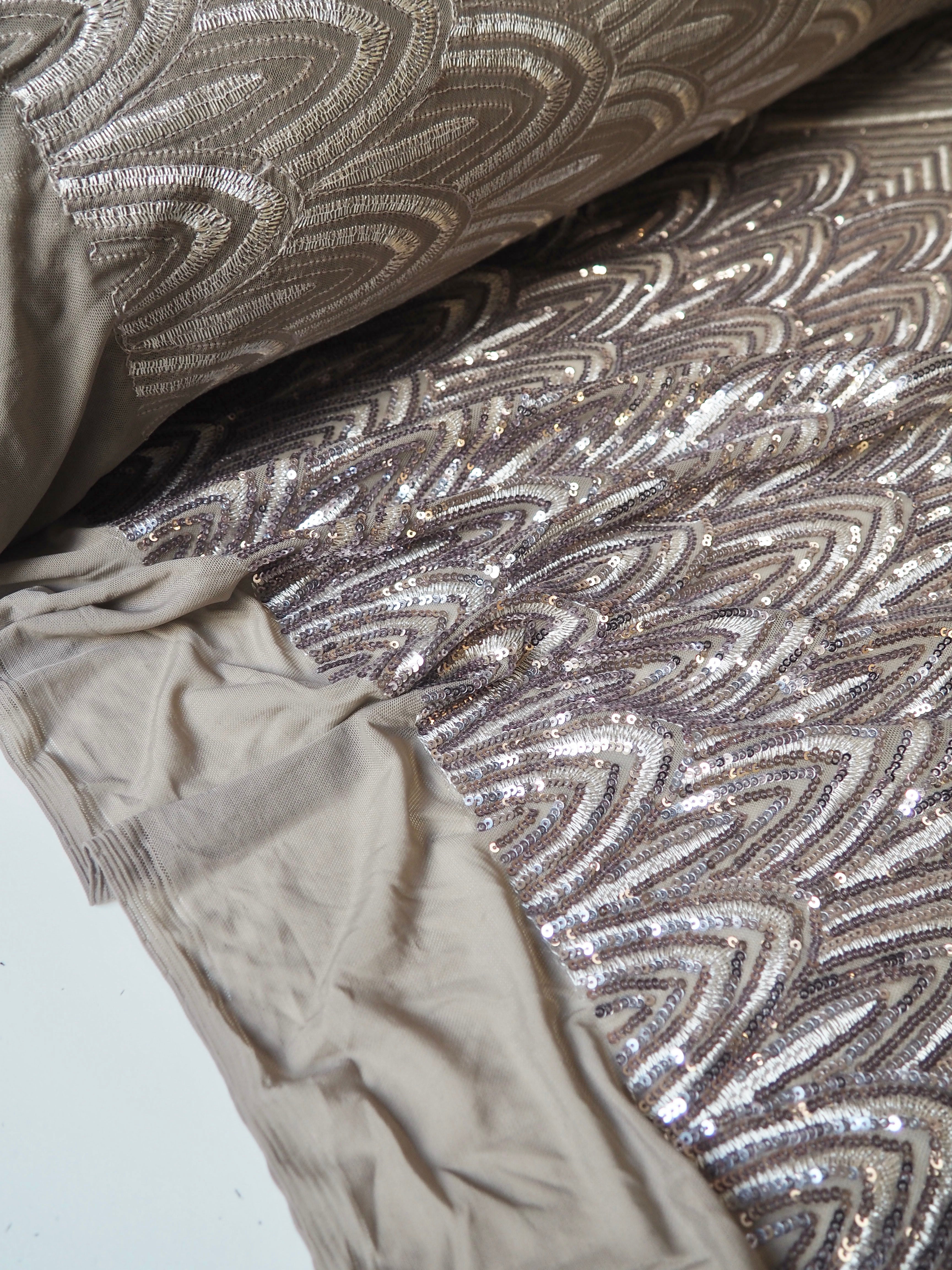 This ex-designer fabric is a unique sequin mesh. It's a taupe stretch mesh, with a striped to  chevron-like pattern in silver and taupe sequins. It's fuller coverage, and medium to heavy weight. Has a high-quality handle, and beautiful drape. The mesh is quite soft and comfortable to move in. Has about 20-30% stretch length ways. Catches the light well, and would make an incredible dress for a special occasion!