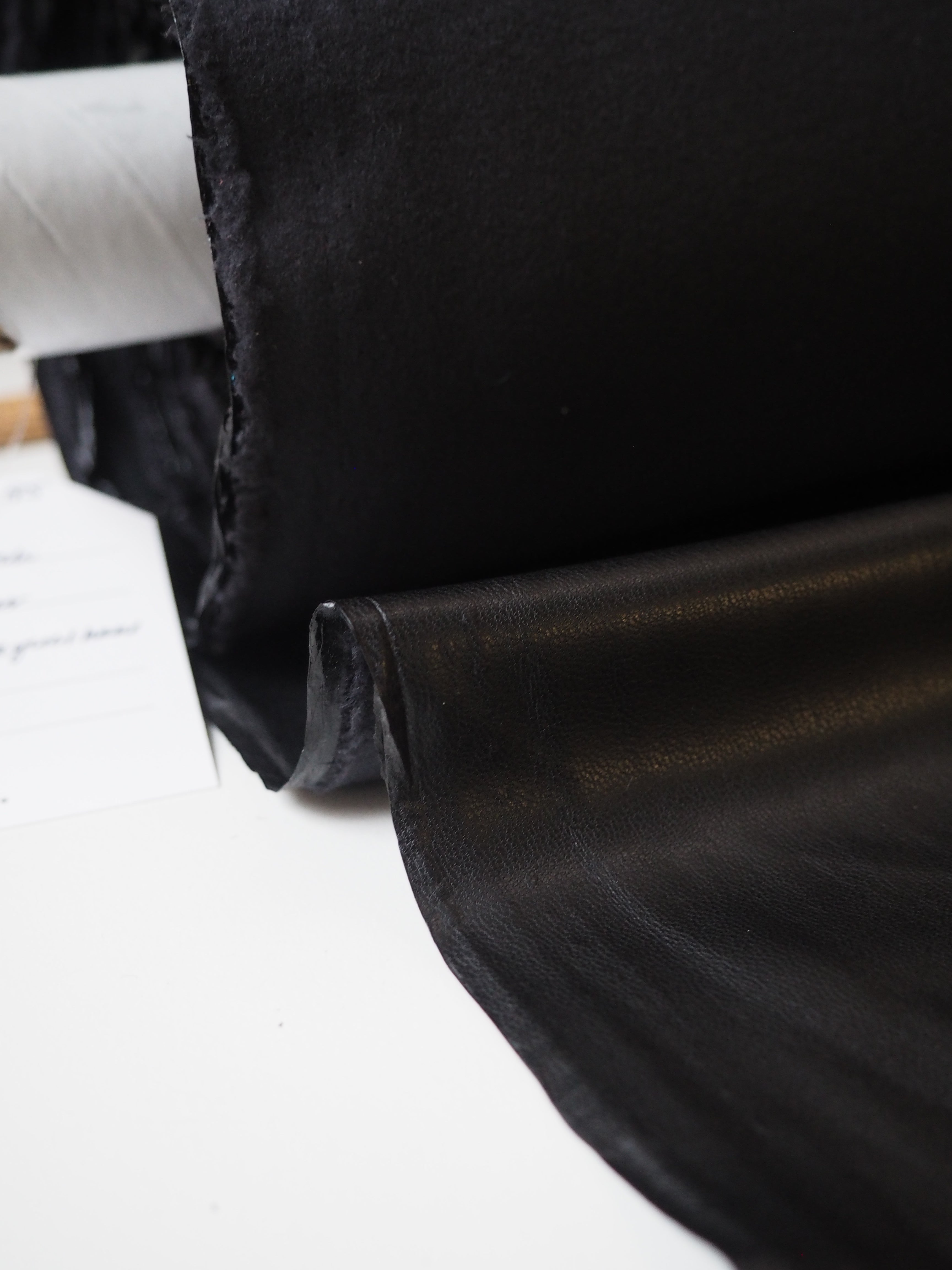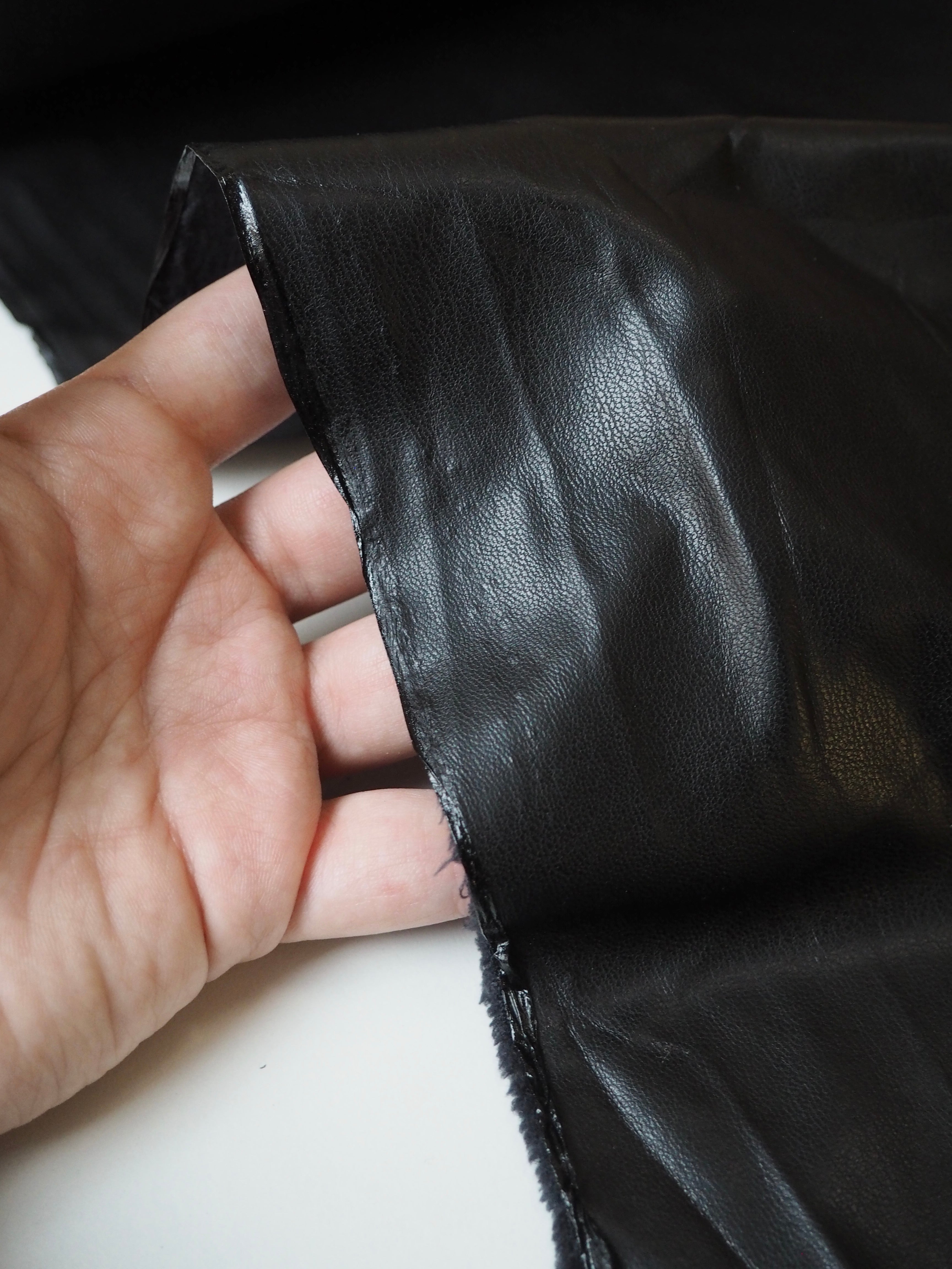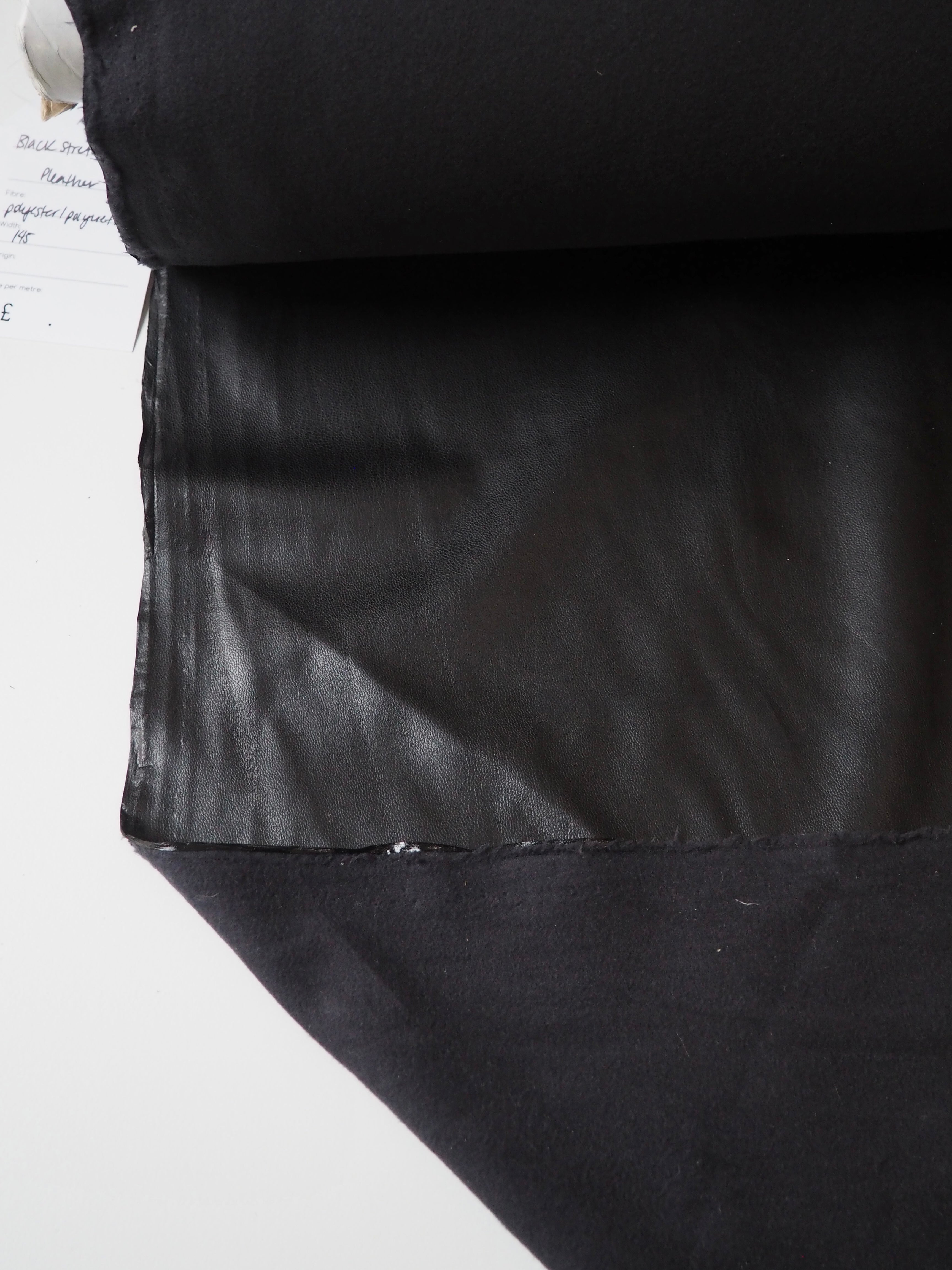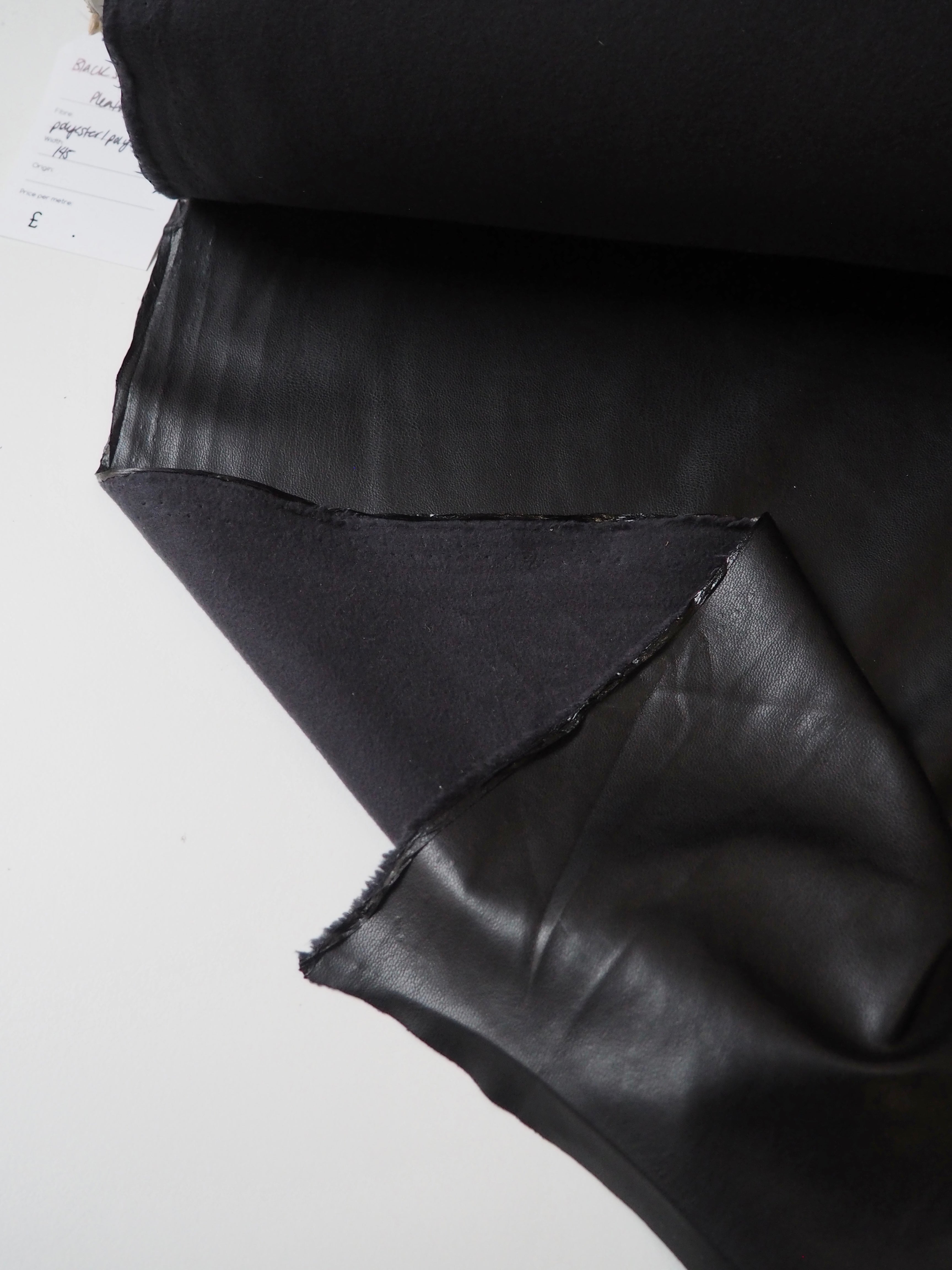 This ex-designer fabric is a stretch pleather. It's quite lightweight with a smooth finish. It has a polyurethane coating on a super soft semi-sueded black jersey backing. Has about 30% stretch width-ways. Has a good drape and moves nicely. We would love this in a fitted dress or circle skirt!