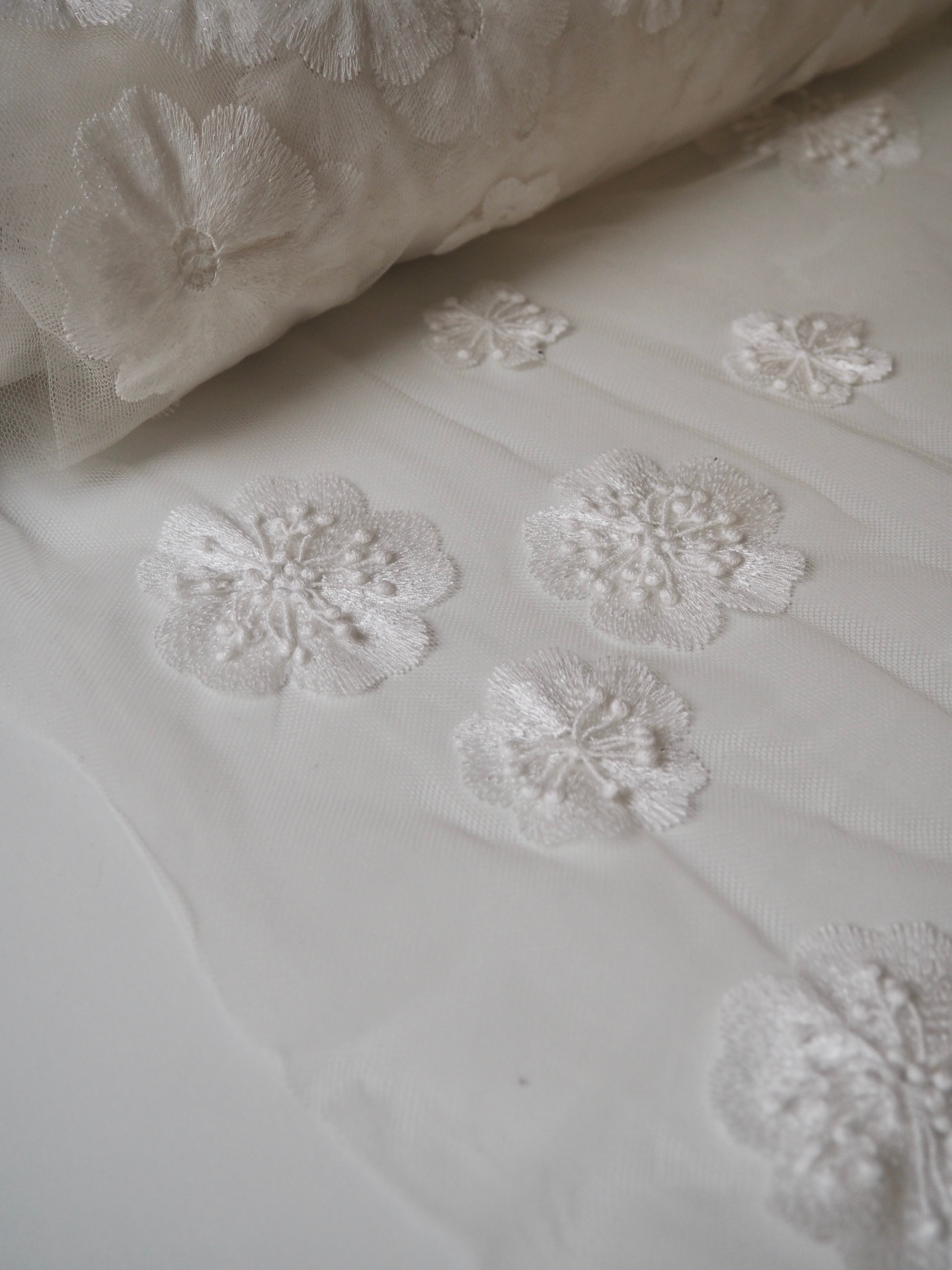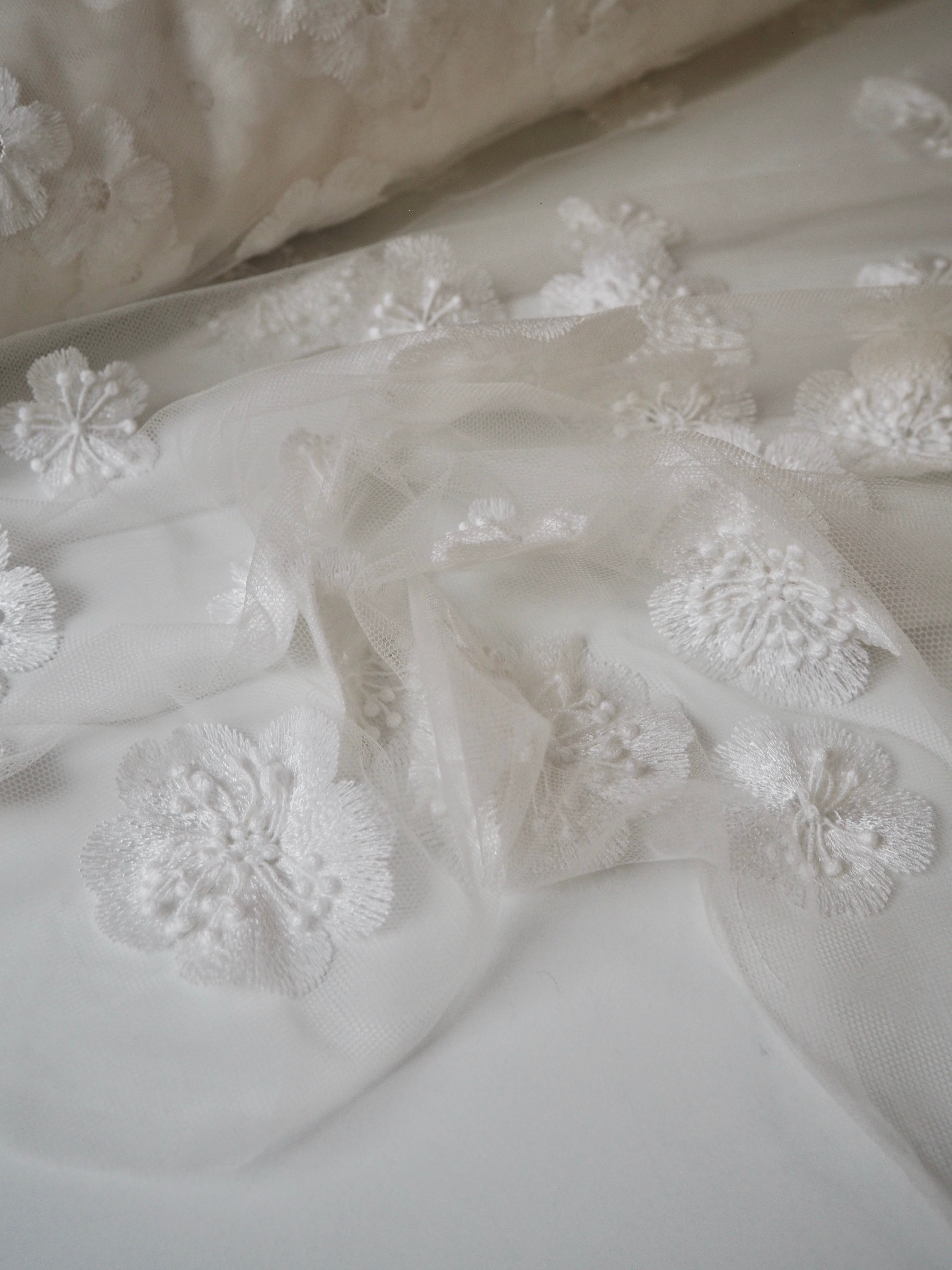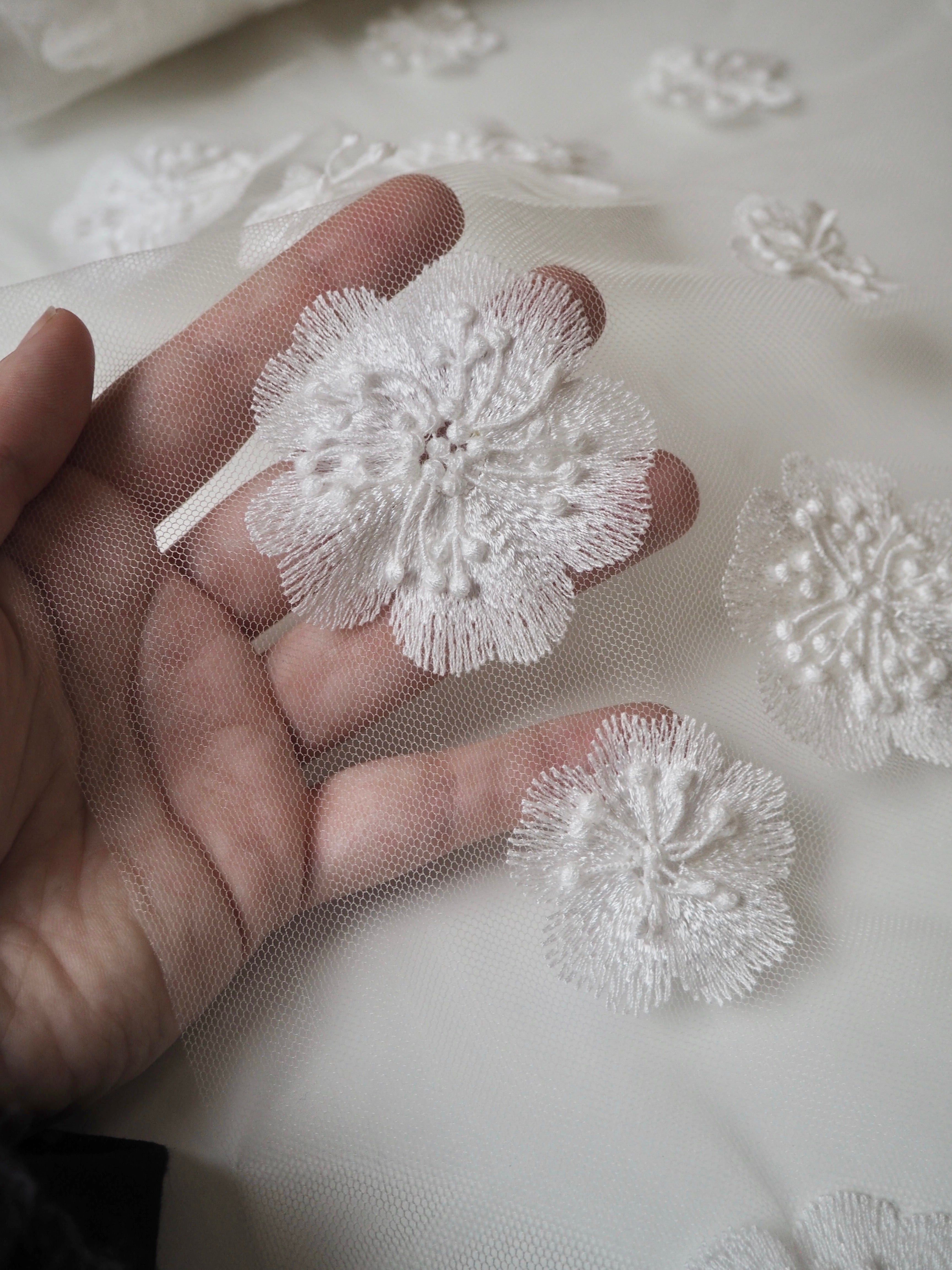 This ex-designer fabric is an embroidered tulle. White flowers with 3D blooming tassels are embroidered onto this ivory tulle. It's sheer, with a more open design as the flowers aren't dense, but they do vary in scale. It's quite soft and has such a lovely drape, and falls beautifully. Lightweight and so graceful! Perfect for bridal looks or special occasions!