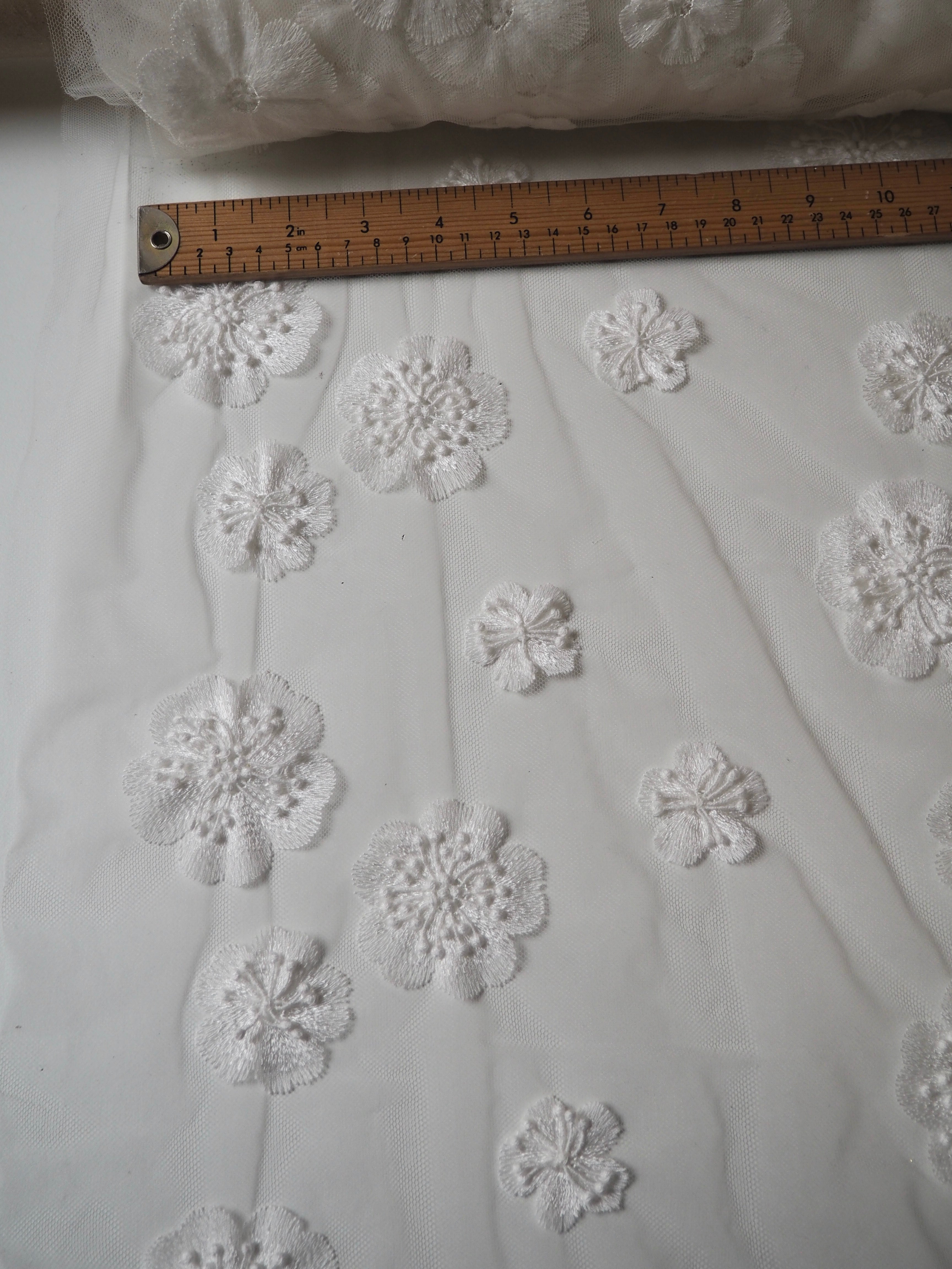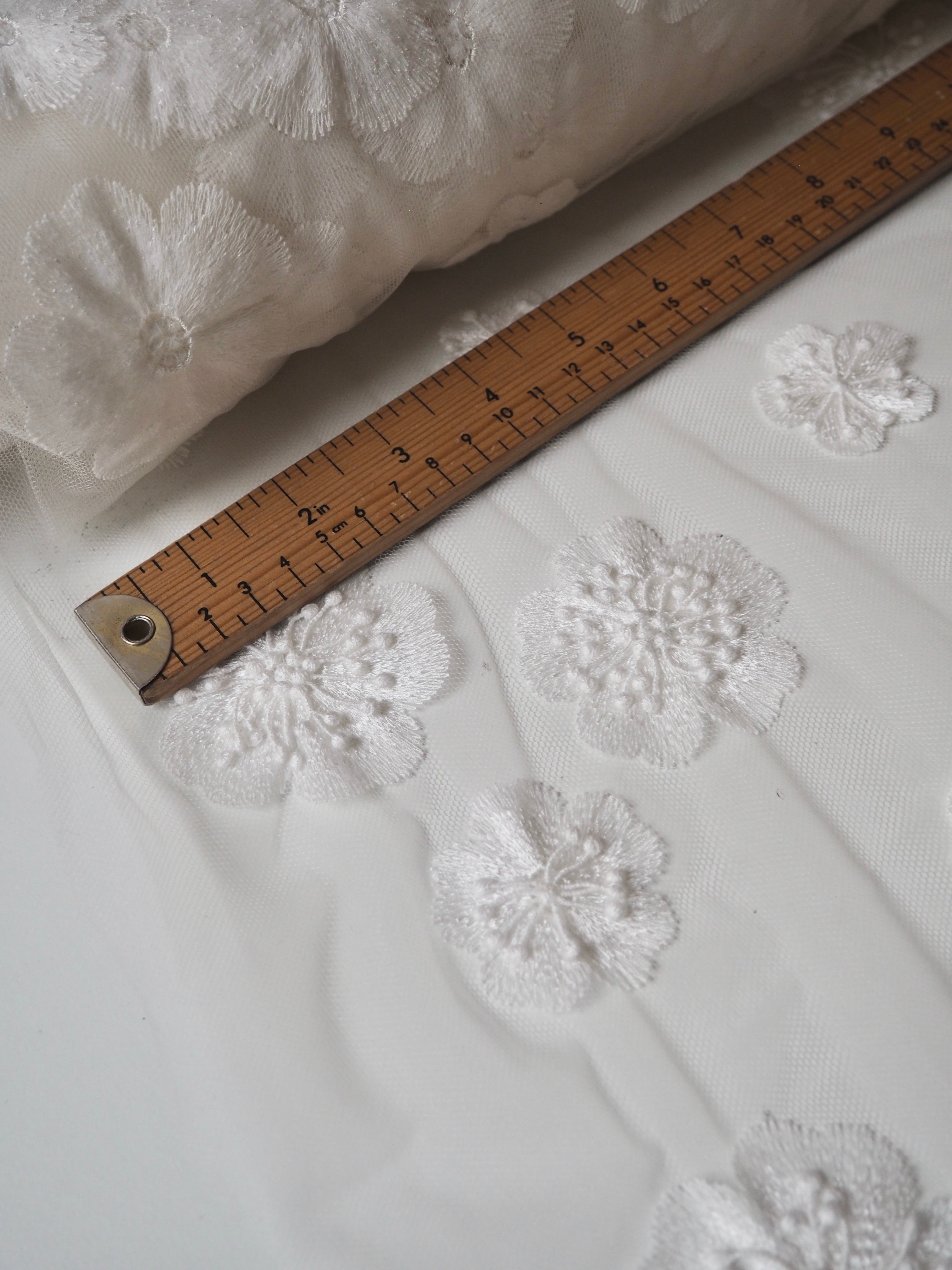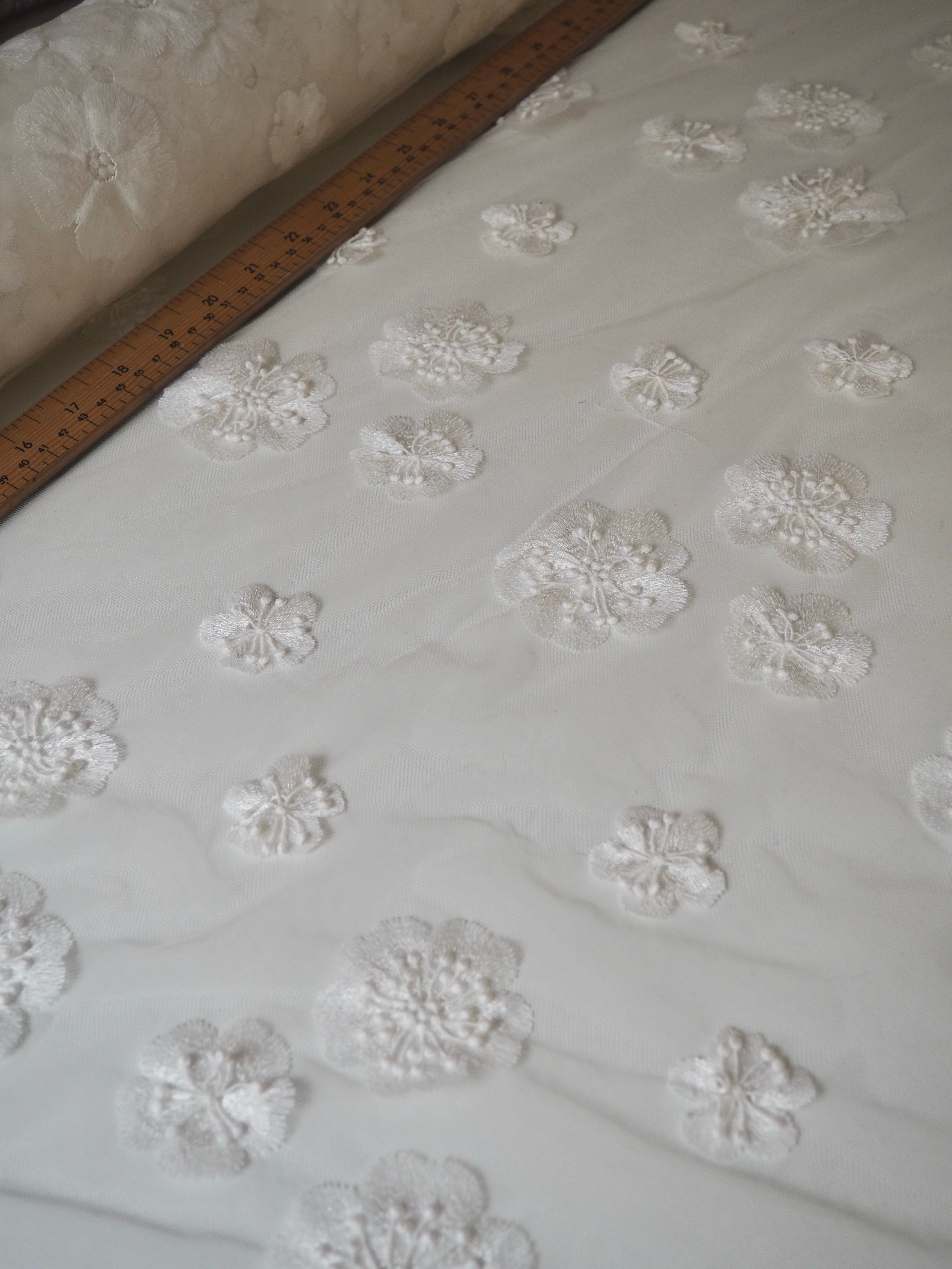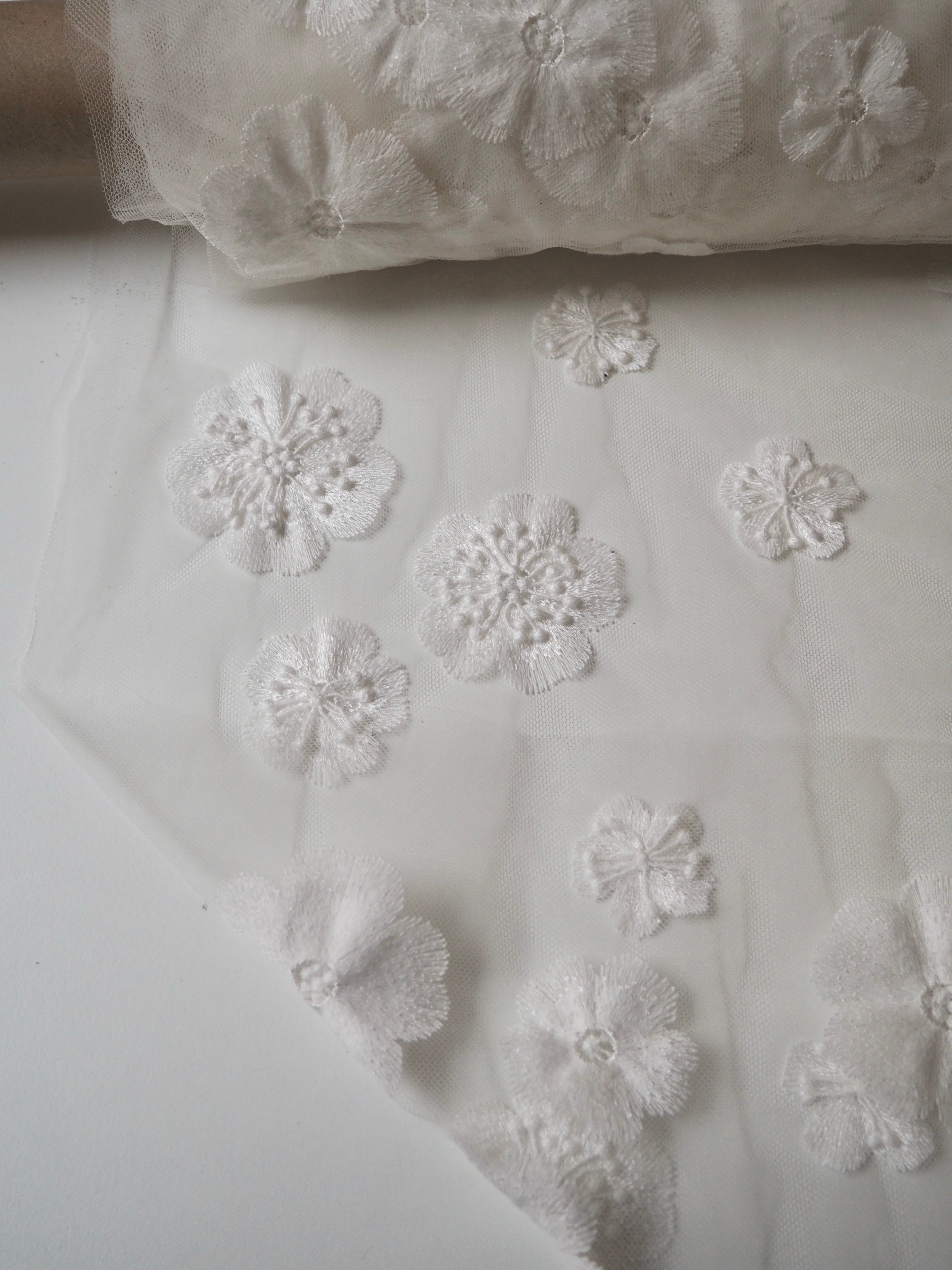 This ex-designer fabric is an embroidered tulle. White flowers with 3D blooming tassels are embroidered onto this ivory tulle. It's sheer, with a more open design as the flowers aren't dense, but they do vary in scale. It's quite soft and has such a lovely drape, and falls beautifully. Lightweight and so graceful! Perfect for bridal looks or special occasions!