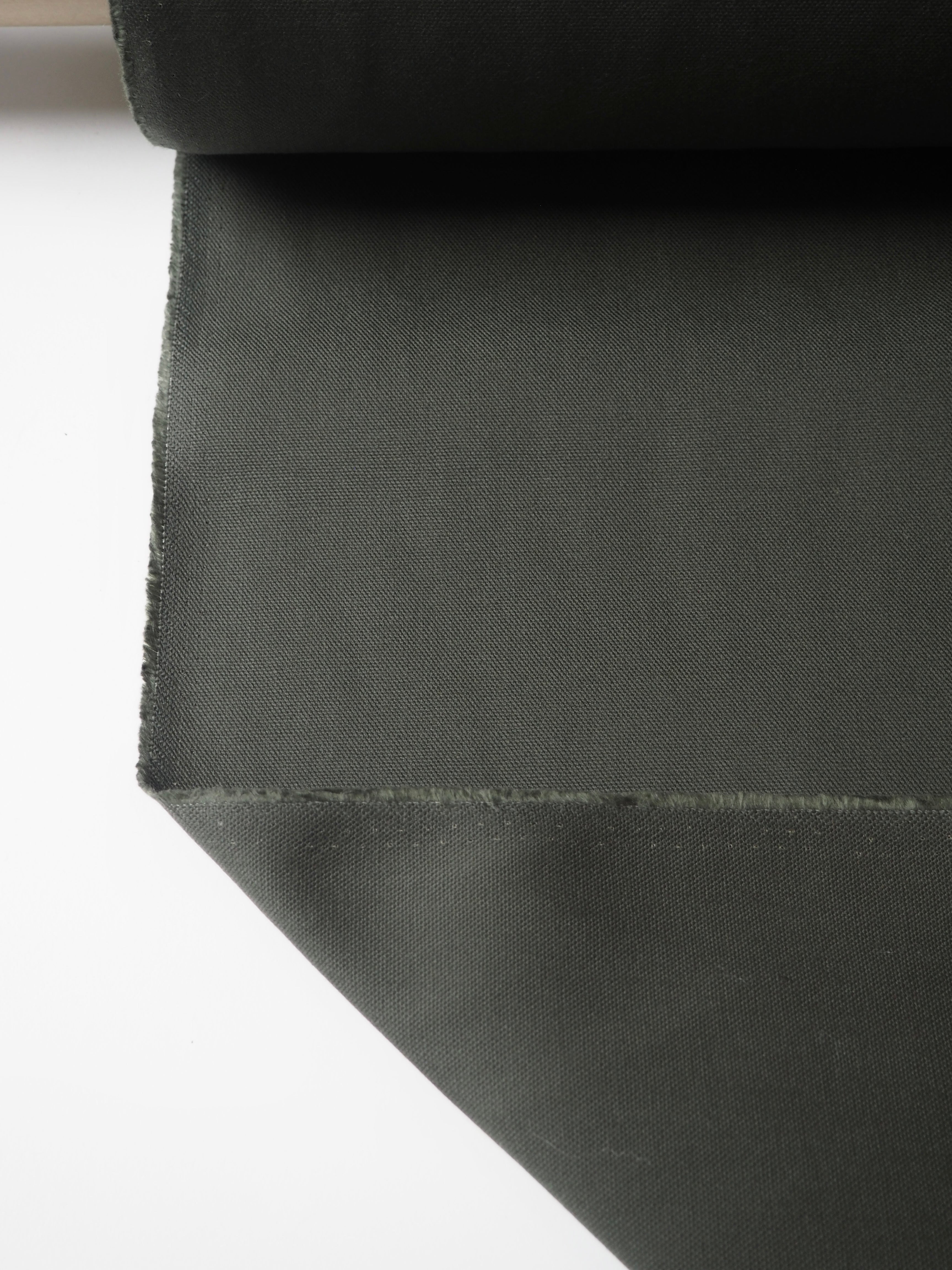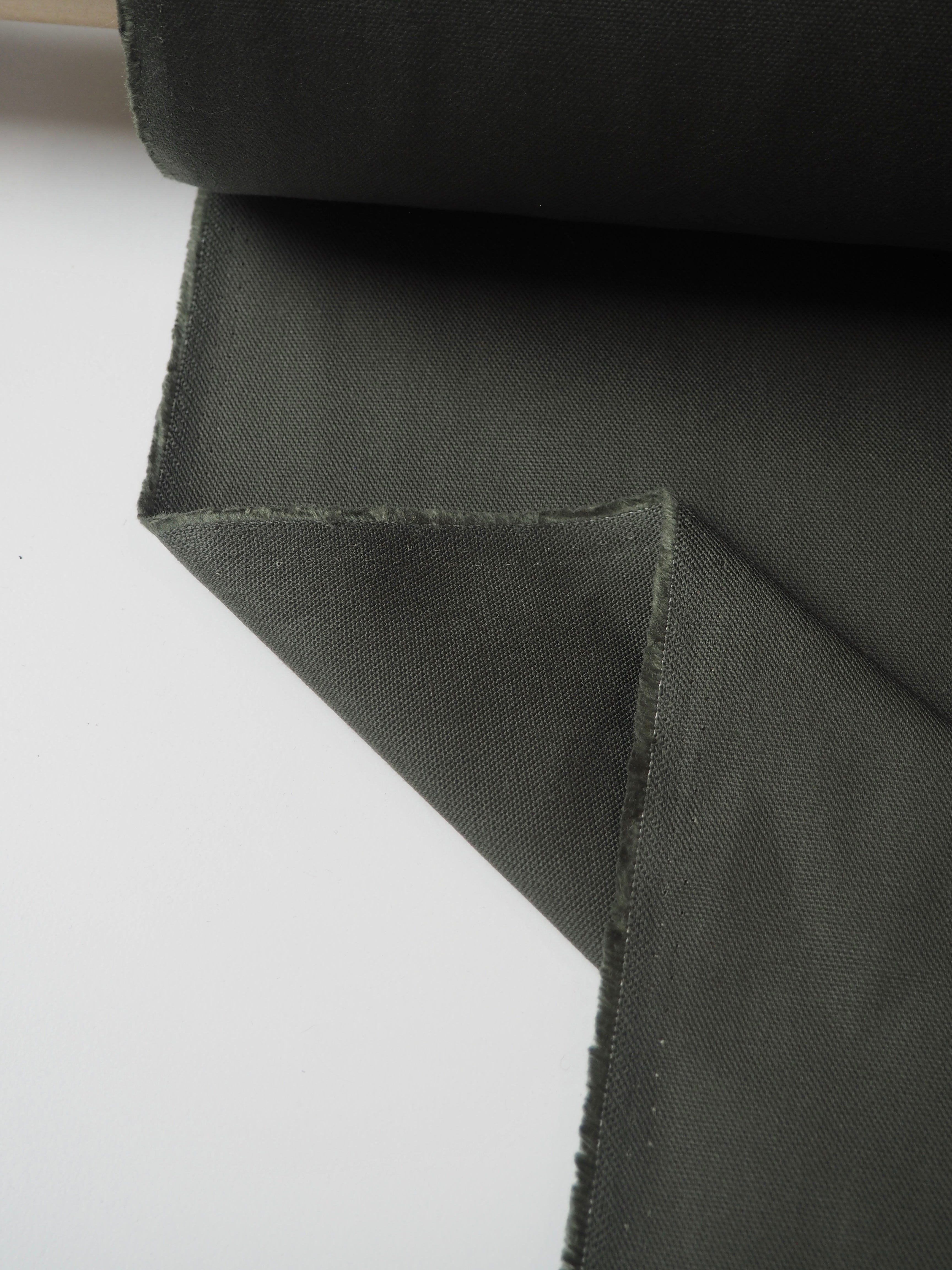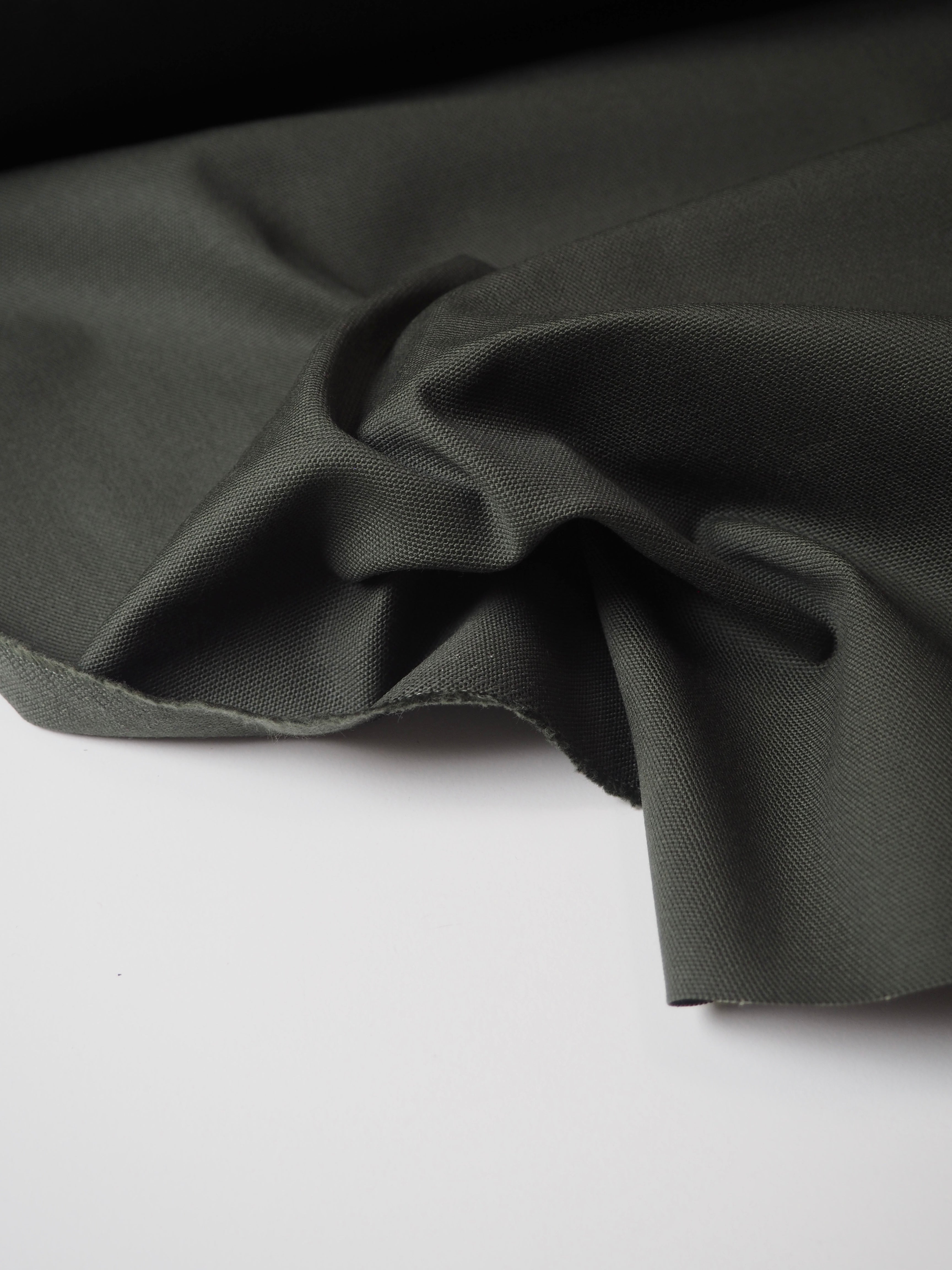 This ex-designer fabric is a cotton canvas. In a rich olive green colour. Medium weight with a great structure and pronounced plain canvas weave. A lovely handle typical of a nice cotton, with a more textured finish. Sturdy and lovely quality. Perfect for jackets, heavier-wearing trousers, totes, and even outdoor cushions! This colour does not photograph well, make sure to look at it in our Instagram video!