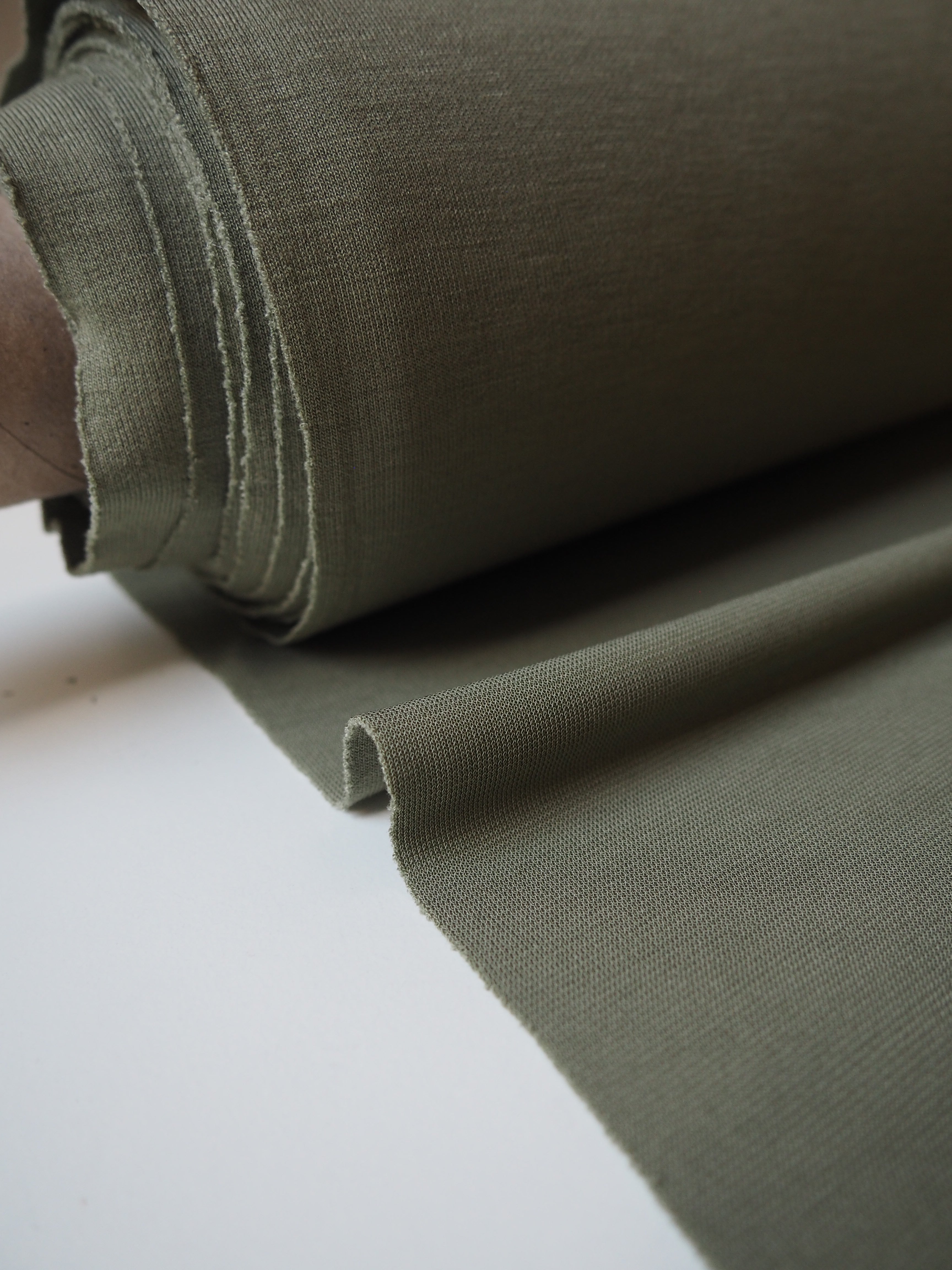 This ex-designer fabric is a jersey. It's a double jersey with one side in viscose and the other in nylon. It has a nice drape with a bit of structure. Has a soft and slightly slinky handle. Has 30% stretch width ways, less length ways, and great recovery. Opaque with a slight sheen. Perfect for tops and skirts!