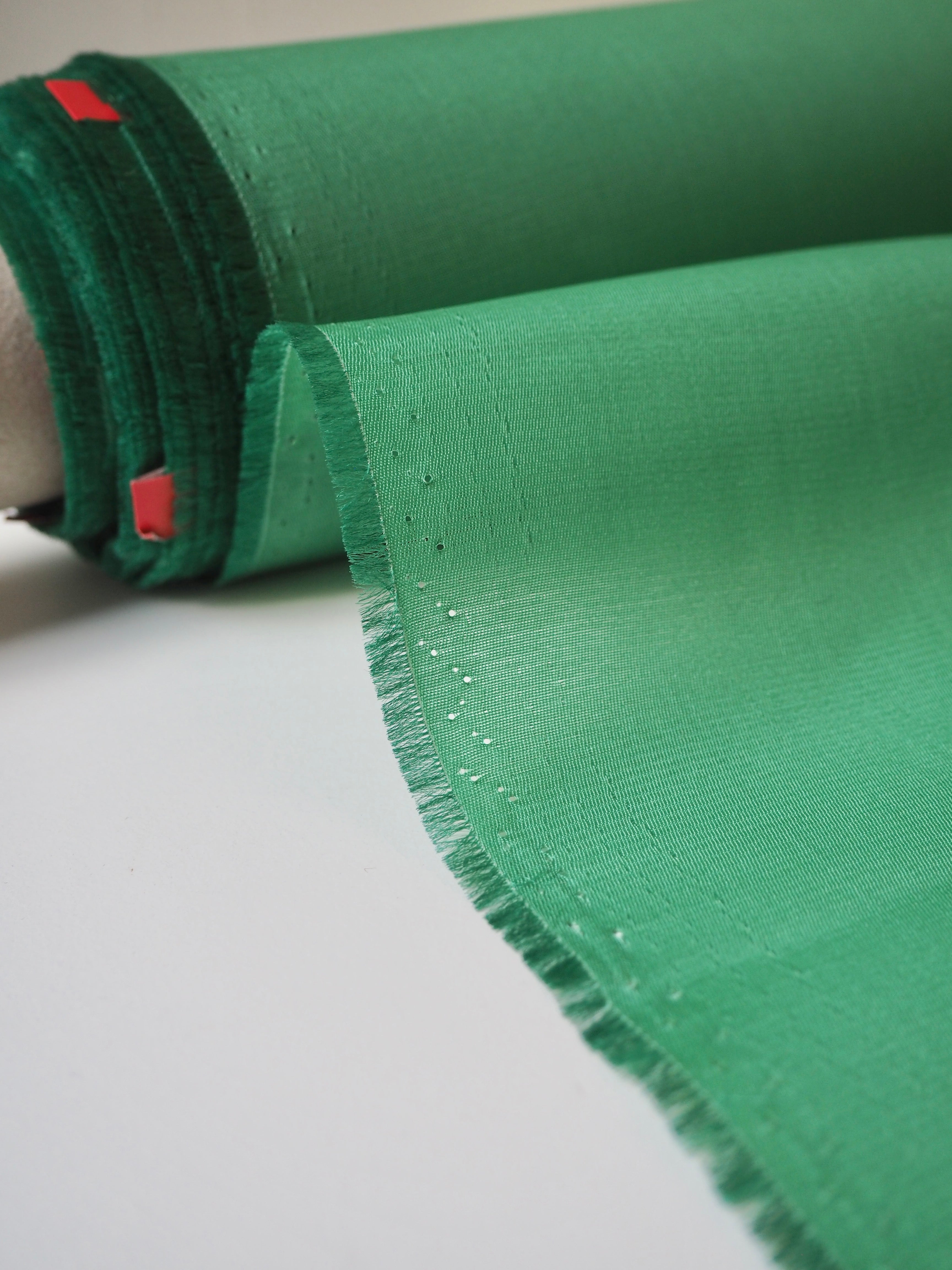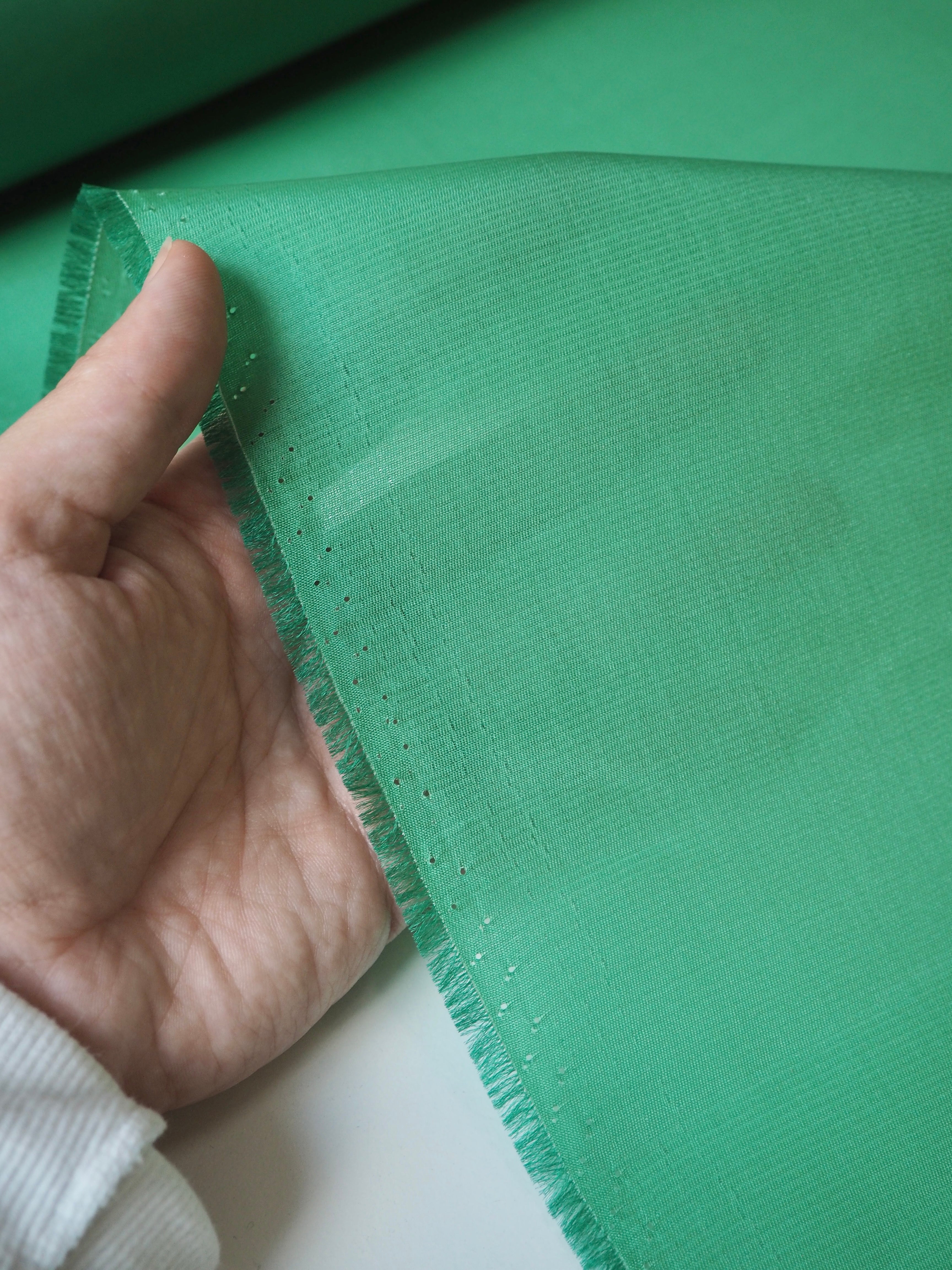 This ex-designer fabric is a beautiful silk organza. This organza is slightly heavier and less sheer. Woven from lustrous silk yarns which result in the finish that catches the light as it moves. In a verdant medium green shade, with amazing structure to play with. Great for volume pieces, like skirts, sleeves, or bags!