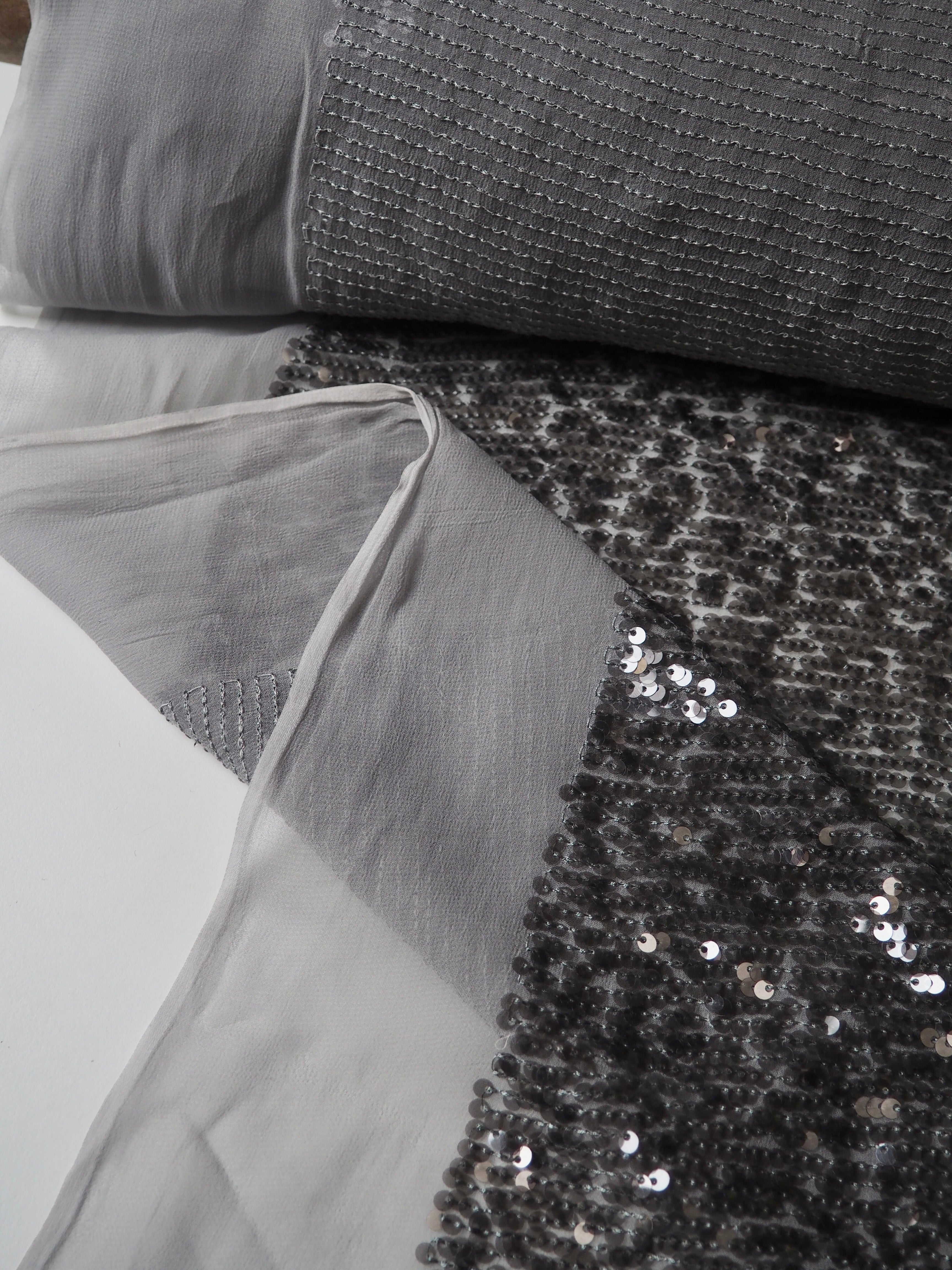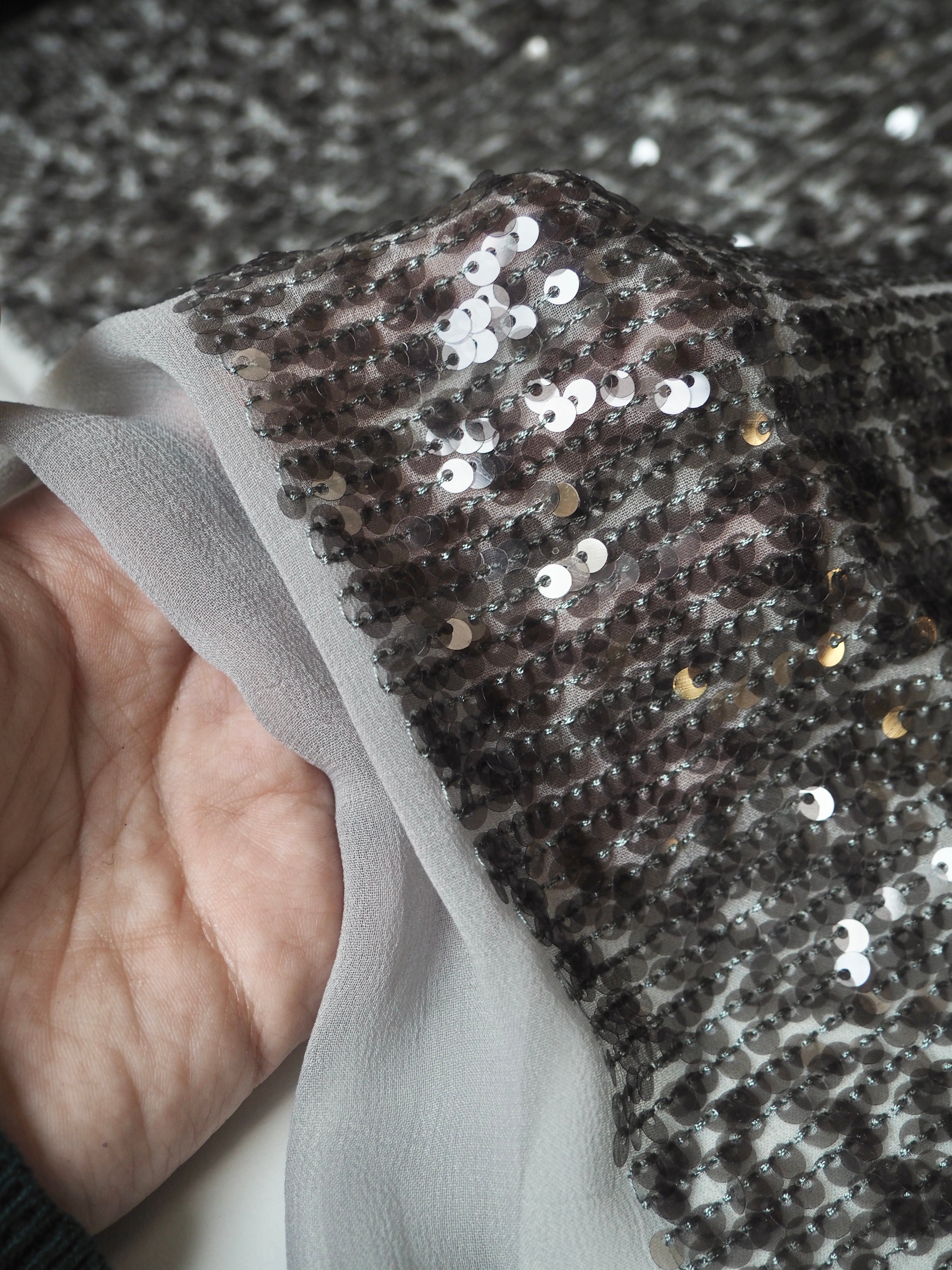 This ex-designer fabric is a sequin chiffon. Shiny grey sequins are woven onto this grey viscose chiffon. It has a luxurious look and handle, with great movement and a beautiful drape. Lightweight, most opaque, and eye-catching. Has a nice gentle handle. Would be perfect for a party dress or skirt!