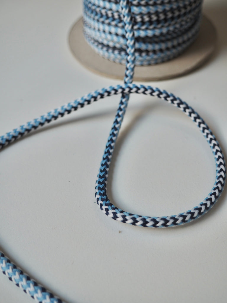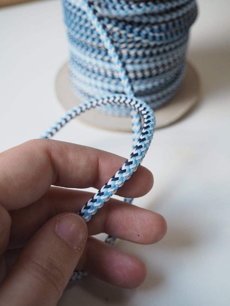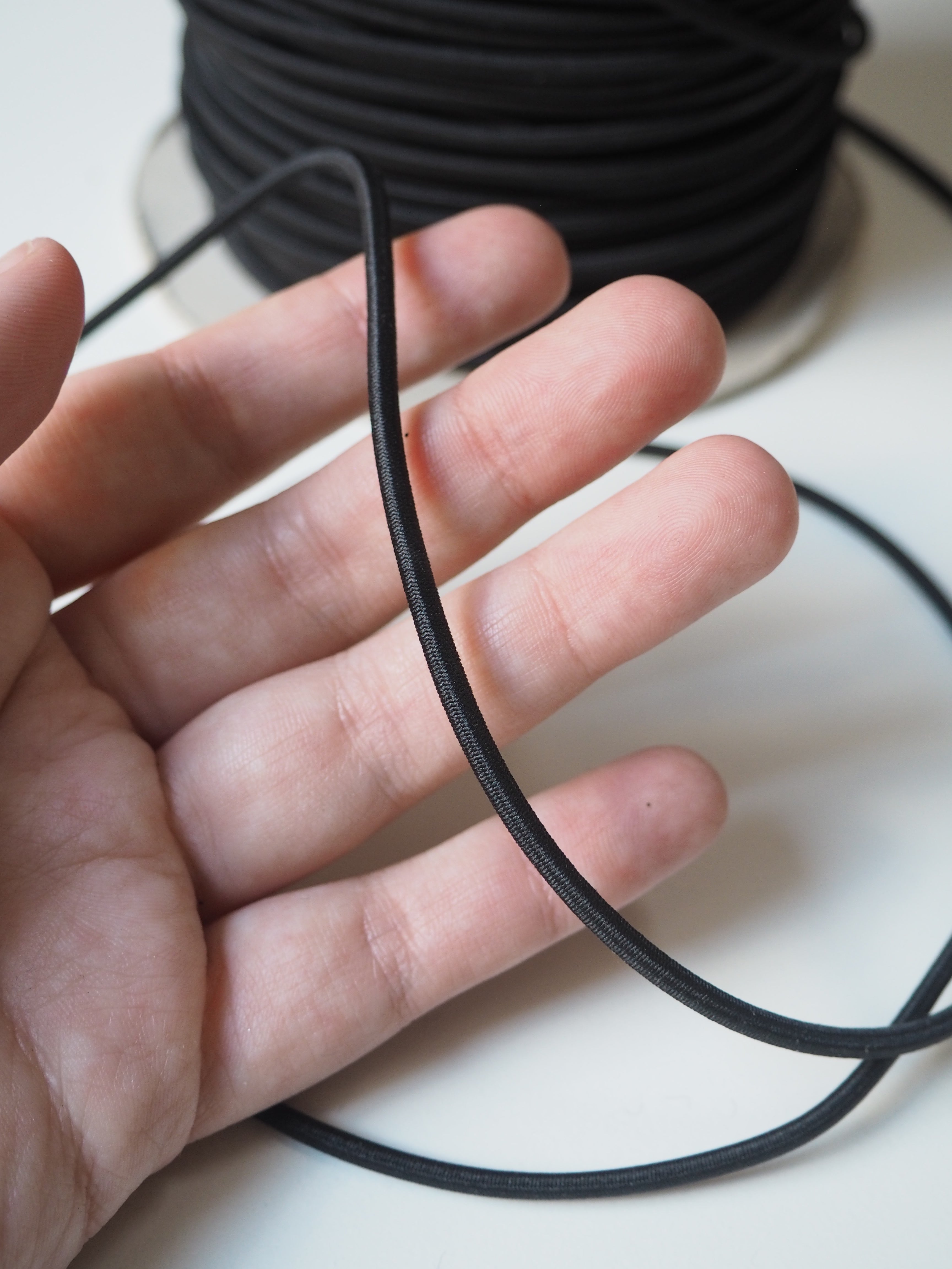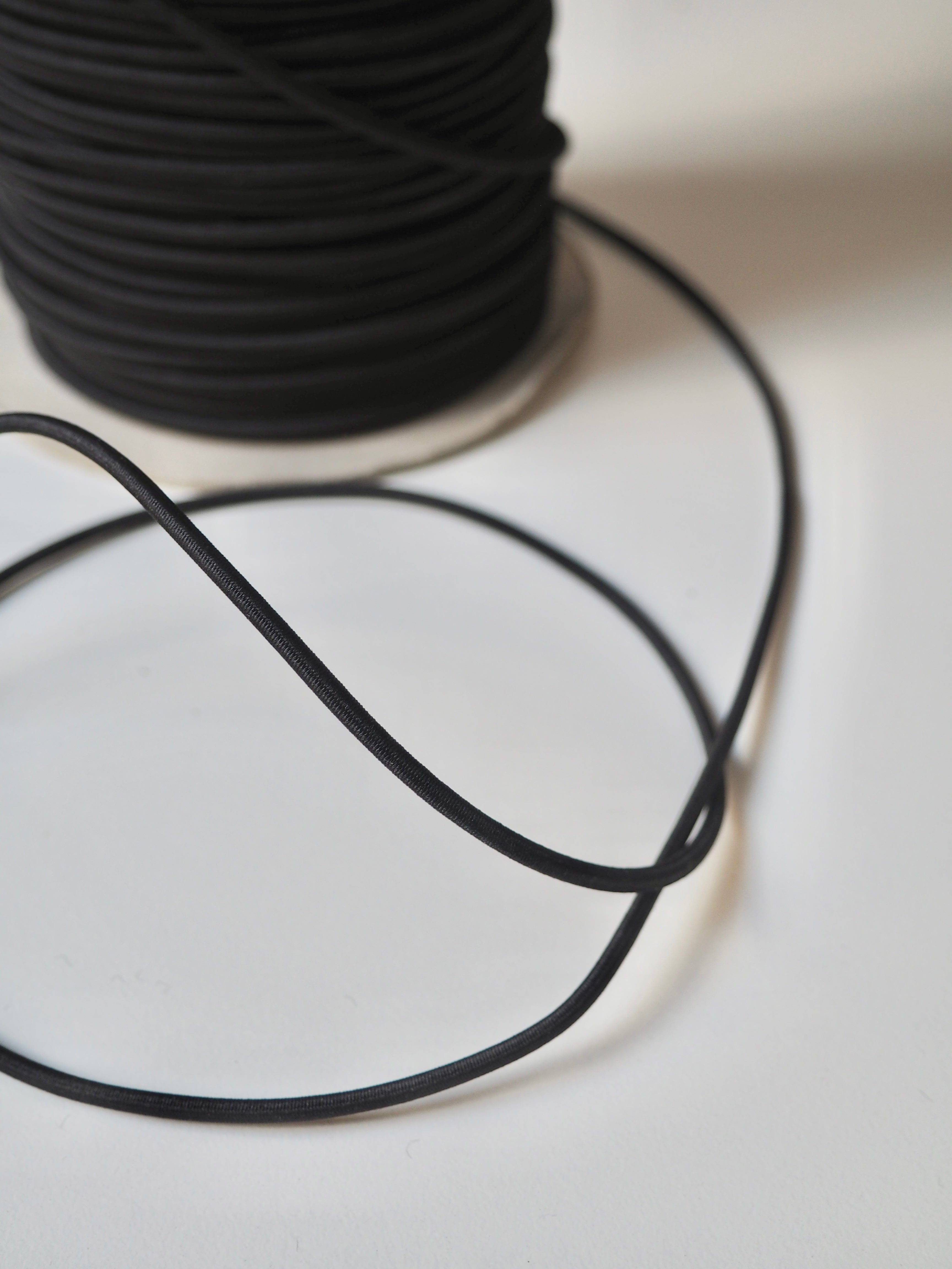 This ex-designer trim is a elastic cord. Elastic Bungee cord with a two part construction.  An extremely strong polyester outer surrounds a central core of elastane cords.  It is super strong, with great recovery and has 100% stretch!