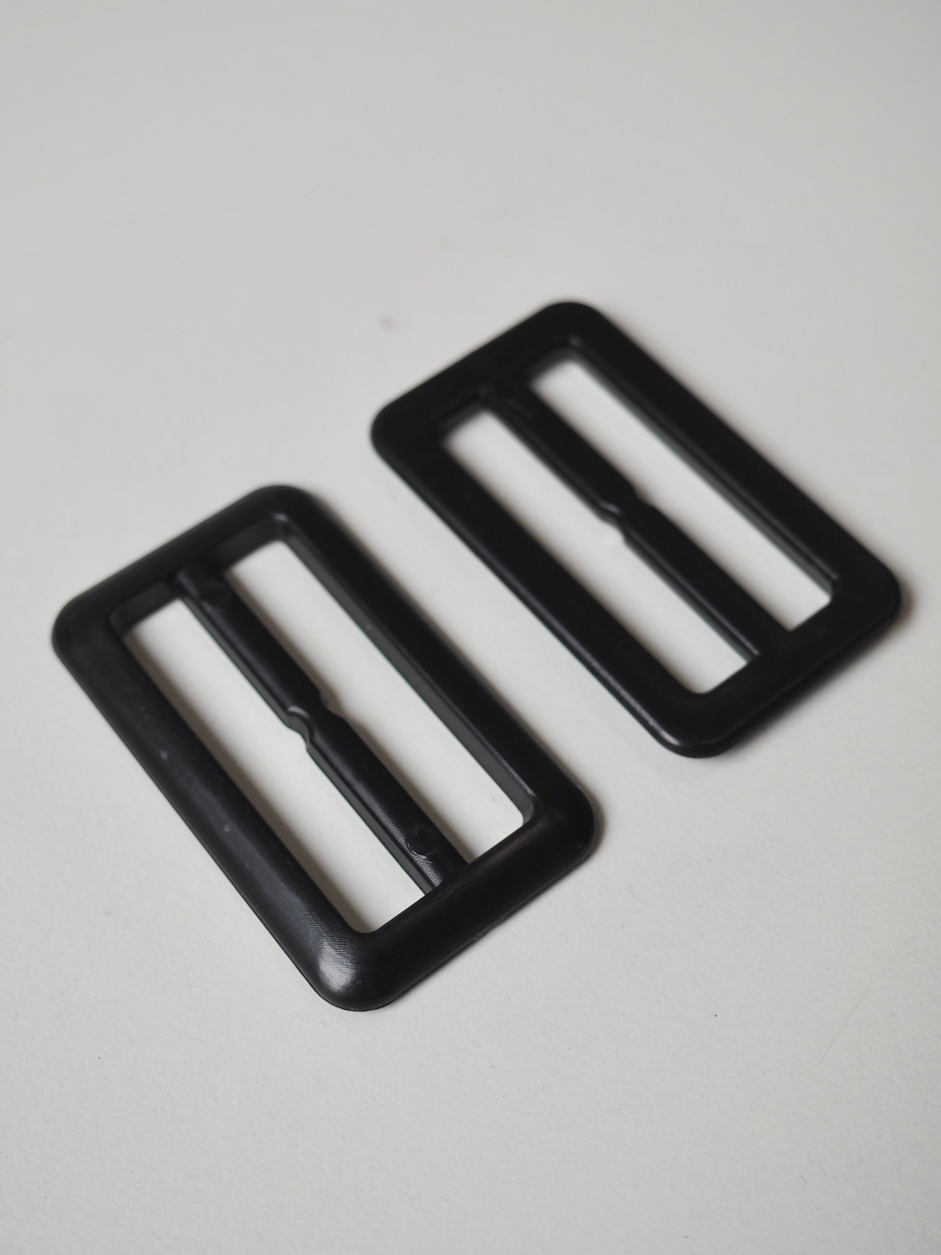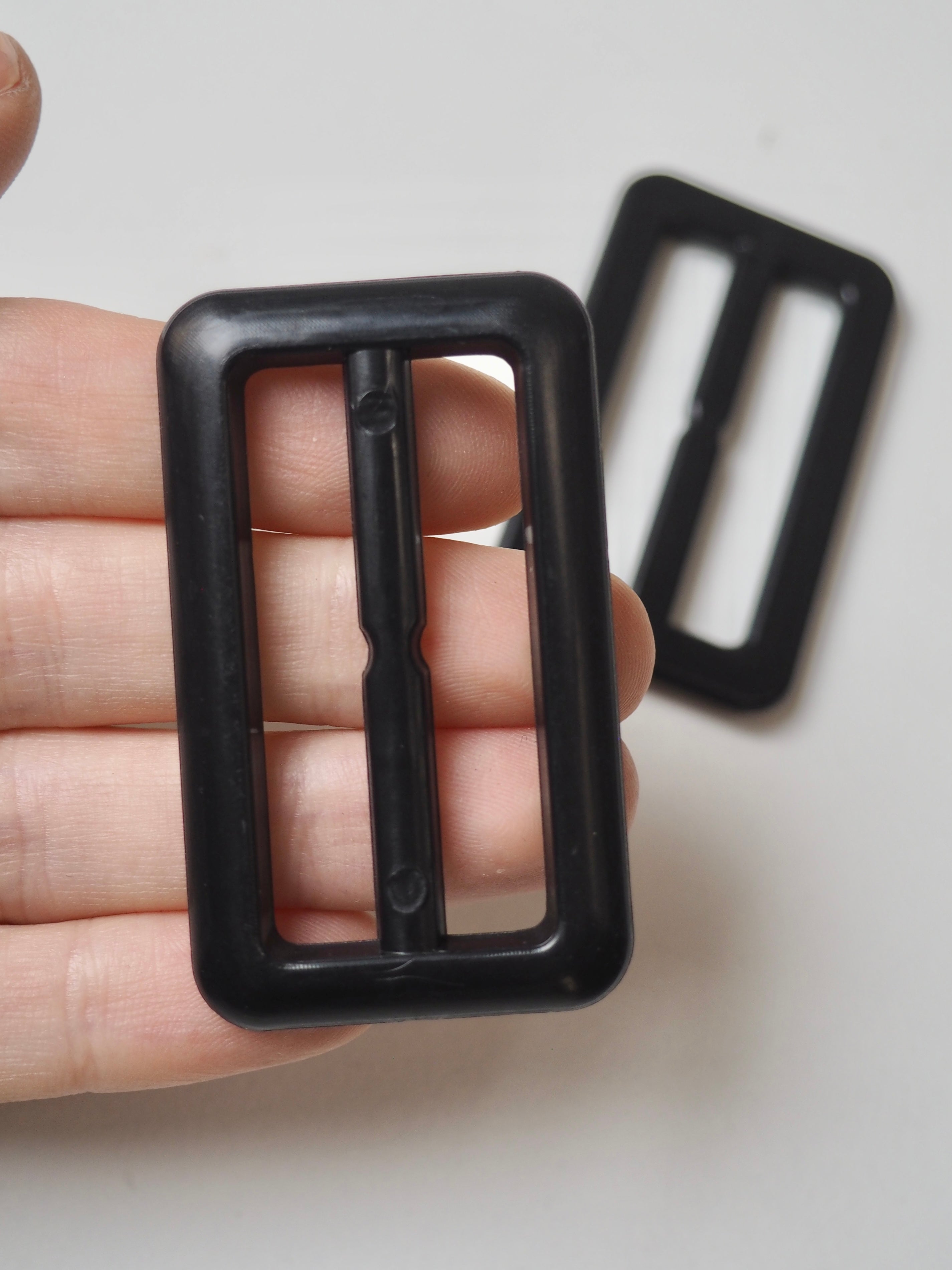 This ex-designer hardware is a slider. It's lightweight plastic and has a fixed central bar for adjustments. They could be used for coats, dresses, jumpsuits, or accessories - they're great for adding an extra detail to your me-mades.
