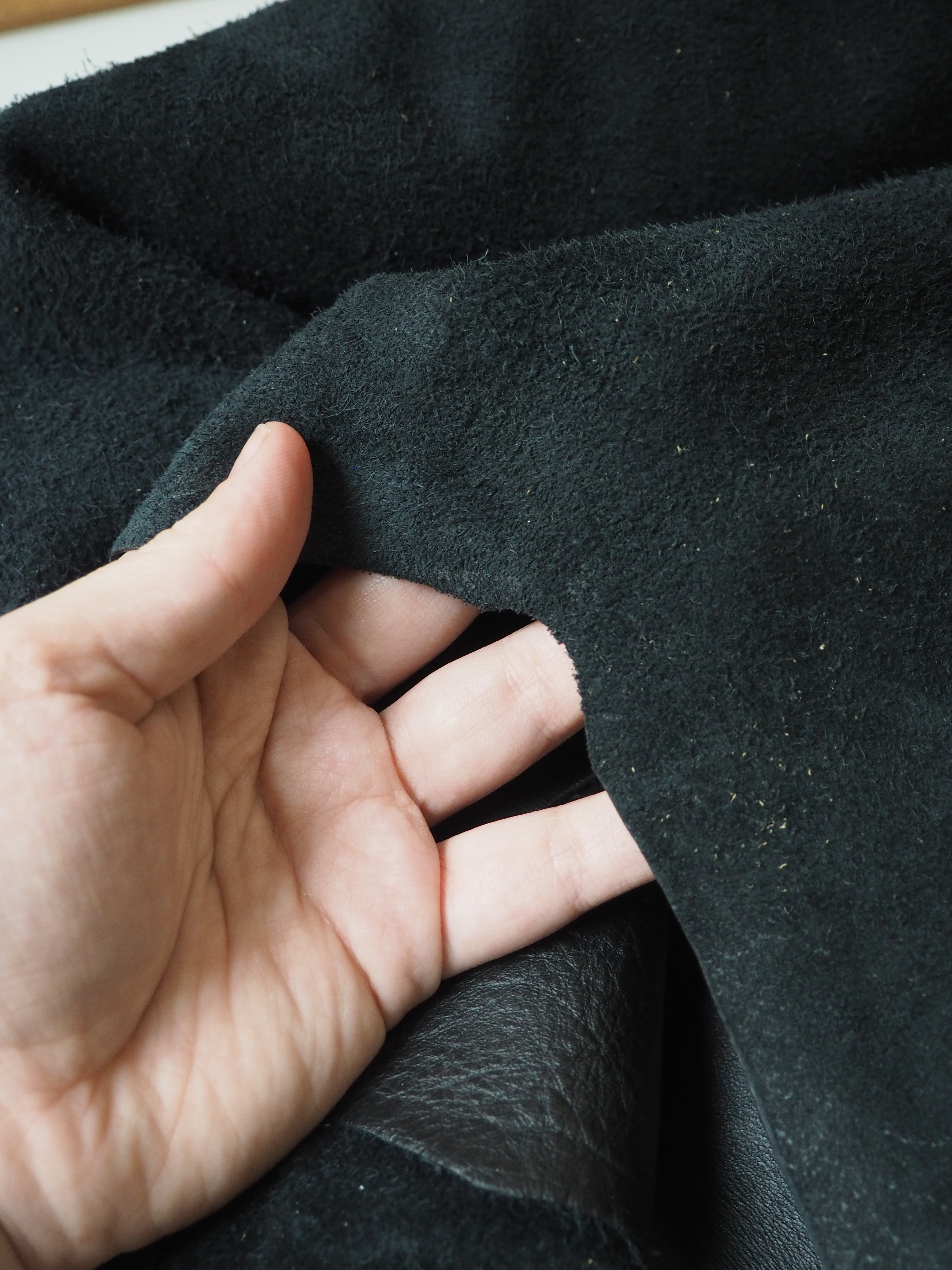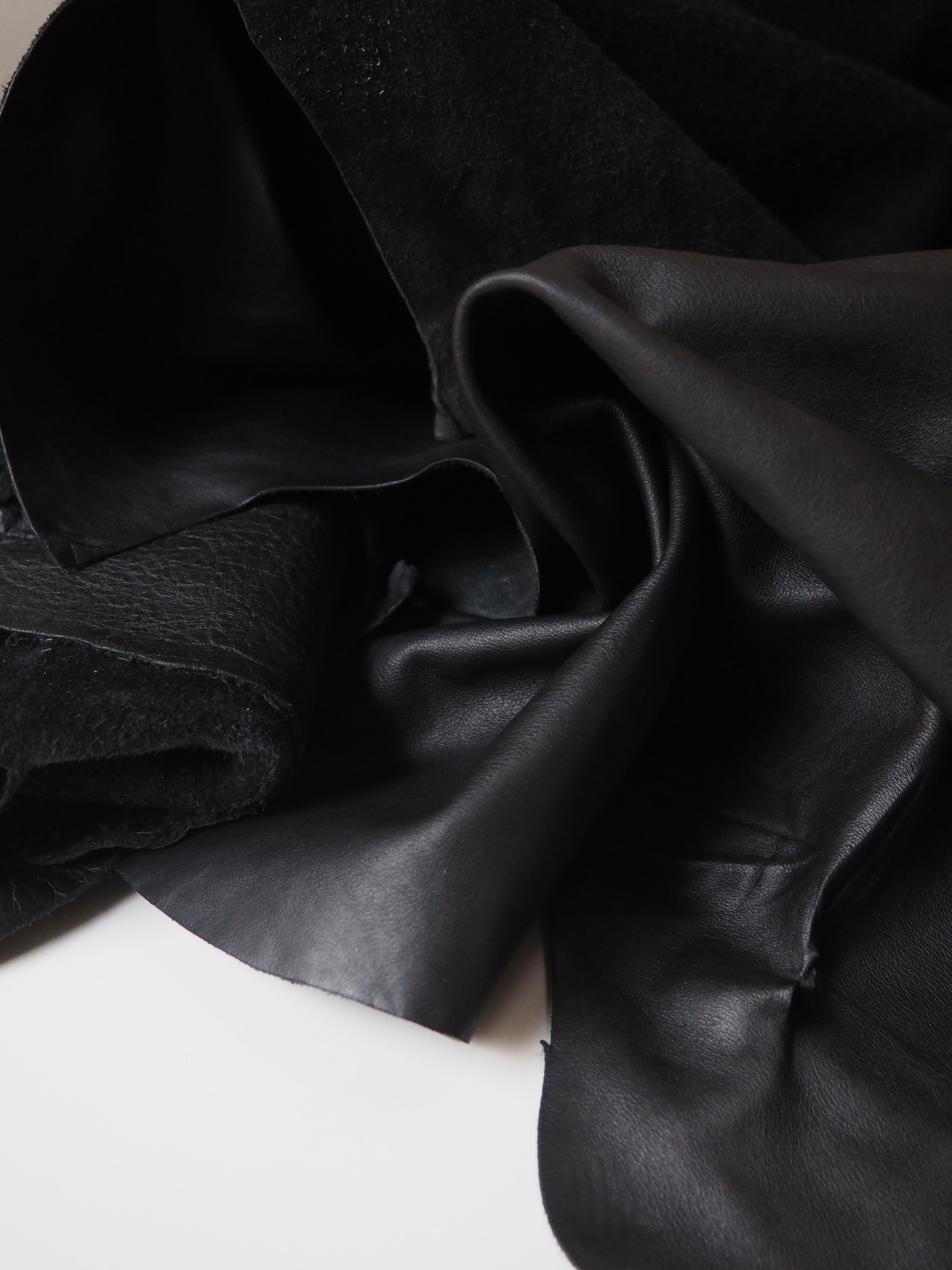 This ex-designer leather is a calfskin. It's a smooth and supple leather with a more natural finish. It has a soft handle, and nice light weight. Drapes nicely with a slight structure. In a true black colour. We would love to see this made up into a jacket!