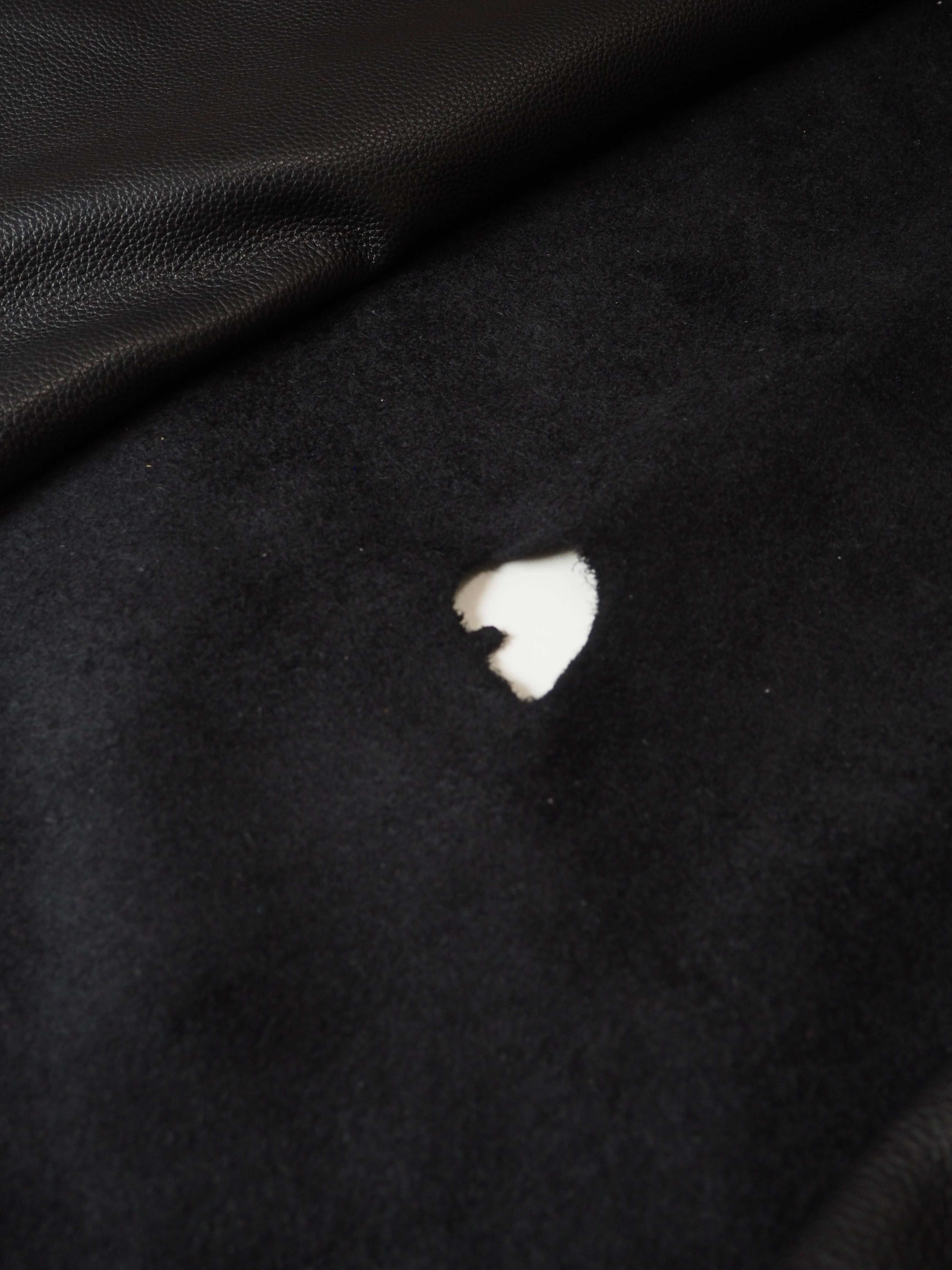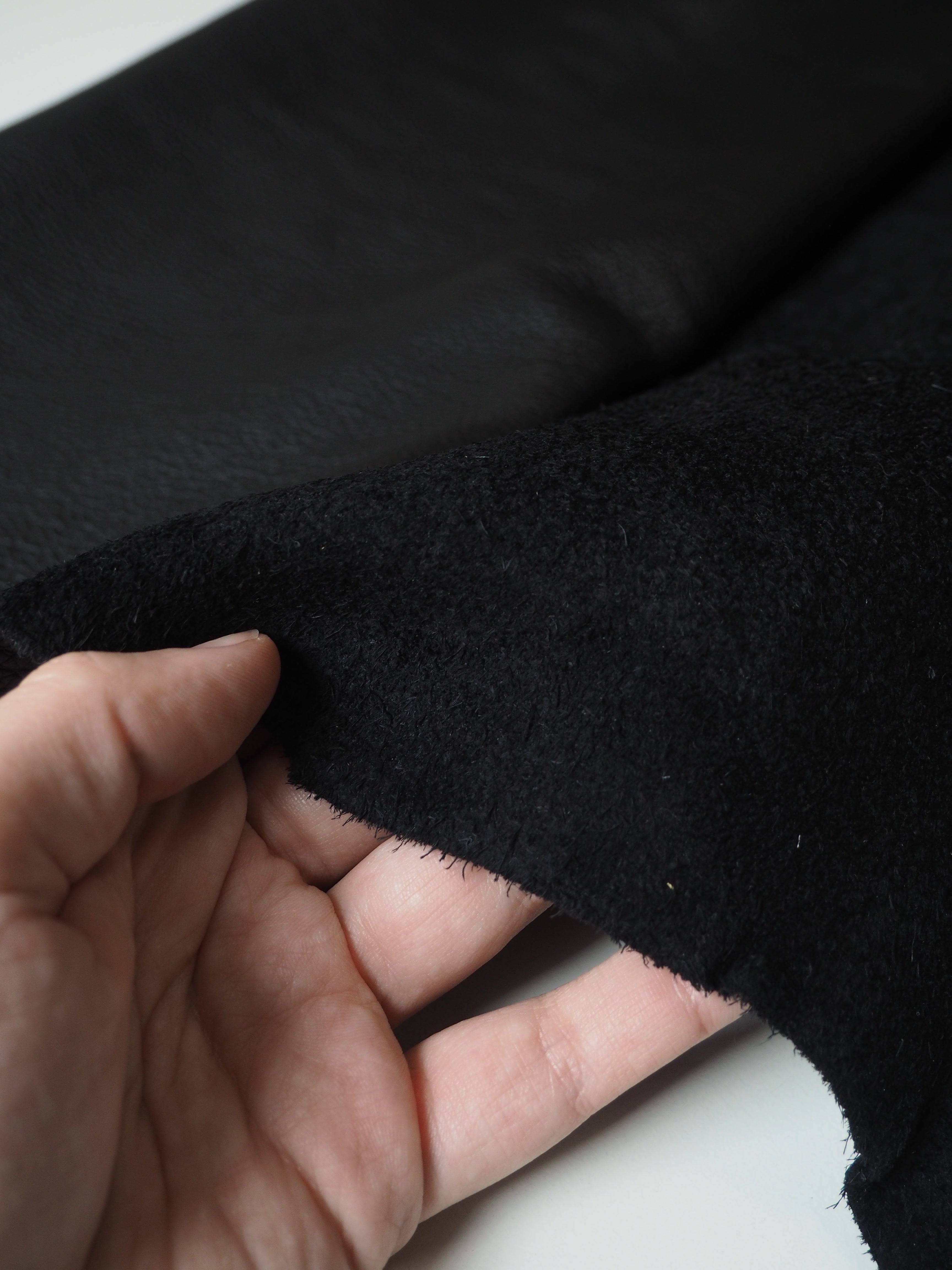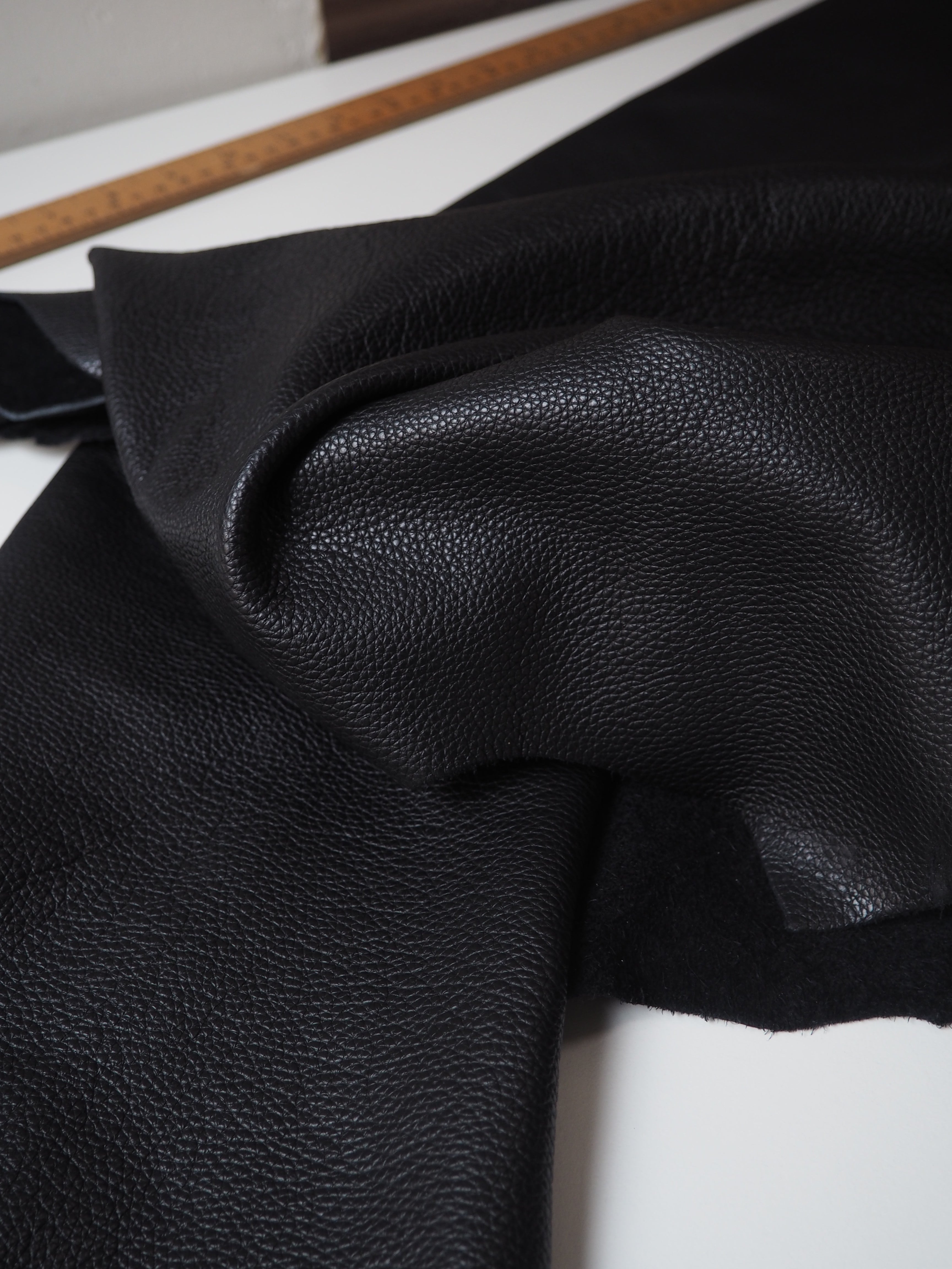 This ex-designer leather is a calfskin. It's a top grain leather with a pebbled finish, a sturdy handle, and nice medium to heavy weight. In a rich black colour. We would love to see this made up into a bag or purse!