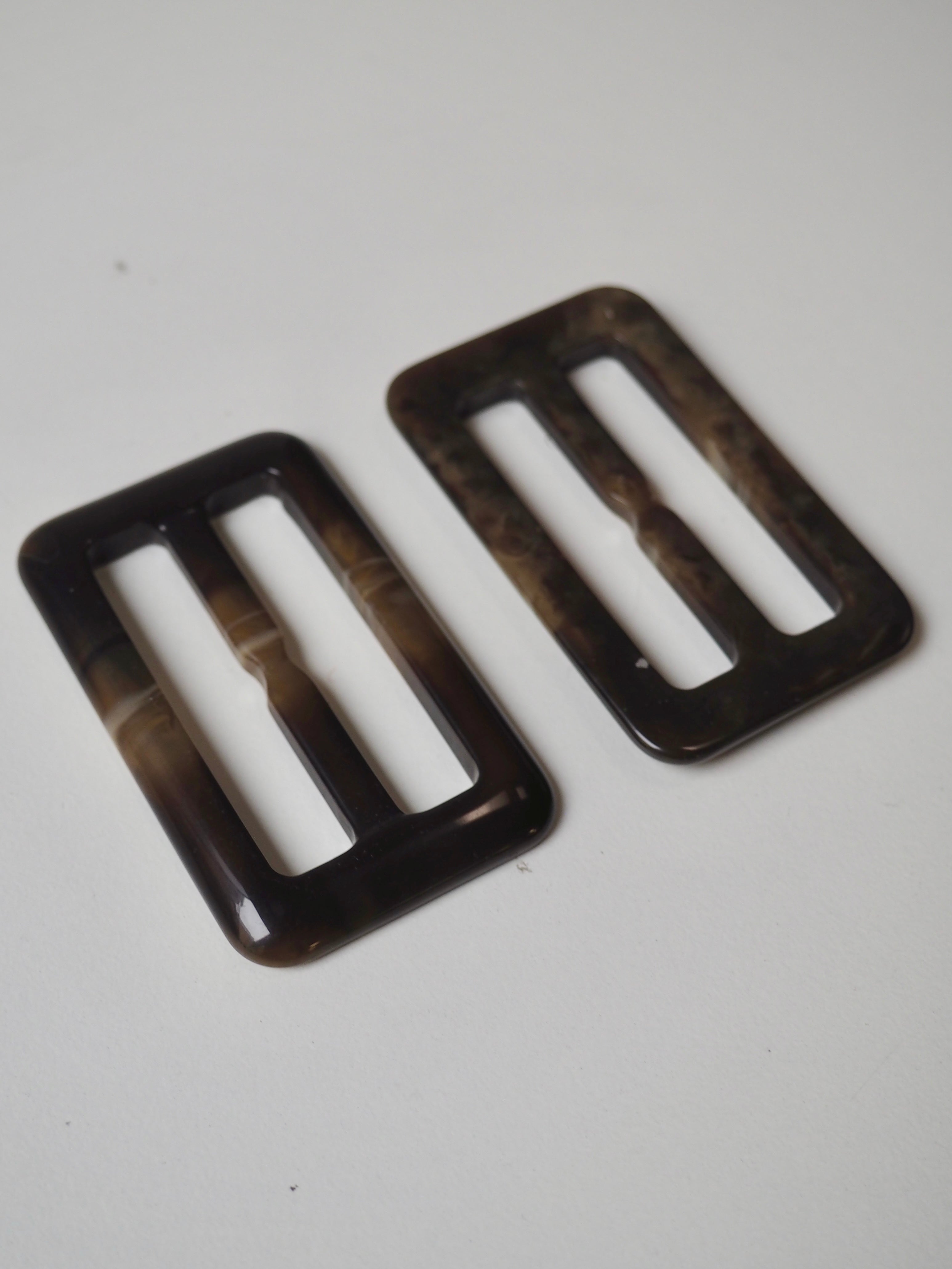 This ex-designer hardware is a slider. It's lightweight plastic and has a fixed central bar for adjustments. They could be used for coats, dresses, jumpsuits, or accessories - they're great for adding an extra detail to your me-mades.