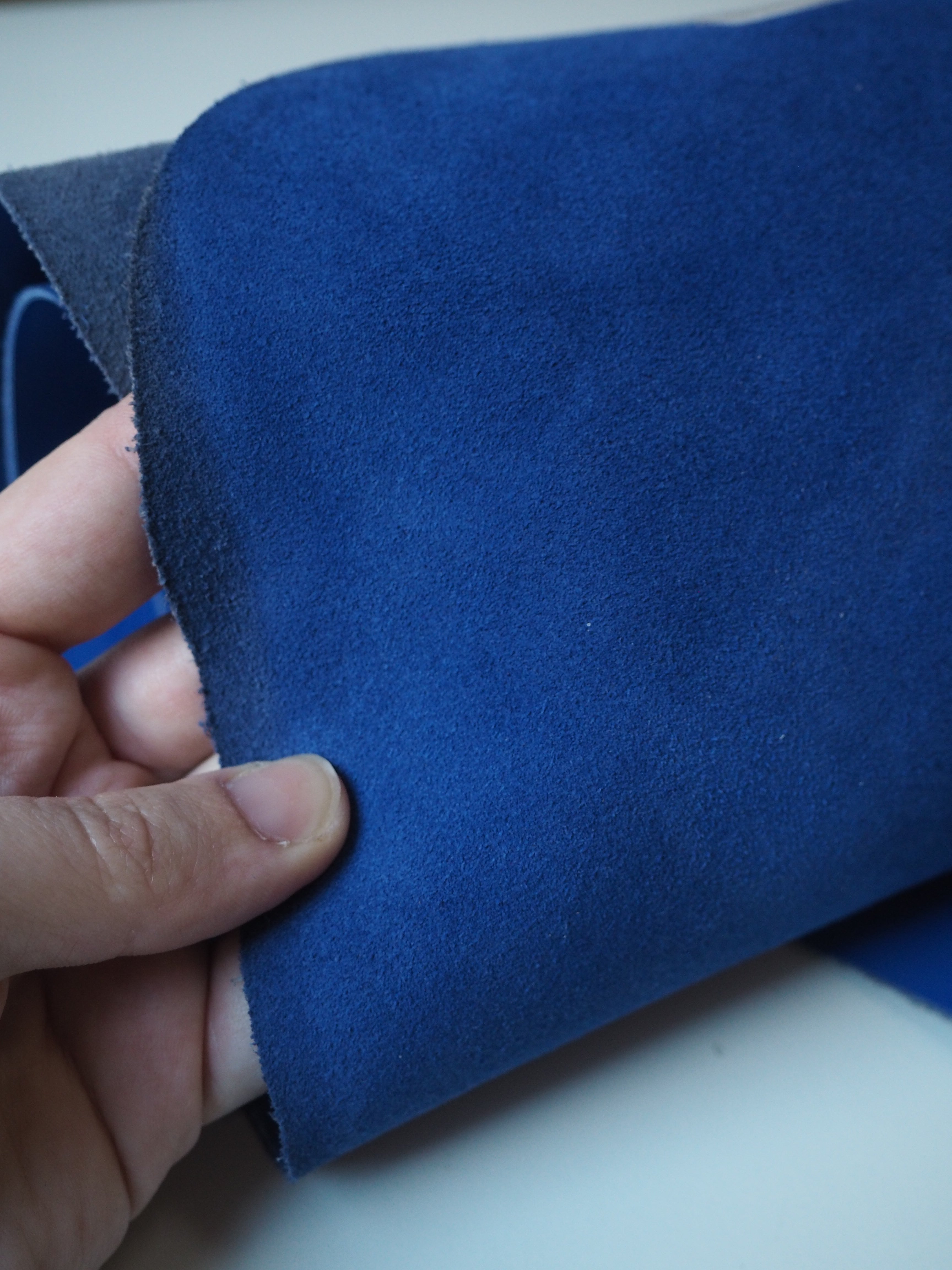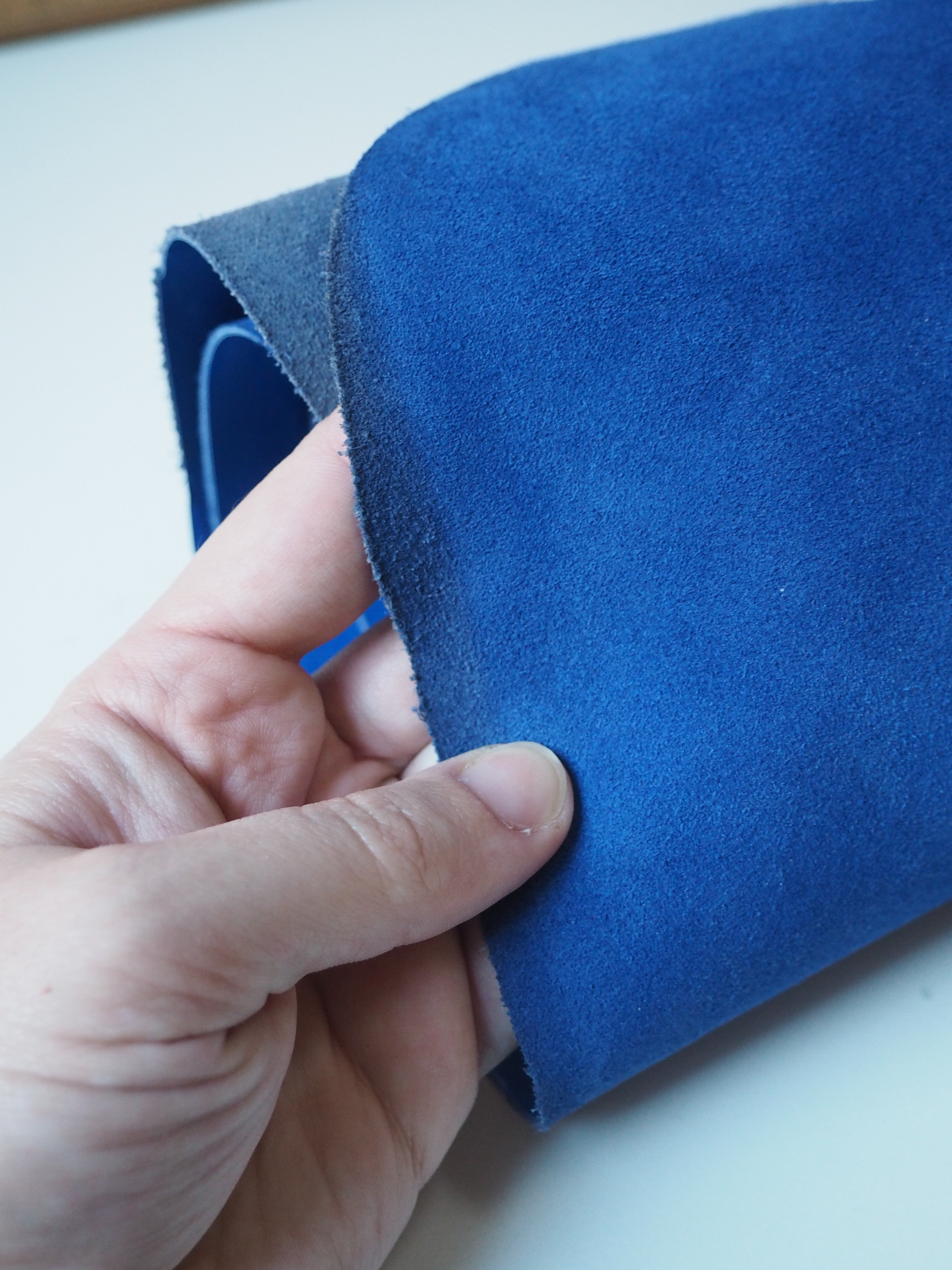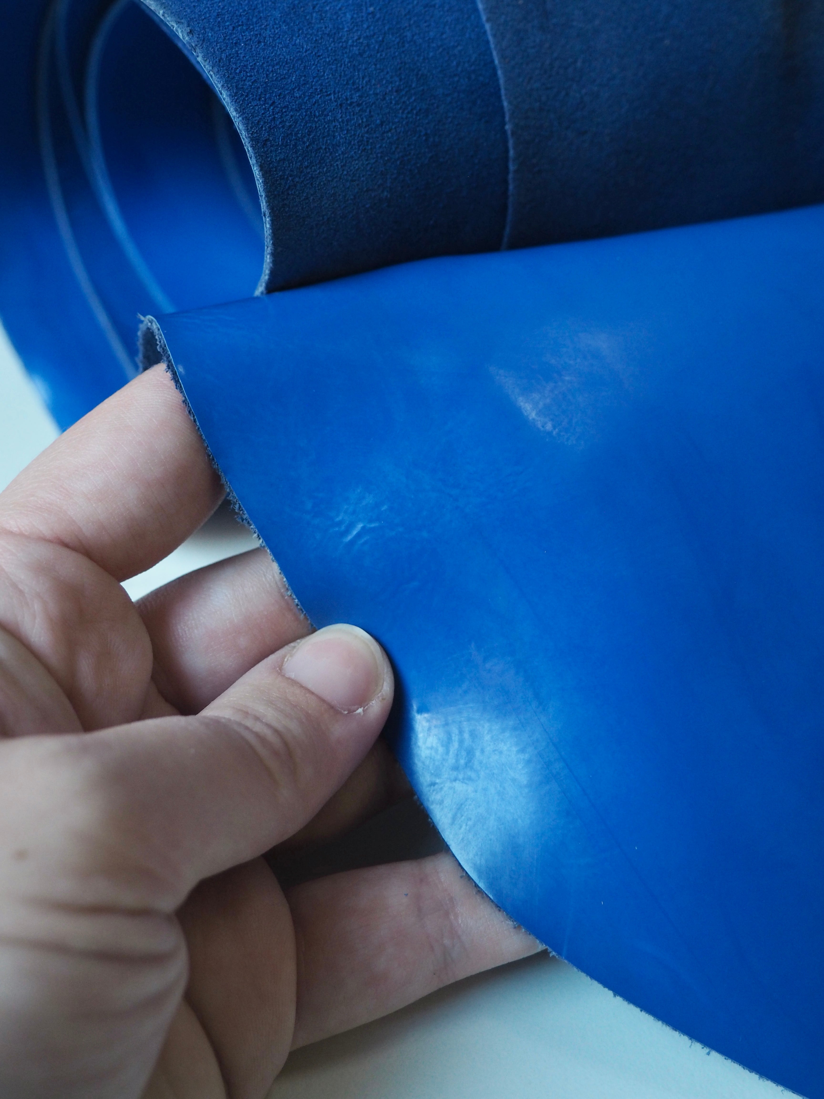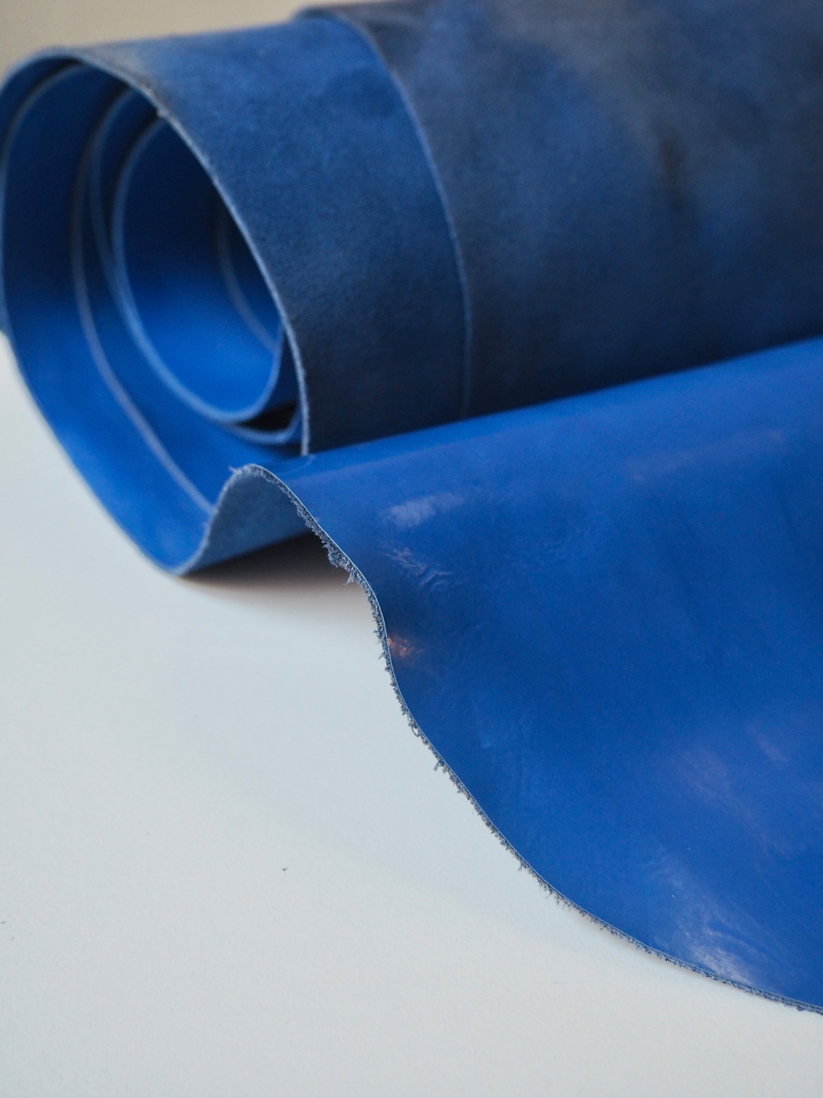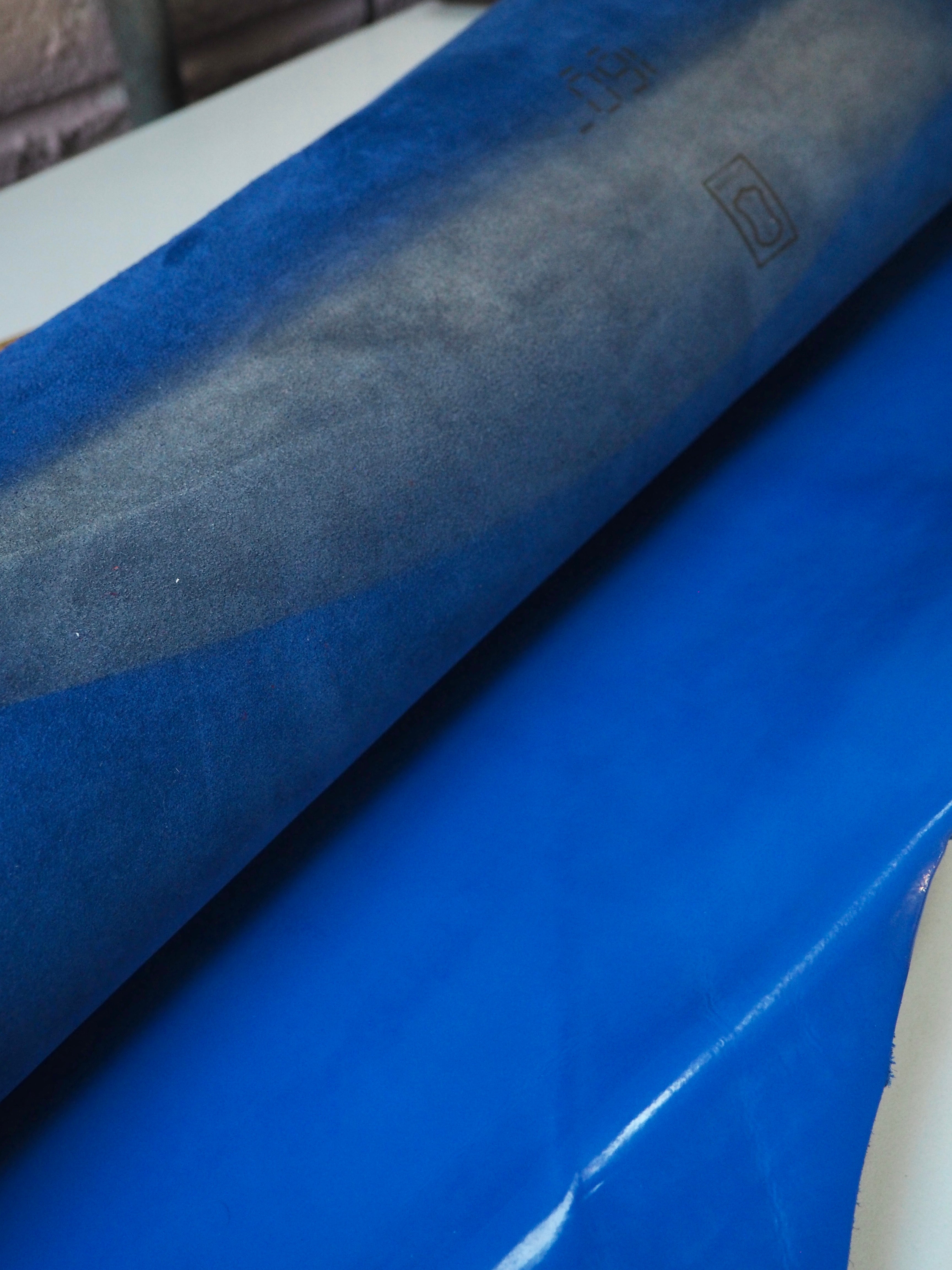 This ex-designer leather is a calfskin. It's smooth with a patent blue film on top, which gives it a high shine finish. It has a very sturdy handle, and a medium weight. Has a great thick structure, in an electric blue colour. We would love to see this made up into a bag or purse!