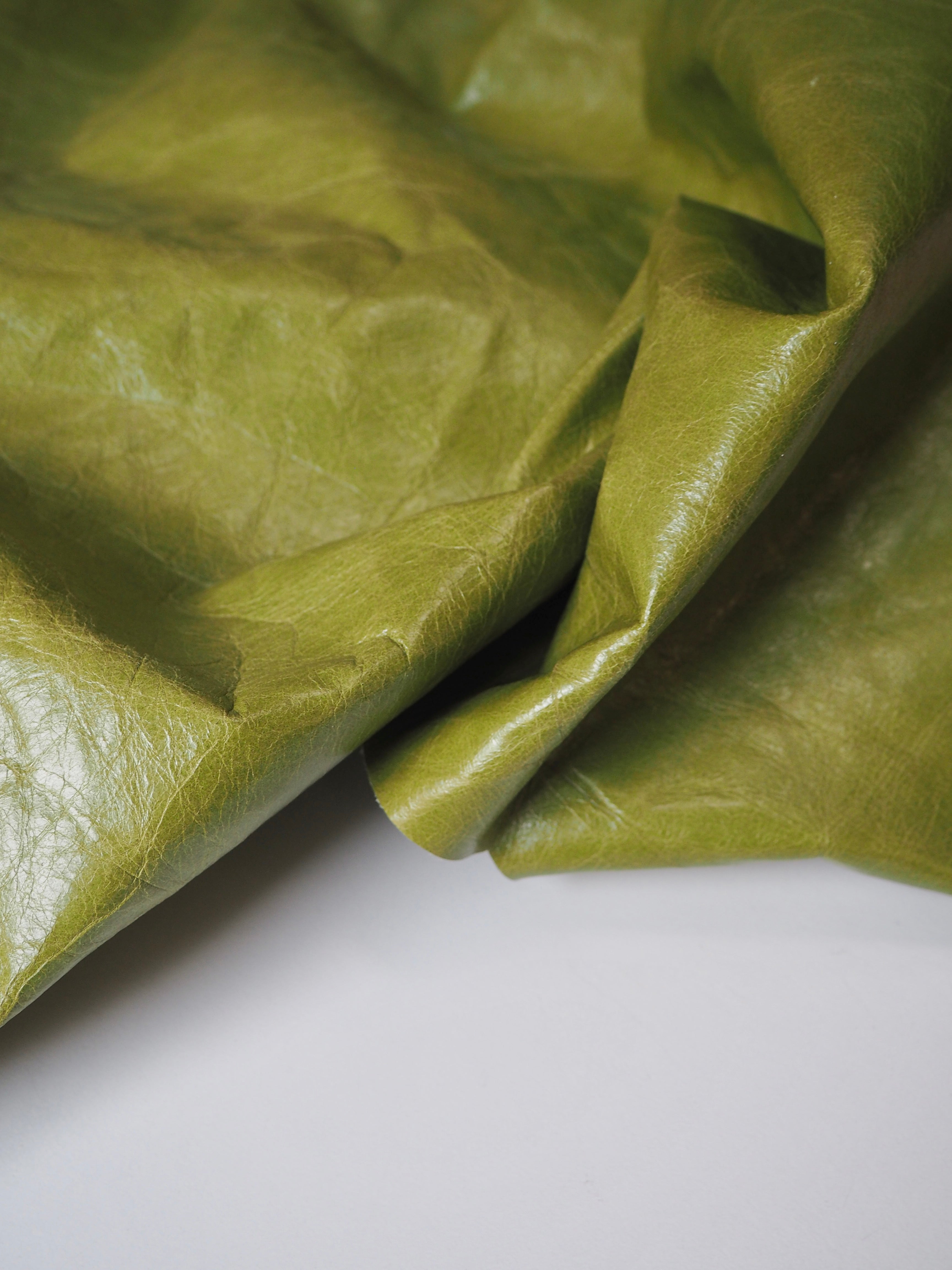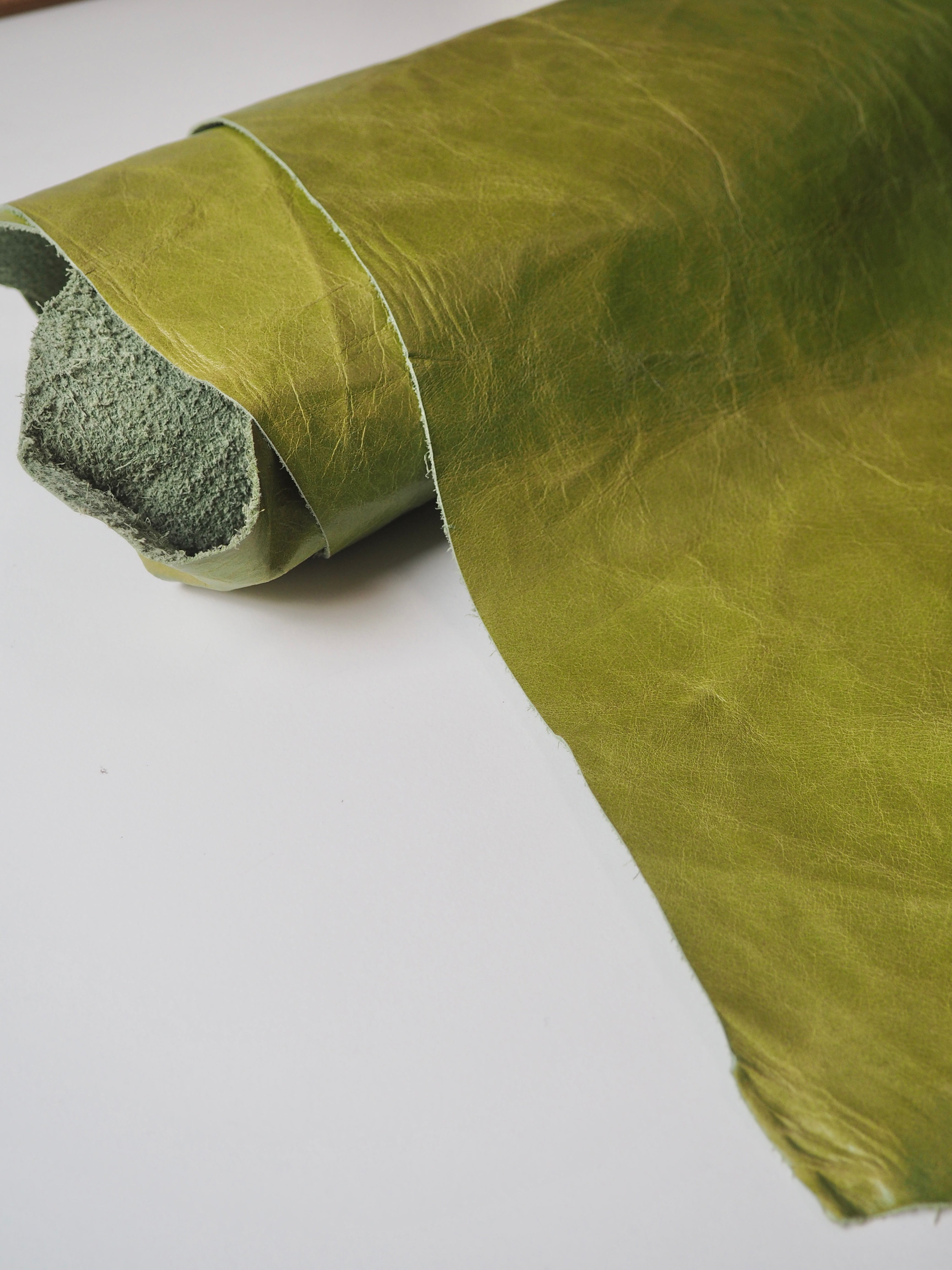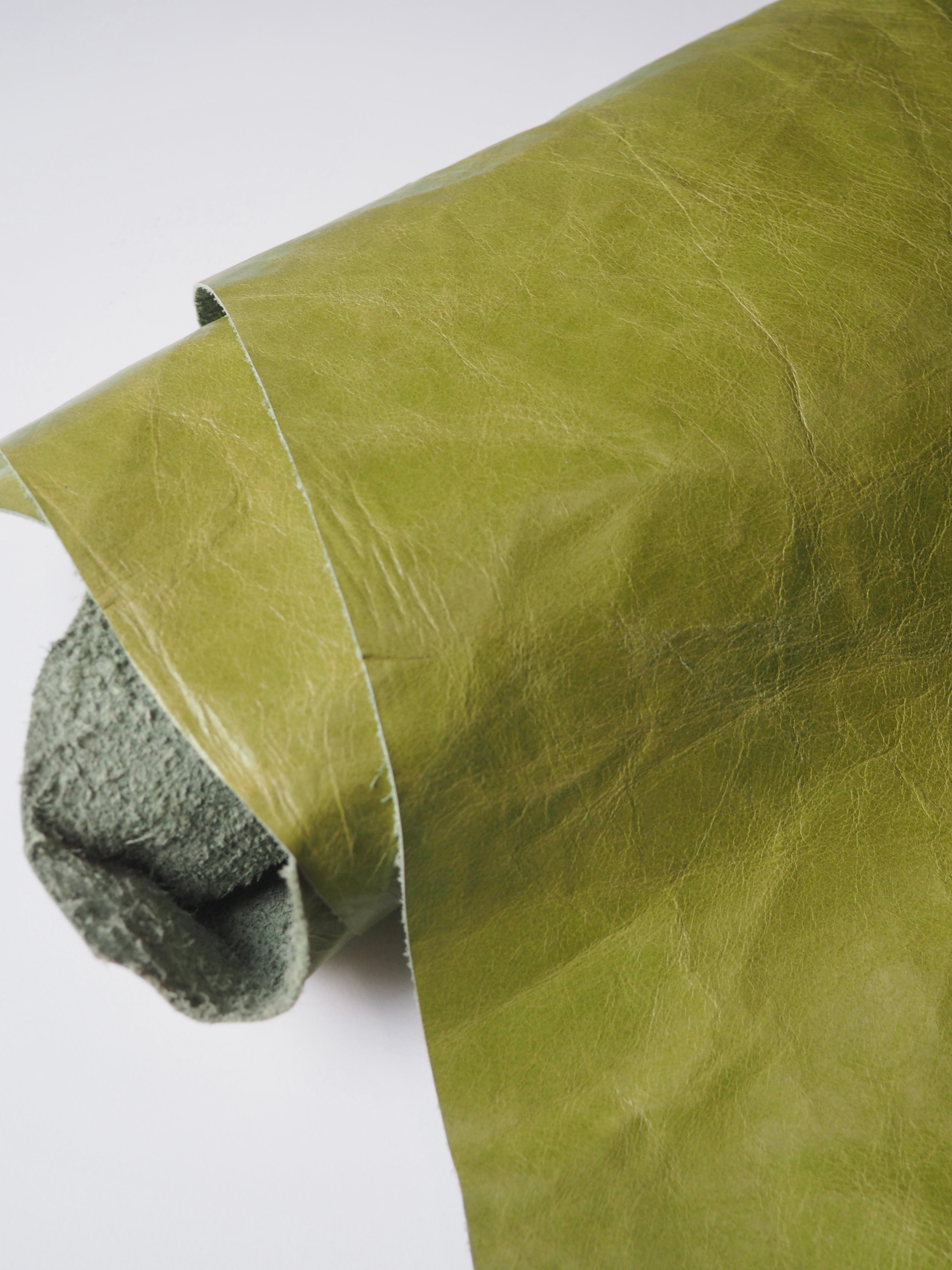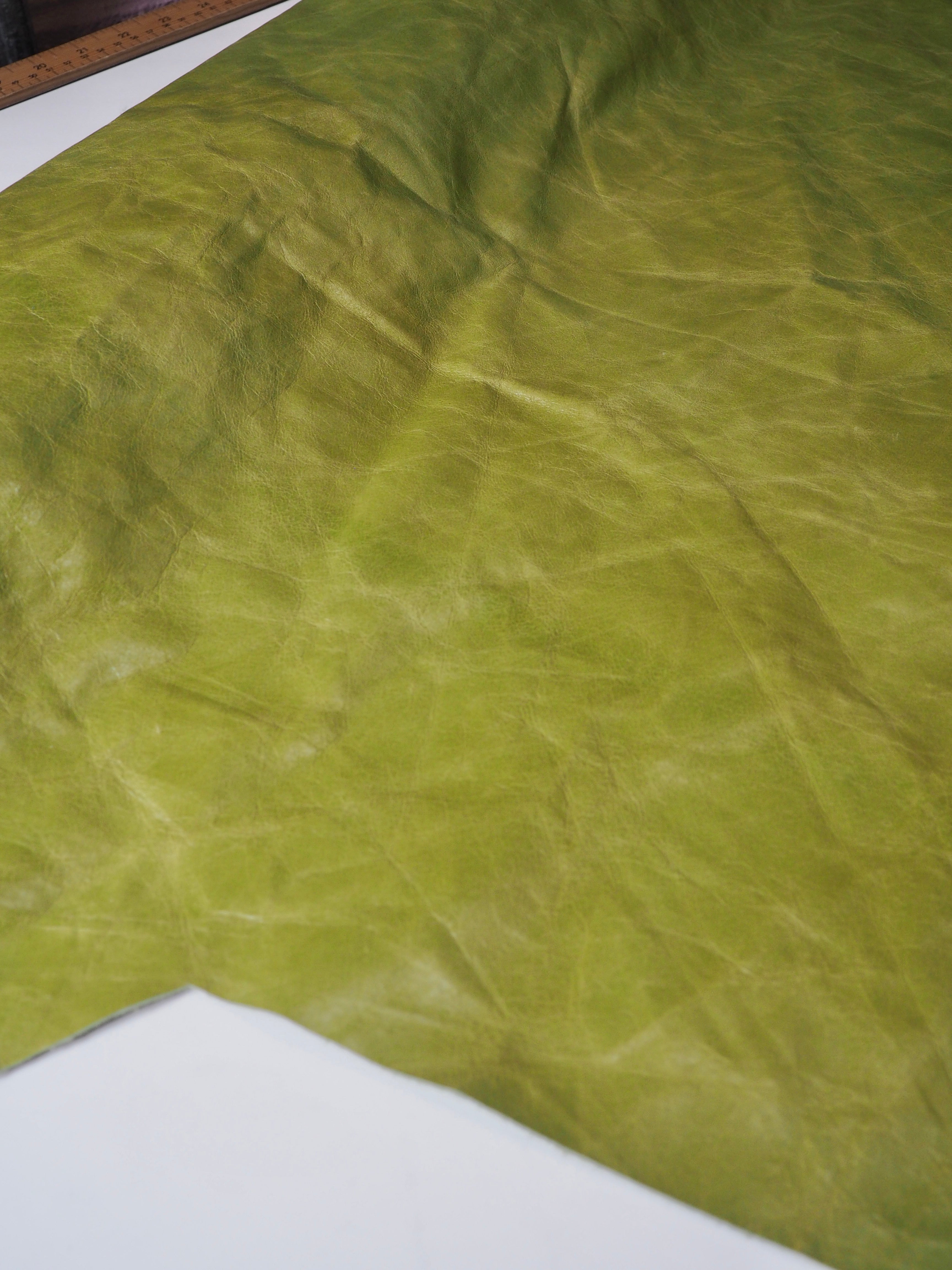 This ex-designer leather is a calfskin. It has a distressed finish, with a slightly textured handle, and light to medium weight. In a true apple green colour. We would love to see this made up into a jacket or bag!