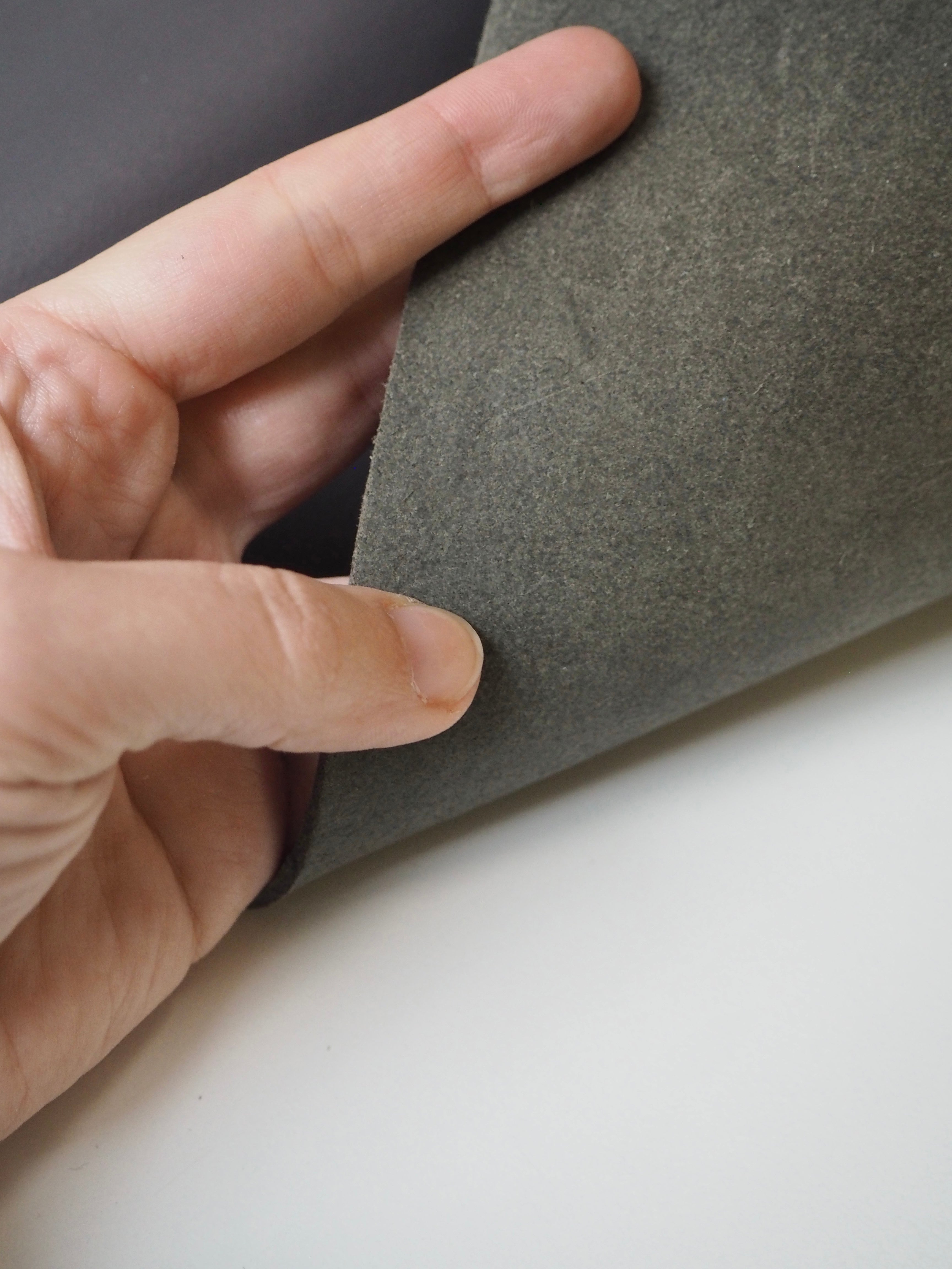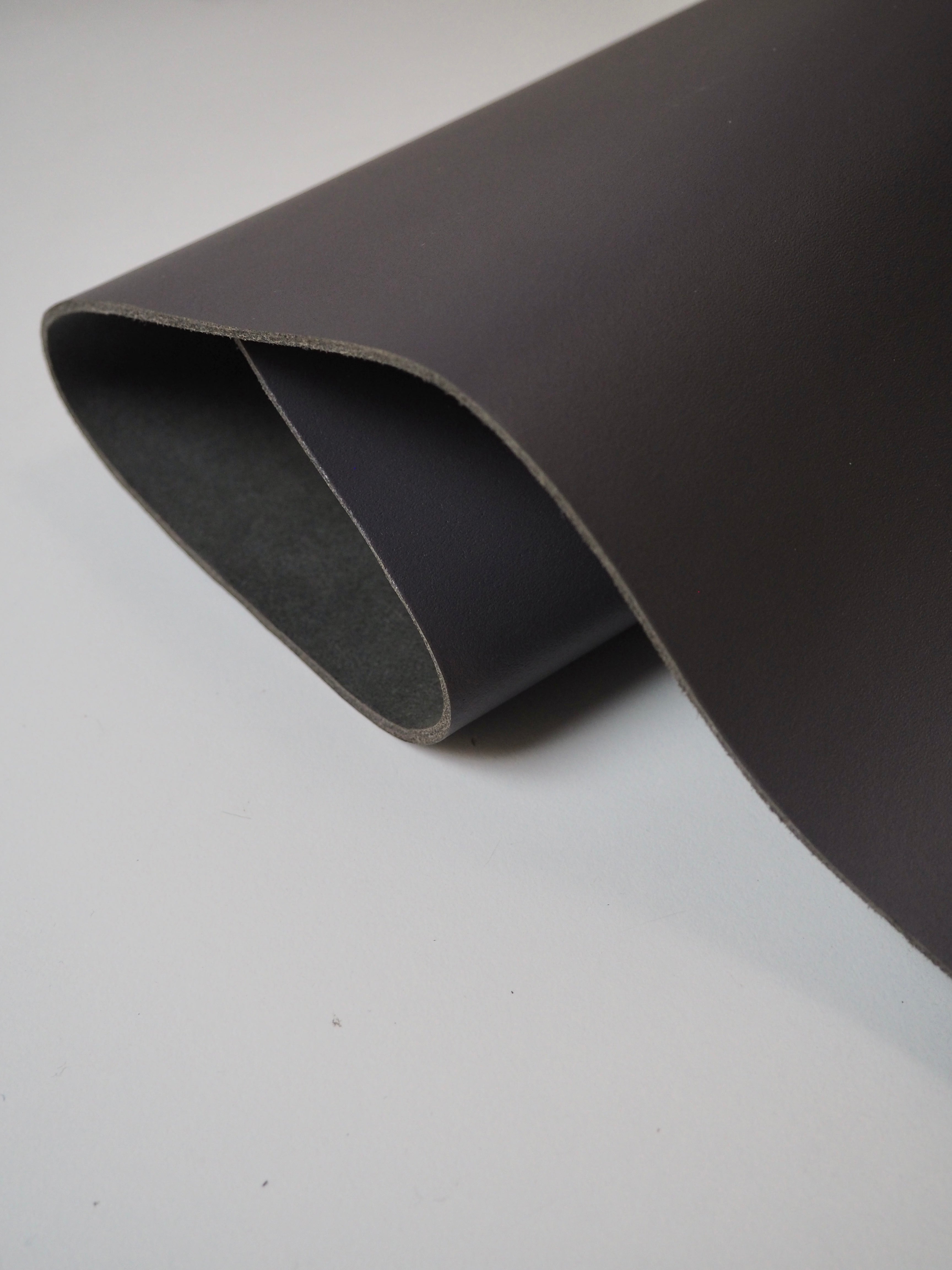 This ex-designer leather is a calfskin. It's a smooth leather with a light shine finish, a strong handle, and heavy weight. Has a great structure, in a medium grey colour. We would love to see this made up into accessories!