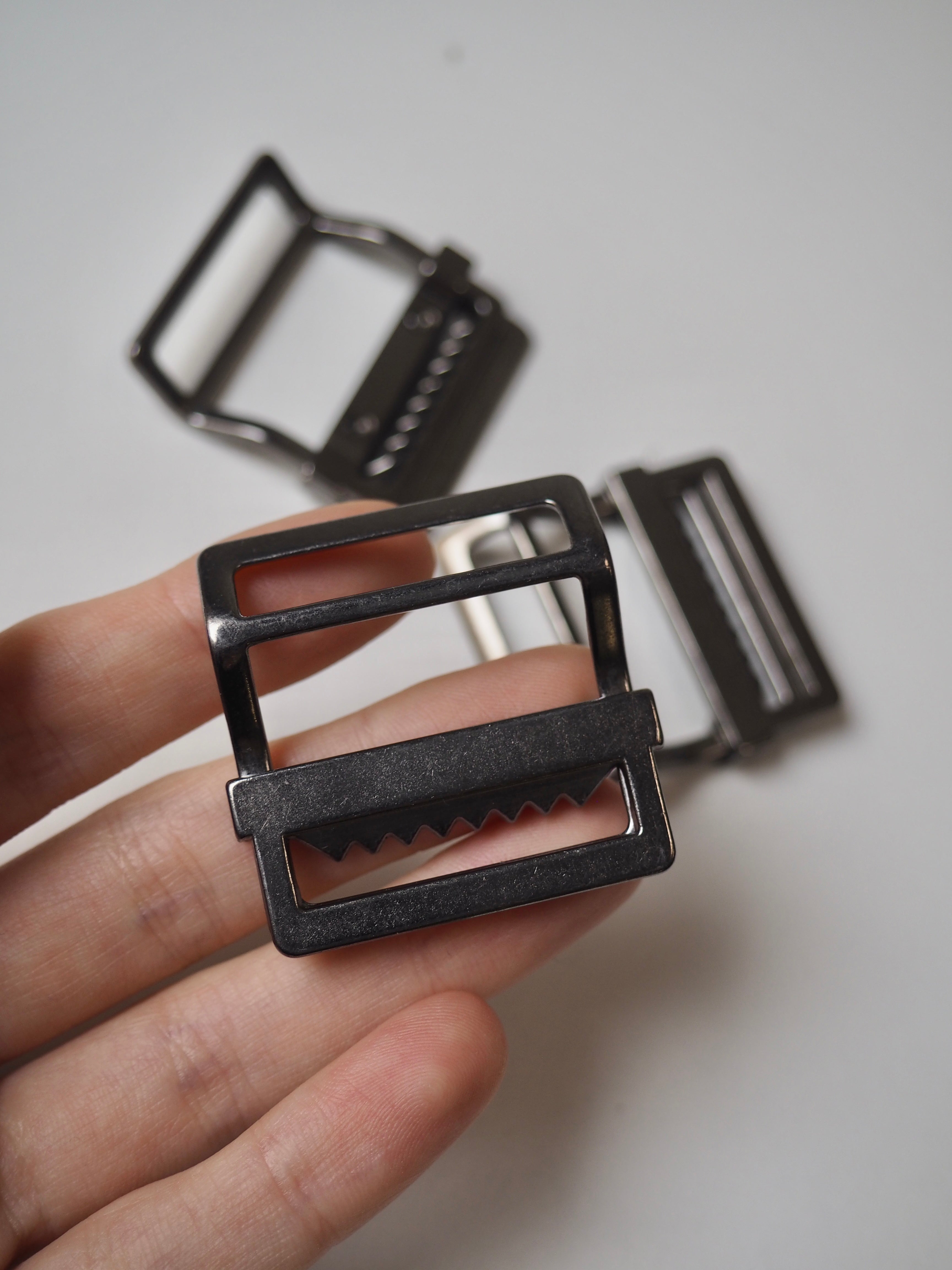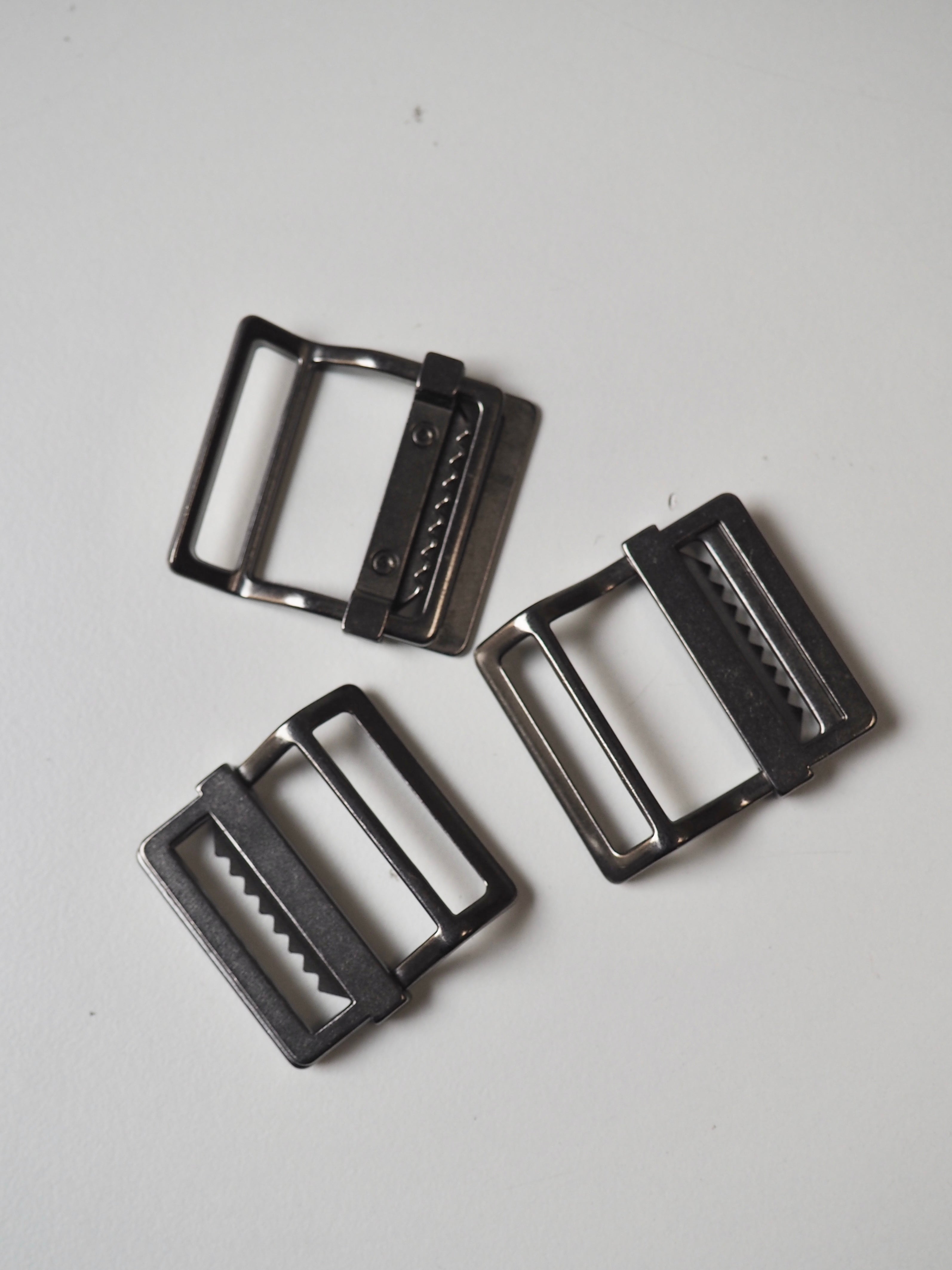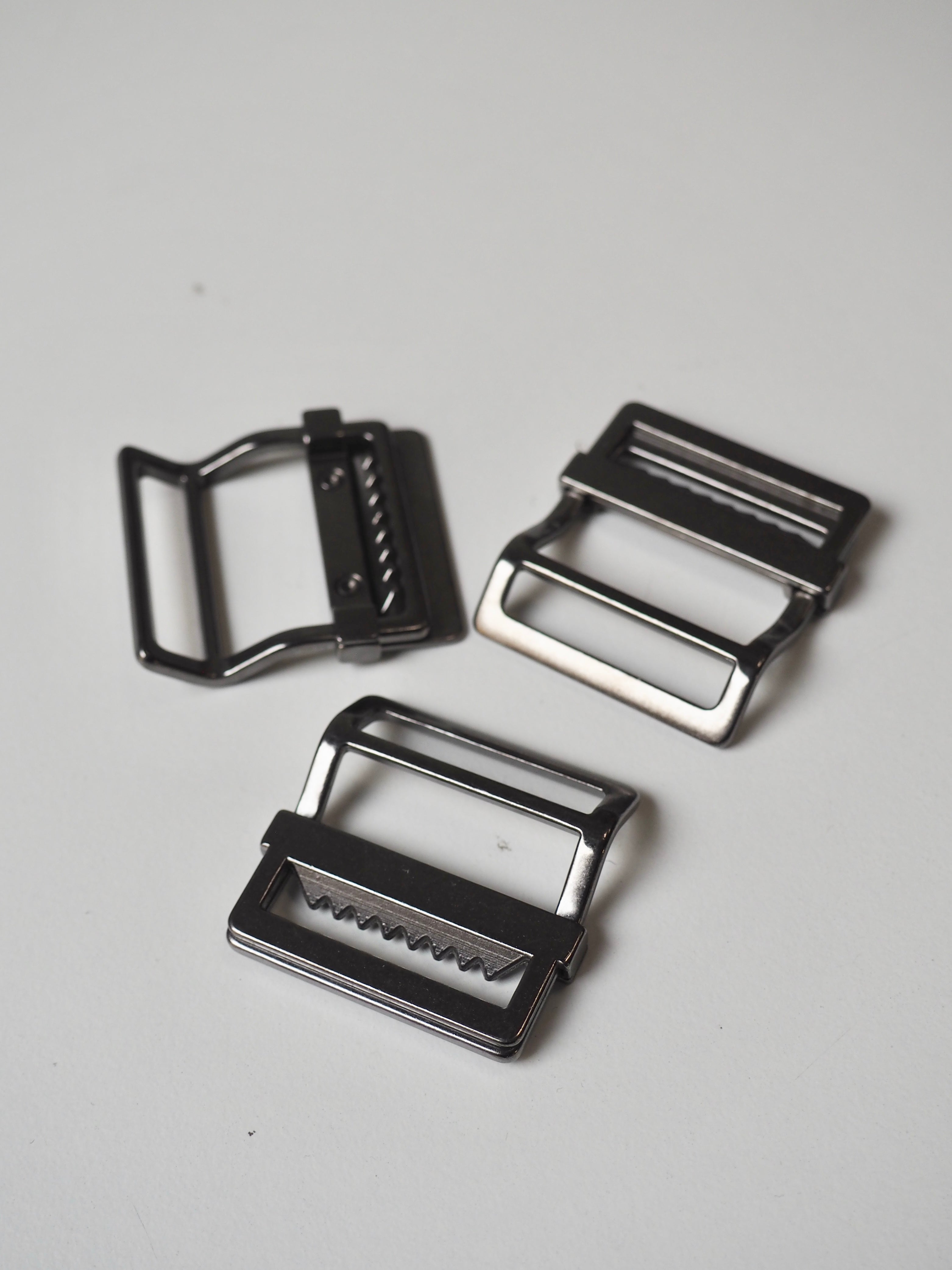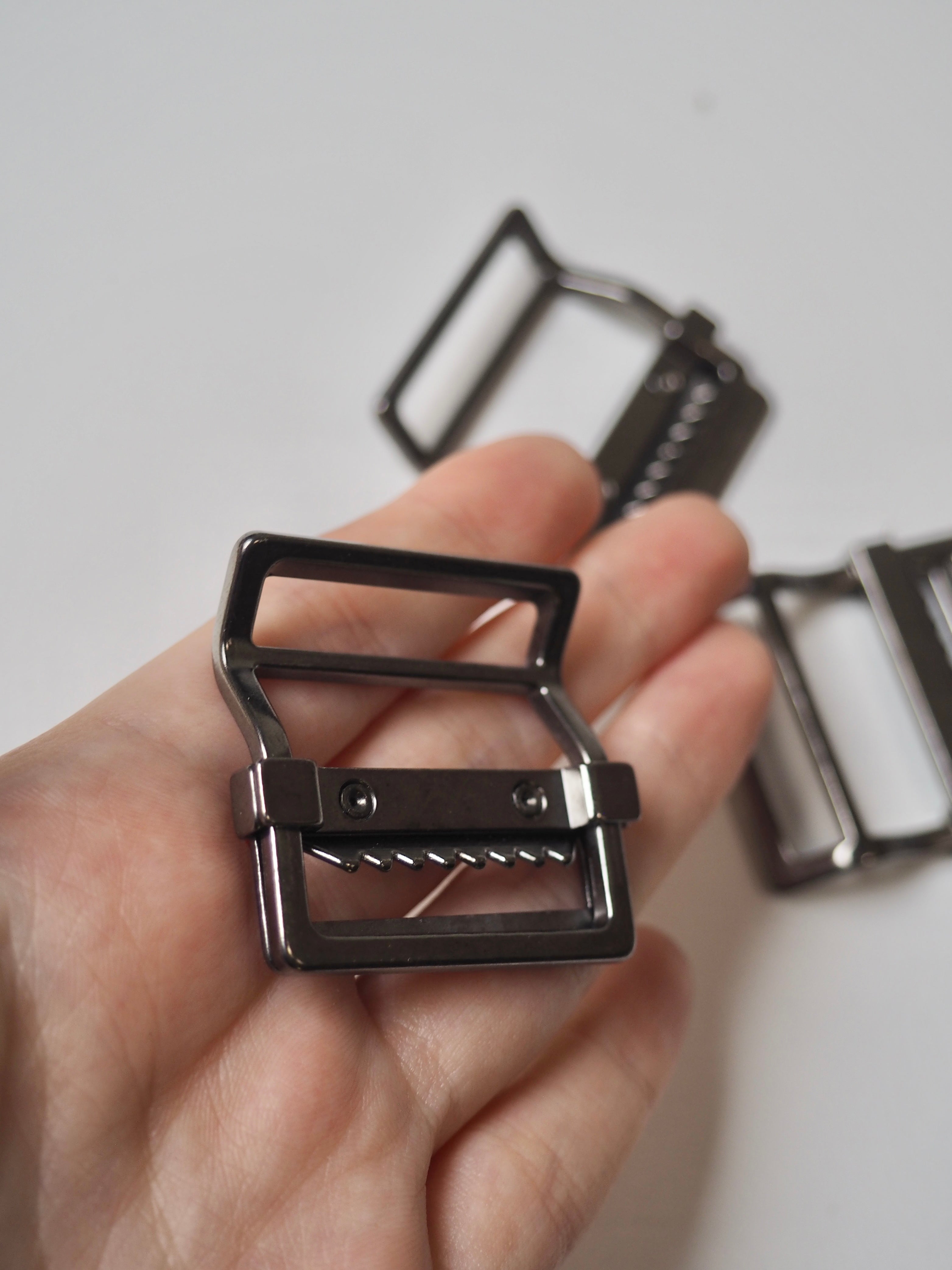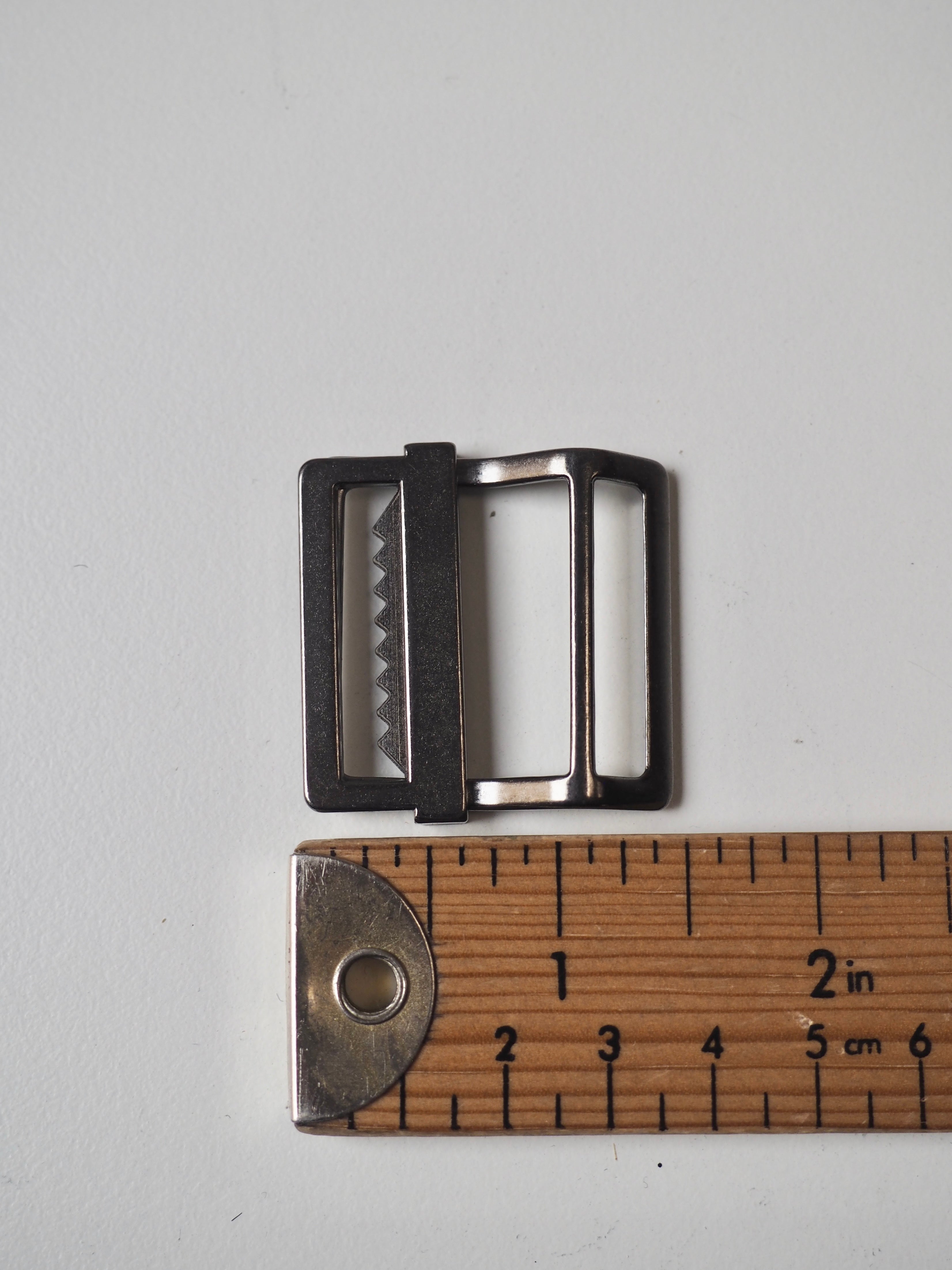 This ex-designer trim is a strap adjuster. It has an angled back and slider with teeth for weight and grip on a bag strap. One edge is engraved with a brand name and it has a shiny finish. Great for bag making and garment accessorizing!