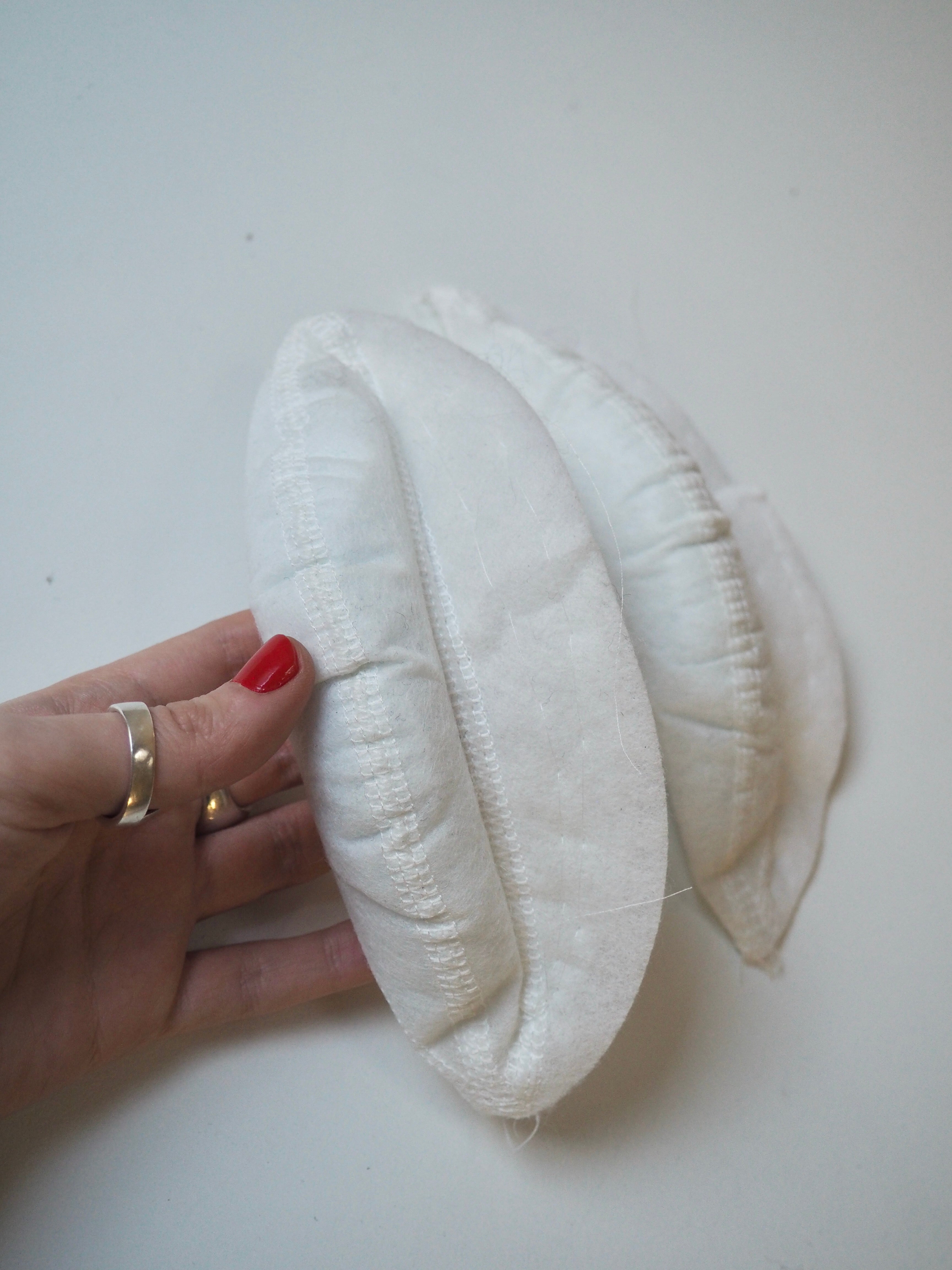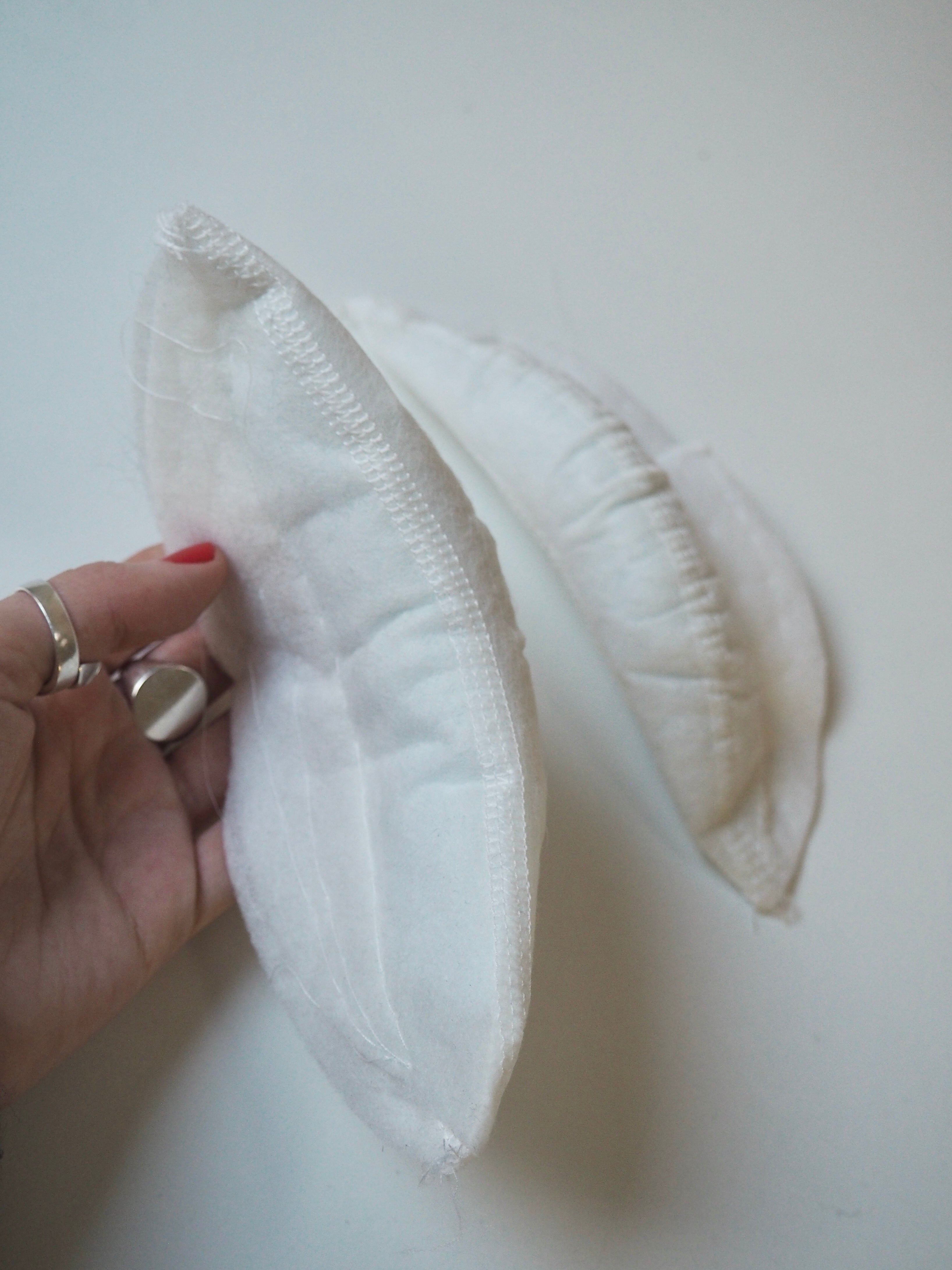 This ex-designer trim is a pair of shoulder pads. They are made up of two layers of structured felt basted together, the edge surrounds a tall curved dense piece of wadding. It is quite a rigid supportive structure and would be great for achieving a dramatic silhouette or adding extra puff to puffed sleeves.