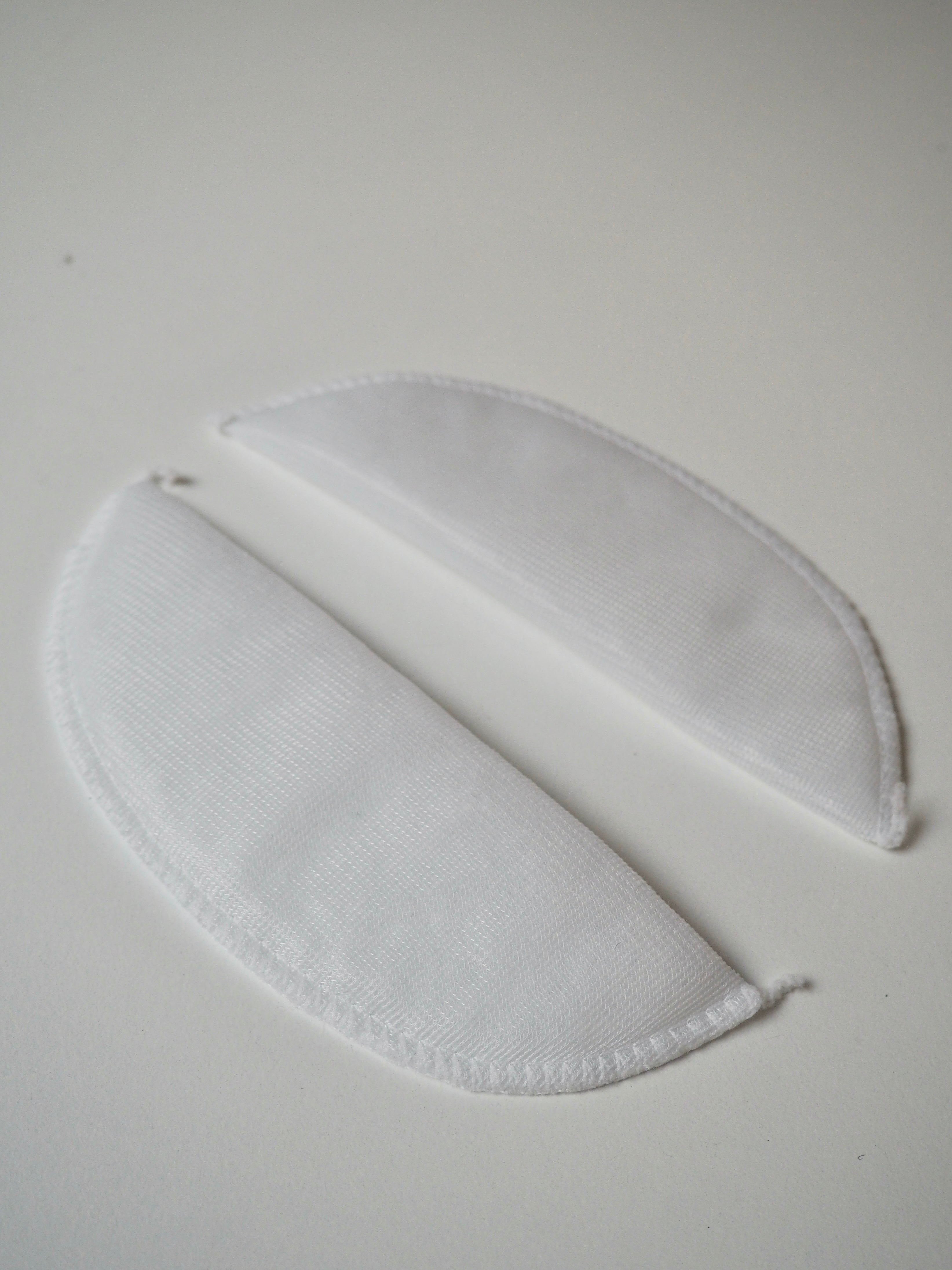 A narrow width dress shoulder pad with a light thickness perfect for more lightly structured garment. It is made up of a wadding inner covered with a thin, white mesh polyester fabric, overlocked together at the edge. Great for adding shaping to a tailored dress, light jacket or less structured coat.