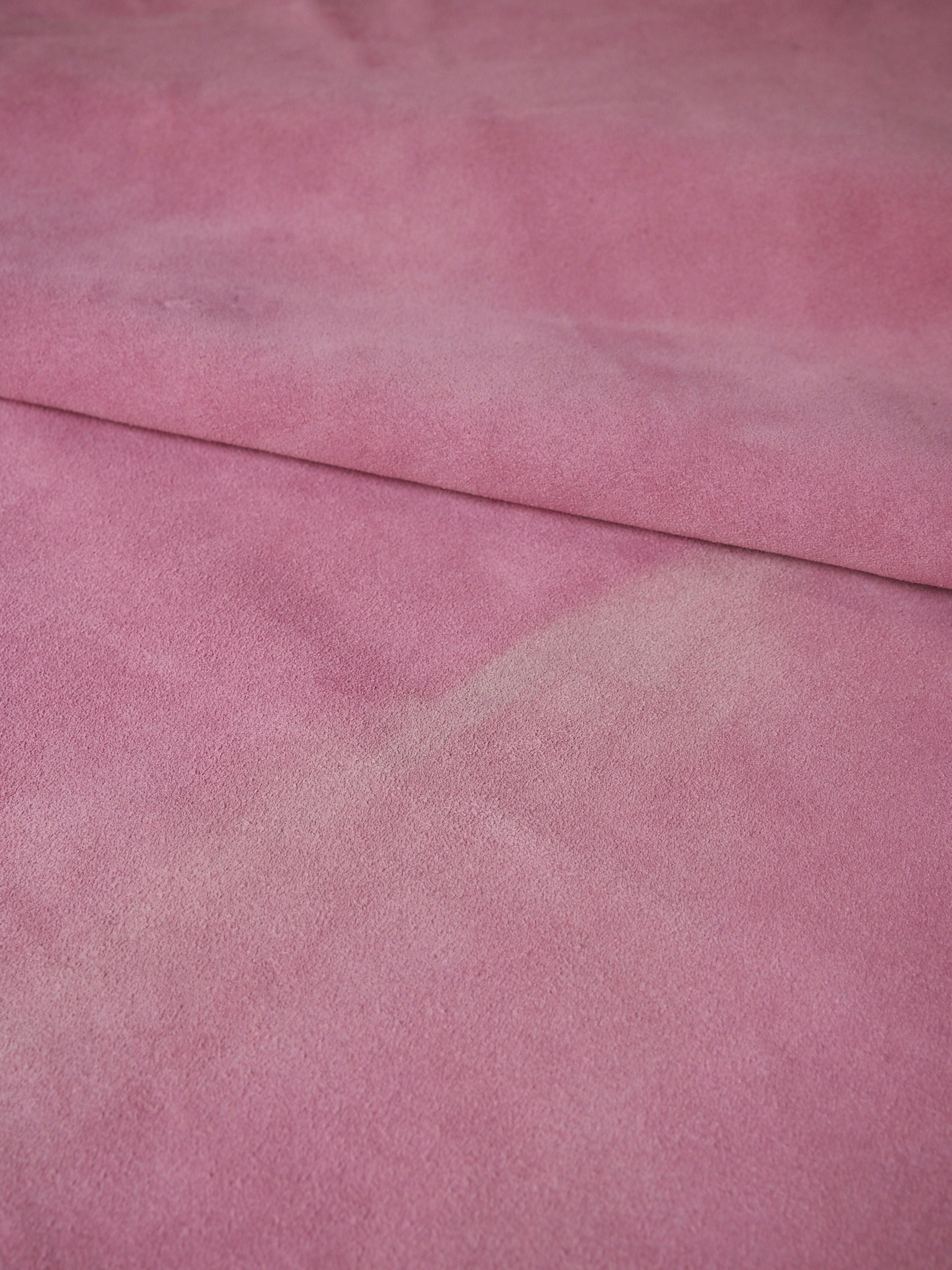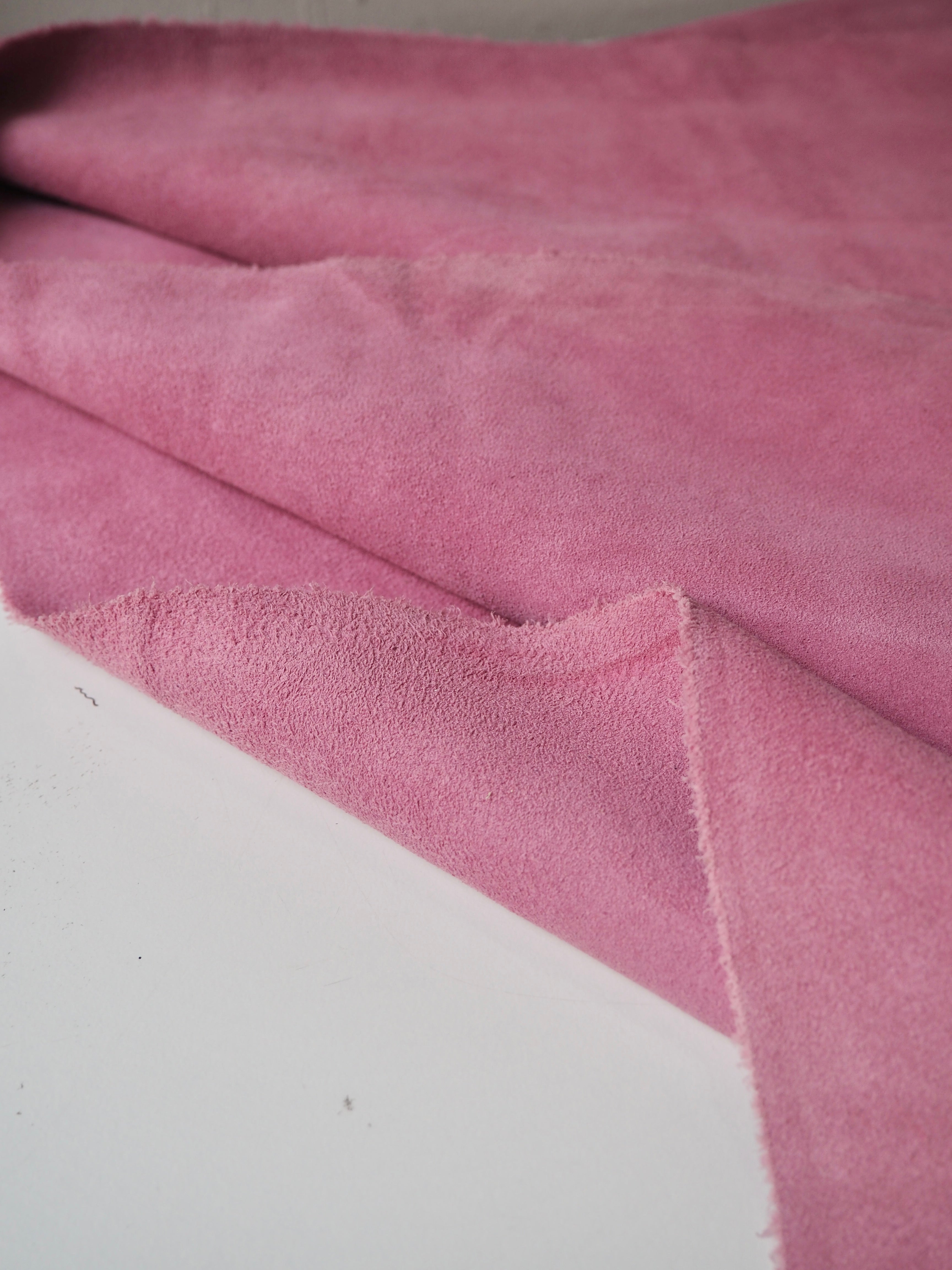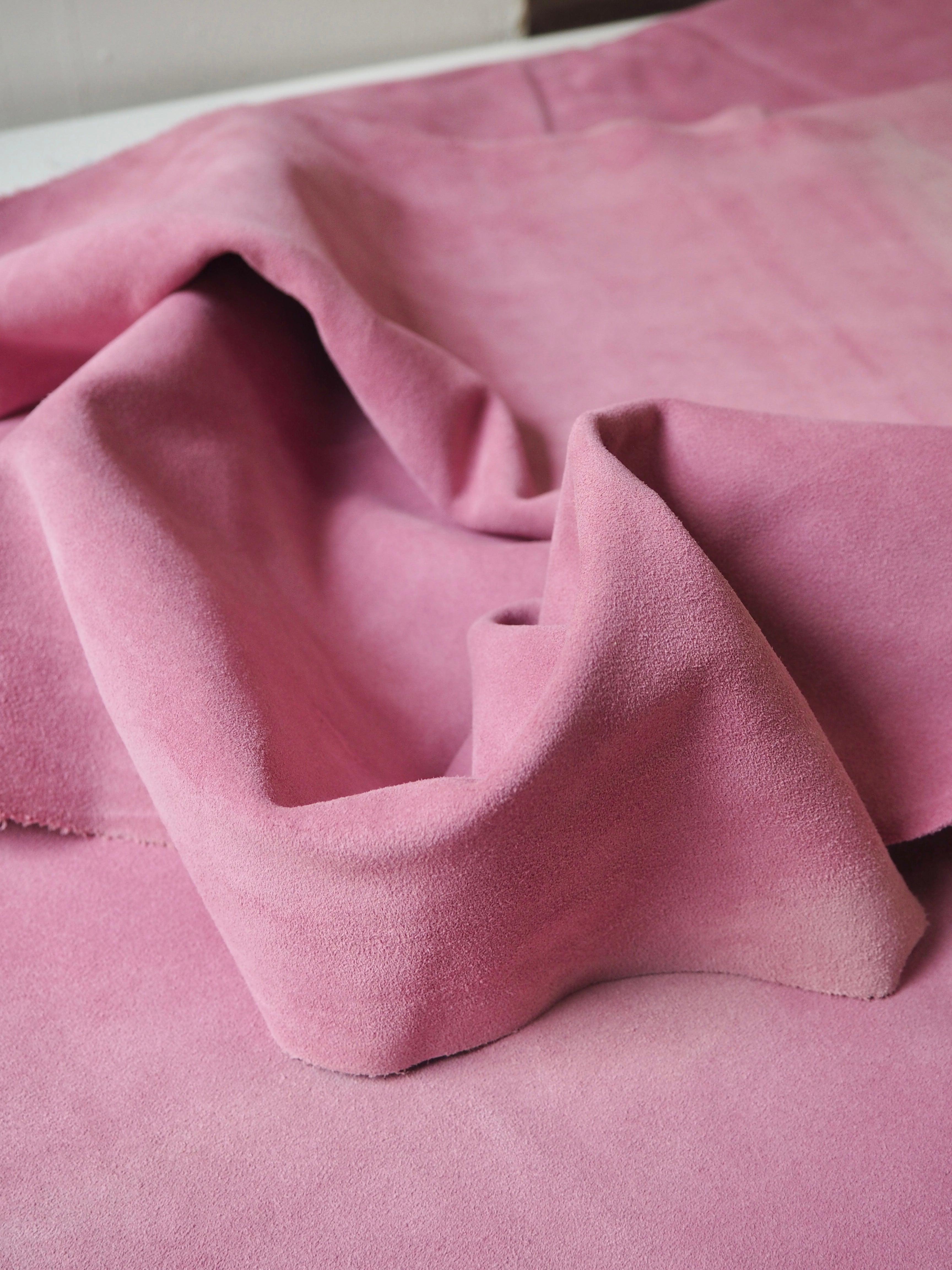 This ex-designer leather is a calfskin. It's a sueded finish, that is very soft and has a nice medium drape. It's light to medium weight. We would love to see this made up into a bag or purse! This leather has some marks outside the measured area.