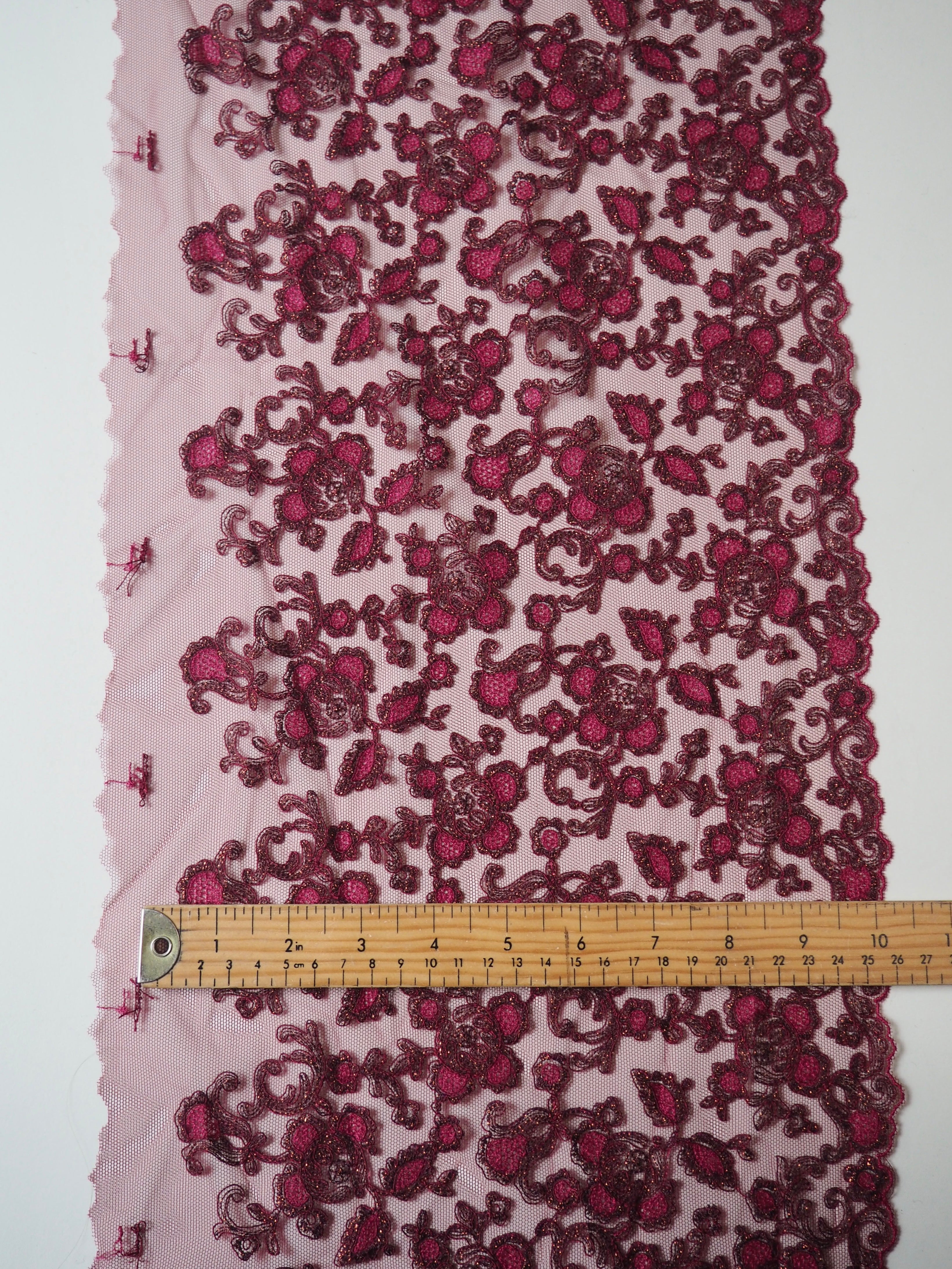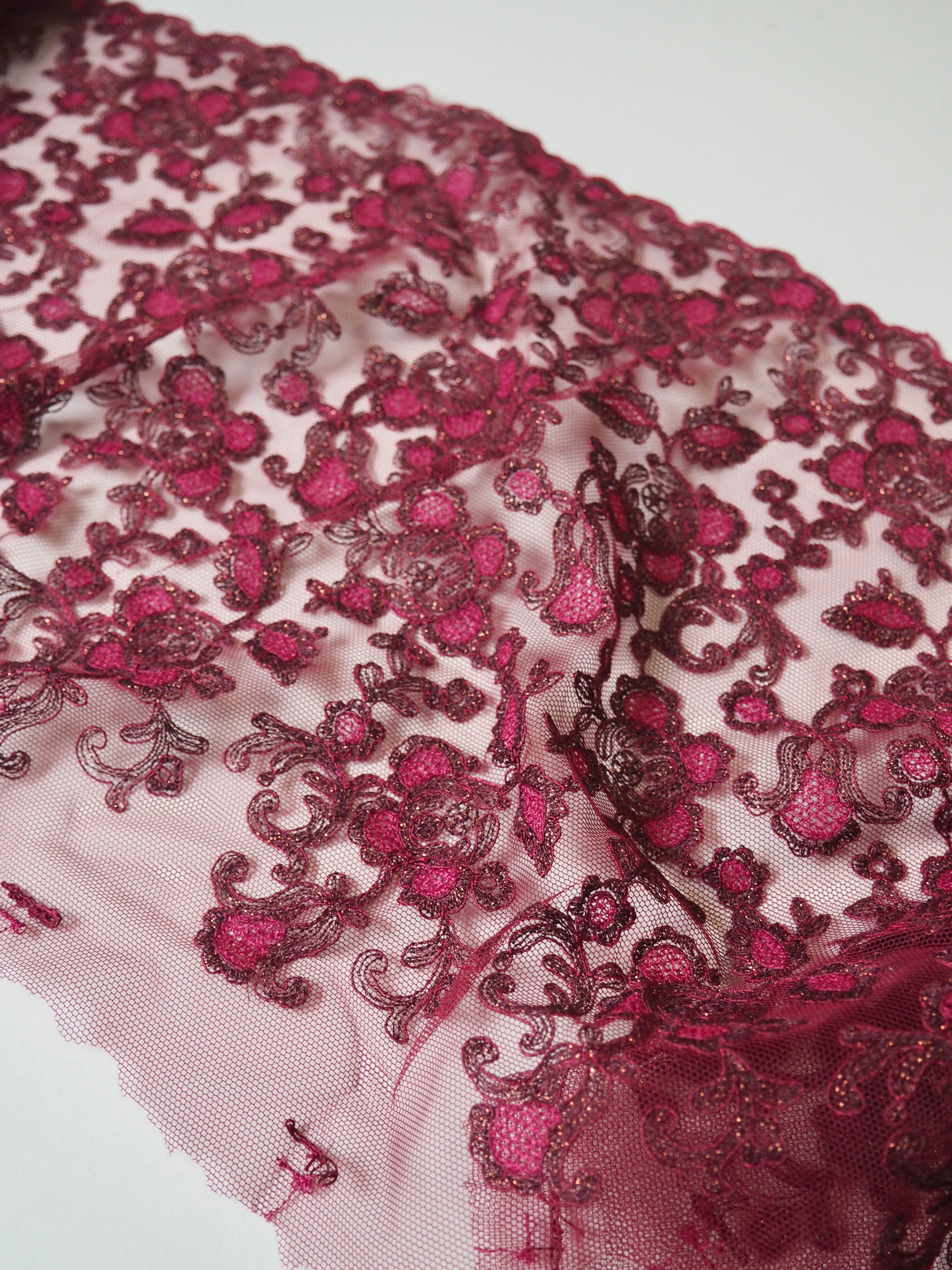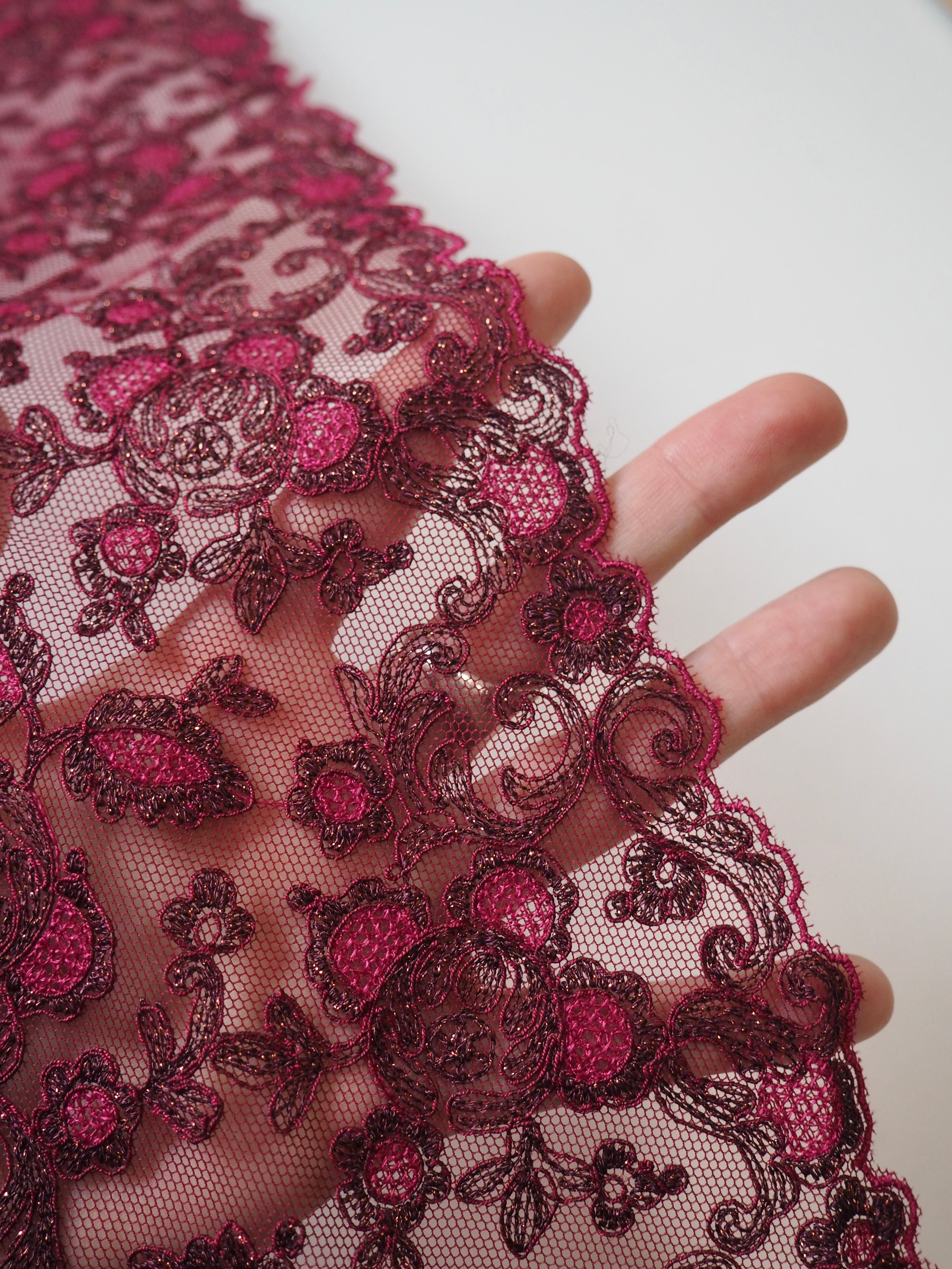 This ex-designer lace trim is a wide scallop edge lace with copper lurex thread detailing on a burgundy soft soft tulle backing. Perfect for lingerie making or would look gorgeous applied to a bodice or used on another garment or accessory.