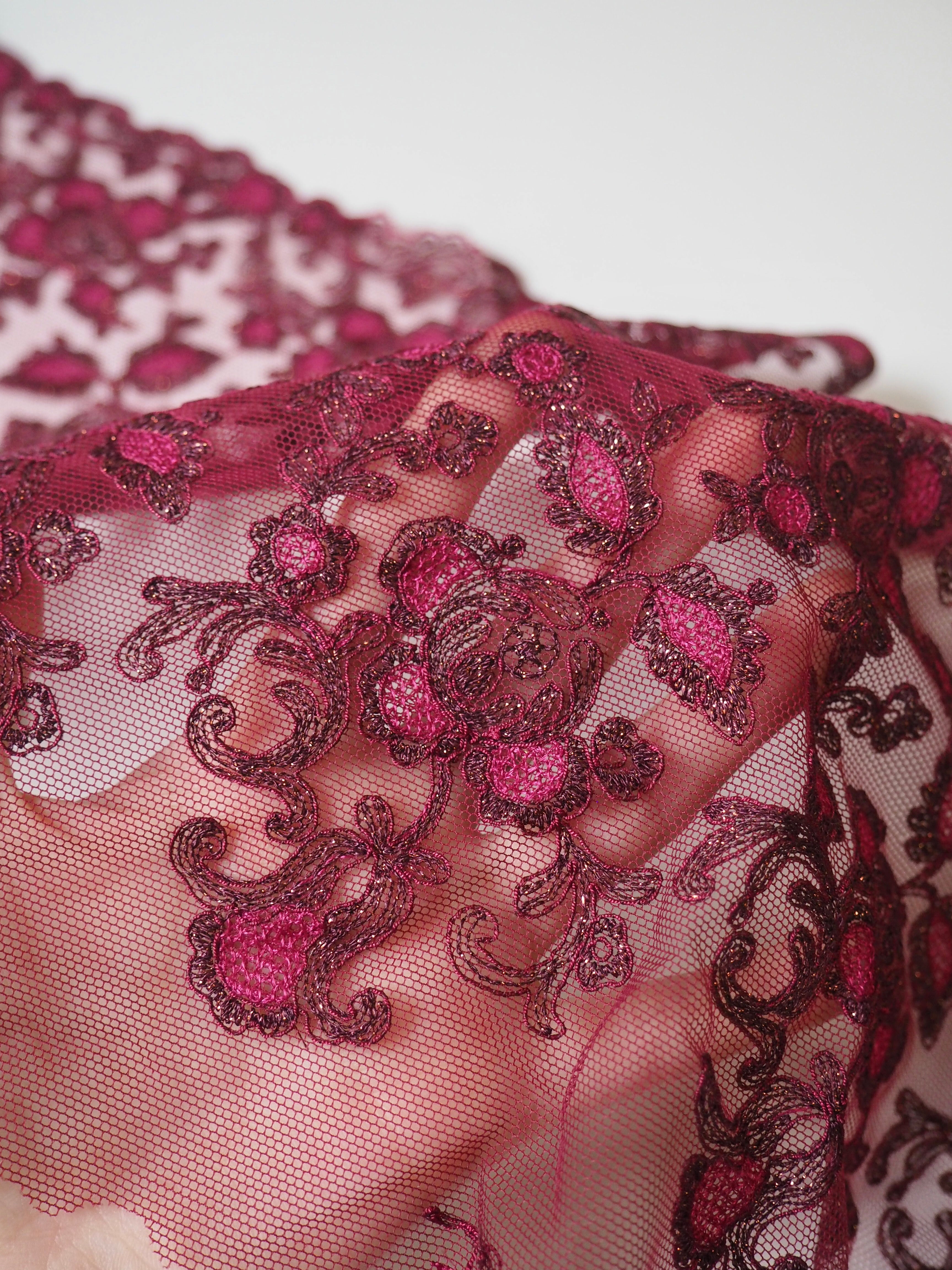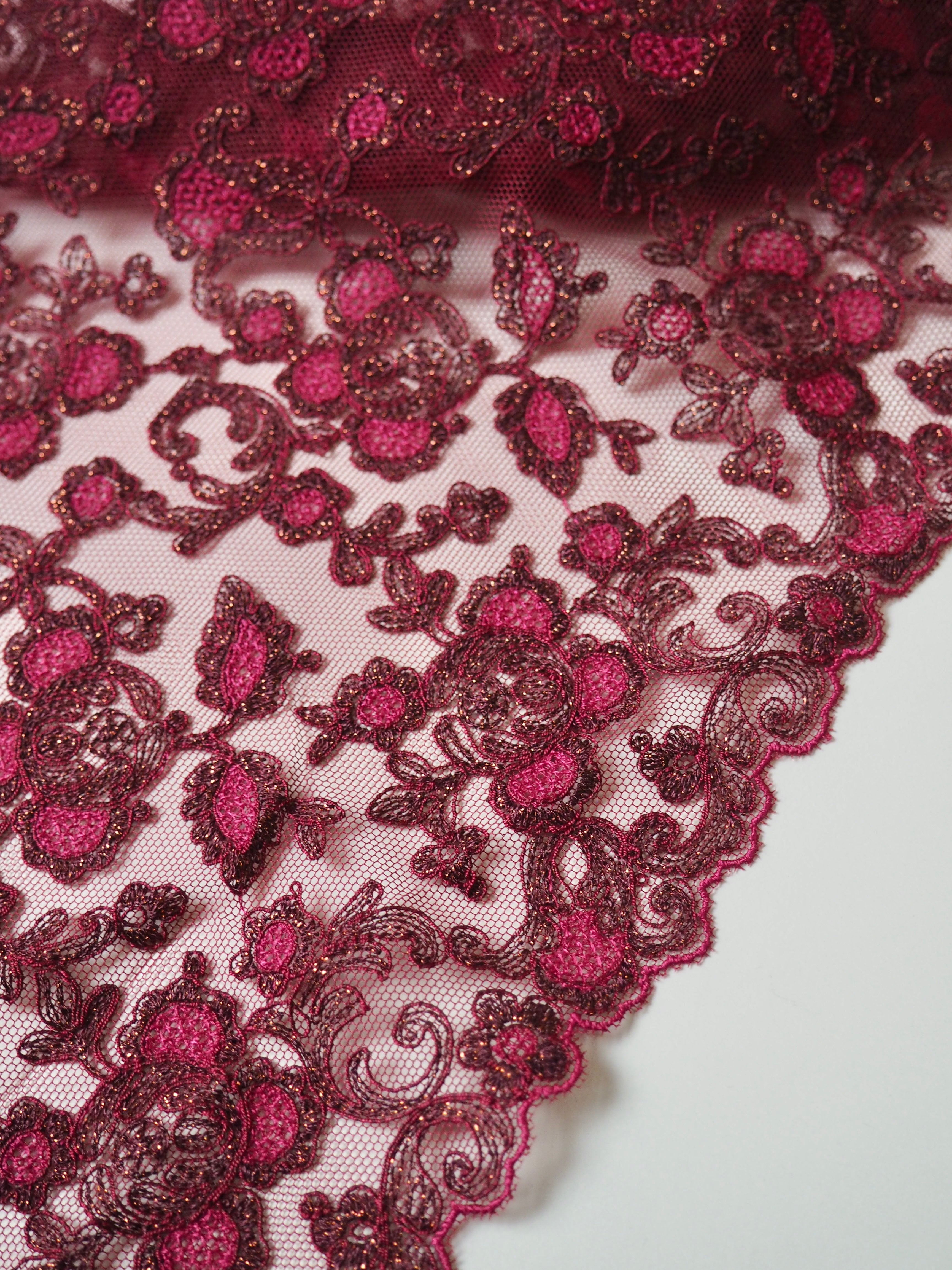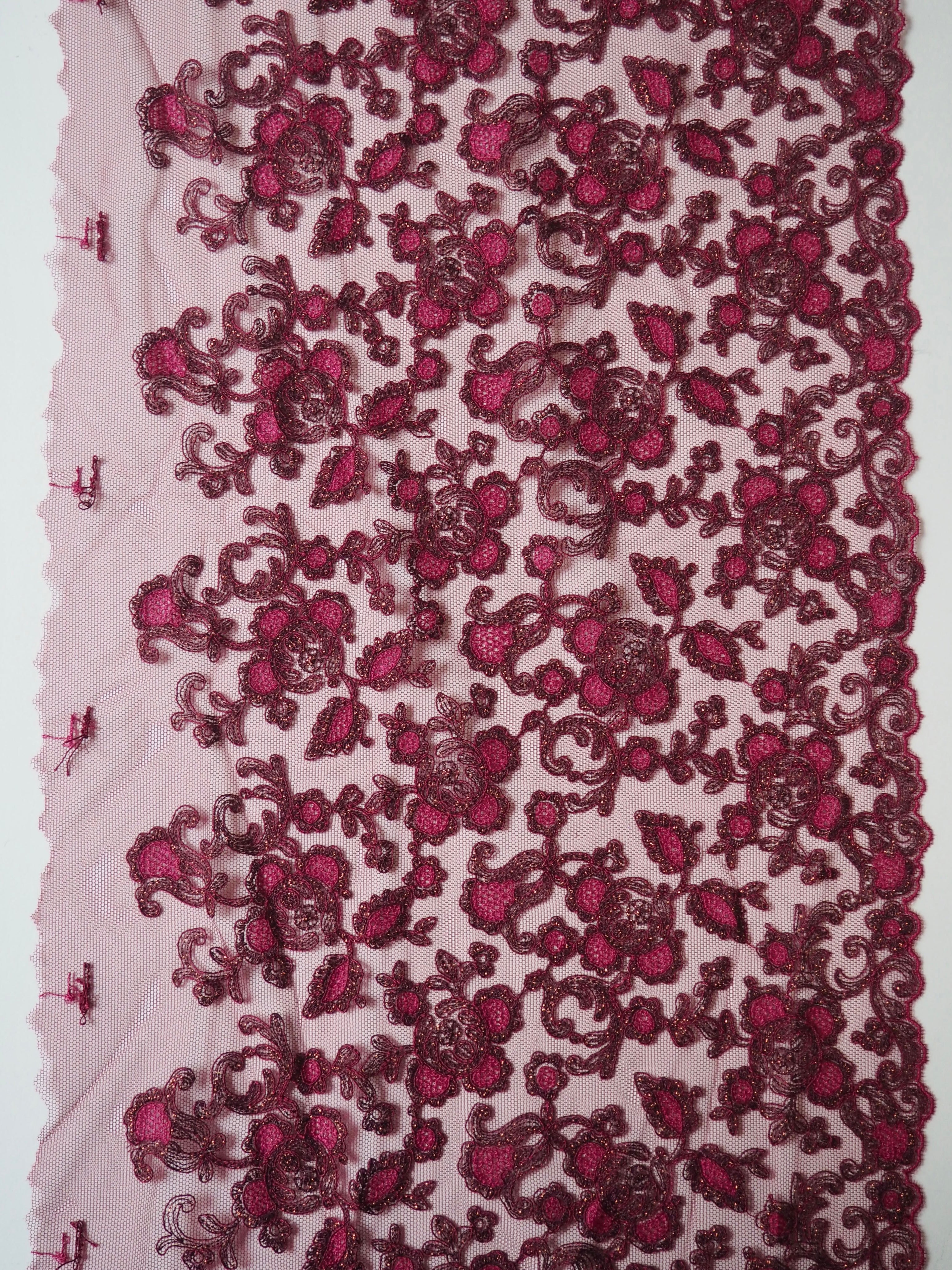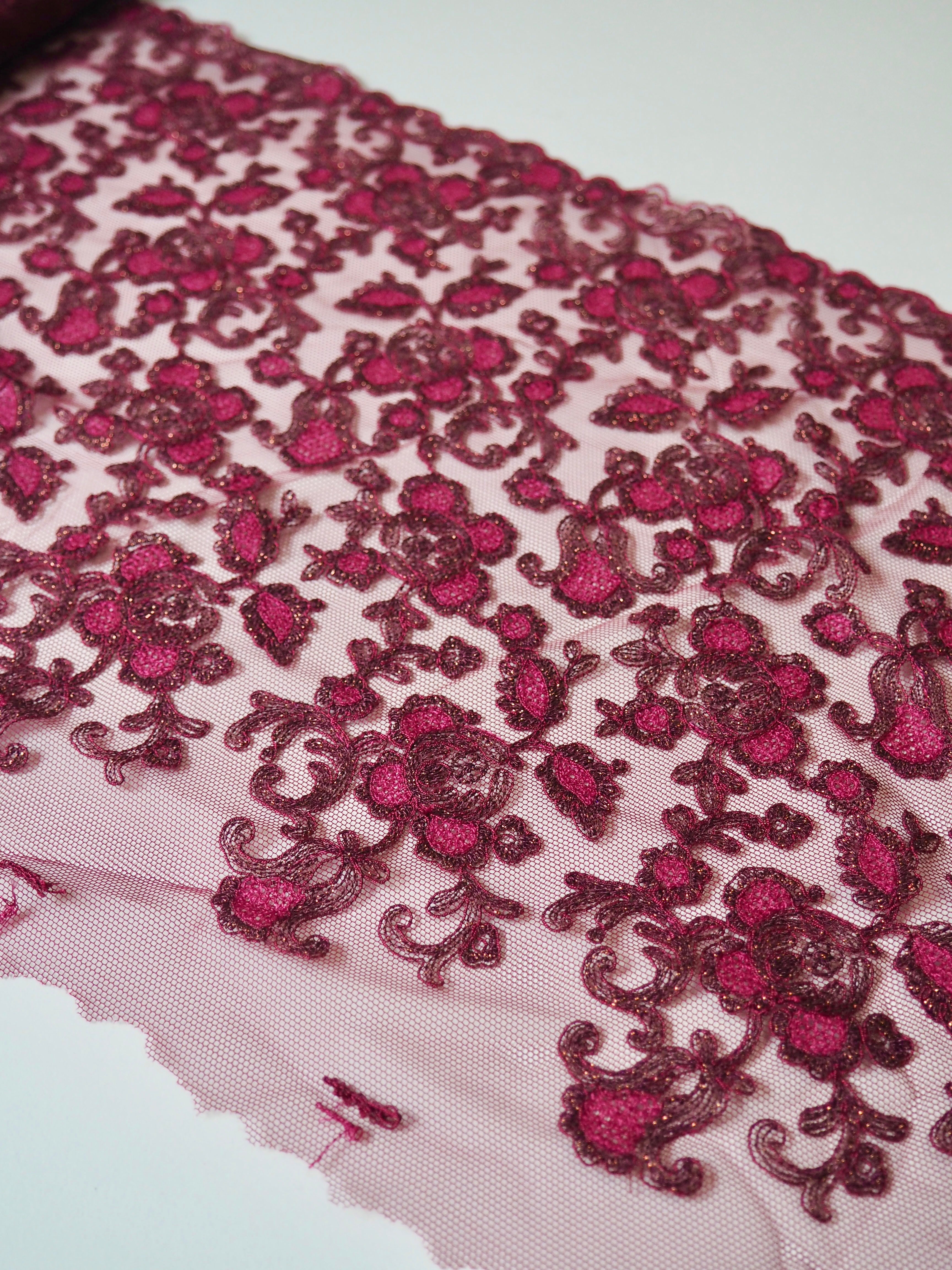 This ex-designer lace trim is a wide scallop edge lace with copper lurex thread detailing on a burgundy soft soft tulle backing. Perfect for lingerie making or would look gorgeous applied to a bodice or used on another garment or accessory.