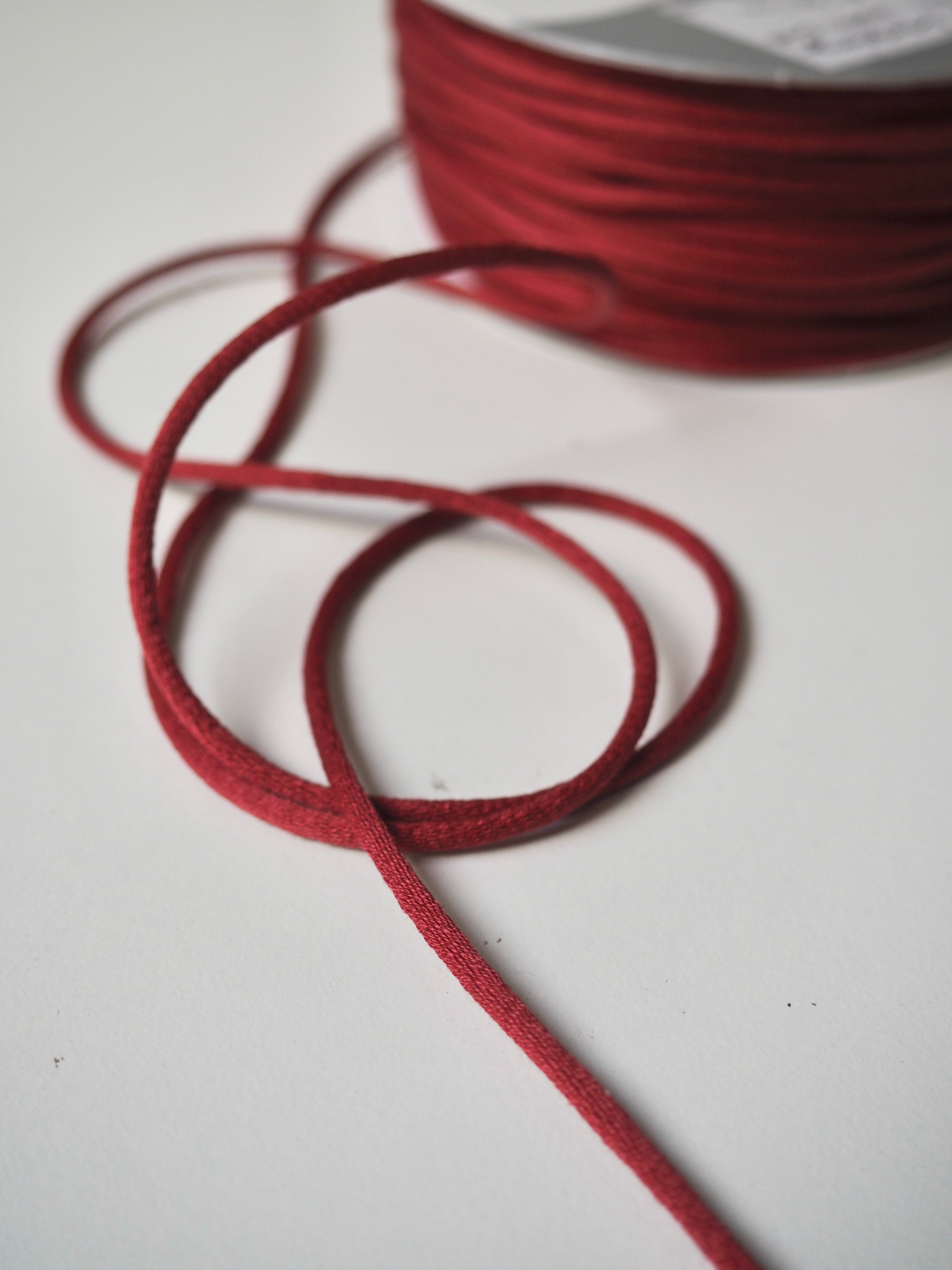 This ex-designer trim is a basic cotton sateen rattail cord. It comes from Shindo, a well-known and well made Japanese trim company. Thin and round with a sateen finish. It works for fashion, craft, and furnishing projects alike.