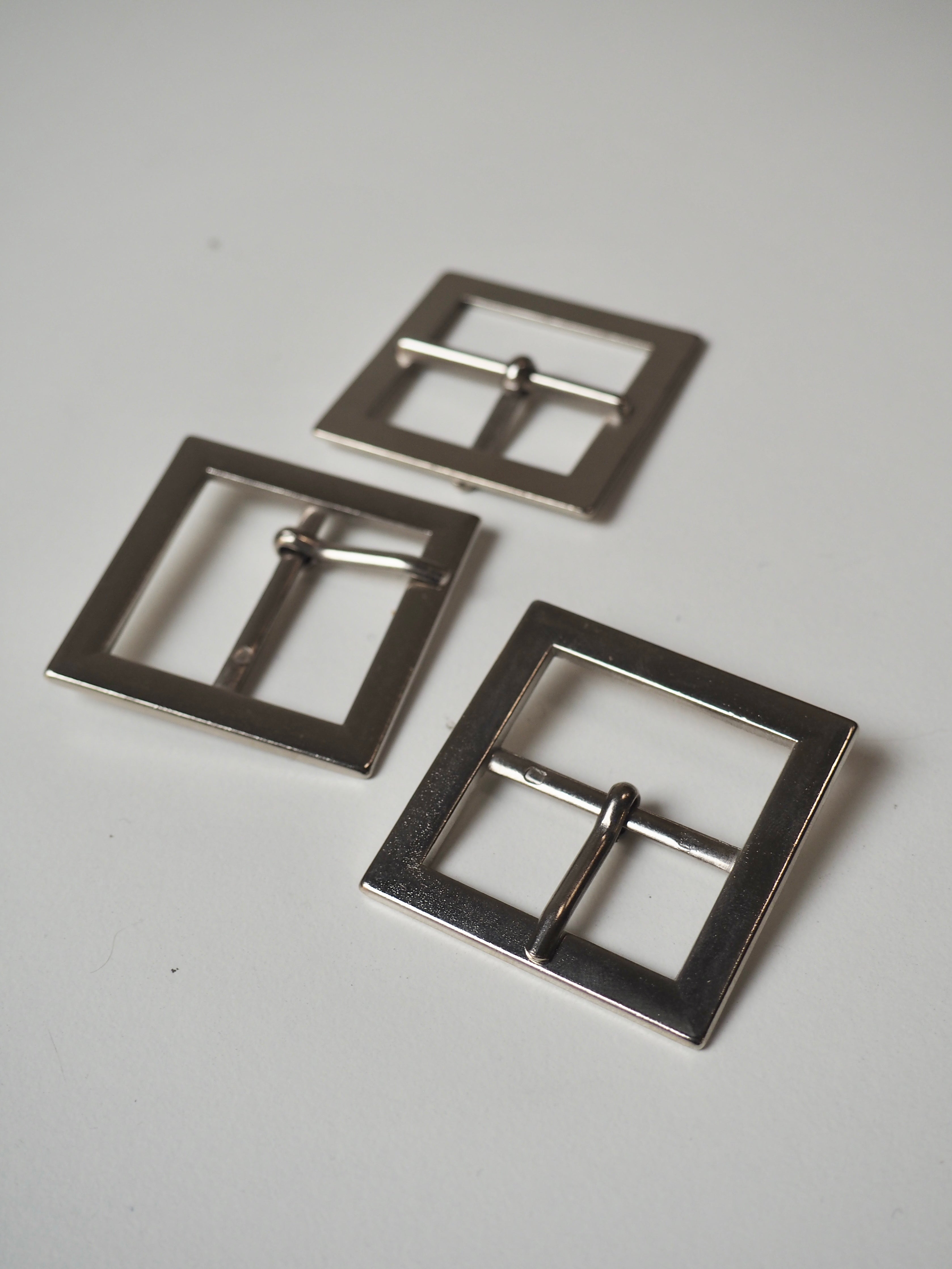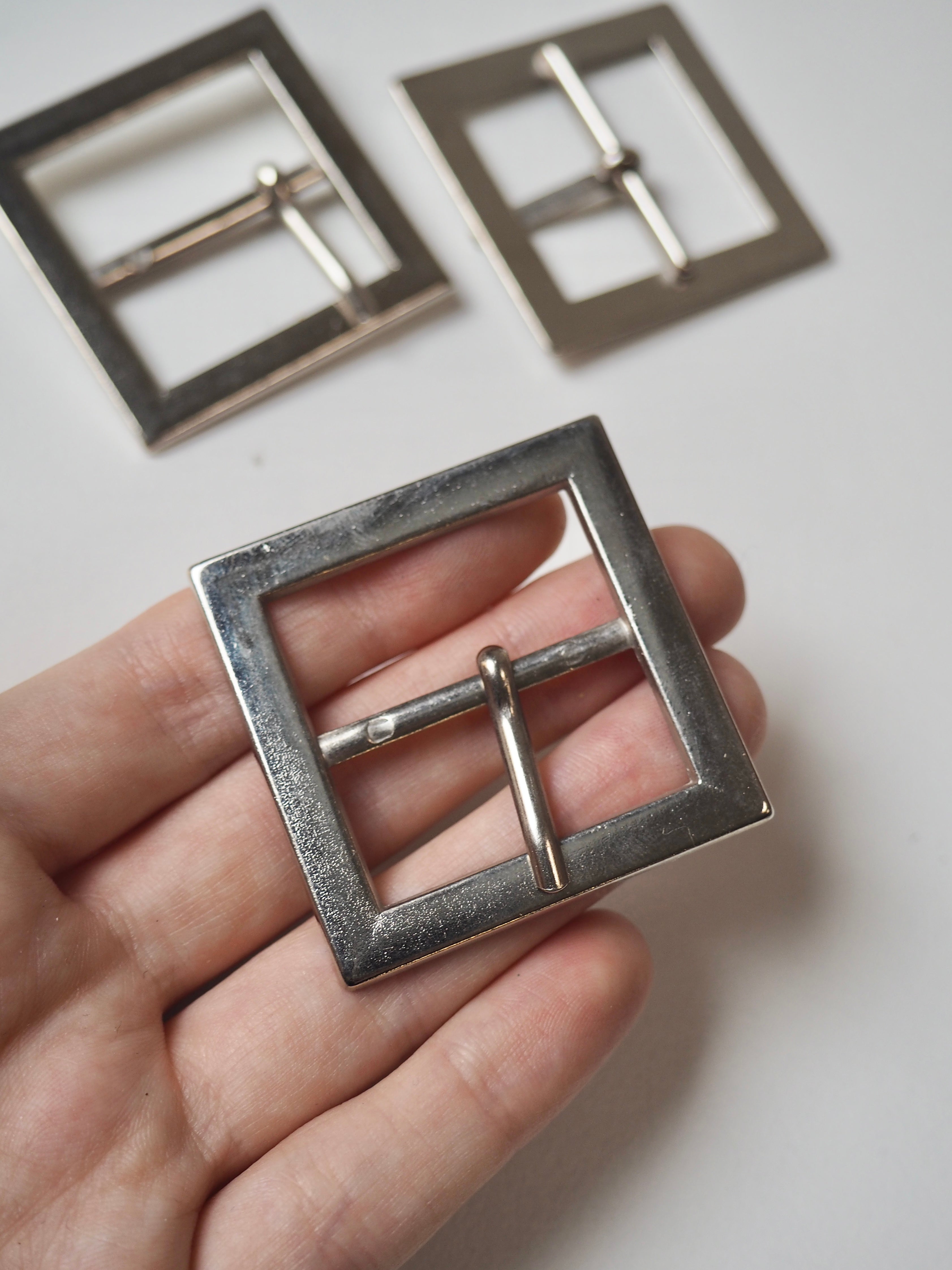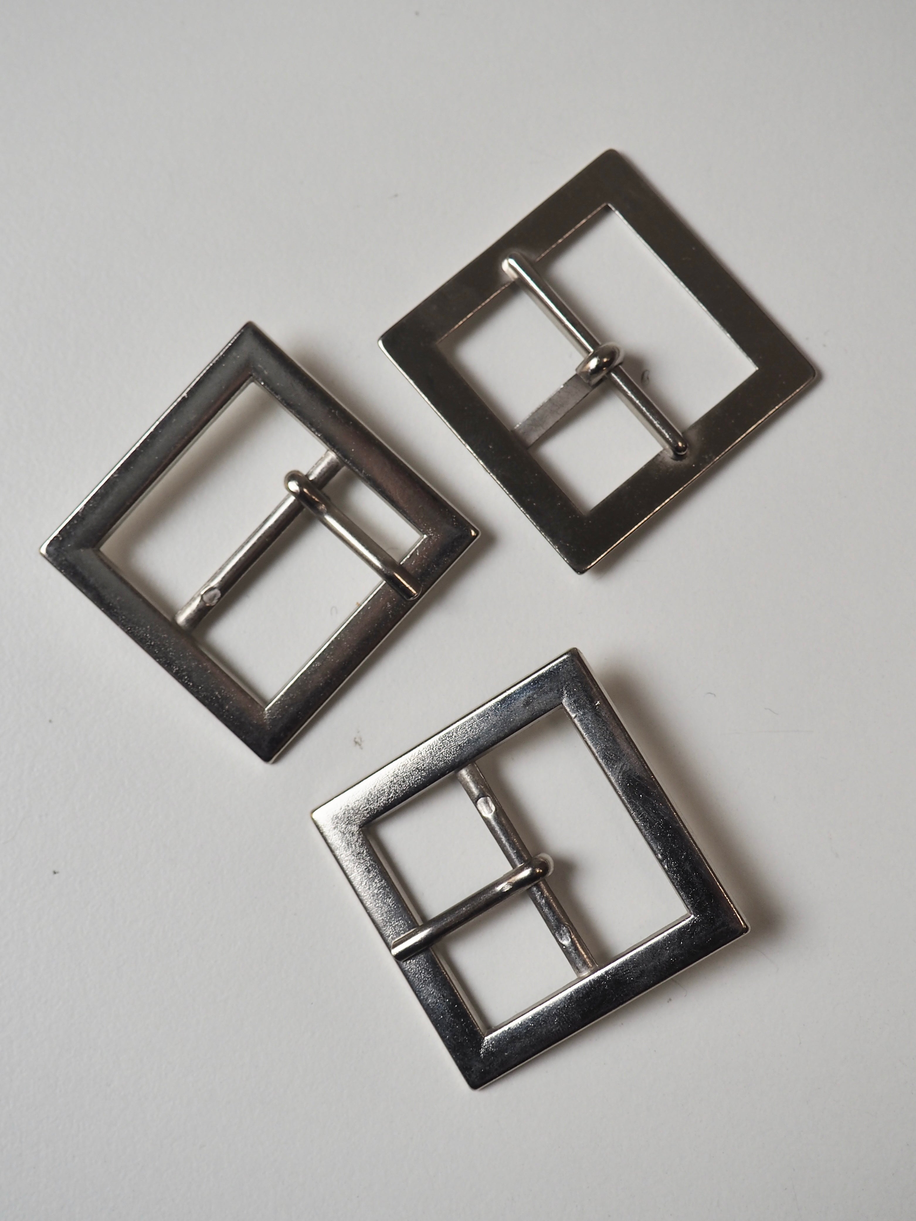 This ex-designer hardware is a buckle. They are perfect for adding to garments or accessories. They have a sliding prong on the central bar and are medium weight and have a slightly shiny finish.