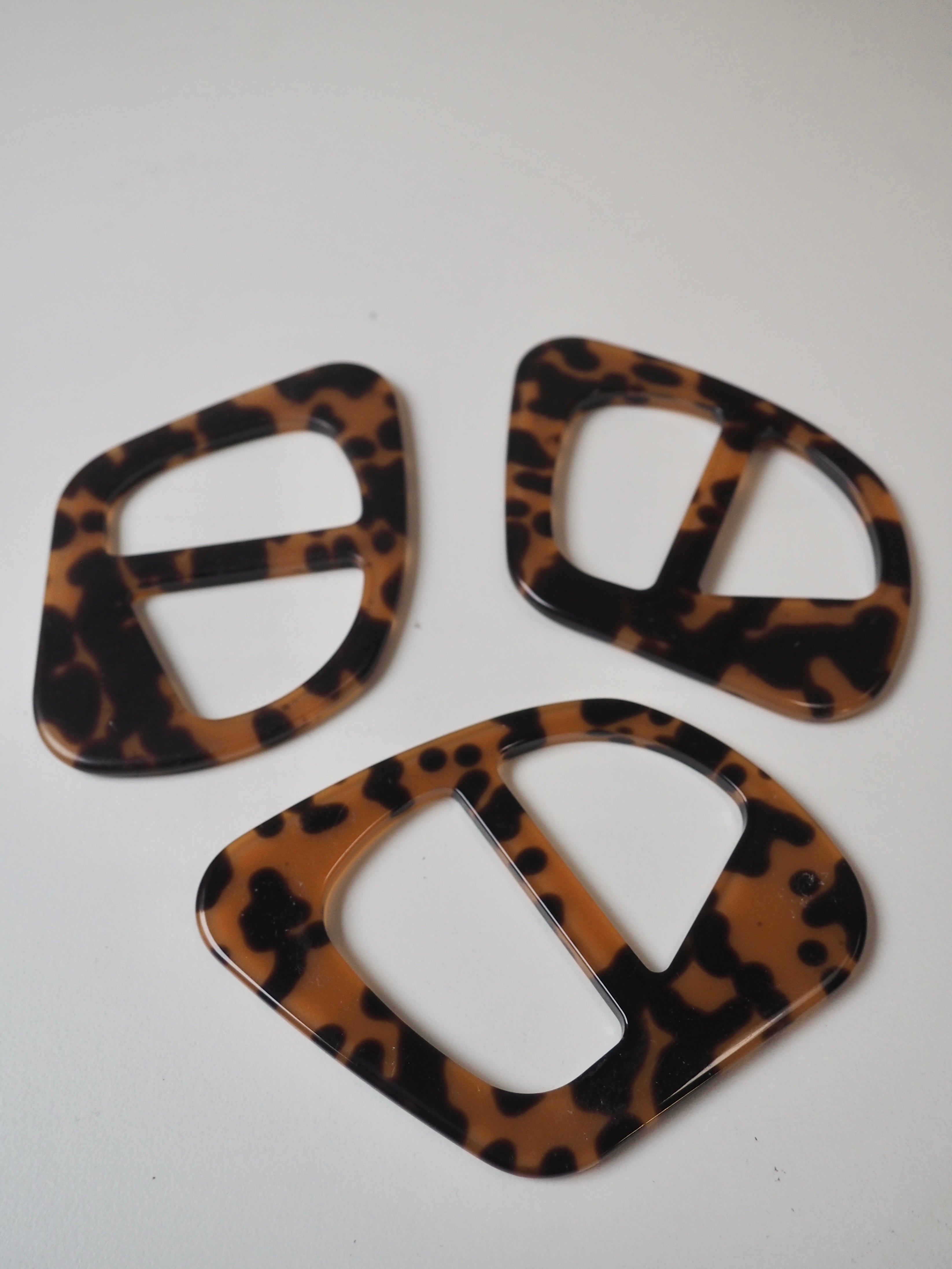 This deadstock trim is a plastic buckle, perfect for adding a special detail to garments! They could be used for coats, dresses, jumpsuits, bags, belts - they're perfect for adding an extra detail to your me-mades. They are a tortoise shell pattern and a lovely organic asymmetrical shape. No needle, so only works as a slider style buckle.