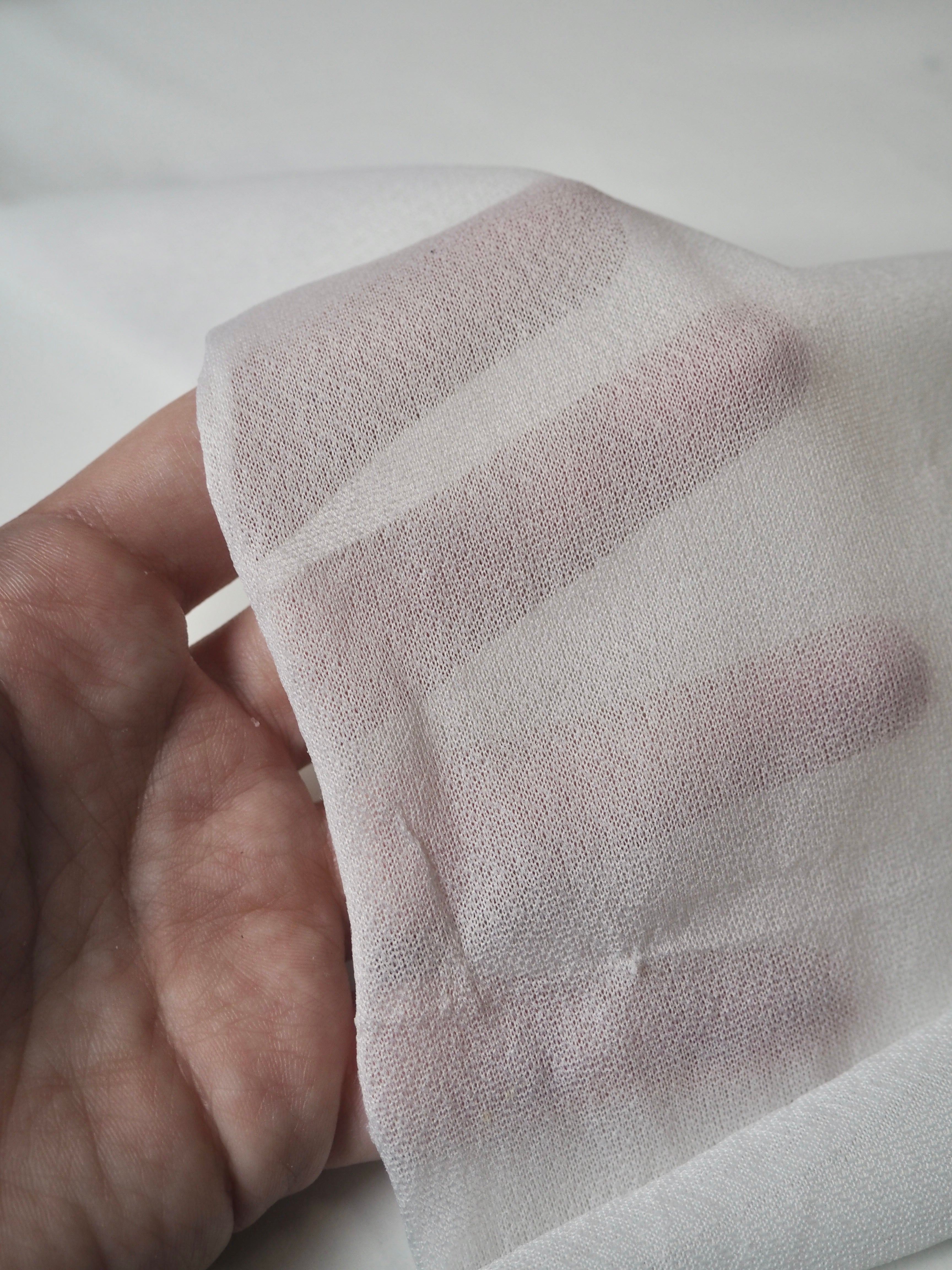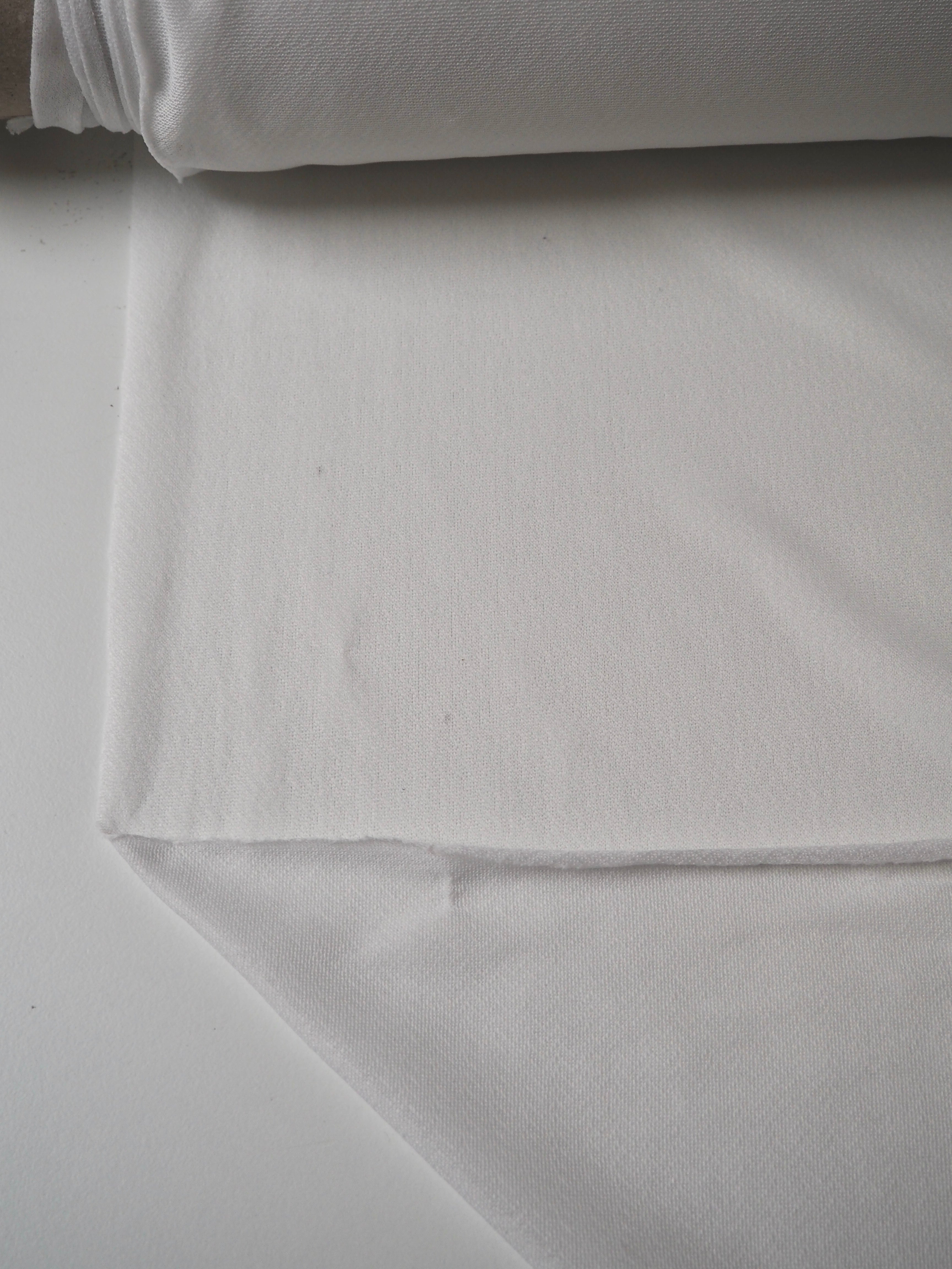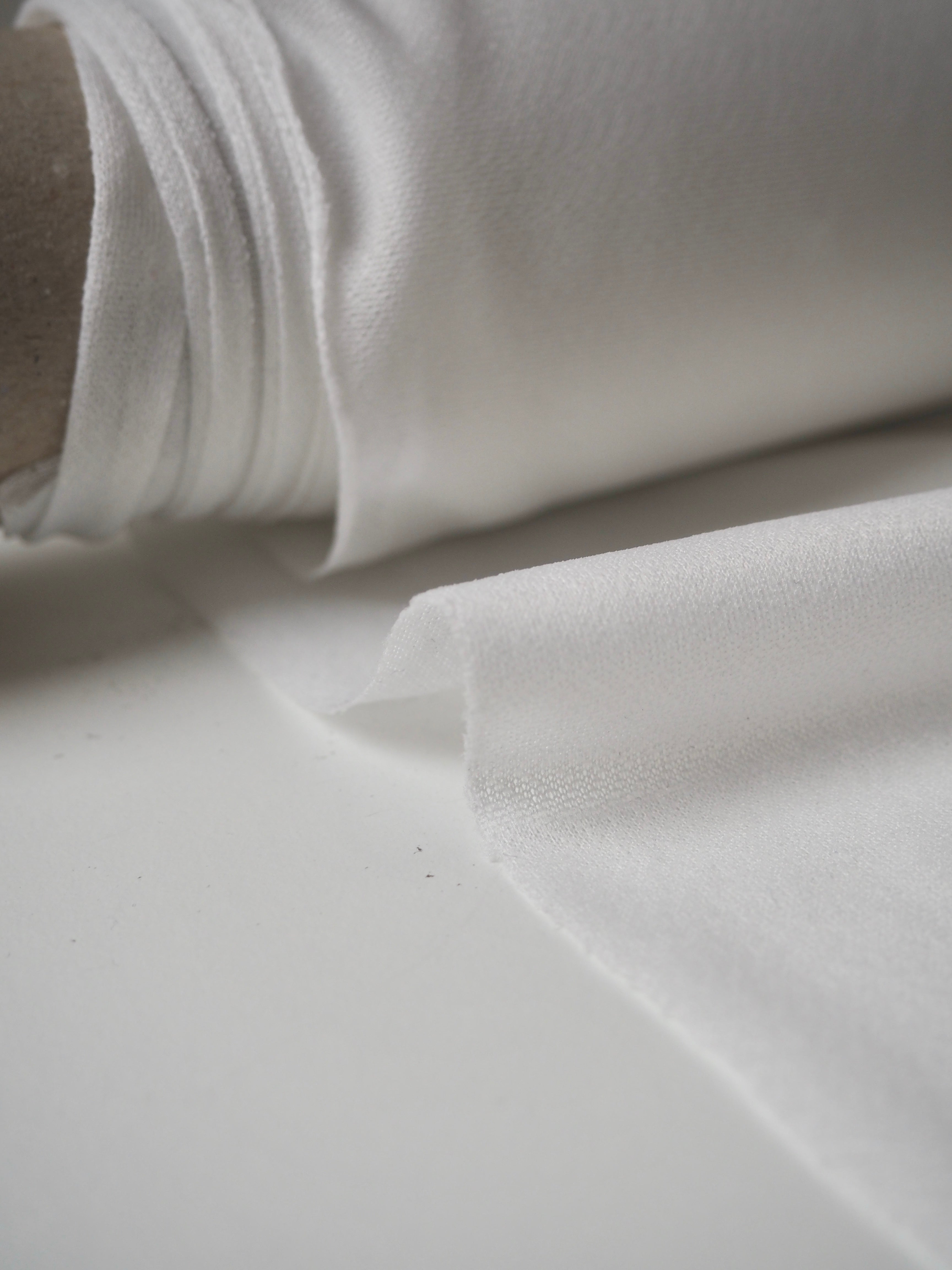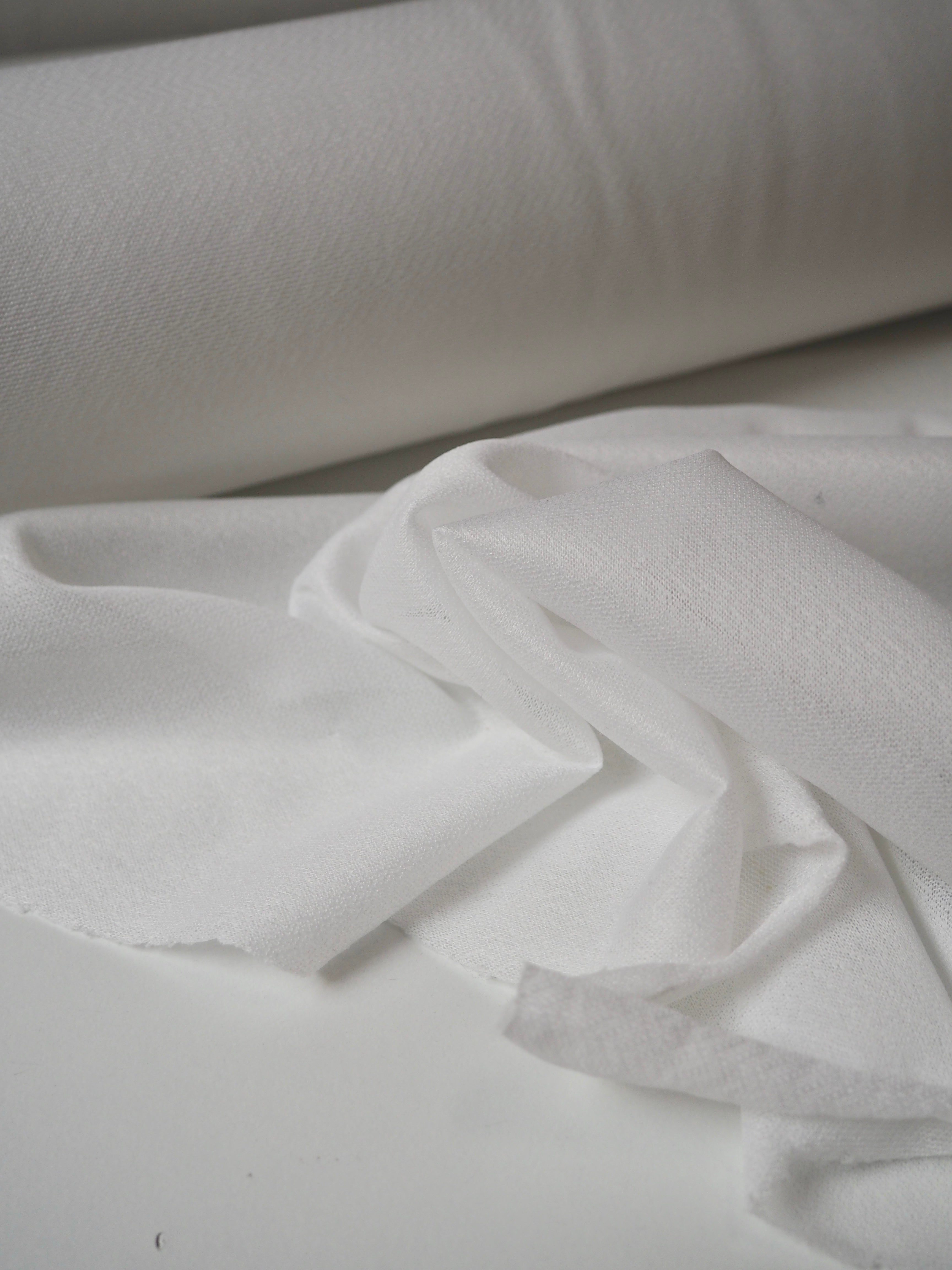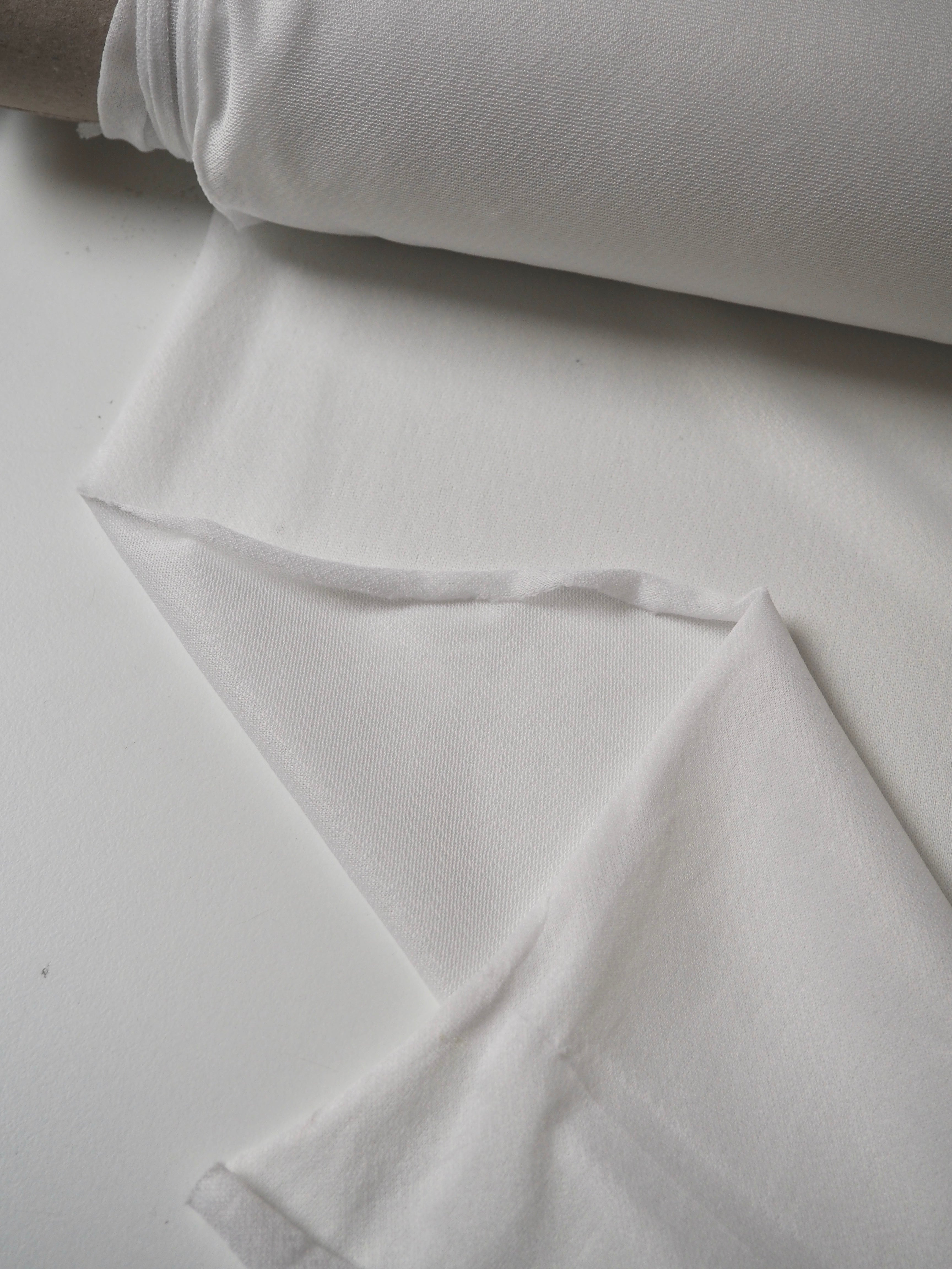 This ex-designer fabric is an interfacing. It has a comfortable handle on the finished side, and a fusible reverse. Mediumweight, with a semi-opaque finish and nice drape. Has a bit of stretch, about 30%. Great to add extra support to a variety of fabrics, especially satins, cotton twills and suiting!