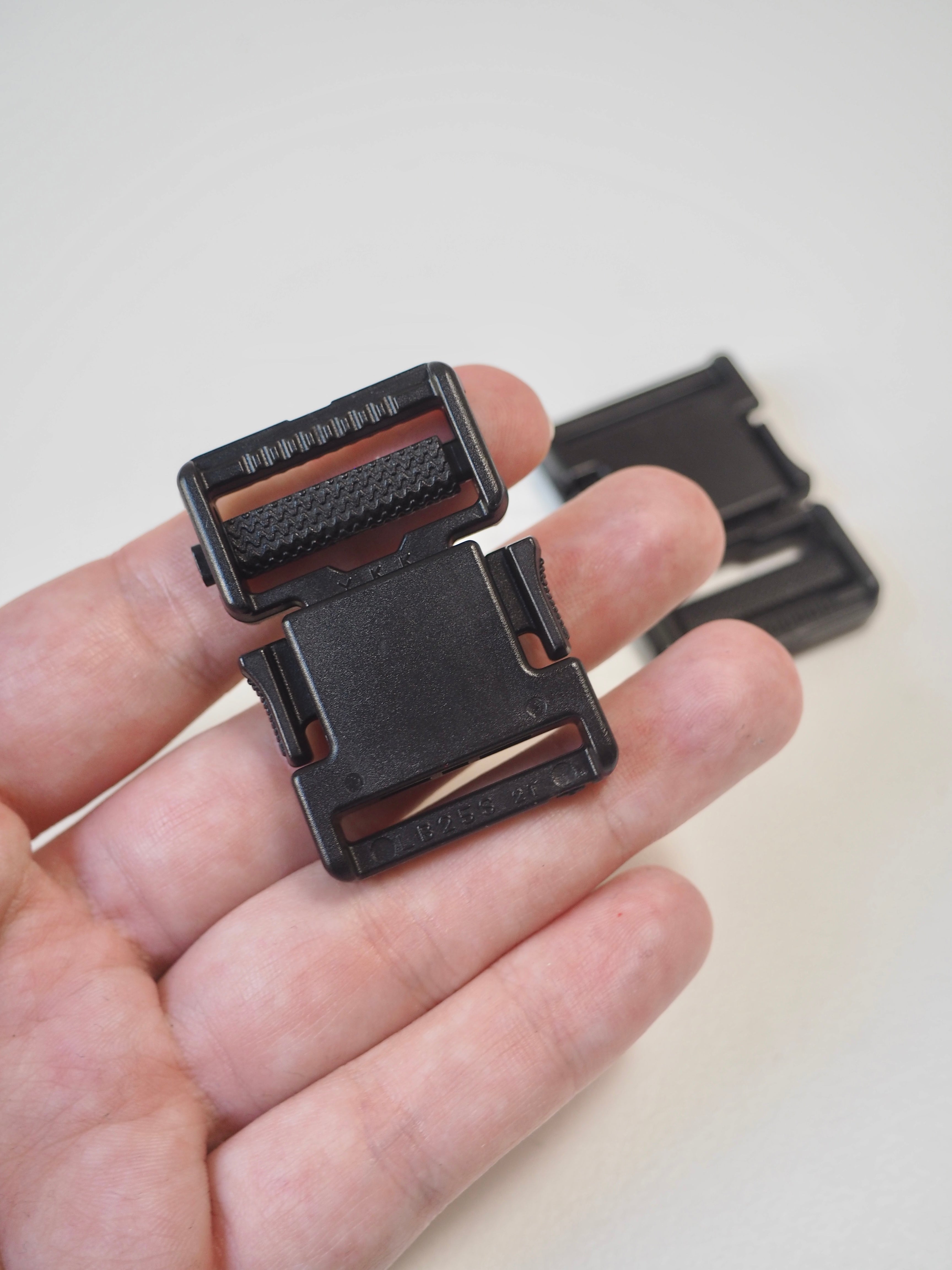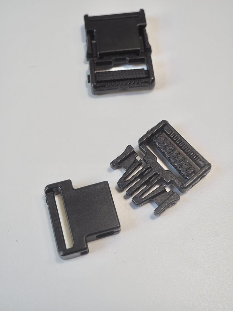 This ex-designer hardware is a buckle. It's a plastic side release buckle, easy to use, with side adjuster and squared shape. It also has a slider with textured ridging that grasps onto a strap well. It's lightweight and a great addition to a garment, accessory, or even for luggage use!