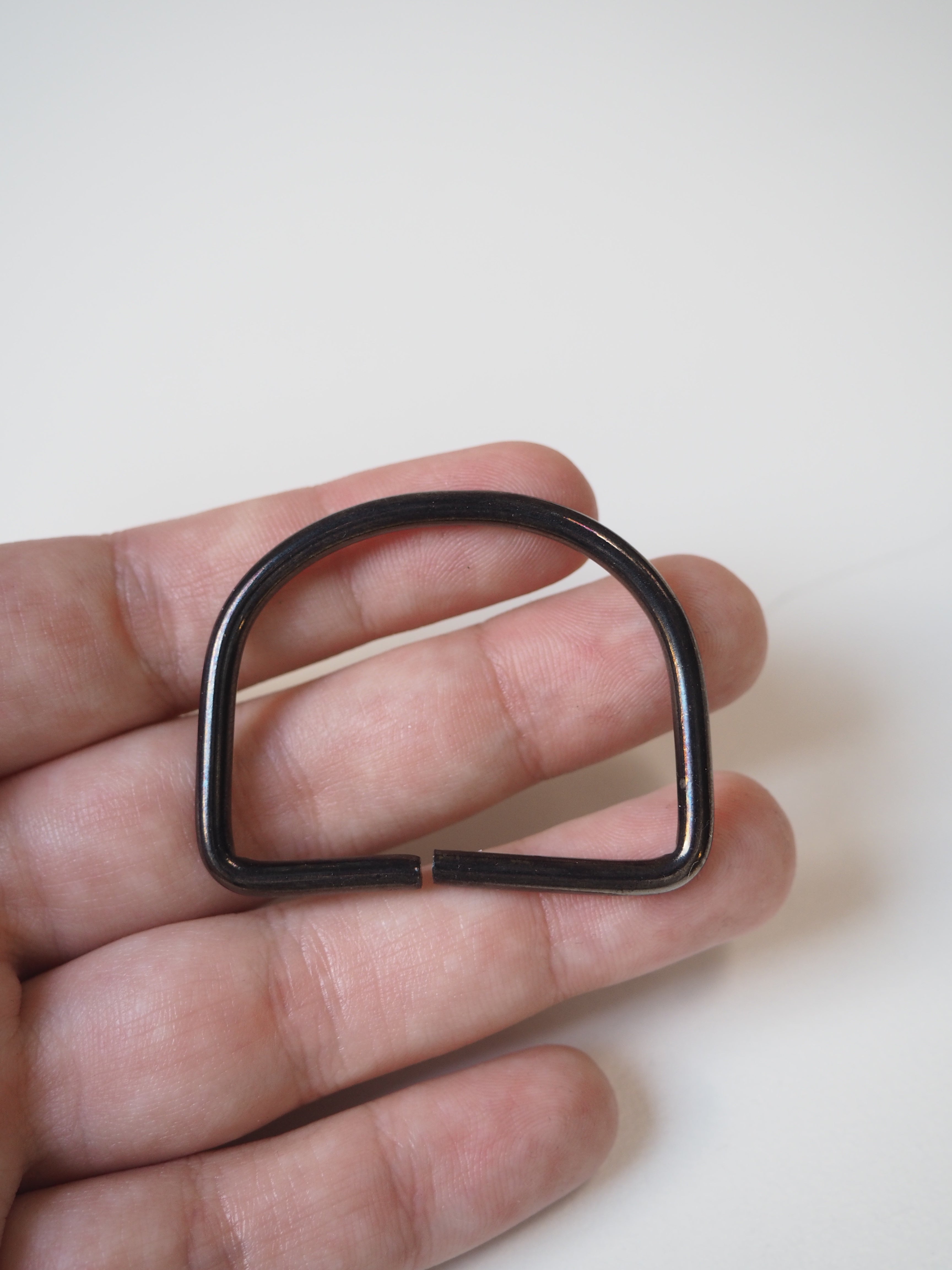 This ex-designer hardware is a D-ring. Has an opening on the straight end. These can be used for bag making and accessories. Ideal for attaching straps!