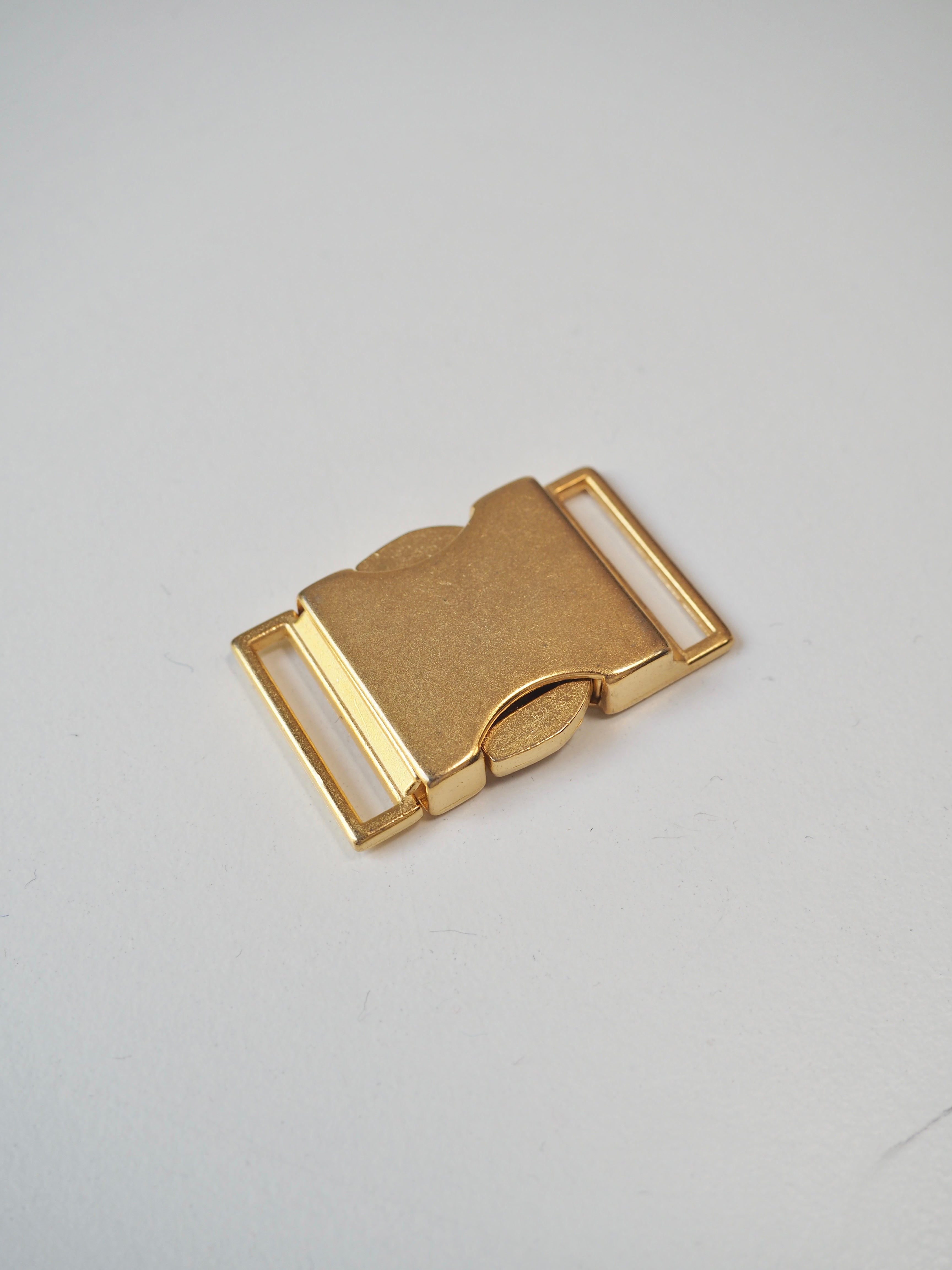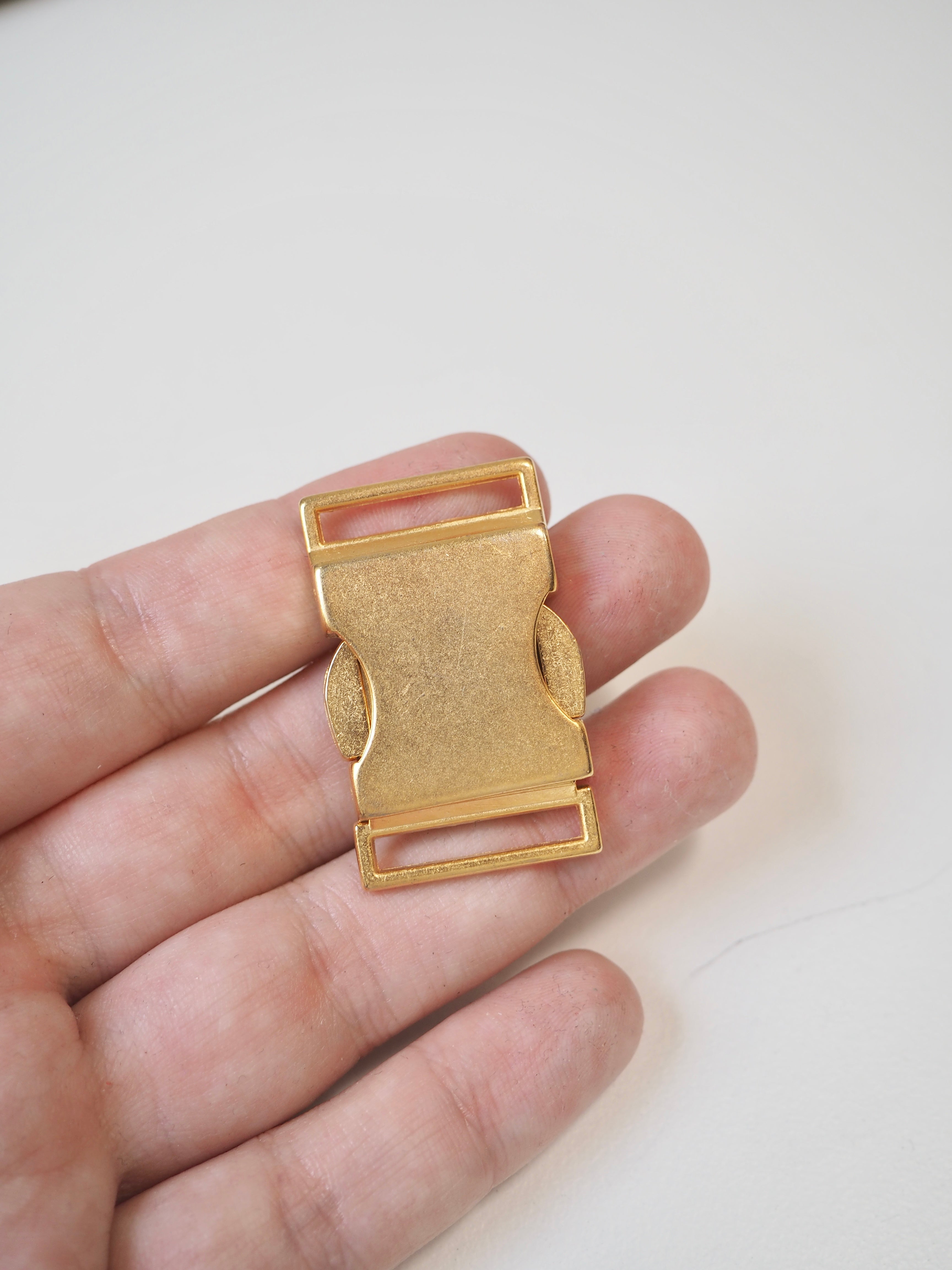 This ex-designer hardware is a buckle. It's a gold metal side release buckle, and it's medium weight. It's a great addition to a garment, or accessory!