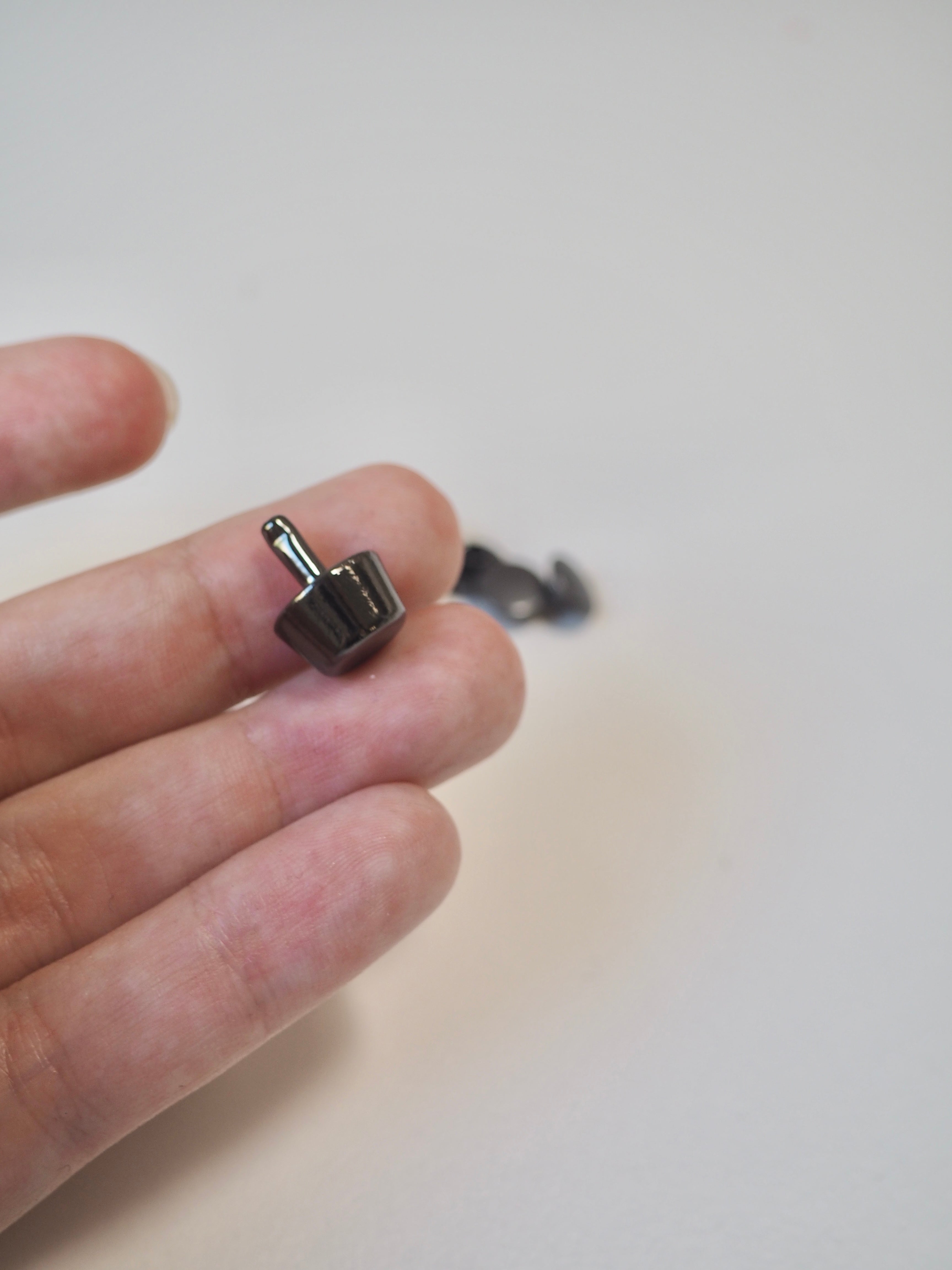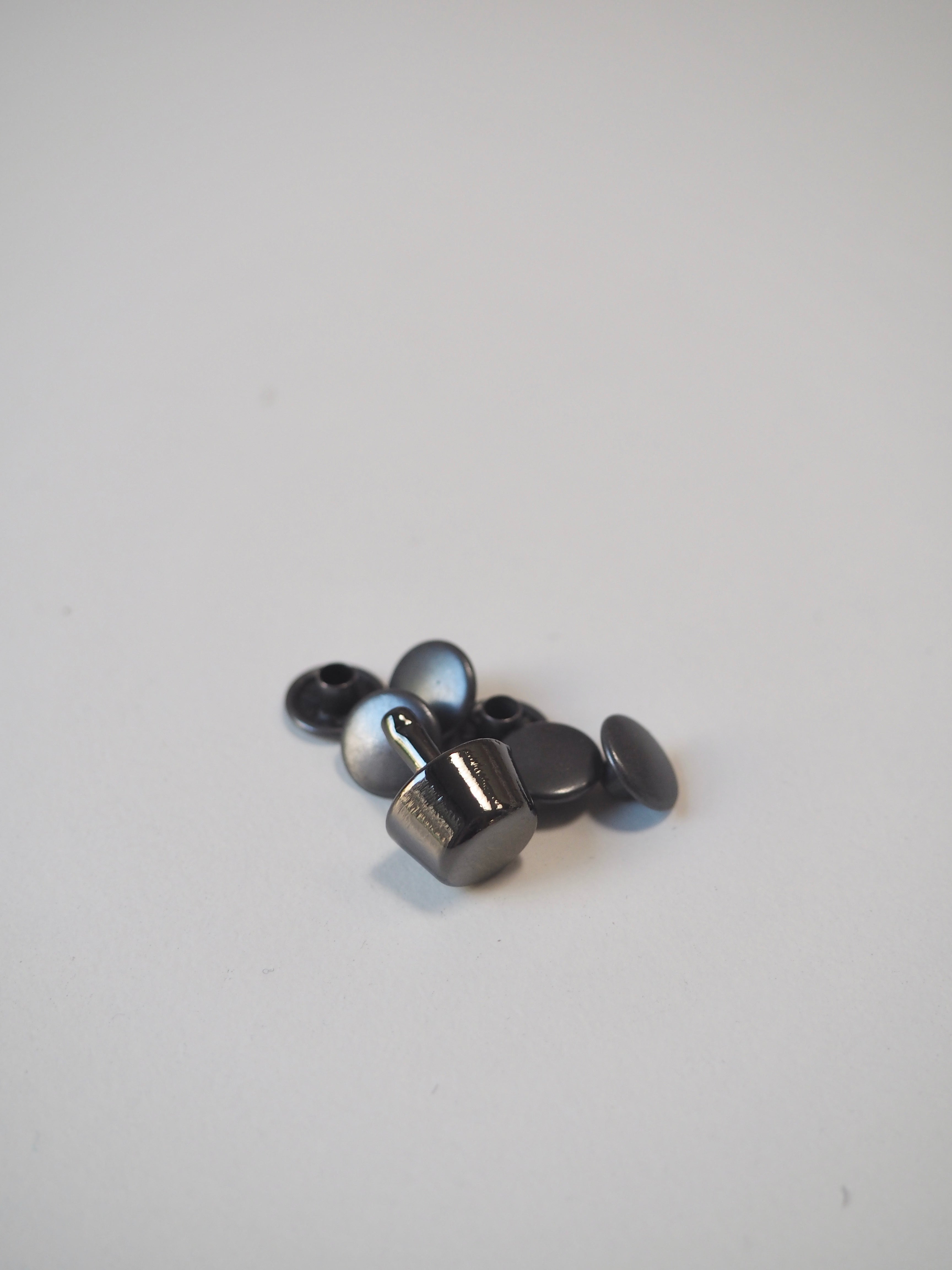 These ex-designer hardware are metal studs. They are a gunmetal finish and a bit chunkier than a typical stud. It's two parts, easily attached by the right stud fastening tool. Light to medium weight. Ideal for jackets or special pieces, but could also be used as bag feet in bag making!