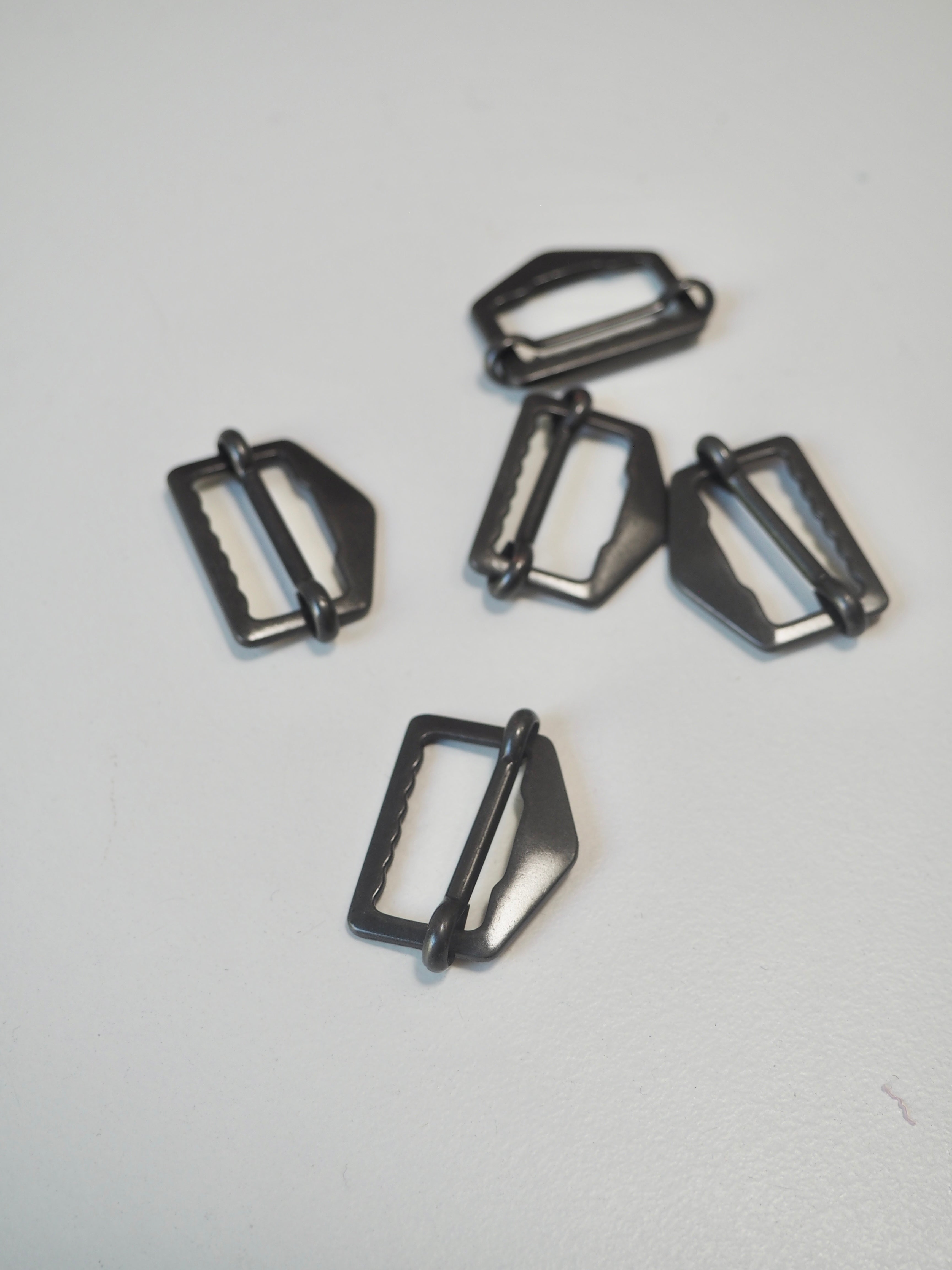 This ex-designer hardware is a slider. It has a teeth grip on one end, with a sliding bar for adjustments. It's lightweight and perfect for bags and accessories!