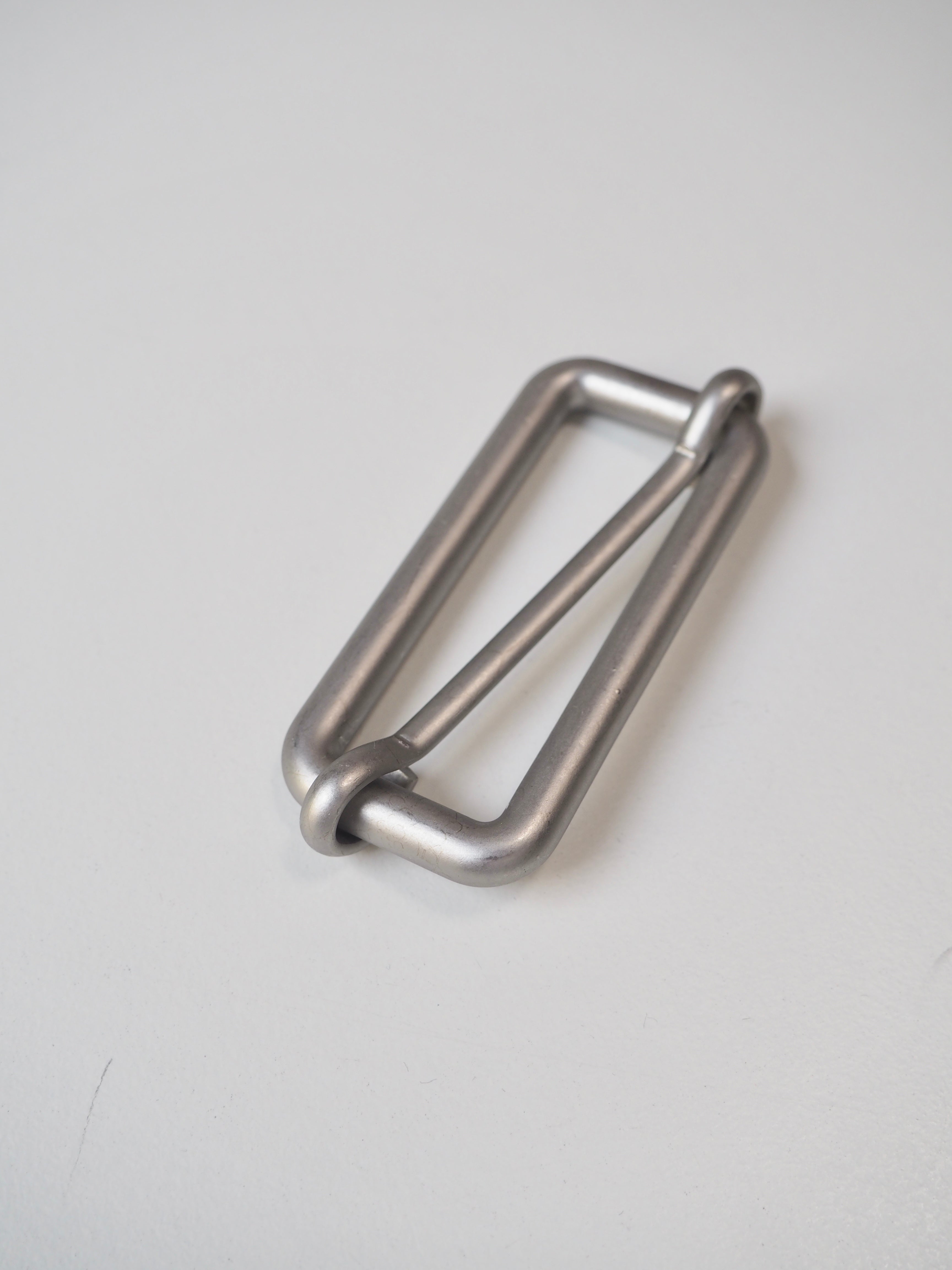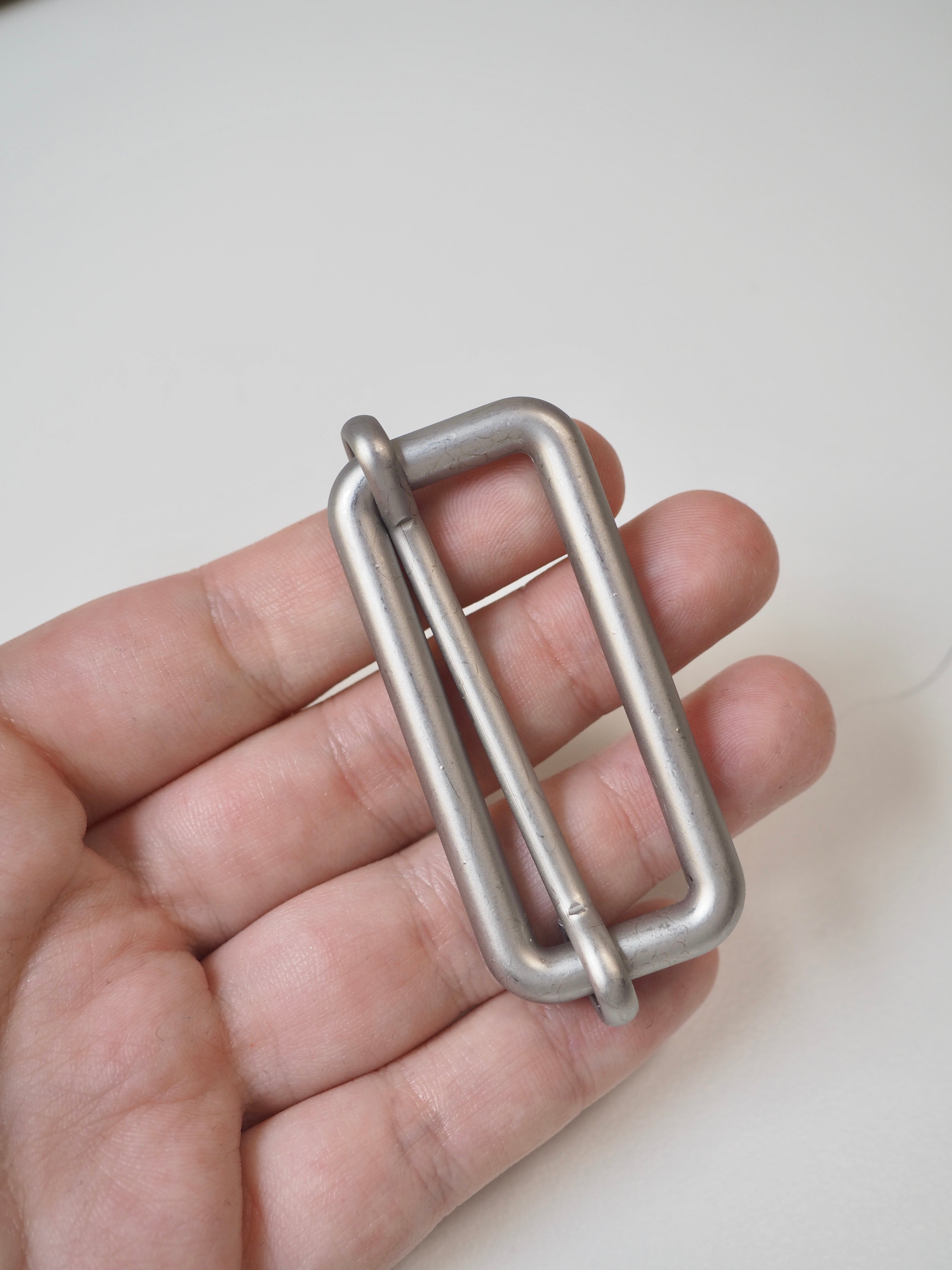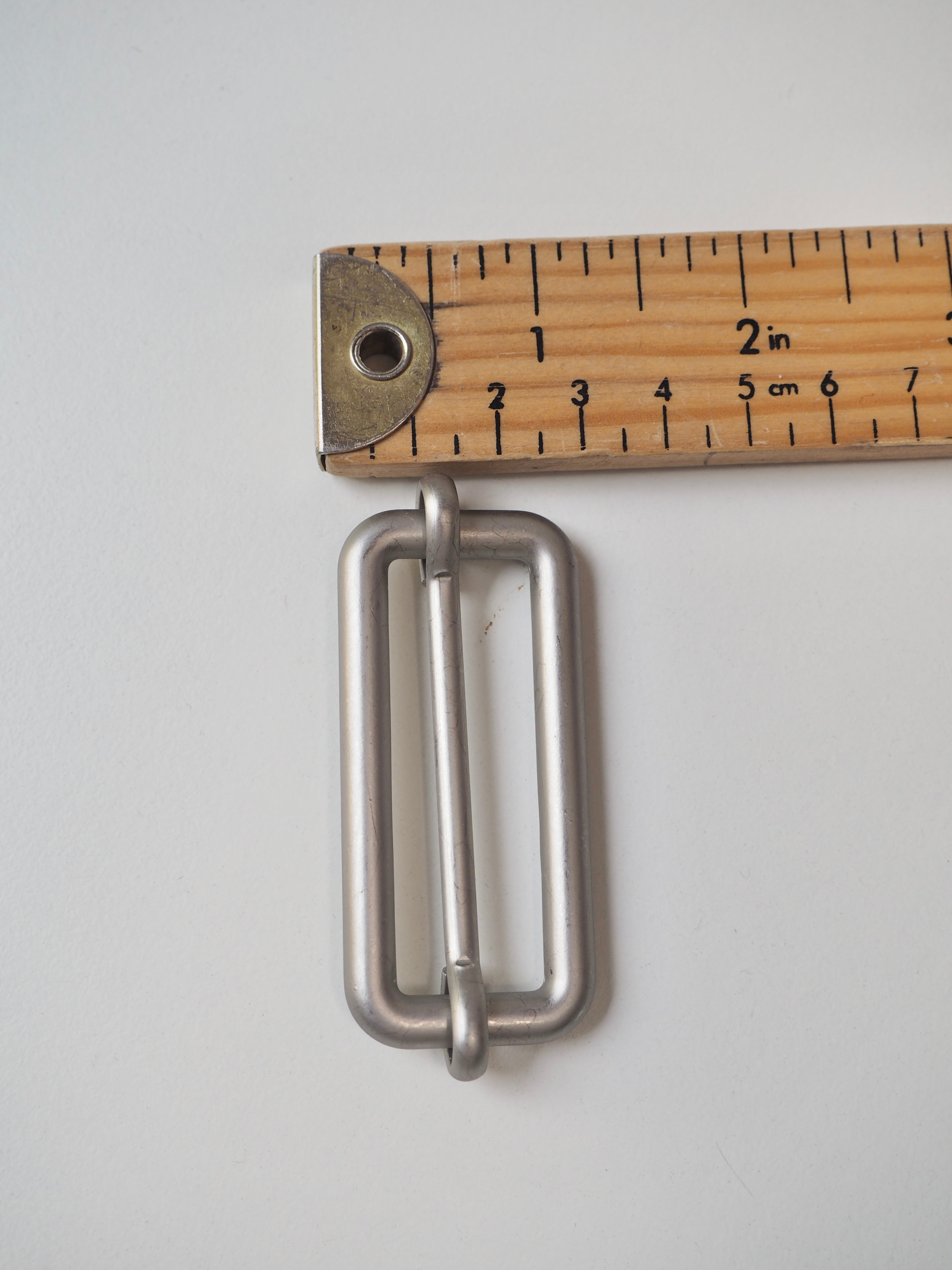 This ex-designer piece of hardware is a slider. These matte silver sliders are large, medium weight, and have an adjustable bar. They could be used for coats, dresses, jumpsuits, or accessories!